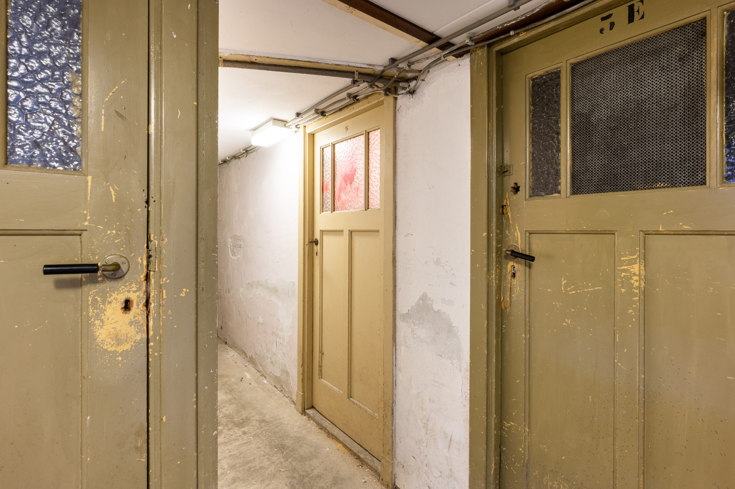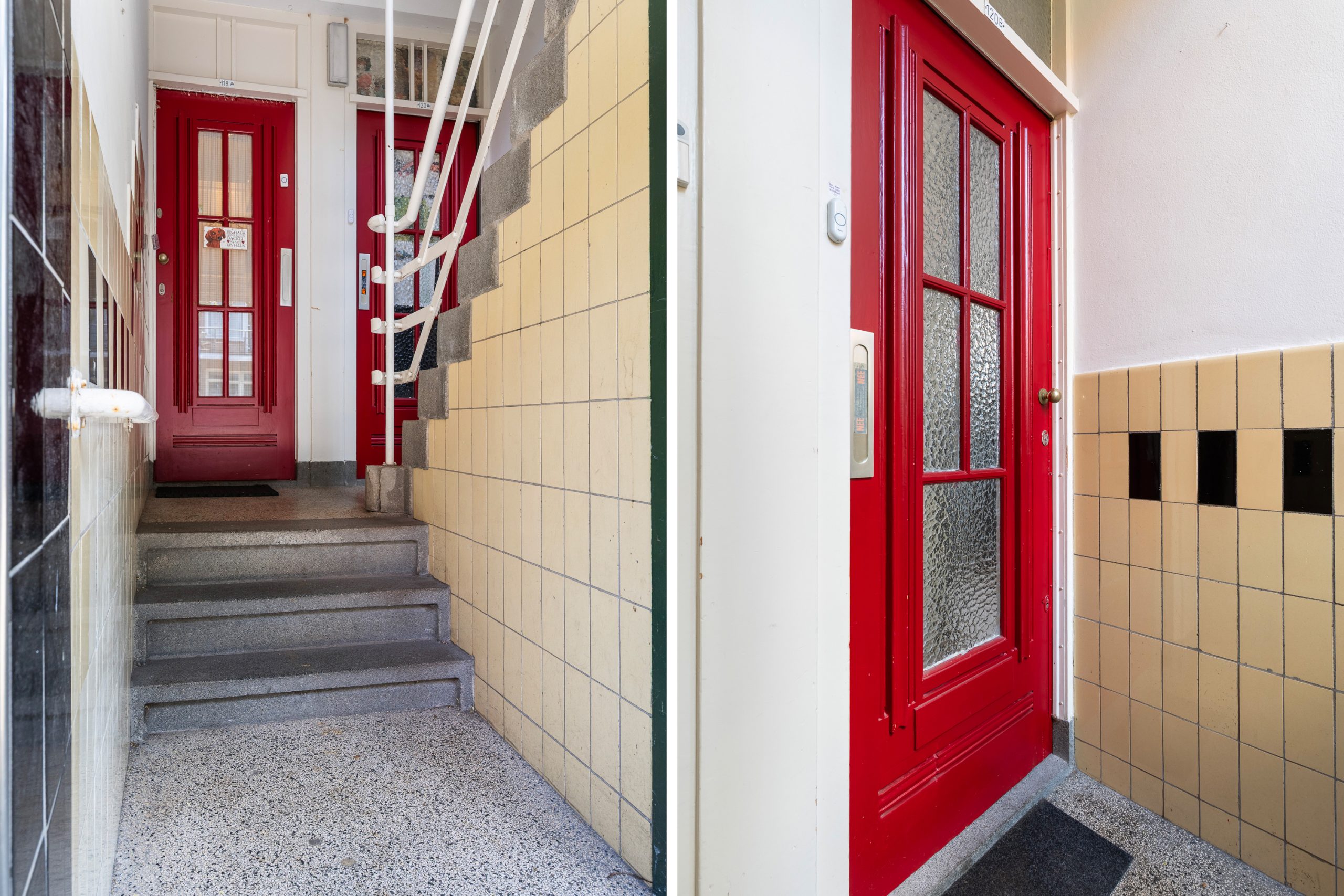 Karakteristiek open portiek met trap naar de 1e verdieping en de ondergelegen bergingen.