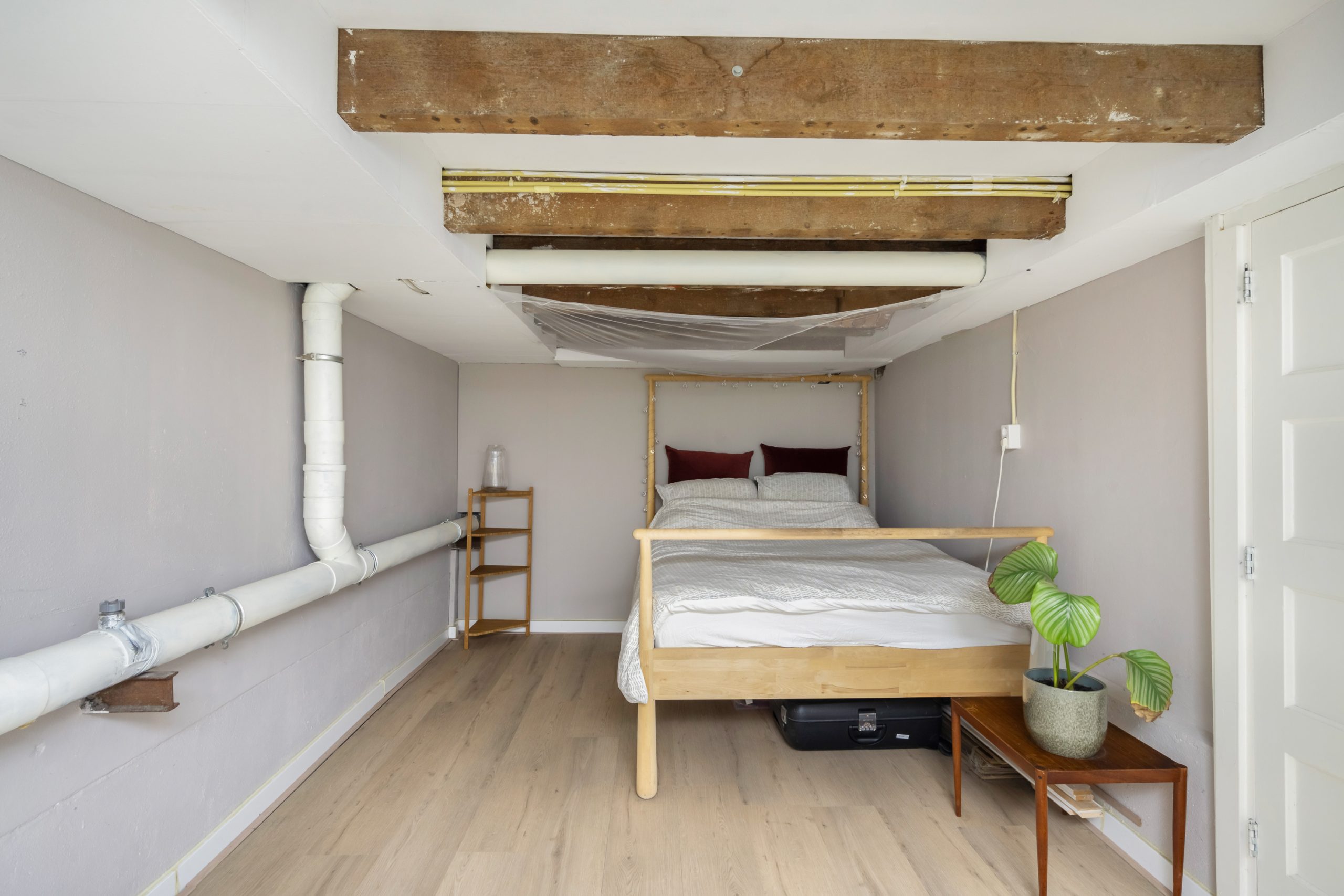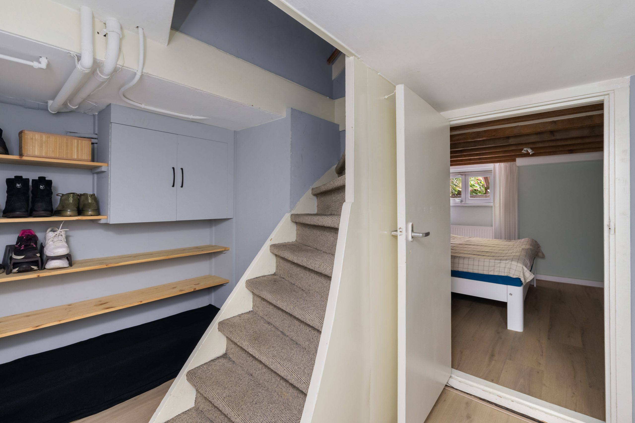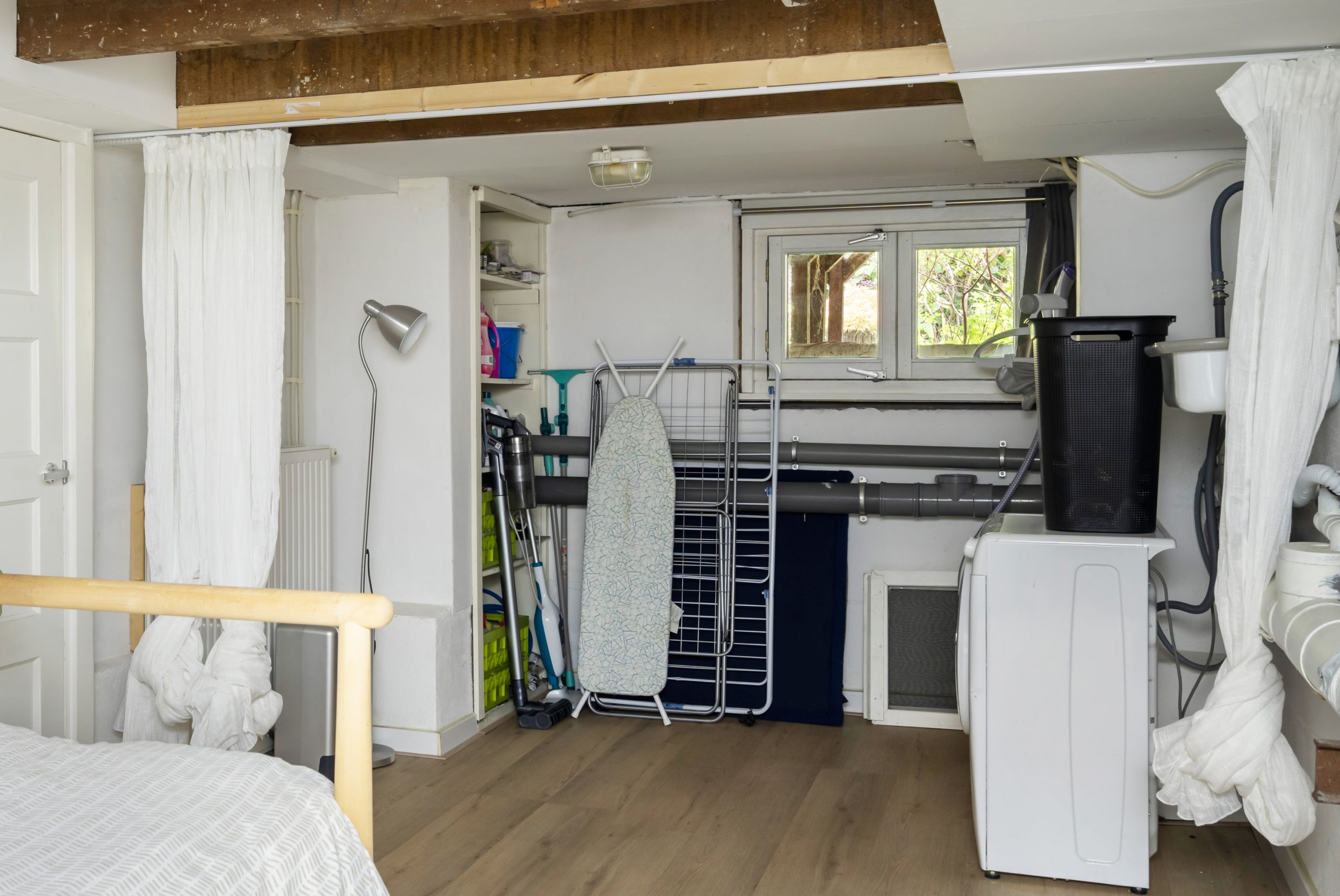 Ruime hal met kast, meterkast en toegang tot de 2 overige slaapkamers. Beide kamers zijn erg ruim van formaat! Het souterrain heeft een stahoogte van bijna 1.90 meter. Mede door de balkenstructuur is het een zeer knusse ruimte. De 3e slaapkamer is te bereiken middels de 2e slaapkamer, waar er tevens een vaste kast is en de wasmachineaansluiting en CV-opstelling (2025).