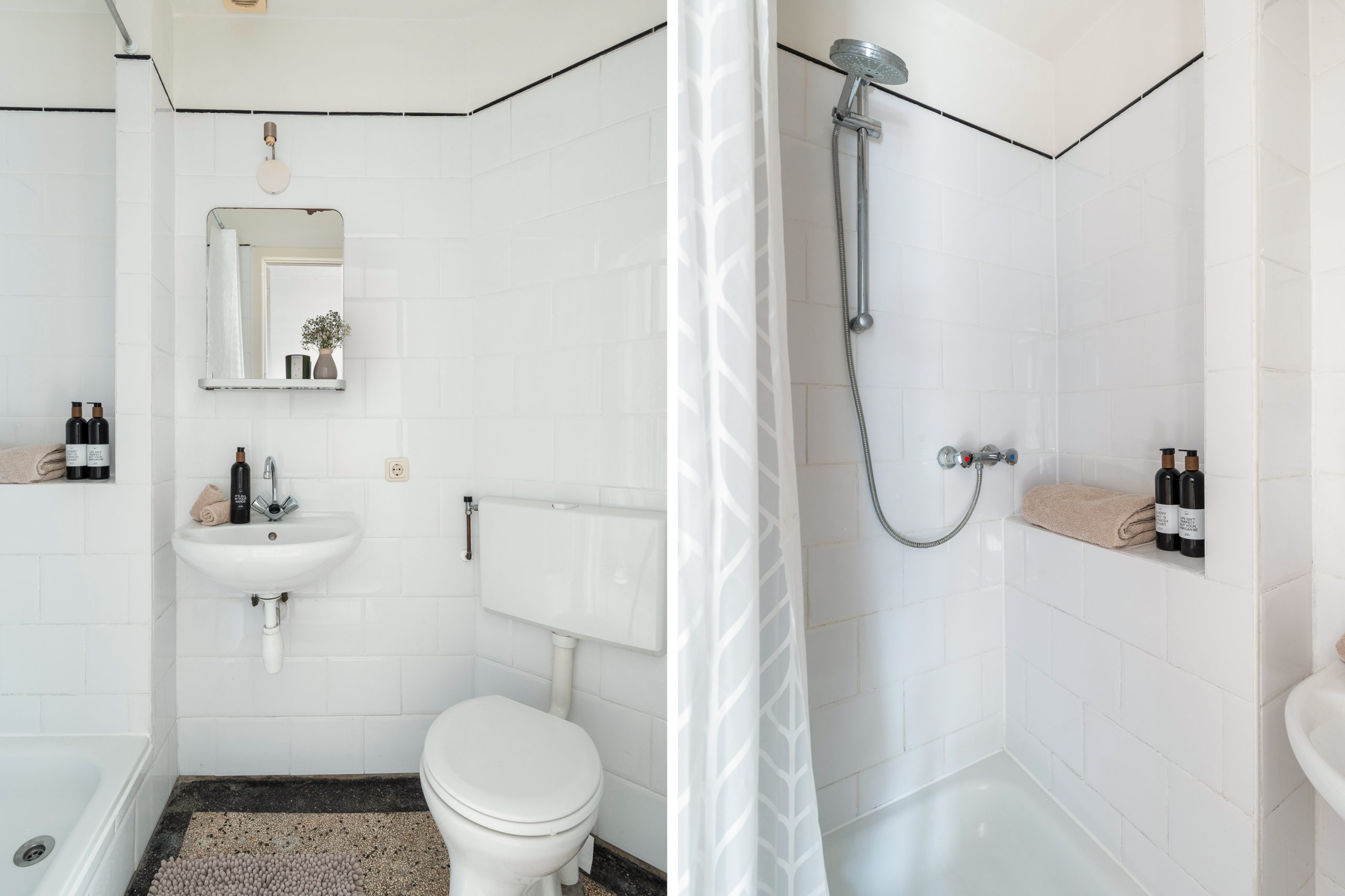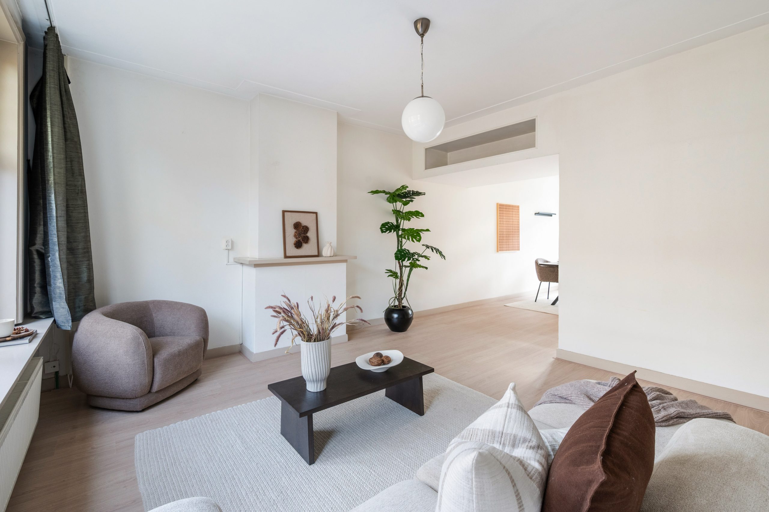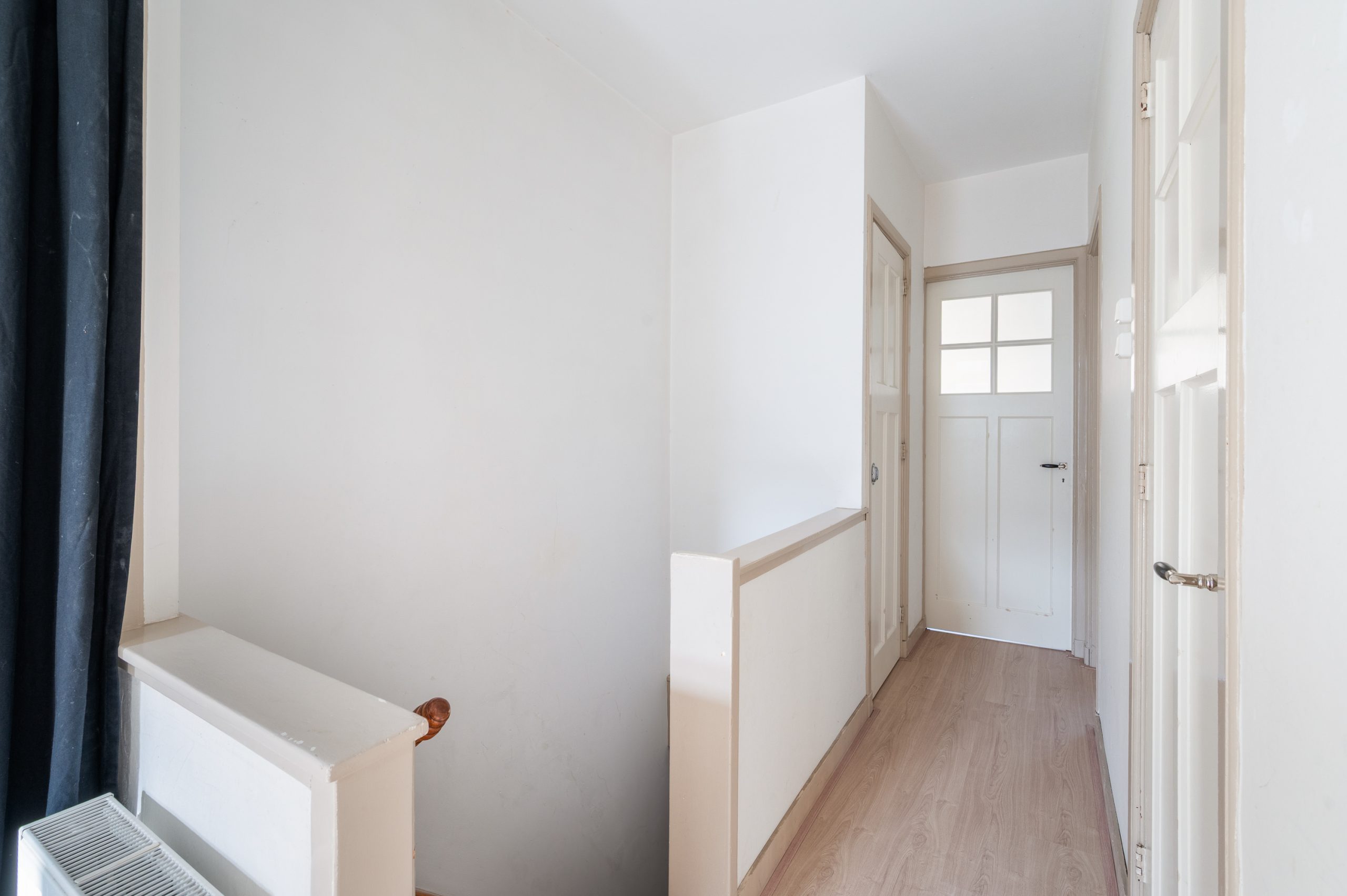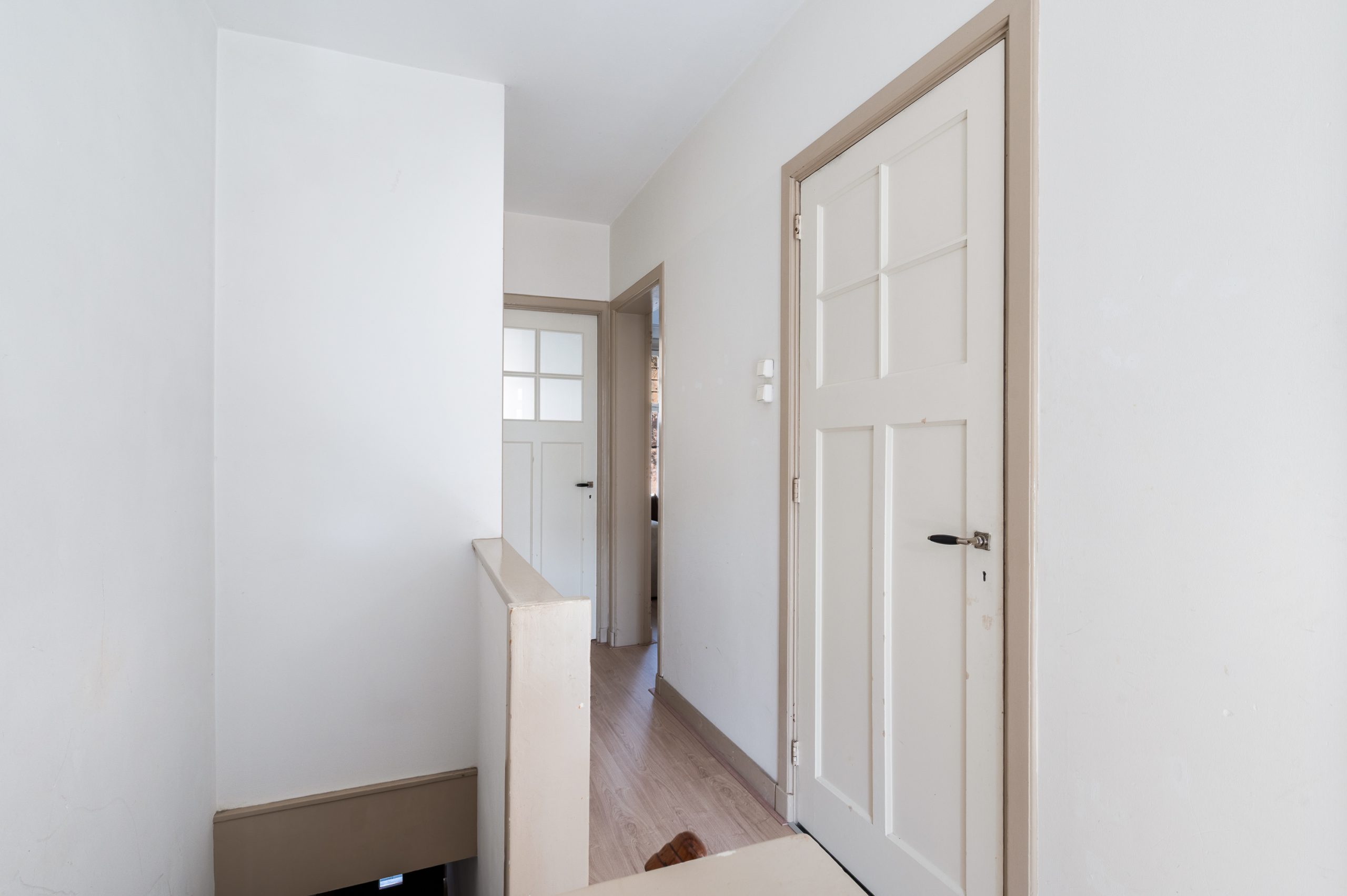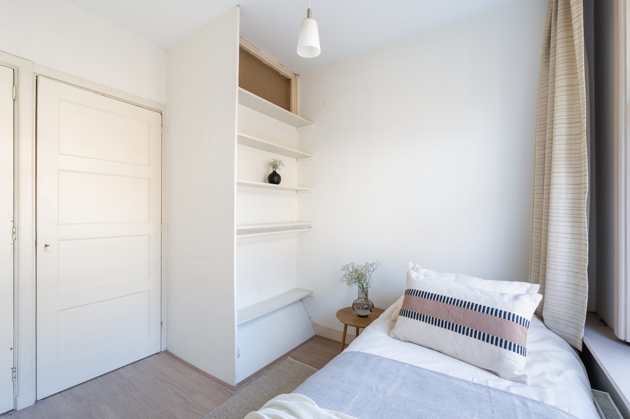 Overloop met vaste kasten en toegang tot alle vertrekken. De originele jaren ’30-details, zoals de lichte ornamenten, glas-in-loodramen en paneeldeuren, geven de woning een sfeervol karakter. Dankzij de L-vormige woonkamer met vaste kast (CV-opstelling) is de ruimte flexibel in te delen, met een mooie scheiding tussen het woongedeelte en eetgedeelte. Dit is ideaal als je de openheid van de leefruimten wilt behouden, maar toch een visuele scheiding tussen de ruimtes wenst. Via openslaande deuren gelegen in het eetgedeelte bereik je het balkon, gelegen op het zonnige zuiden. Hier kan je gedurende dag heerlijk genieten van de zon! De keuken beschikt over diverse inbouwapparatuur zoals een 4-pits gasfornuis met afzuigkap, oven en een vaatwasser. De master bedroom is gelegen aan de achterzijde van de woning. Dit is een ruime en lichte kamer en beschikt over een vaste kast. De lichte 2e slaapkamer is gelegen aan de voorzijde en is ideaal in te richten als kinder-, werk- of kleedkamer. De volledig betegelde badkamer beschikt over een douche, wastafel en een toilet.