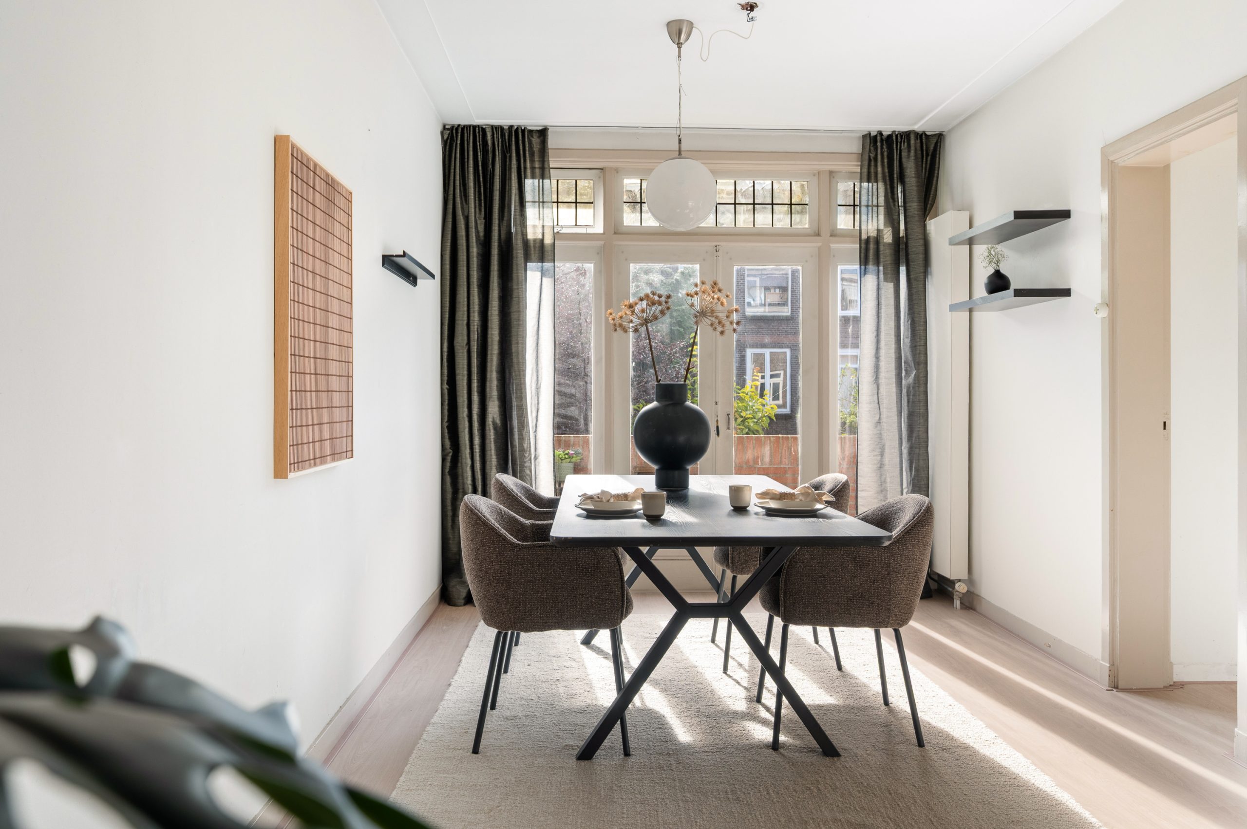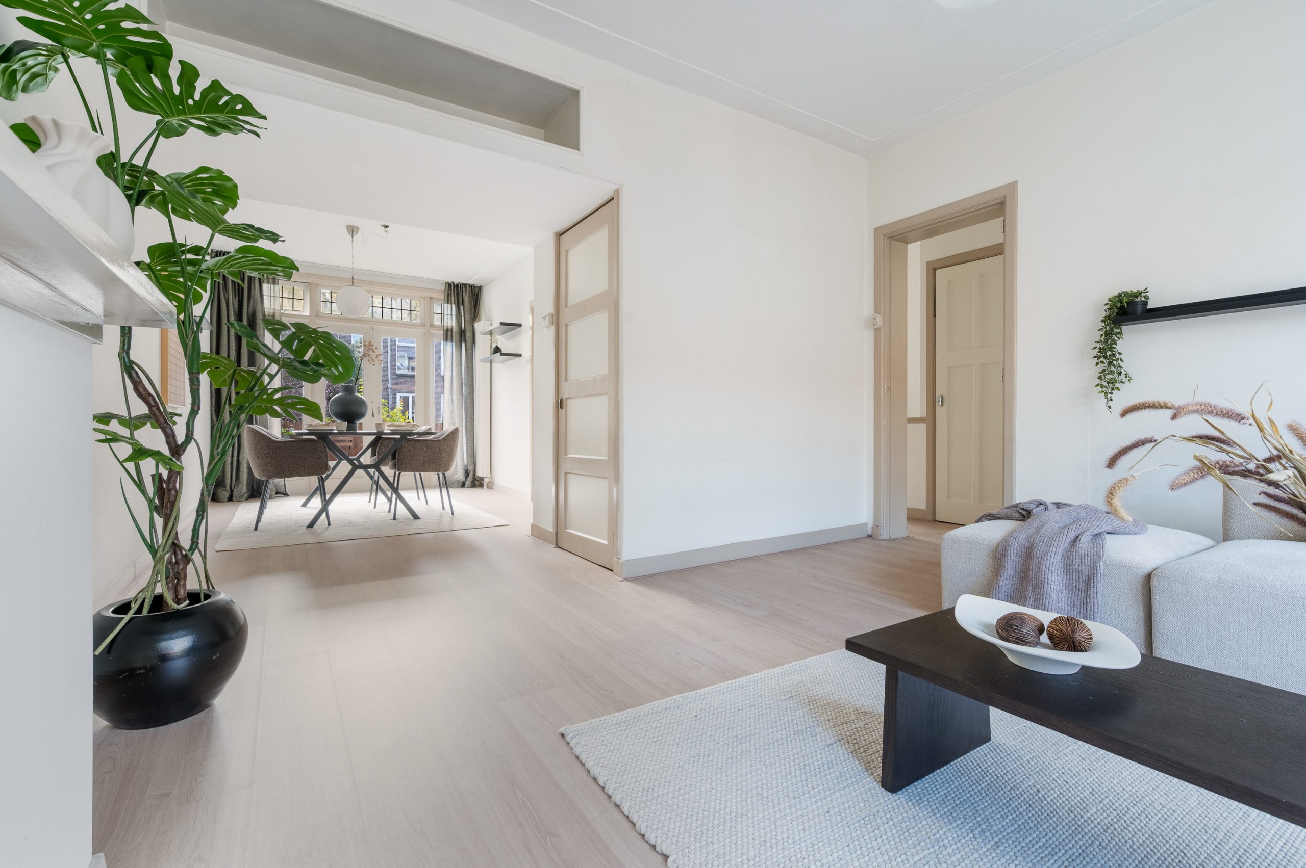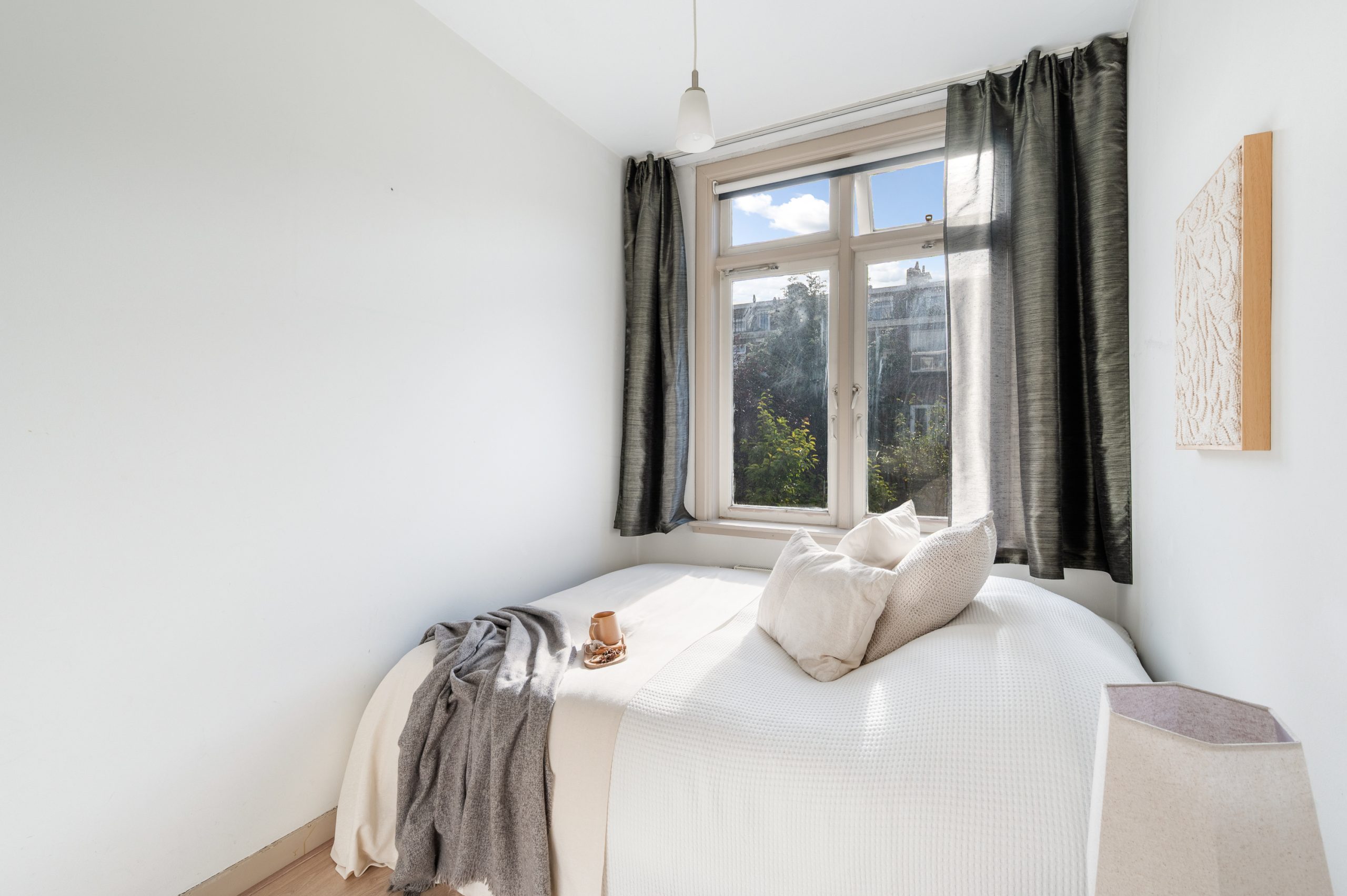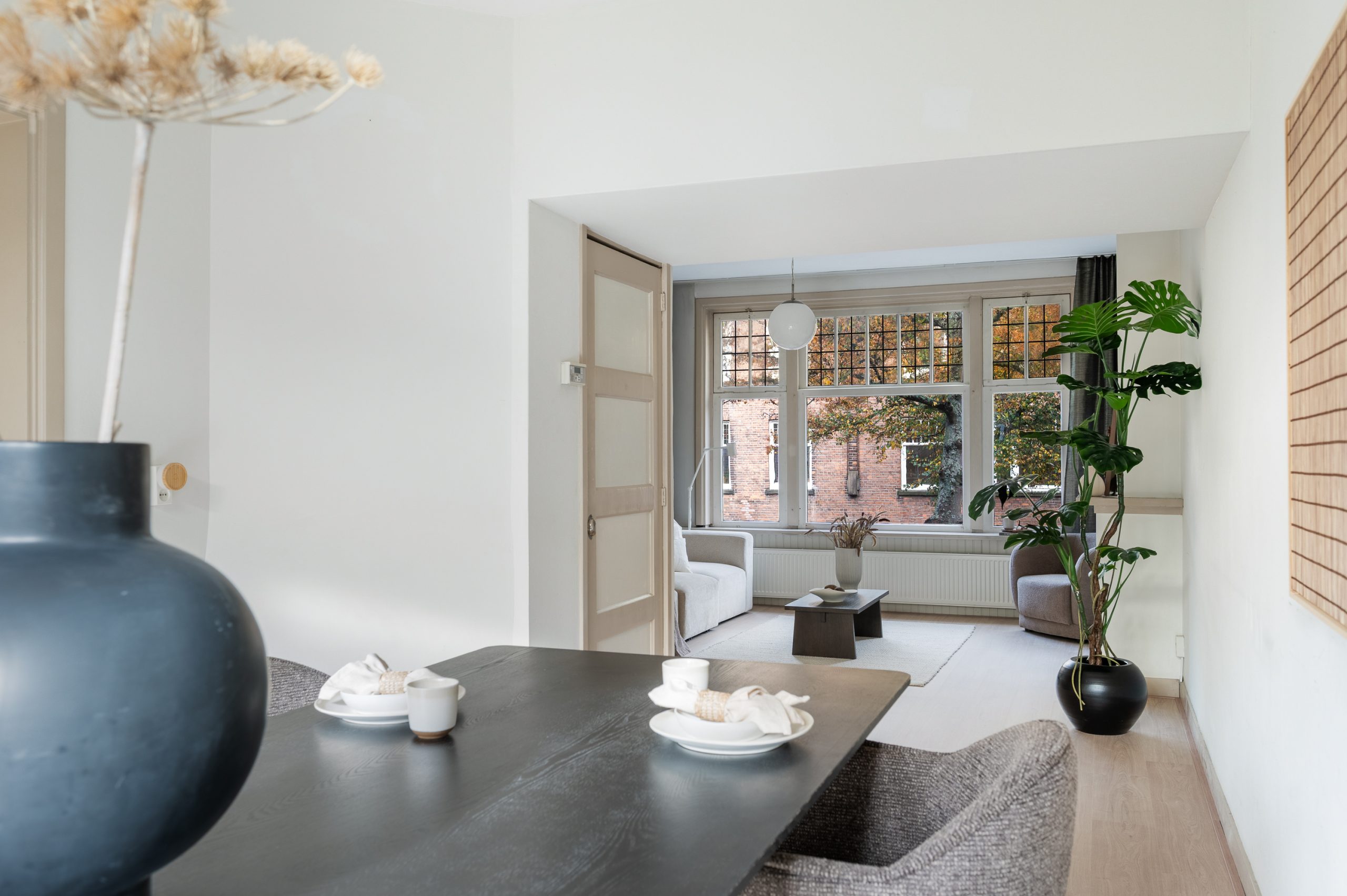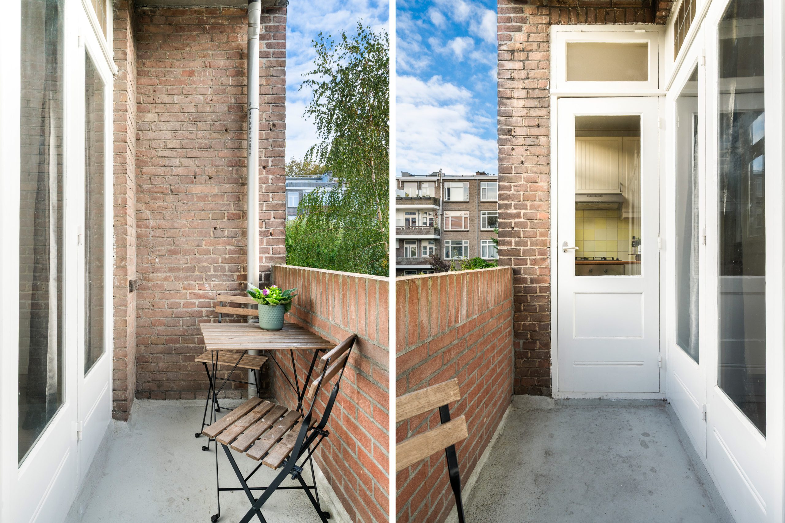 Overloop met vaste kasten en toegang tot alle vertrekken. De originele jaren ’30-details, zoals de lichte ornamenten, glas-in-loodramen en paneeldeuren, geven de woning een sfeervol karakter. Dankzij de L-vormige woonkamer met vaste kast (CV-opstelling) is de ruimte flexibel in te delen, met een mooie scheiding tussen het woongedeelte en eetgedeelte. Dit is ideaal als je de openheid van de leefruimten wilt behouden, maar toch een visuele scheiding tussen de ruimtes wenst. Via openslaande deuren gelegen in het eetgedeelte bereik je het balkon, gelegen op het zonnige zuiden. Hier kan je gedurende dag heerlijk genieten van de zon! De keuken beschikt over diverse inbouwapparatuur zoals een 4-pits gasfornuis met afzuigkap, oven en een vaatwasser. De master bedroom is gelegen aan de achterzijde van de woning. Dit is een ruime en lichte kamer en beschikt over een vaste kast. De lichte 2e slaapkamer is gelegen aan de voorzijde en is ideaal in te richten als kinder-, werk- of kleedkamer. De volledig betegelde badkamer beschikt over een douche, wastafel en een toilet.