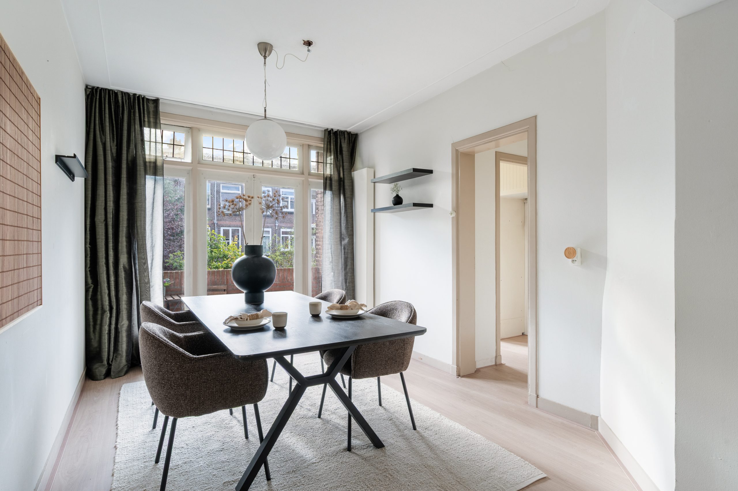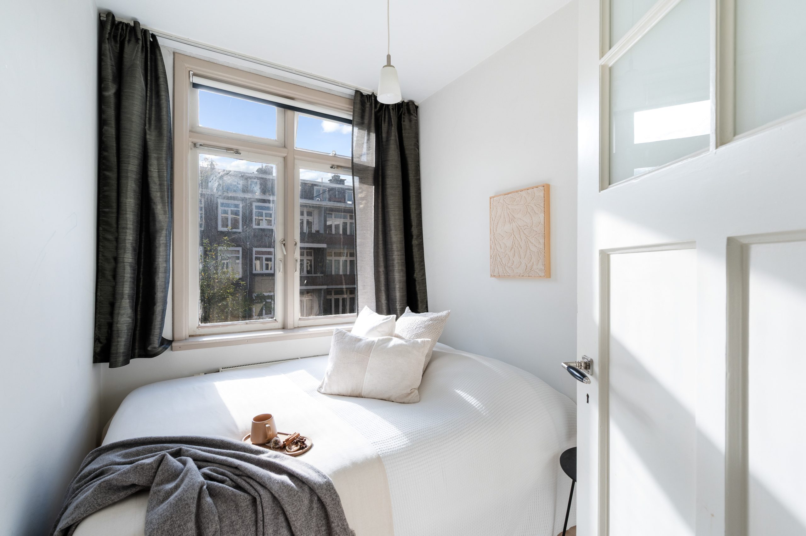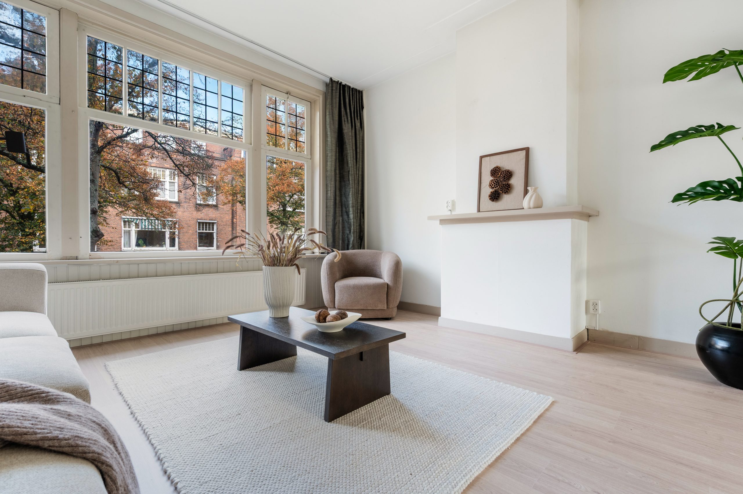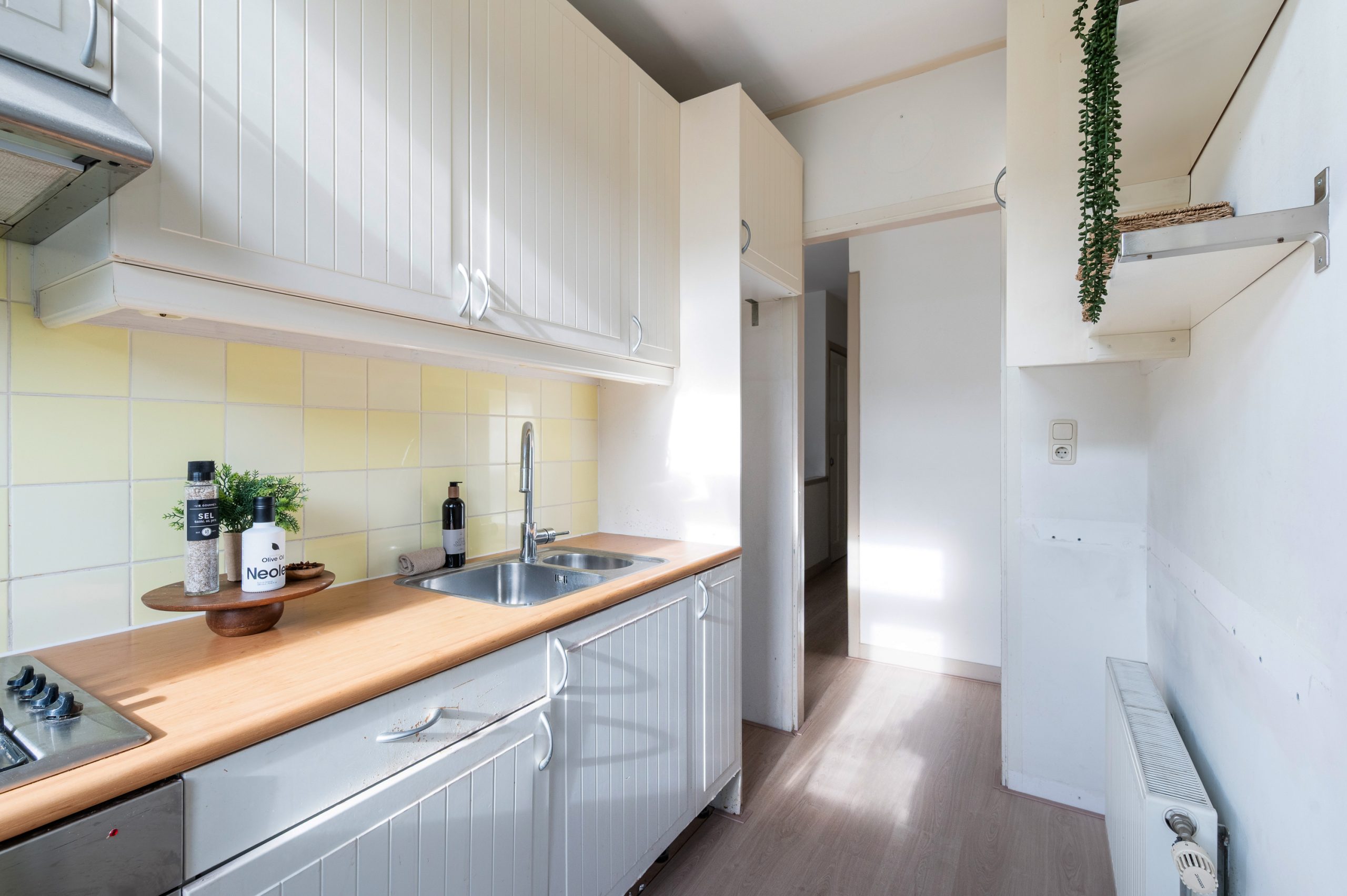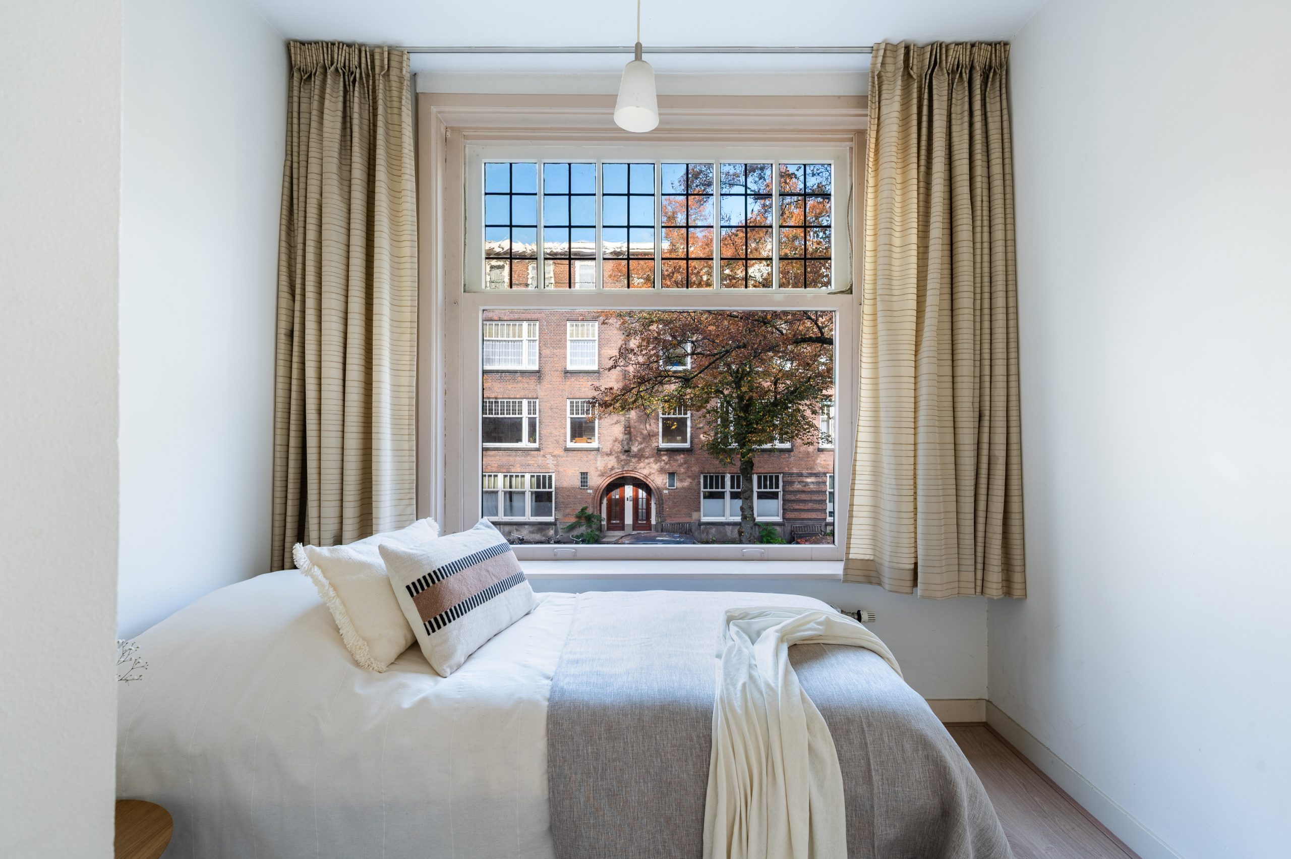 Overloop met vaste kasten en toegang tot alle vertrekken. De originele jaren ’30-details, zoals de lichte ornamenten, glas-in-loodramen en paneeldeuren, geven de woning een sfeervol karakter. Dankzij de L-vormige woonkamer met vaste kast (CV-opstelling) is de ruimte flexibel in te delen, met een mooie scheiding tussen het woongedeelte en eetgedeelte. Dit is ideaal als je de openheid van de leefruimten wilt behouden, maar toch een visuele scheiding tussen de ruimtes wenst. Via openslaande deuren gelegen in het eetgedeelte bereik je het balkon, gelegen op het zonnige zuiden. Hier kan je gedurende dag heerlijk genieten van de zon! De keuken beschikt over diverse inbouwapparatuur zoals een 4-pits gasfornuis met afzuigkap, oven en een vaatwasser. De master bedroom is gelegen aan de achterzijde van de woning. Dit is een ruime en lichte kamer en beschikt over een vaste kast. De lichte 2e slaapkamer is gelegen aan de voorzijde en is ideaal in te richten als kinder-, werk- of kleedkamer. De volledig betegelde badkamer beschikt over een douche, wastafel en een toilet.