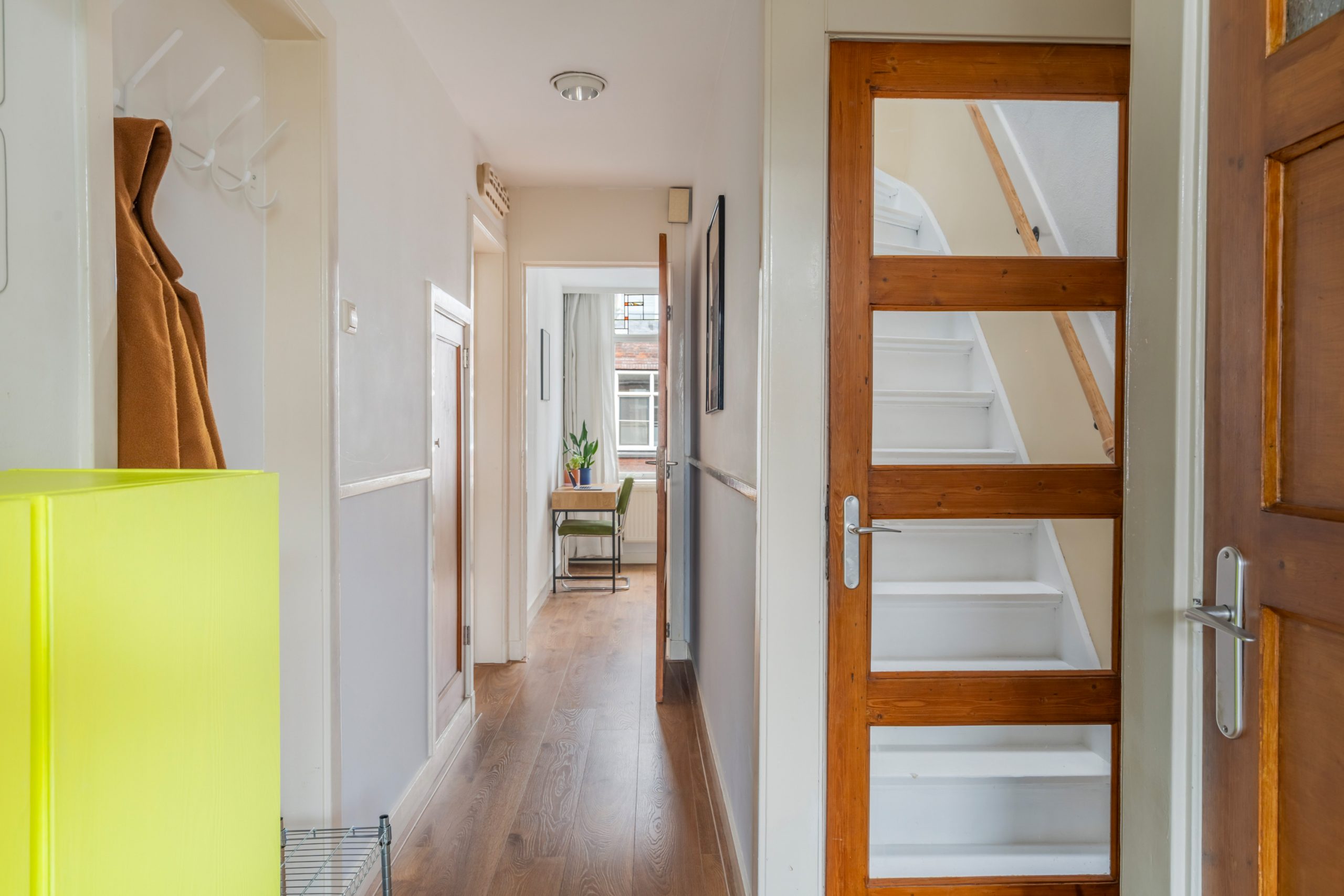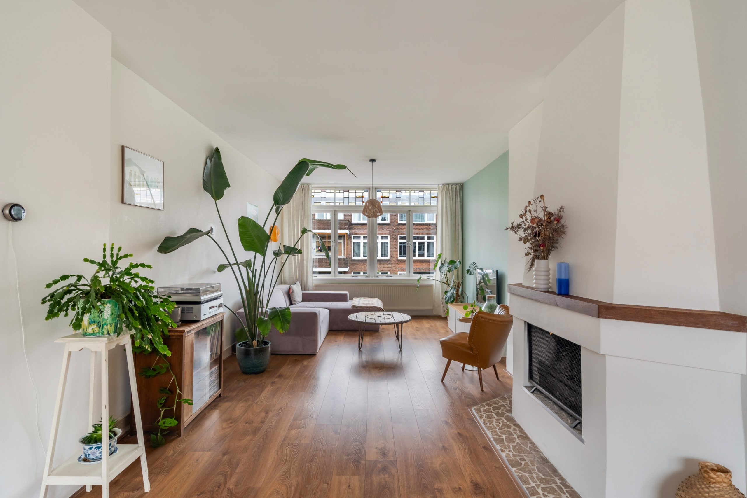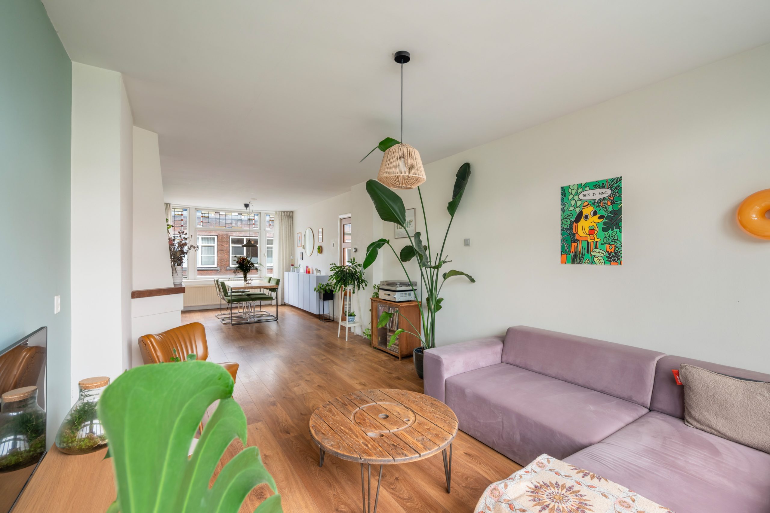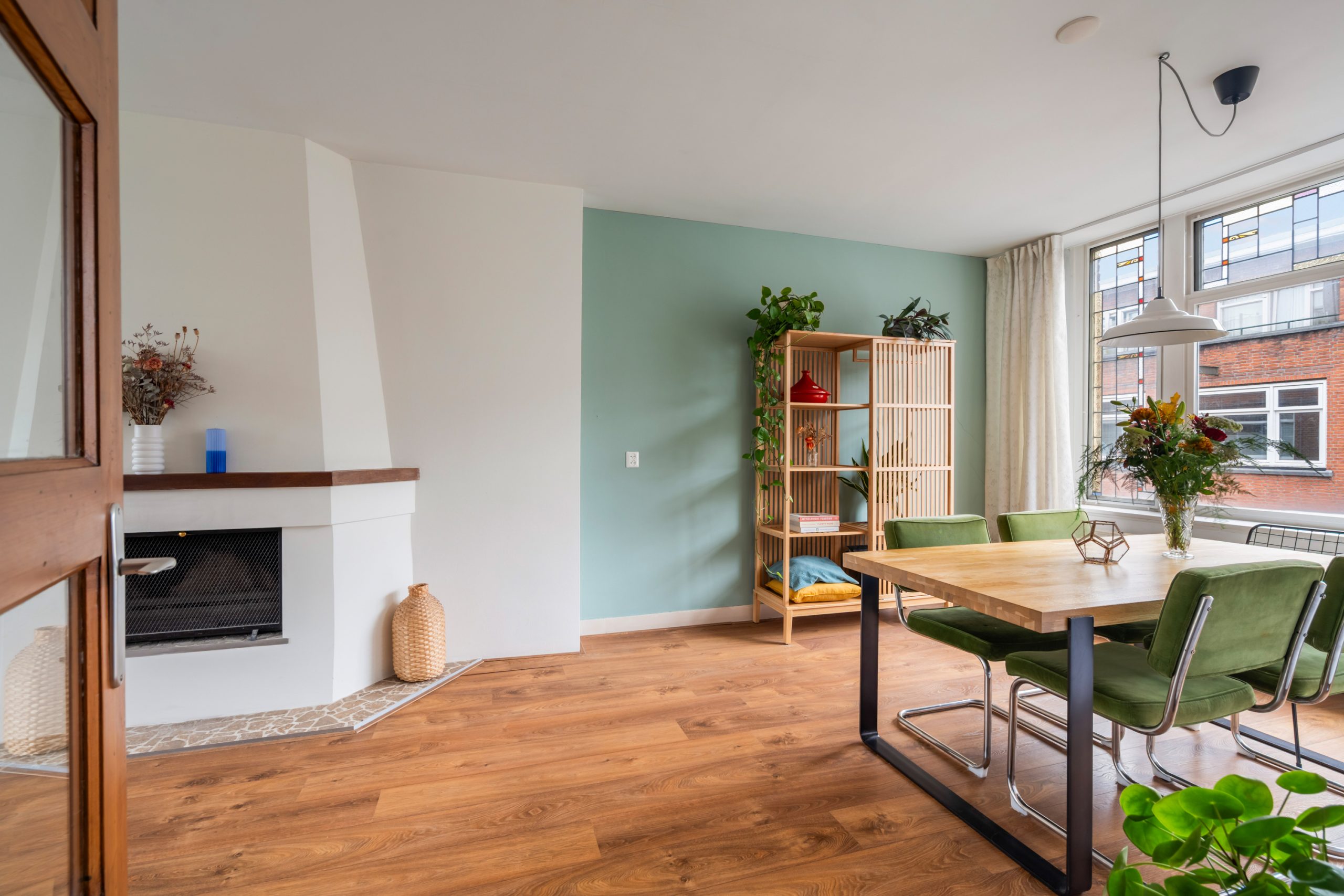 Overloop met meterkast, separaat toilet en toegang tot alle vertrekken. De royale woon-/eetkamer heeft maar liefst een lengte van ca. 10 meter lang! Door de grote raampartijen (die nog beschikken over het authentieke glas-in-lood) aan beide zijden van de woning treedt er veel natuurlijk licht de woning binnen, wat zorgt voor een fijne sfeer. Het zitgedeelte bevindt zich aan de achterzijde van de woning en vormt een fijne plek om te ontspannen. De eetkamer is gelegen aan de voorzijde van de woning en beschikt over voldoende ruimte voor een grote eettafel. De moderne keuken beschikt over diverse inbouwapparatuur zoals een 4-pits gasfornuis met afzuigkap, oven, vaatwasser en voldoende opbergruimte. De keuken biedt toegang tot het 1e balkon op het noordwesten. De 1e slaapkamer is gelegen aan de voorzijde en biedt voldoende ruimte voor een tweepersoonsbed en een kledingkast.