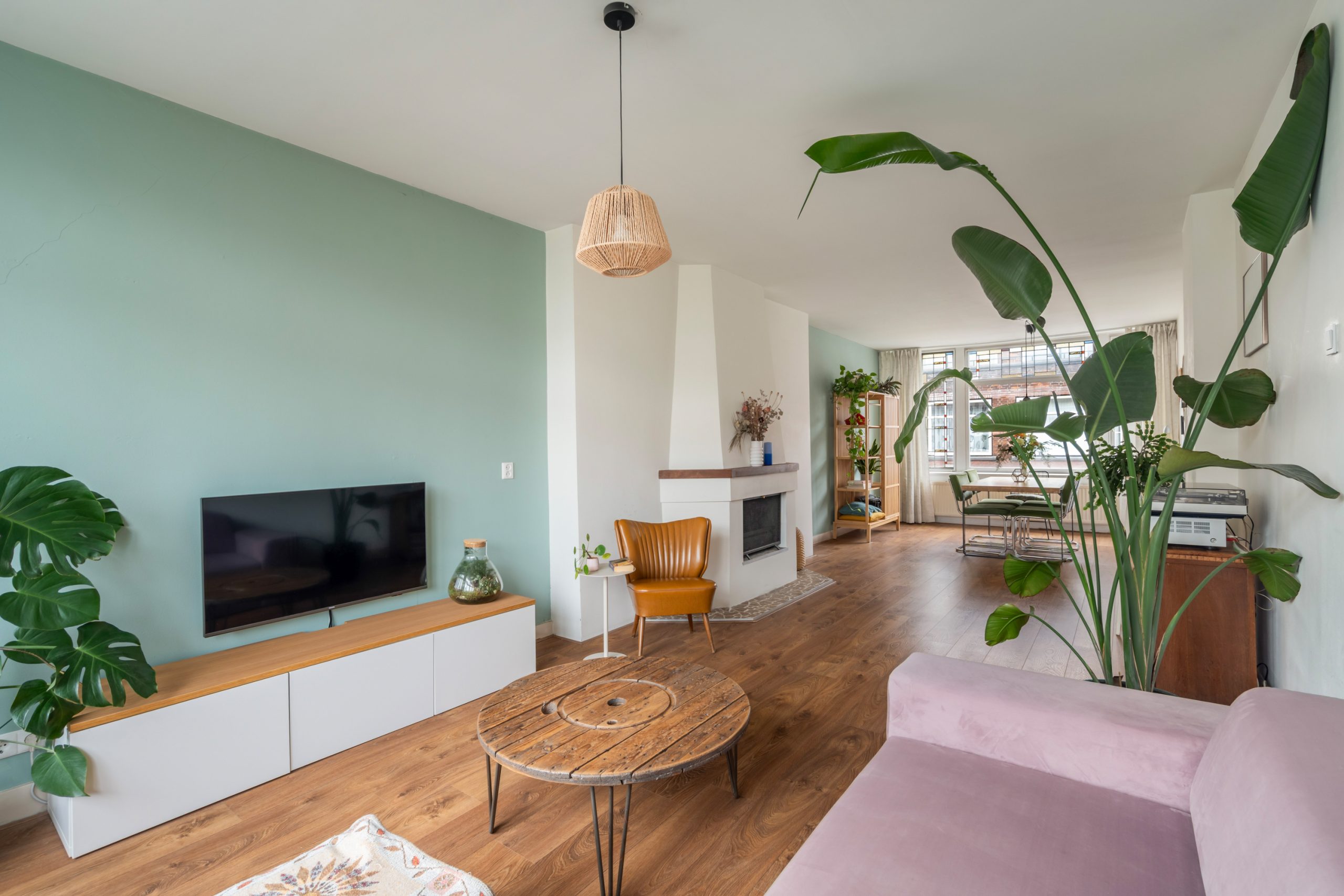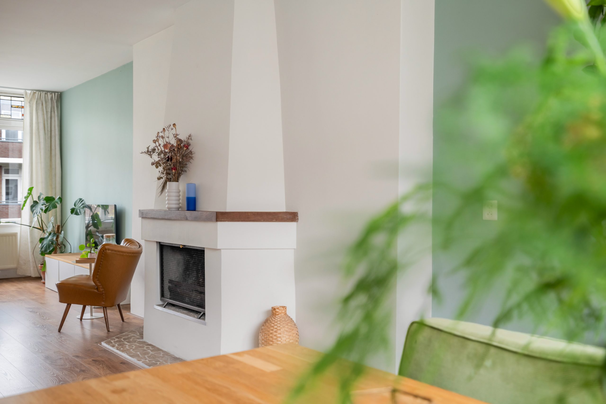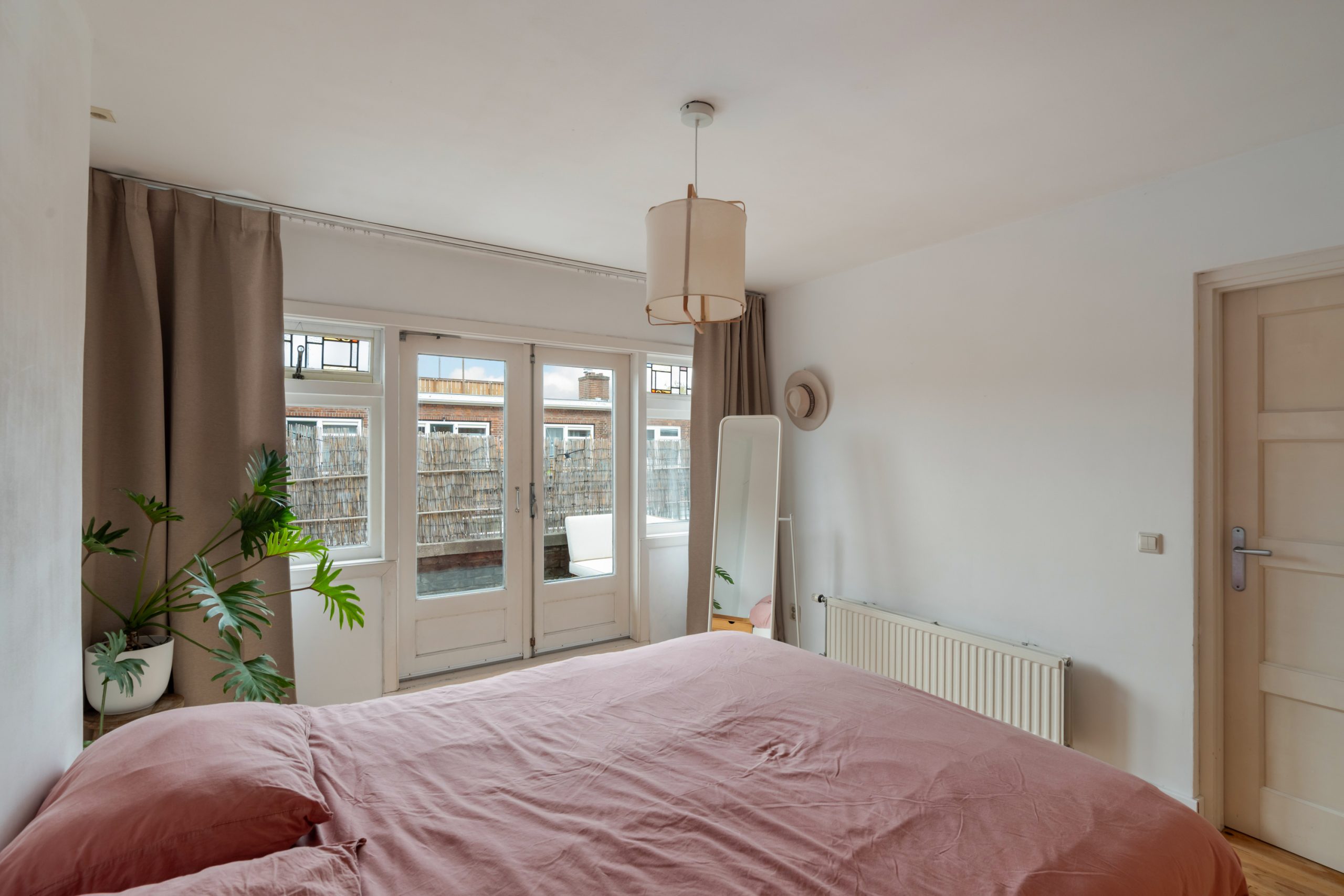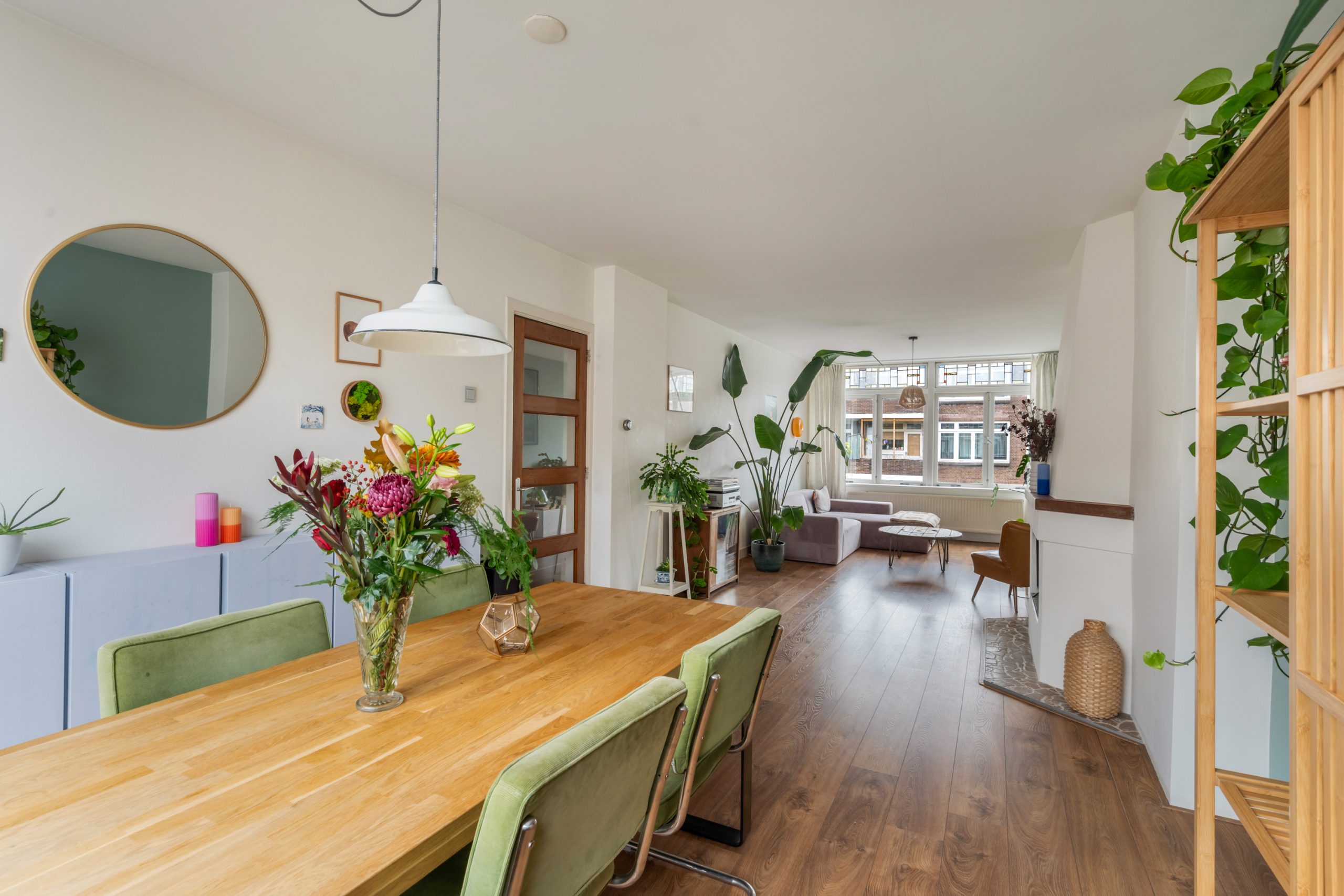 Overloop met meterkast, separaat toilet en toegang tot alle vertrekken. De royale woon-/eetkamer heeft maar liefst een lengte van ca. 10 meter lang! Door de grote raampartijen (die nog beschikken over het authentieke glas-in-lood) aan beide zijden van de woning treedt er veel natuurlijk licht de woning binnen, wat zorgt voor een fijne sfeer. Het zitgedeelte bevindt zich aan de achterzijde van de woning en vormt een fijne plek om te ontspannen. De eetkamer is gelegen aan de voorzijde van de woning en beschikt over voldoende ruimte voor een grote eettafel. De moderne keuken beschikt over diverse inbouwapparatuur zoals een 4-pits gasfornuis met afzuigkap, oven, vaatwasser en voldoende opbergruimte. De keuken biedt toegang tot het 1e balkon op het noordwesten. De 1e slaapkamer is gelegen aan de voorzijde en biedt voldoende ruimte voor een tweepersoonsbed en een kledingkast.