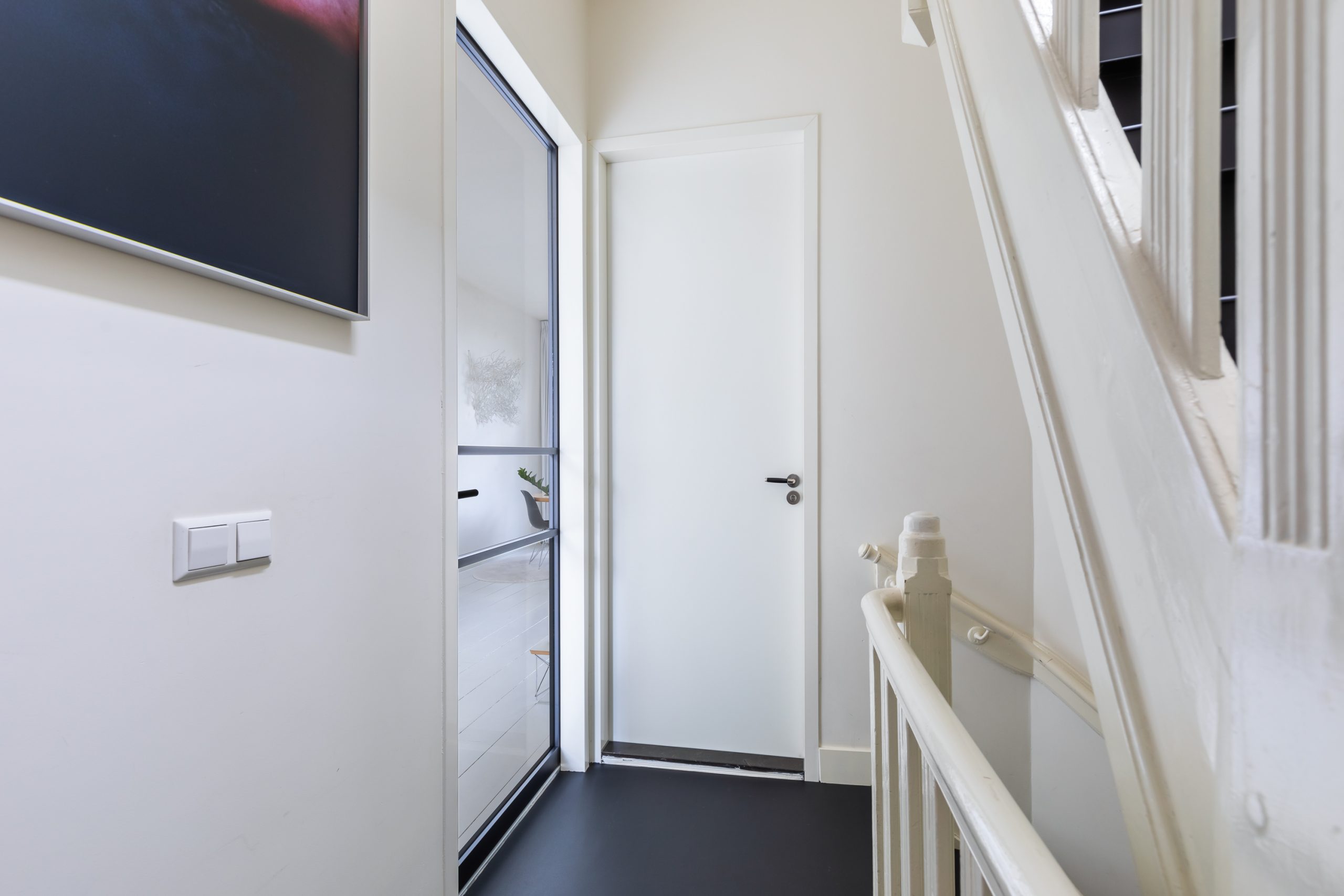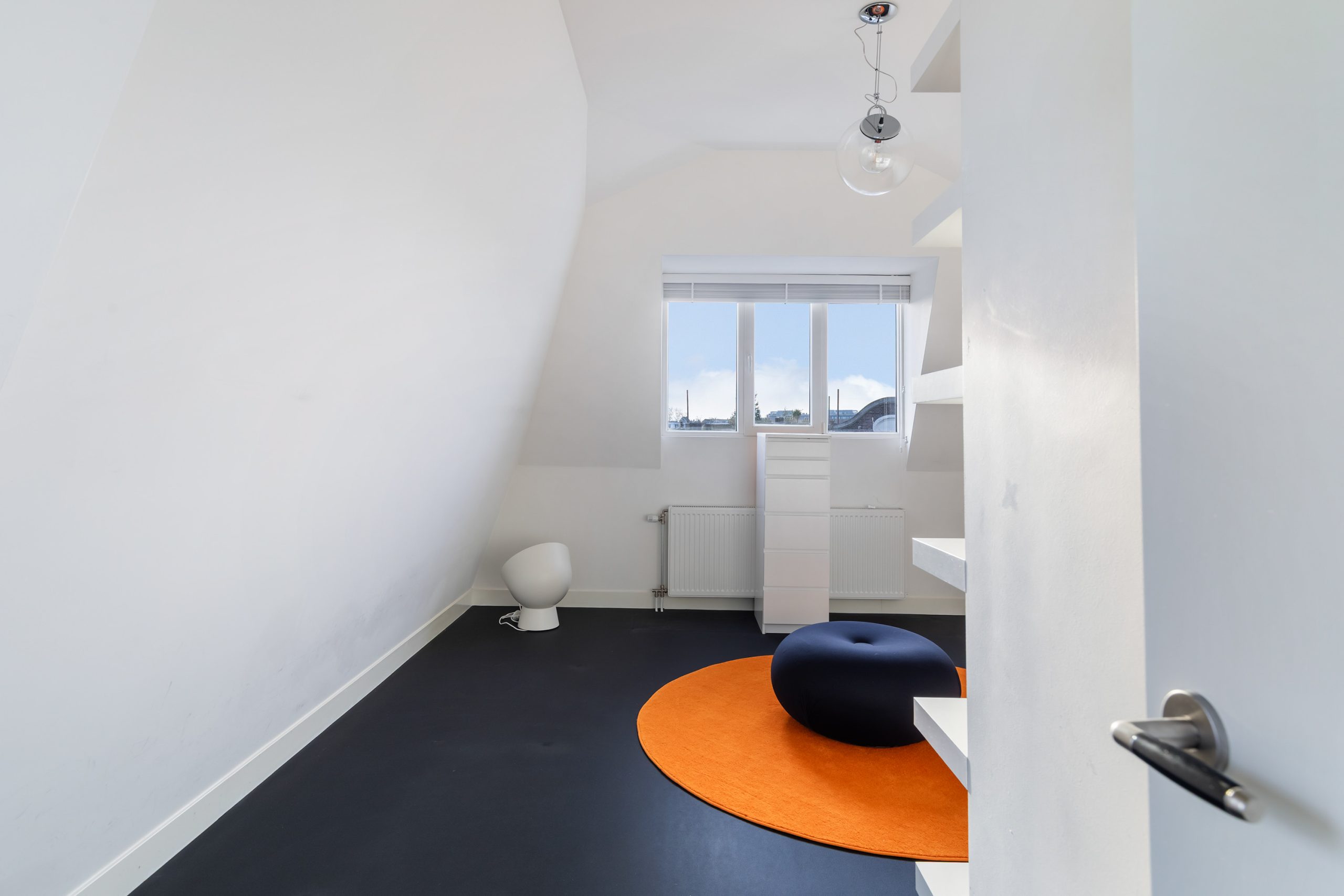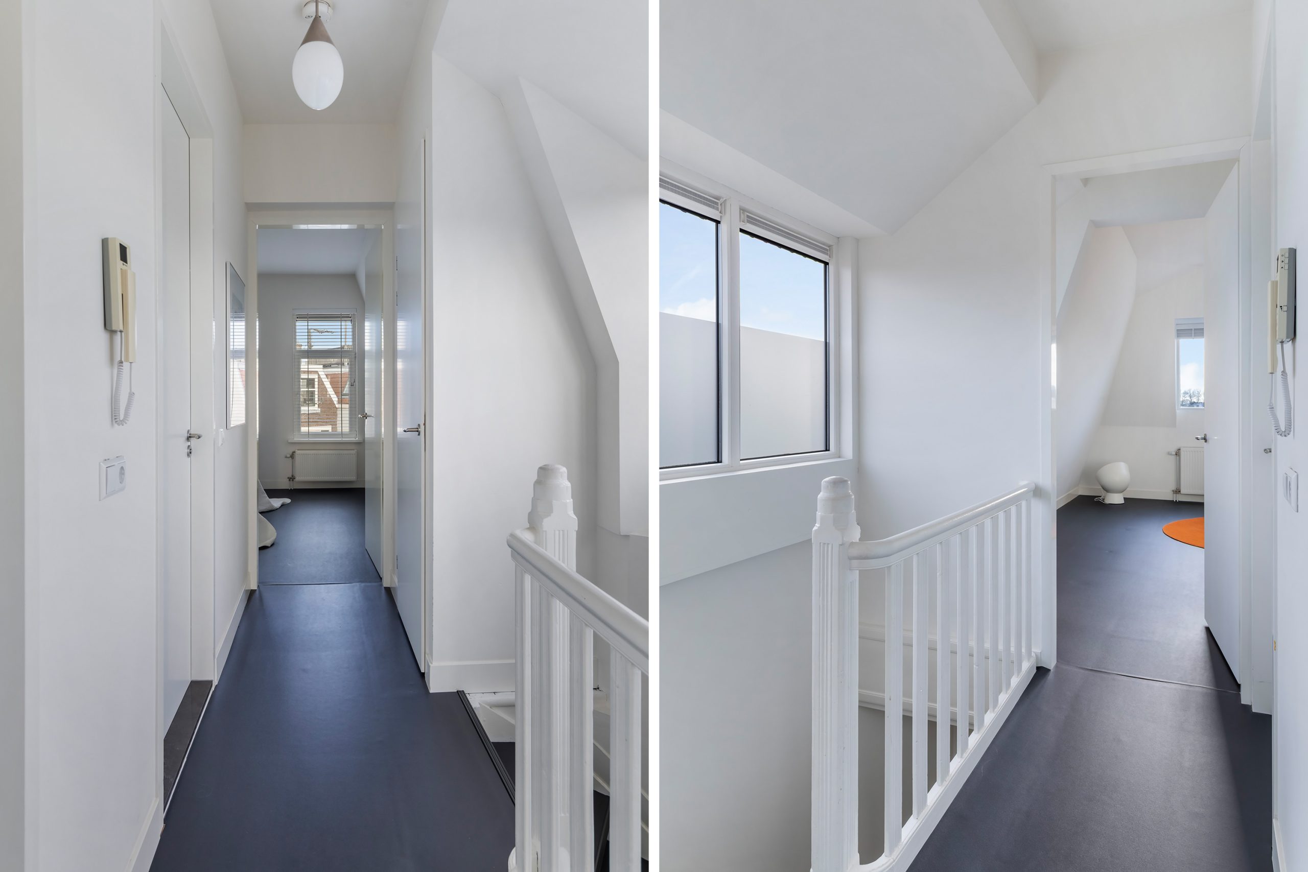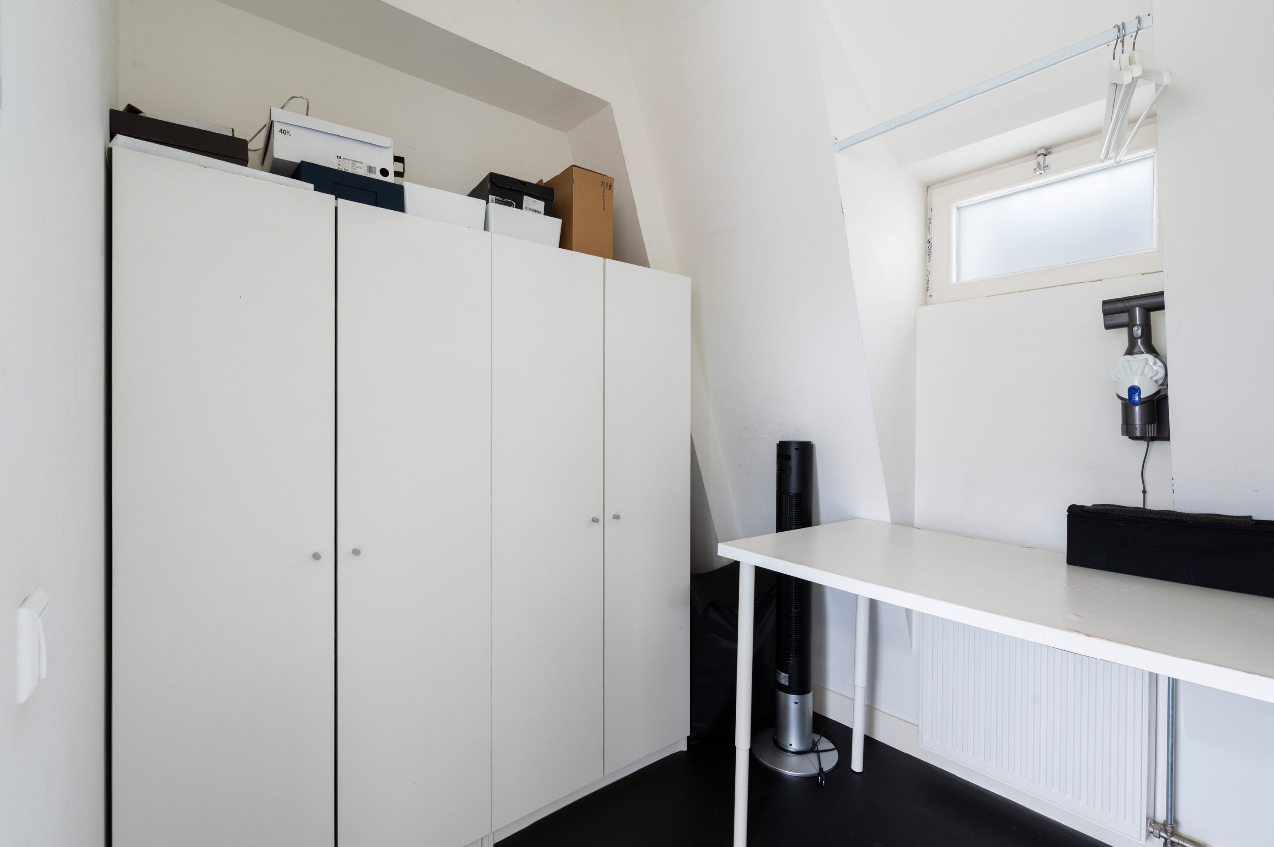 Overloop met vaste kast en toegang tot alle vertrekken op deze verdieping. De master bedroom is bijzonder ruim en biedt volop ruimte voor een tweepersoonsbed en een grote kledingkast. Ook de tweede slaapkamer is royaal van formaat. De moderne badkamer beschikt over een douche, wastafel en een toilet. Daarnaast is er een aparte wasruimte met wasmachine-aansluiting.