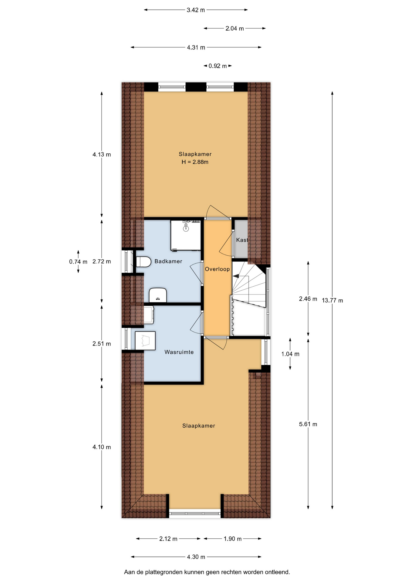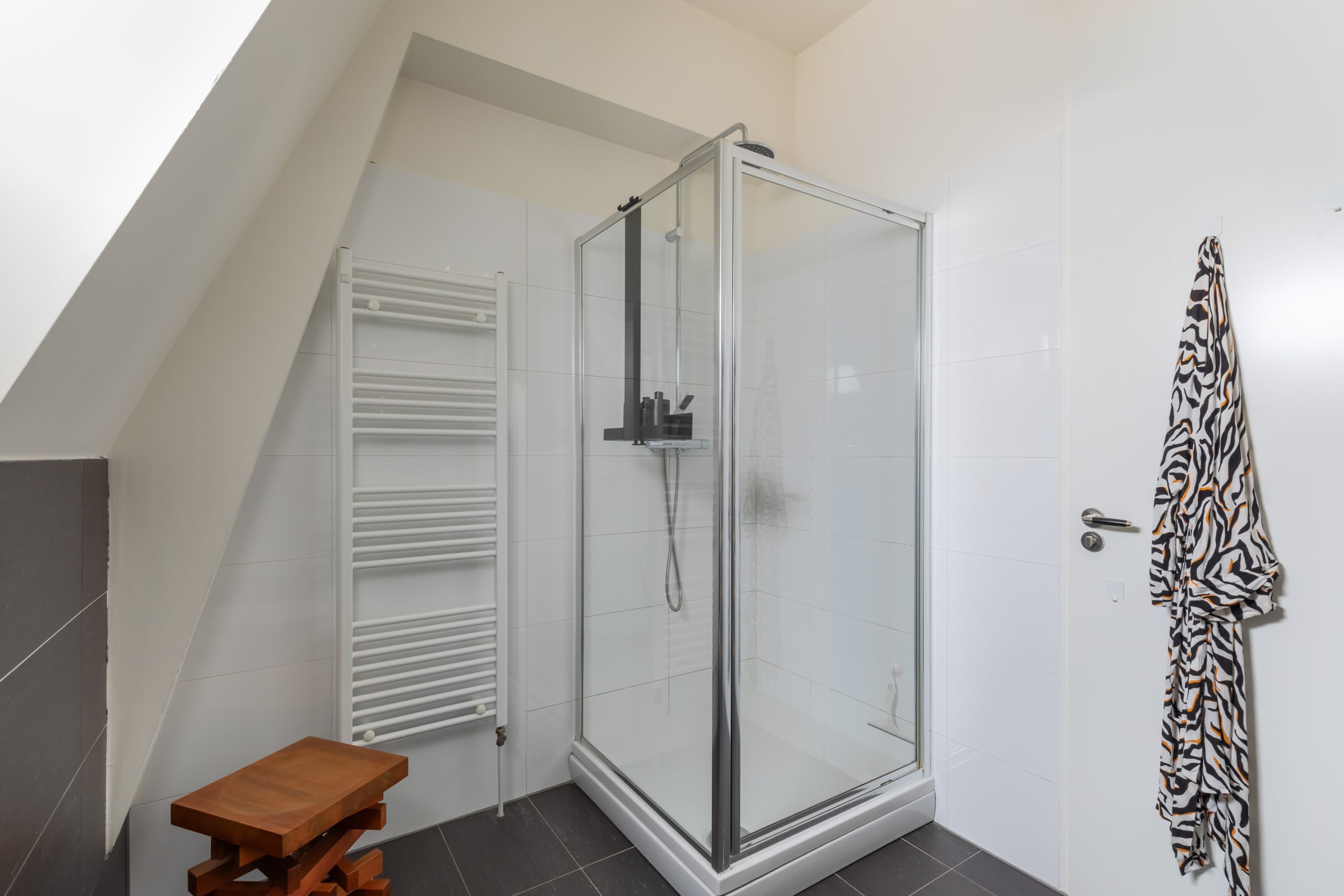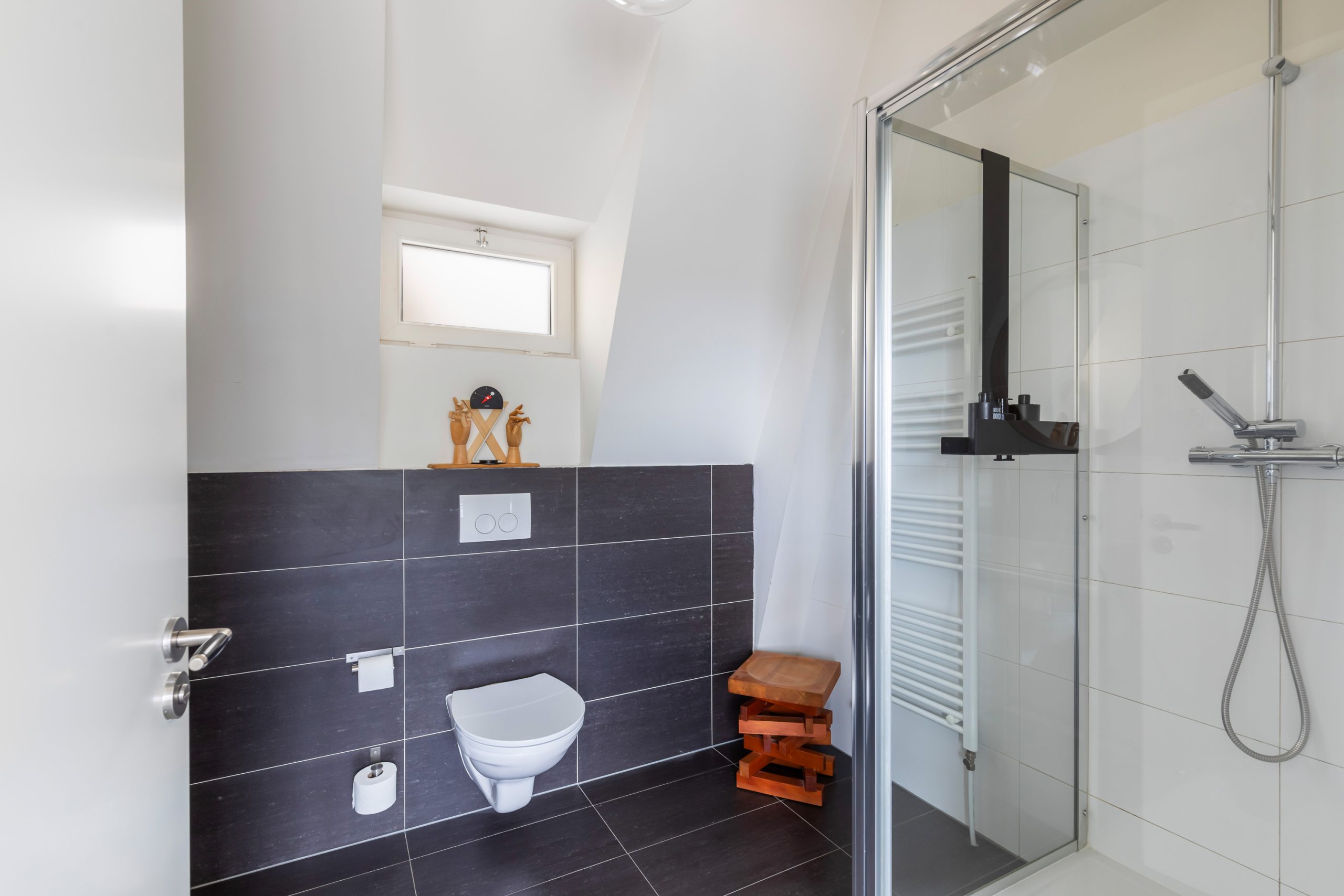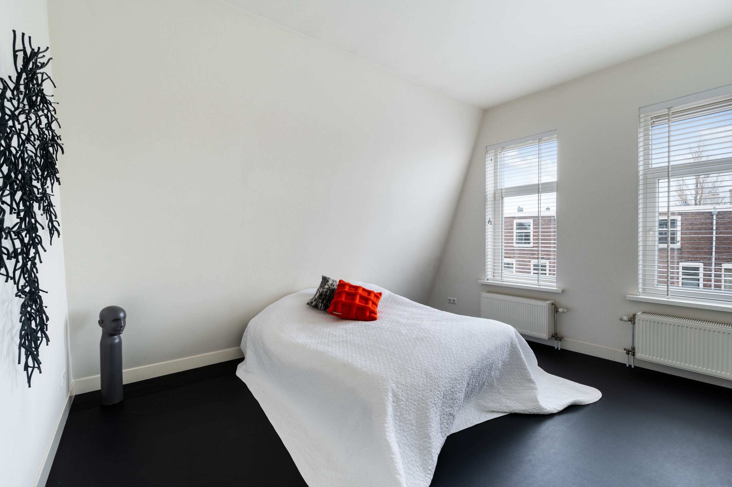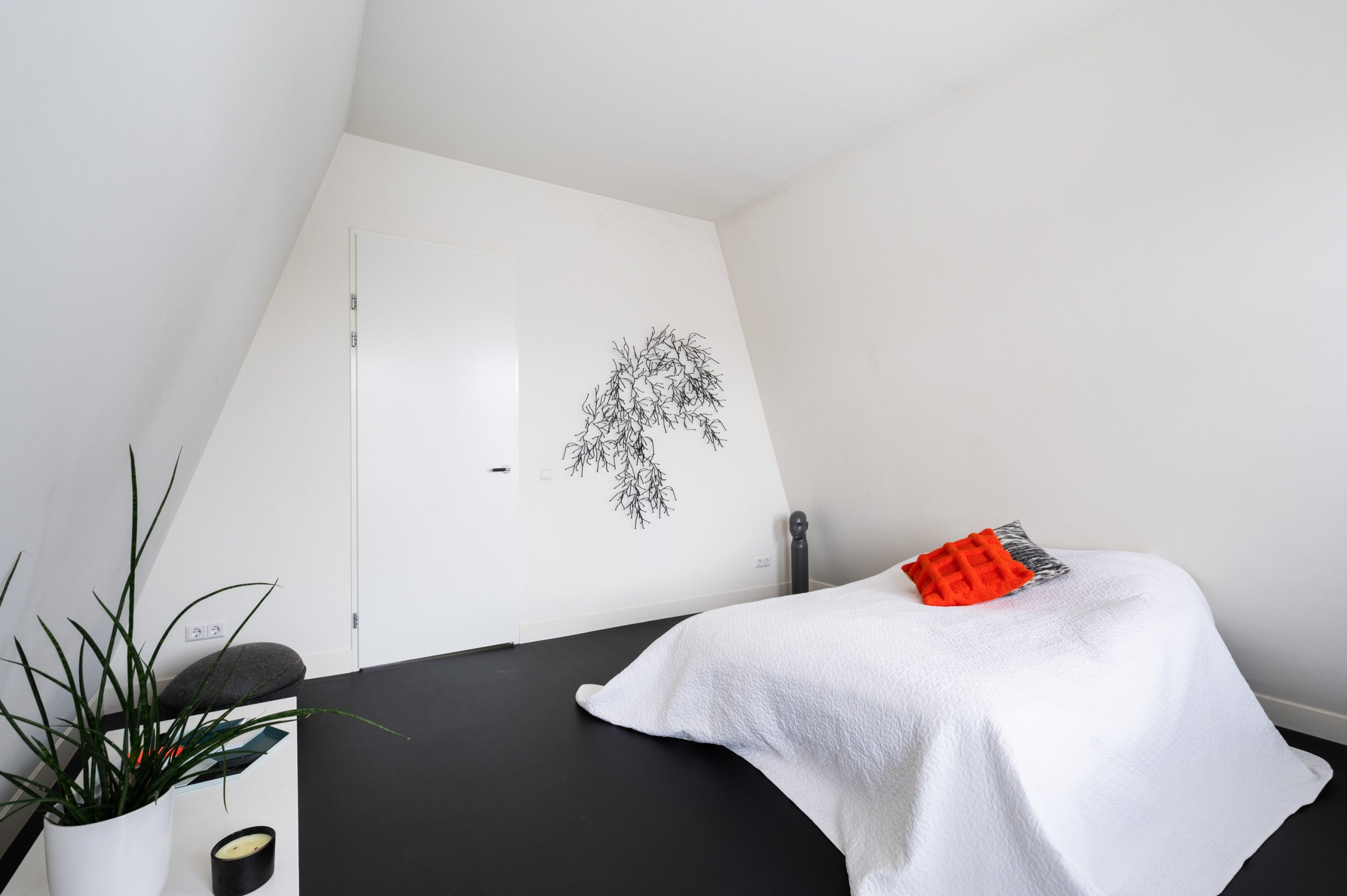 Overloop met vaste kast en toegang tot alle vertrekken op deze verdieping. De master bedroom is bijzonder ruim en biedt volop ruimte voor een tweepersoonsbed en een grote kledingkast. Ook de tweede slaapkamer is royaal van formaat. De moderne badkamer beschikt over een douche, wastafel en een toilet. Daarnaast is er een aparte wasruimte met wasmachine-aansluiting.