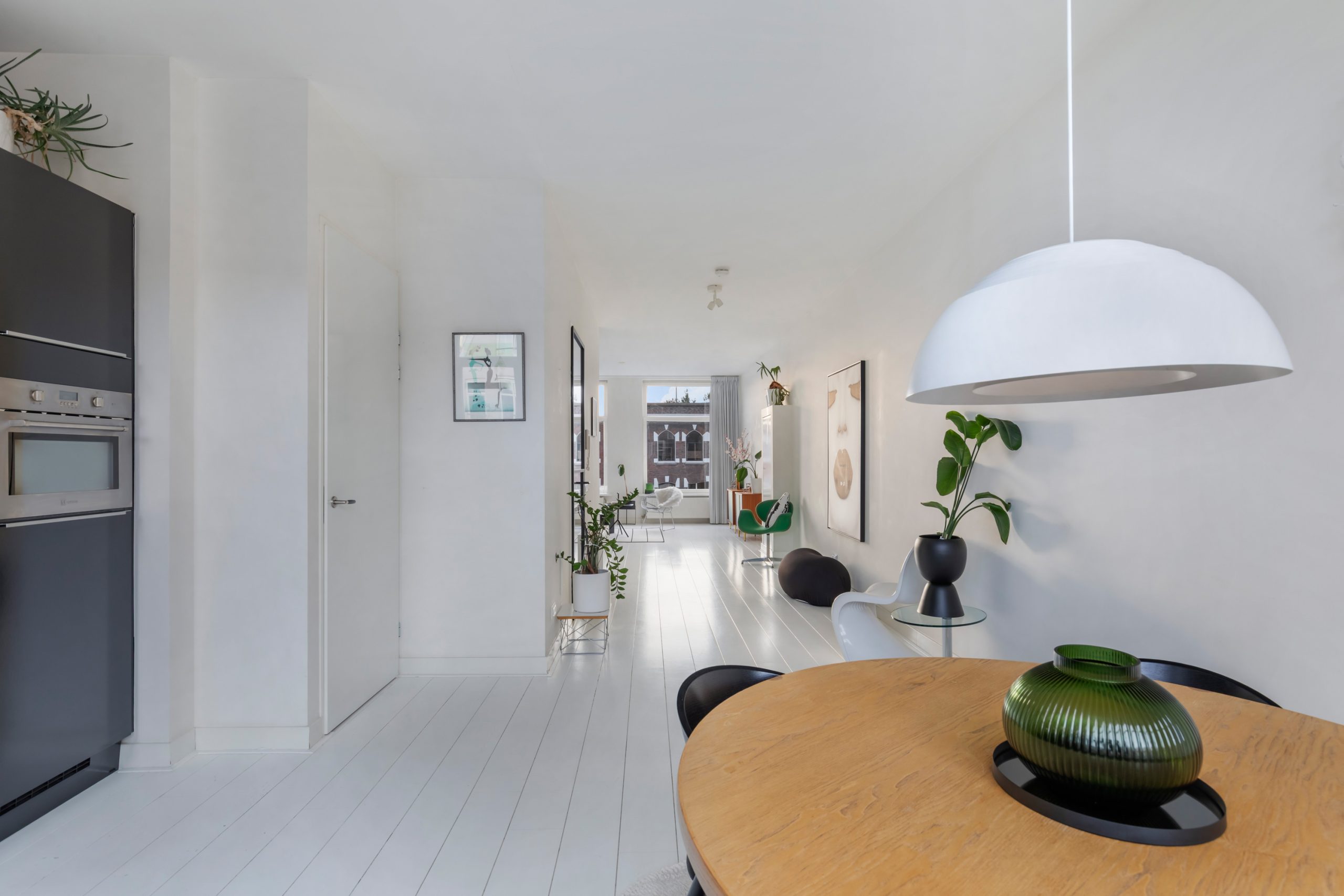 Overloop met separaat toilet en toegang tot de ruime woon-/eetkamer.Het woon- eet en keukengedeelte staan in directe verbinding met elkaar. Door de grote raampartijen aan beide zijden is dit een fijne en lichte ruimte. De woonkamer (voorzijde) is erg ruim en biedt voldoende ruimte voor een royale zithoek. Het eetgedeelte (achterzijde) is een fijne ruimte om met een groot gezelschap te dineren of te borrelen. De open keuken beschikt over verschillende (inbouw)apparatuur zoals een 4-pits gasfornuis, vaatwasser, combioven/magnetron, koelkast en een aparte vriezer.