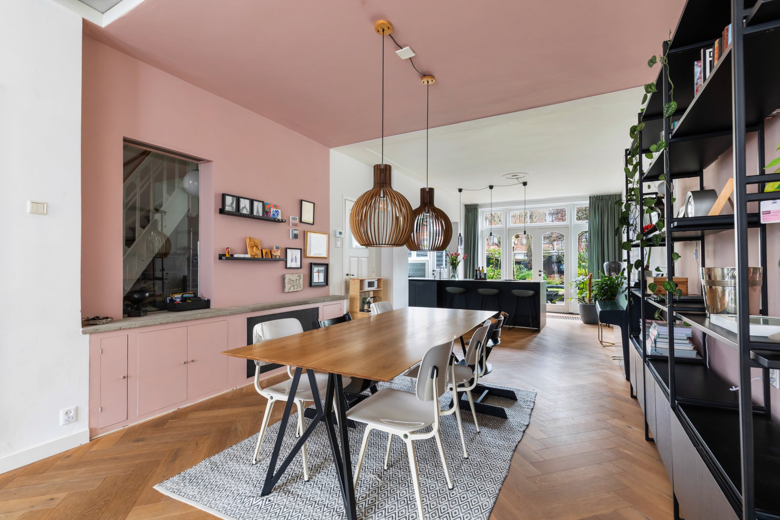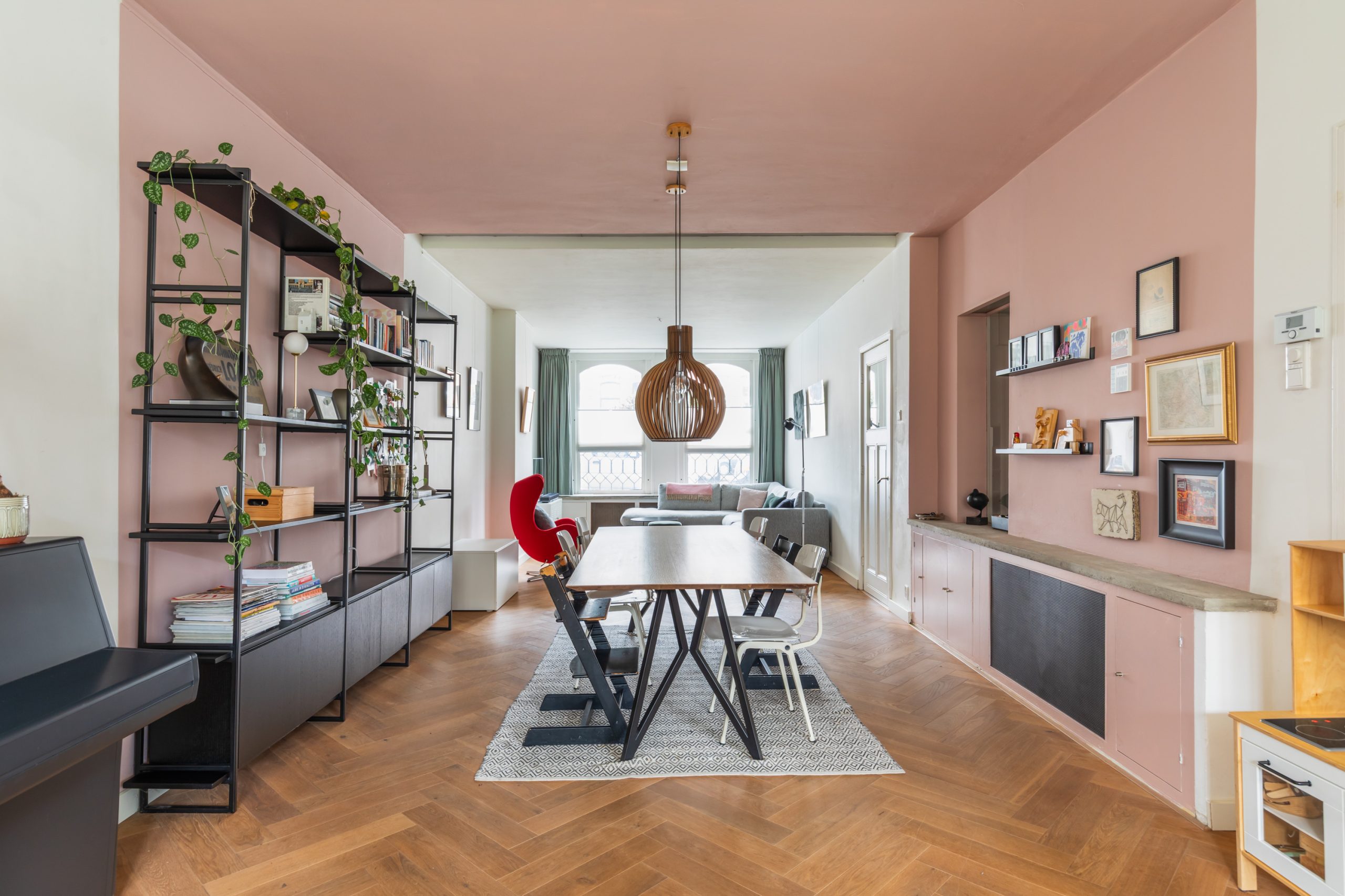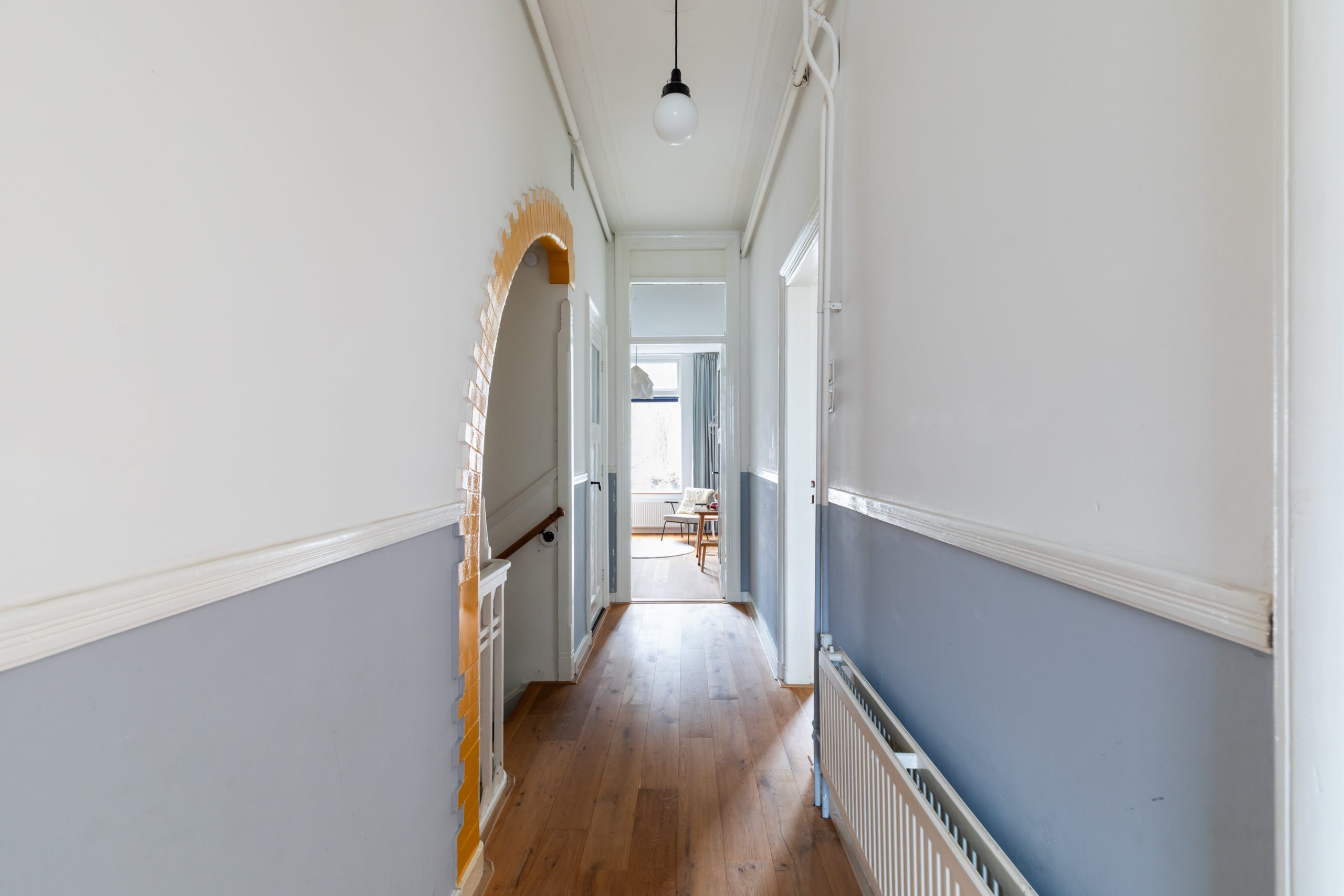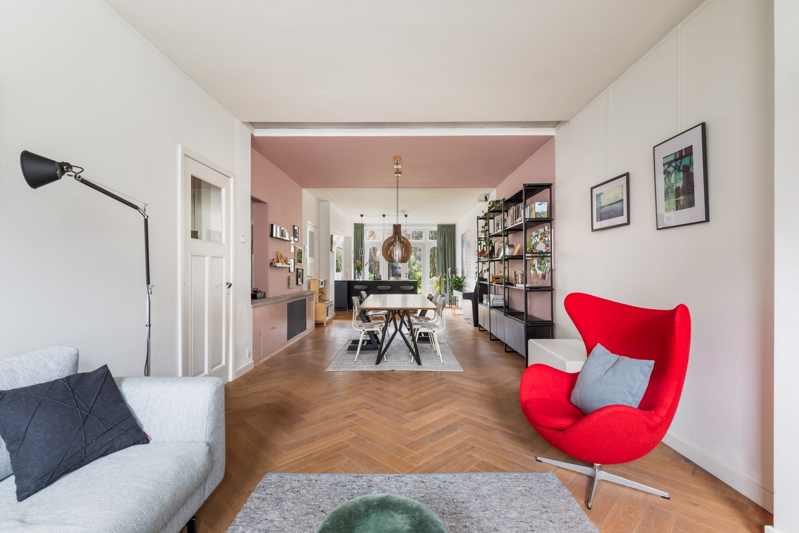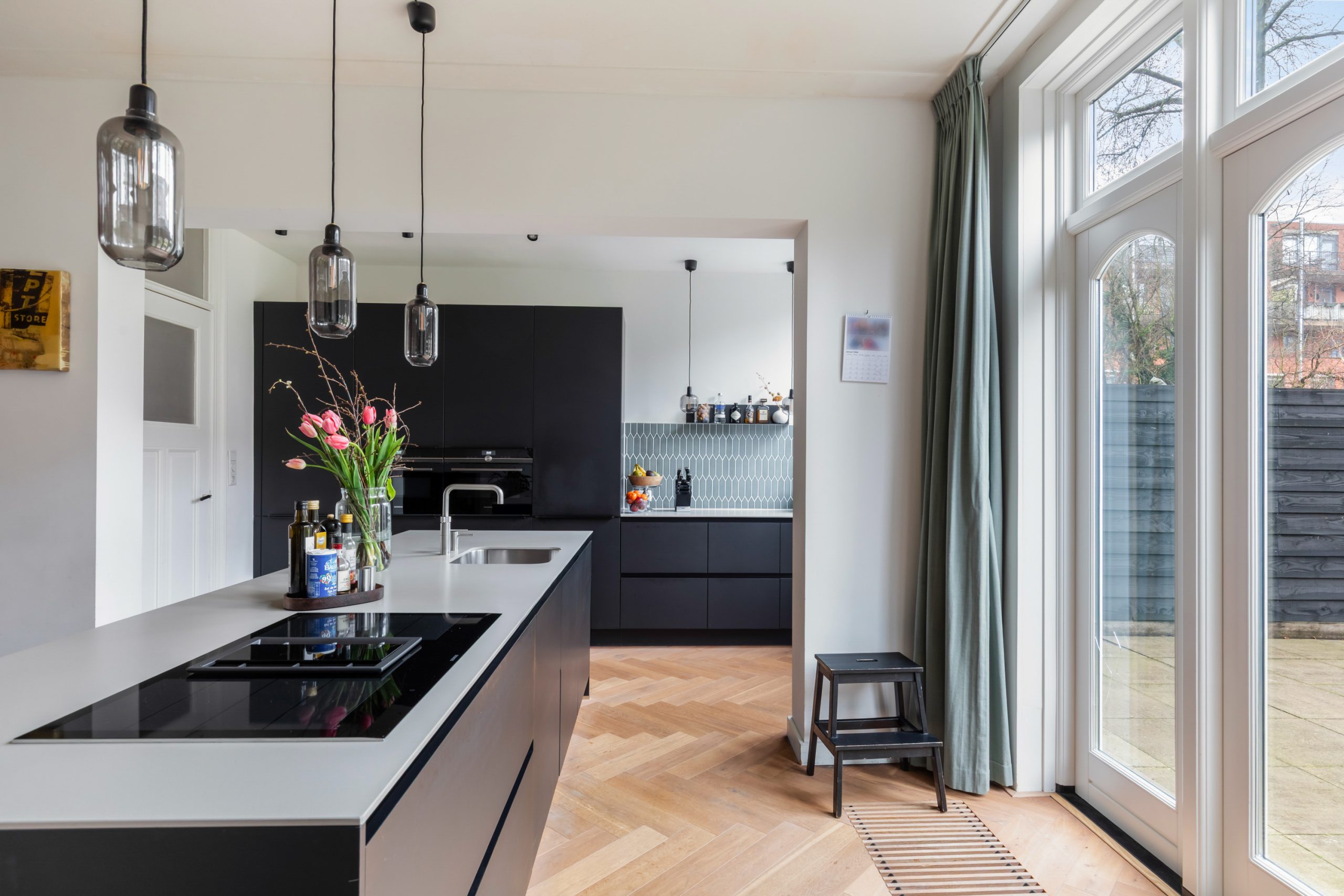 Stijlvolle entree met luxe marmeren en granito vloer, tochtportaal, separaat toilet en toegang tot alle vertrekken op deze verdieping. Bij binnenkomst valt direct de karakteristieke jaren ’10 details op zoals een granito vloer, paneeldeuren, toogkozijnen en ornamenten. De woonkamer heeft een indrukwekkende lengte van ca. 15 meter en een royale plafondhoogte van bijna 3 meter! Aan de voorzijde van de woning is het zitgedeelte met grote raampartijen en een mooie lichtinval, met voldoende ruimte om een comfortabele zithoek te creëren. Het eetgedeelte is gesitueerd in het midden van de woonkamer en staat in open verbinding met de keuken, die is voorzien van een kookeiland. De keuken beschikt over diverse inbouwapparatuur zoals een oven, magnetron, 4-pits elektrische kookplaat met geïntrigeerde afzuiging, quooker, vaatwasser en een koel-/vriescombinatie. Via een aparte deur en de openslaande deuren bereik je de achtertuin, gelegen op het oosten. De gehele dag is er wel ergens zon te vinden in de tuin. De tuin is diep en ruim opgezet, met een verhard gedeelte direct aan de woning en aan de achterzijde een sfeervolle overkapping met vlonder.