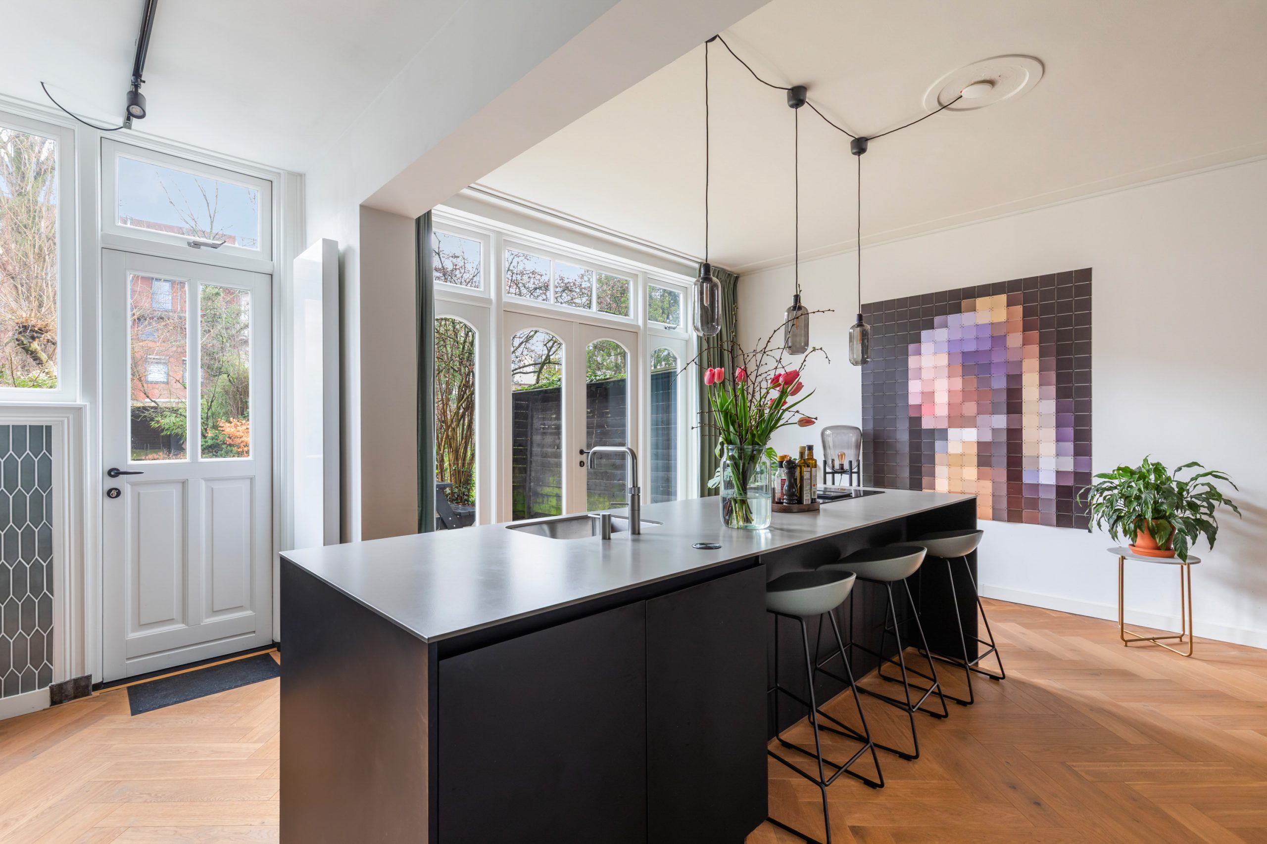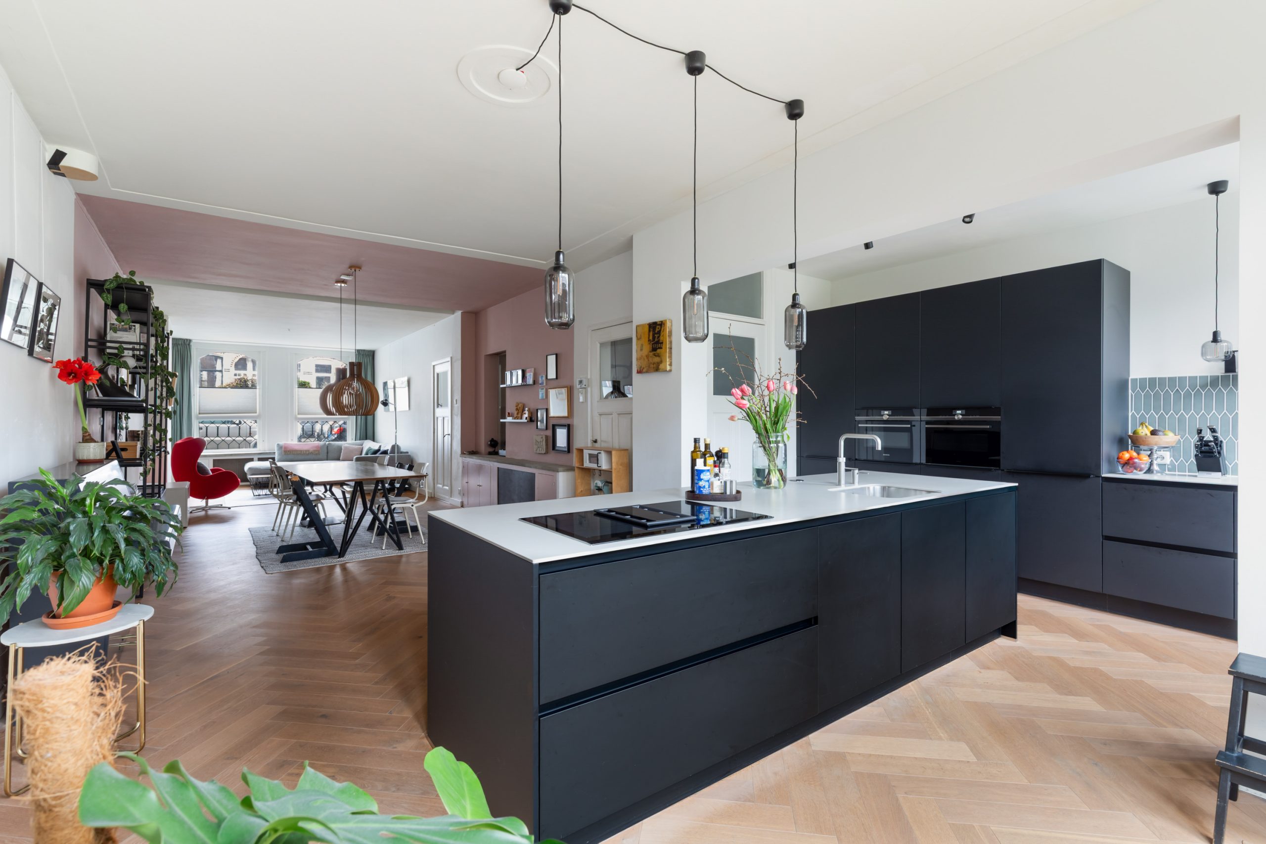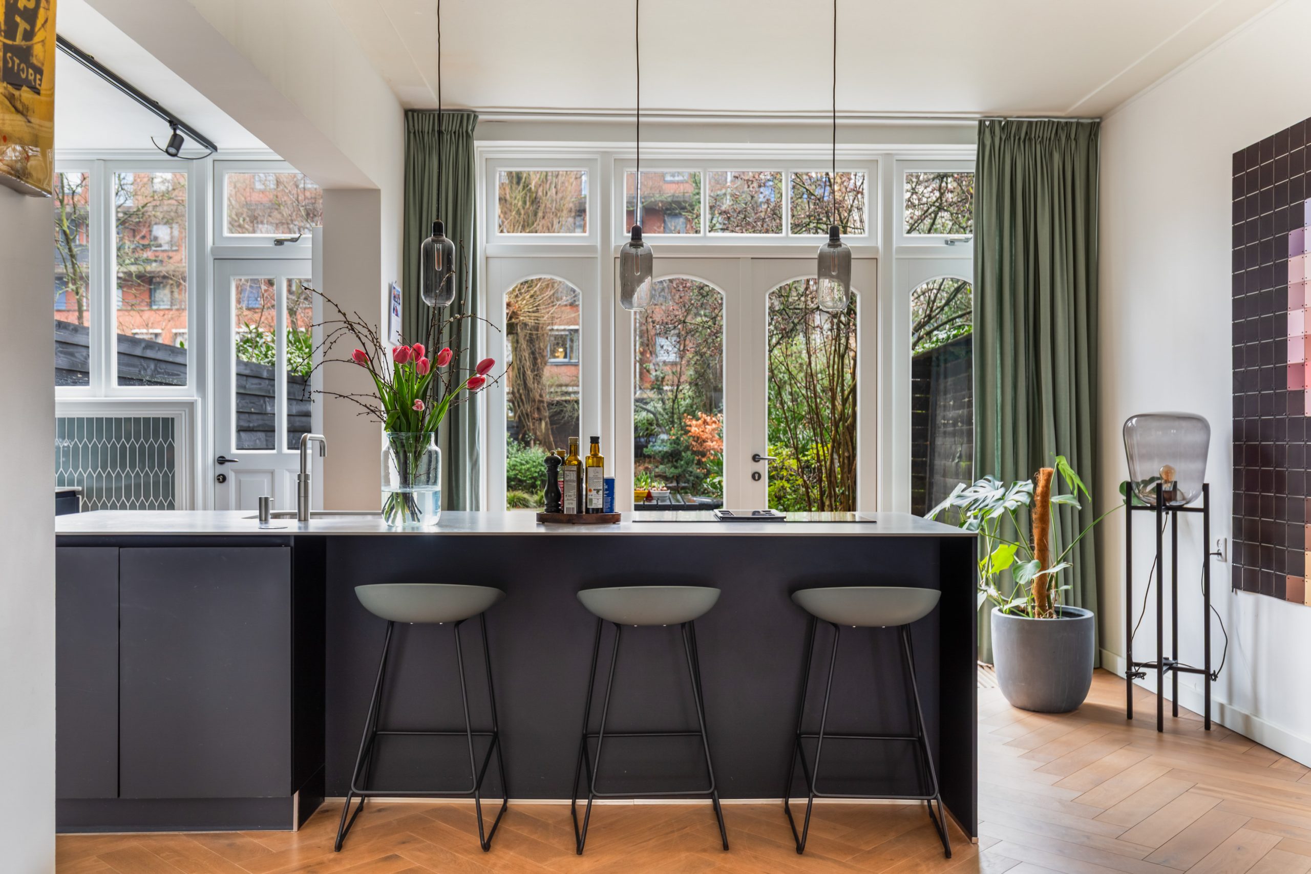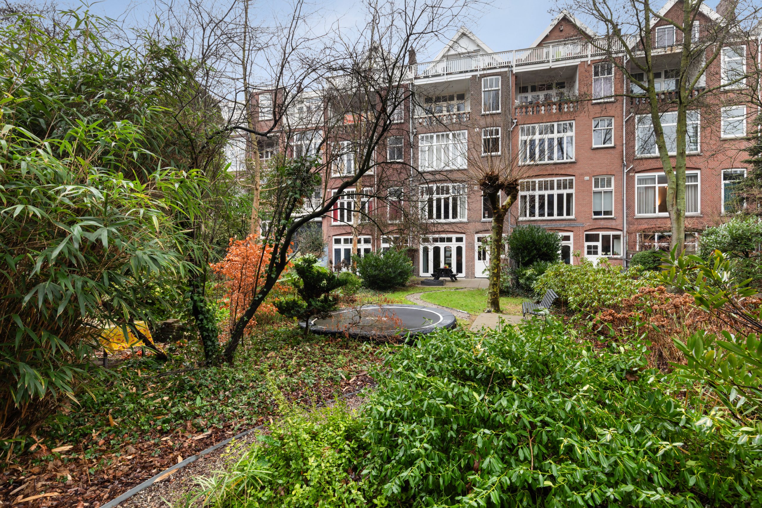 Stijlvolle entree met luxe marmeren en granito vloer, tochtportaal, separaat toilet en toegang tot alle vertrekken op deze verdieping. Bij binnenkomst valt direct de karakteristieke jaren ’10 details op zoals een granito vloer, paneeldeuren, toogkozijnen en ornamenten. De woonkamer heeft een indrukwekkende lengte van ca. 15 meter en een royale plafondhoogte van bijna 3 meter! Aan de voorzijde van de woning is het zitgedeelte met grote raampartijen en een mooie lichtinval, met voldoende ruimte om een comfortabele zithoek te creëren. Het eetgedeelte is gesitueerd in het midden van de woonkamer en staat in open verbinding met de keuken, die is voorzien van een kookeiland. De keuken beschikt over diverse inbouwapparatuur zoals een oven, magnetron, 4-pits elektrische kookplaat met geïntrigeerde afzuiging, quooker, vaatwasser en een koel-/vriescombinatie. Via een aparte deur en de openslaande deuren bereik je de achtertuin, gelegen op het oosten. De gehele dag is er wel ergens zon te vinden in de tuin. De tuin is diep en ruim opgezet, met een verhard gedeelte direct aan de woning en aan de achterzijde een sfeervolle overkapping met vlonder.