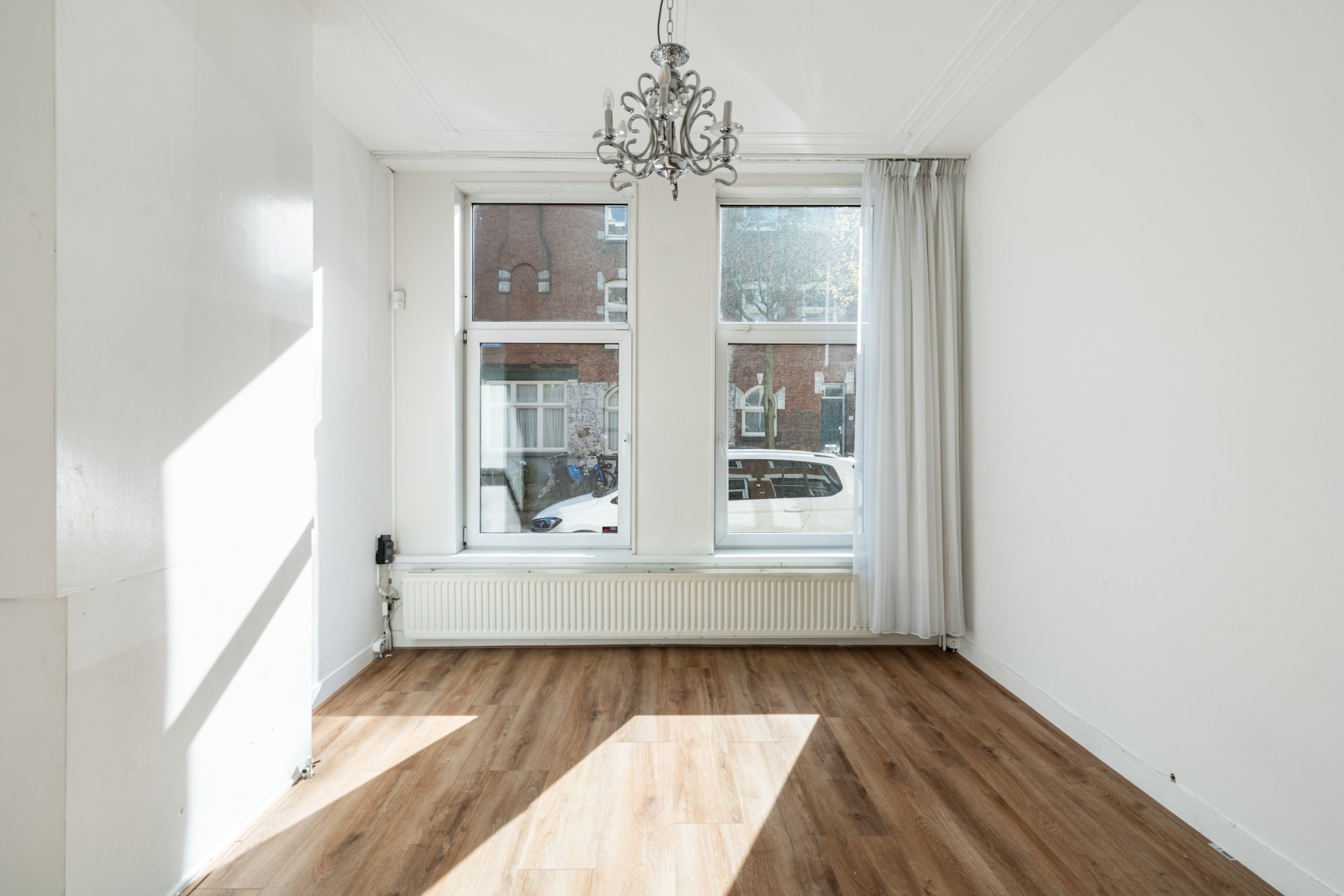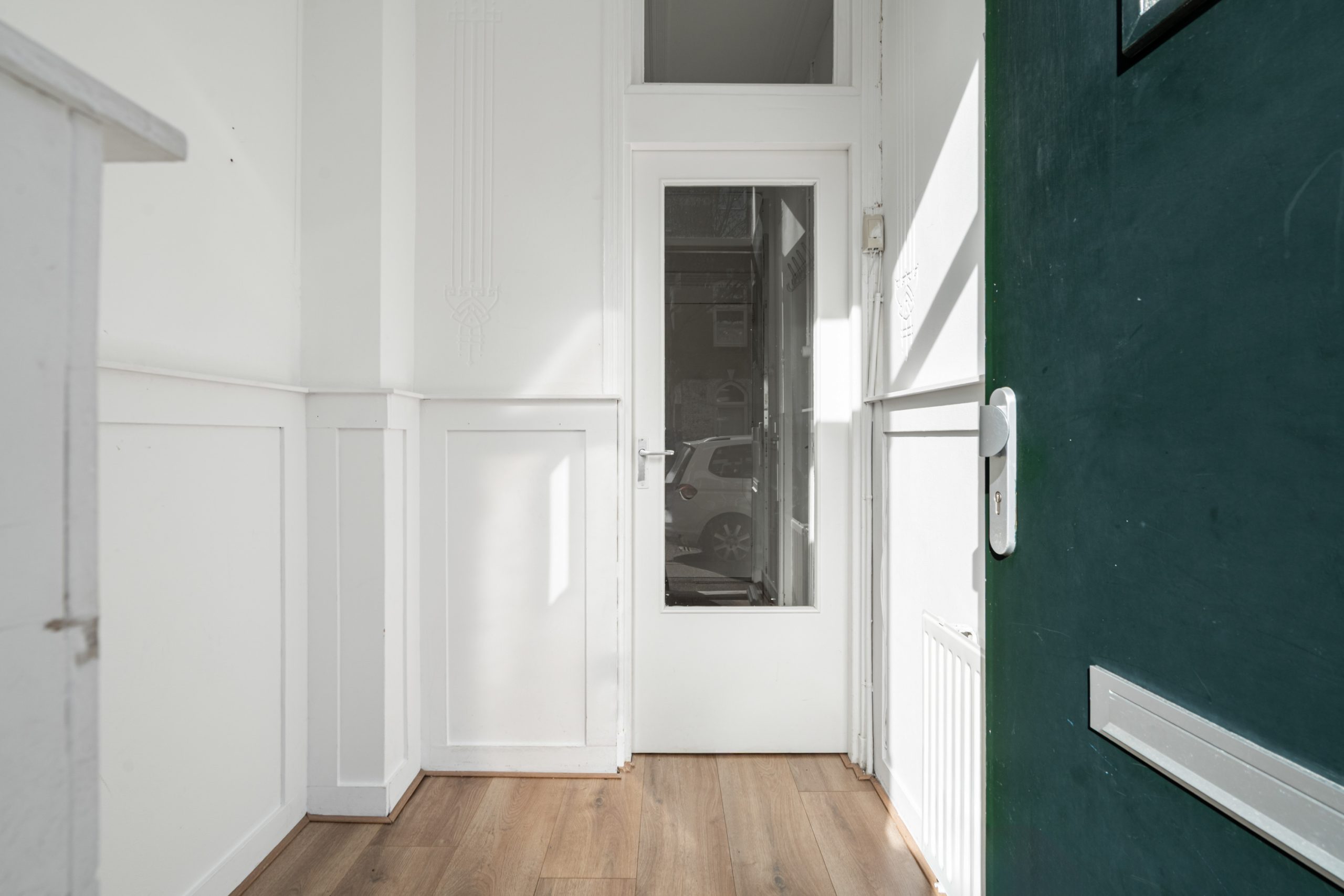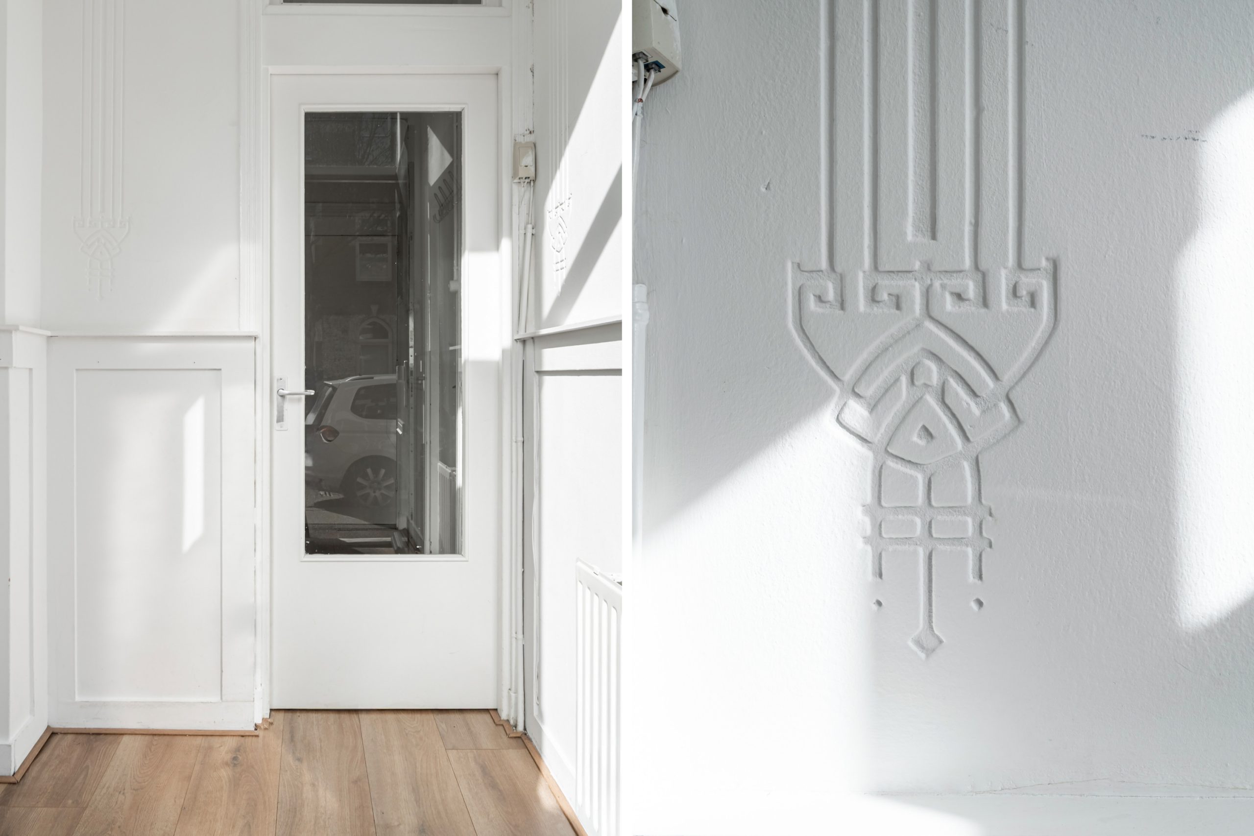 Royale hal/entree met toegang tot alle vertrekken op deze verdieping. De woonkamer met meterkast is gelegen aan de voorzijde en beschikt over een fraaie plafondhoogte, waardoor deze extra licht en ruim aanvoelt. Daarnaast is de woonkamer voorzien van de originele ornamenten, wat zorgt voor extra karakter. Dankzij de grote raampartijen over de lengte is er veel lichtinval. De ruimte leent zich ook goed als eetgedeelte. Via de hal met vaste kast bereik je de keuken, gelegen aan de achterzijde van de woning. De moderne keuken beschikt over een vaste kast (cv-opstelling), 4-pits gasfornuis met afzuigkap, oven en een vaatwasser. Middels een deur in de keuken bereik je de achtertuin van 6 m2, gelegen op het westen.