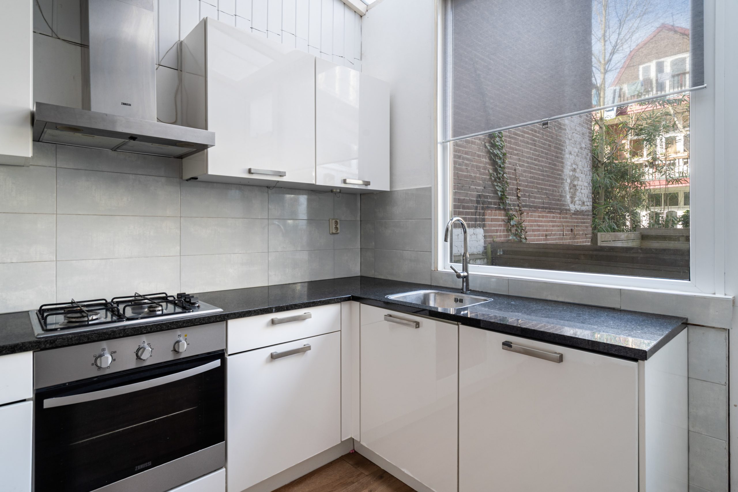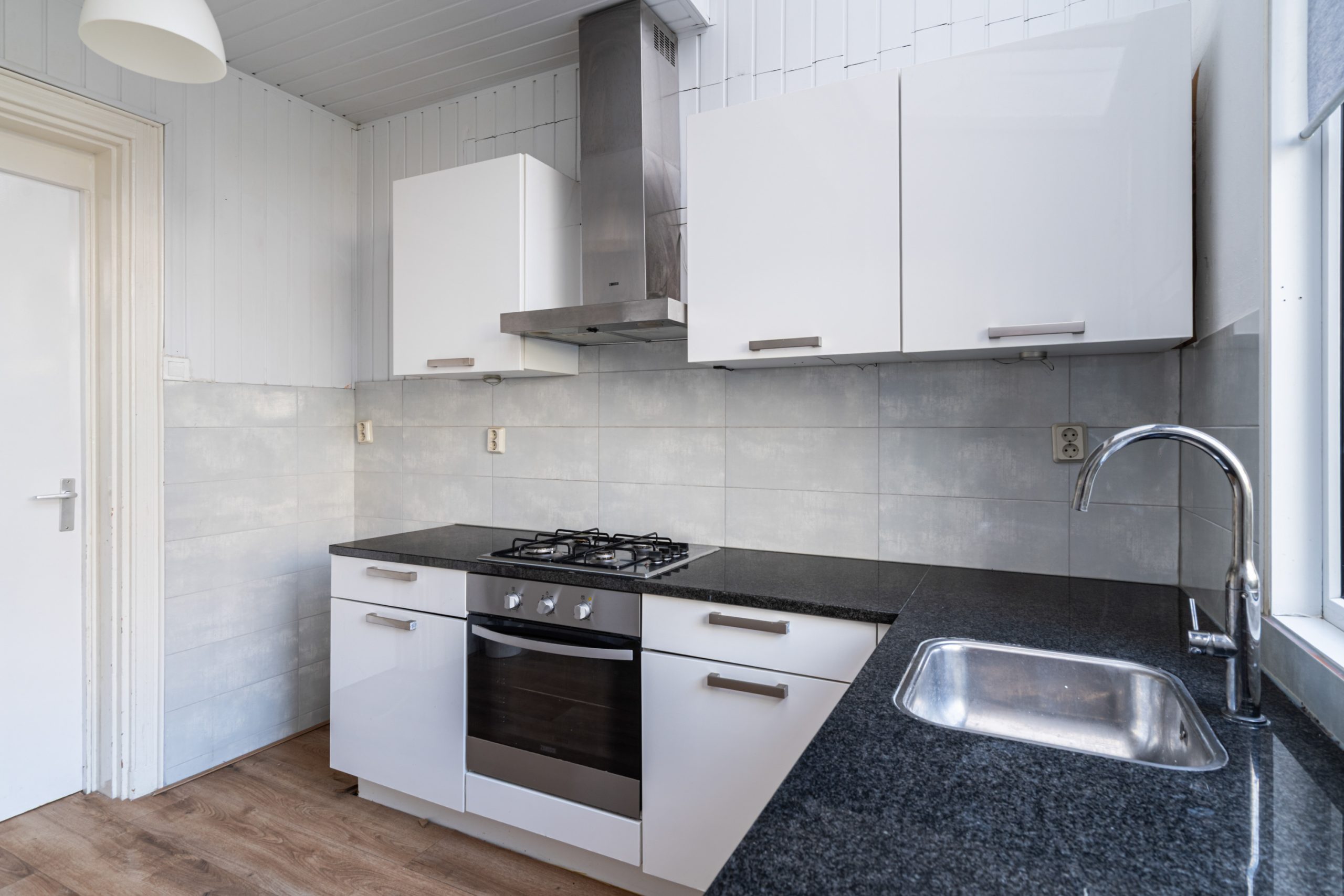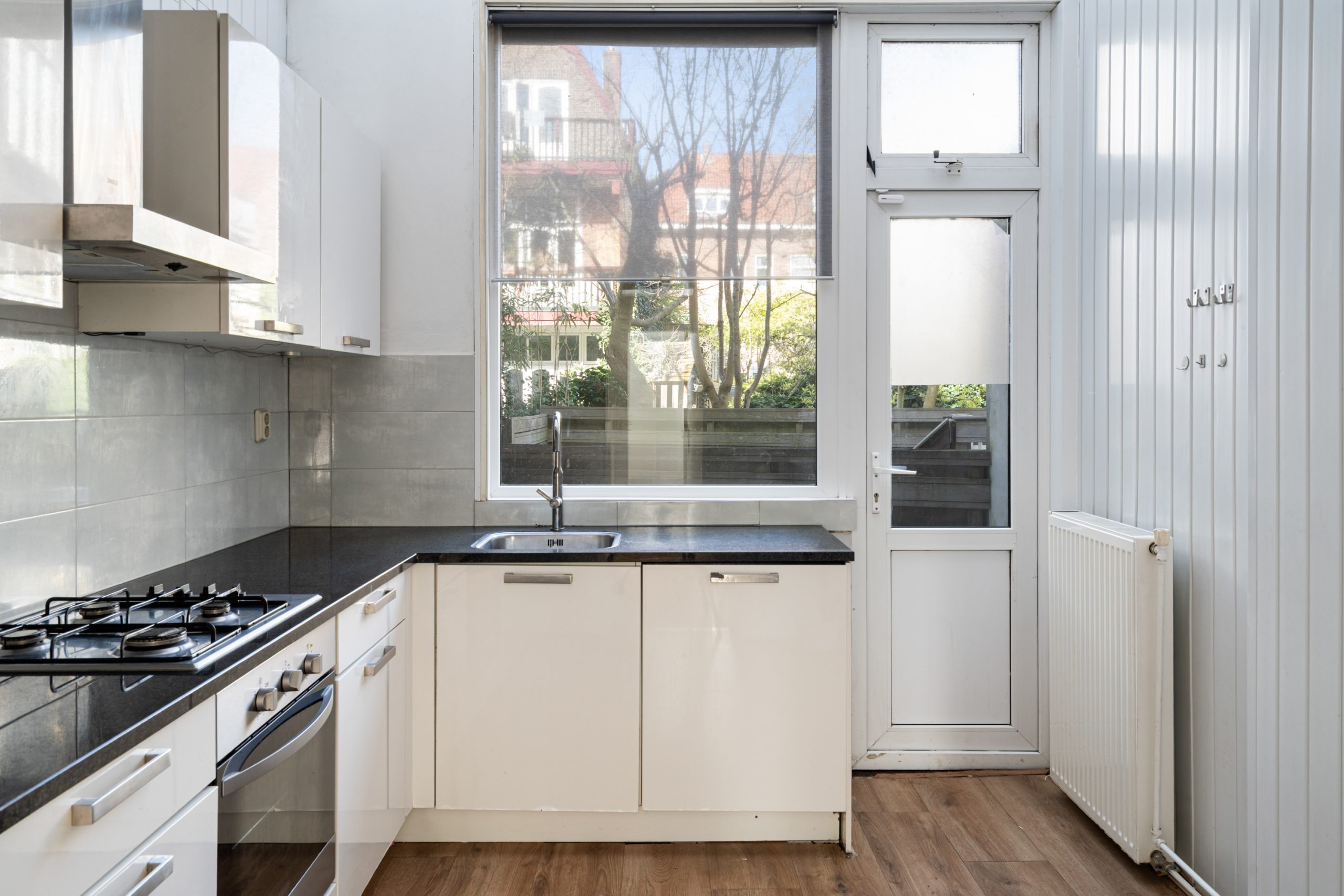 Royale hal/entree met toegang tot alle vertrekken op deze verdieping. De woonkamer met meterkast is gelegen aan de voorzijde en beschikt over een fraaie plafondhoogte, waardoor deze extra licht en ruim aanvoelt. Daarnaast is de woonkamer voorzien van de originele ornamenten, wat zorgt voor extra karakter. Dankzij de grote raampartijen over de lengte is er veel lichtinval. De ruimte leent zich ook goed als eetgedeelte. Via de hal met vaste kast bereik je de keuken, gelegen aan de achterzijde van de woning. De moderne keuken beschikt over een vaste kast (cv-opstelling), 4-pits gasfornuis met afzuigkap, oven en een vaatwasser. Middels een deur in de keuken bereik je de achtertuin van 6 m2, gelegen op het westen.