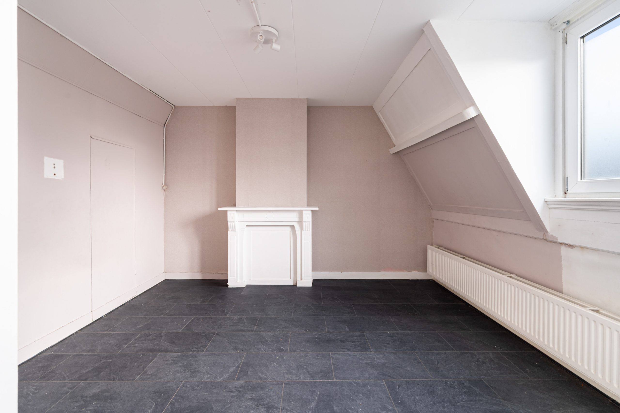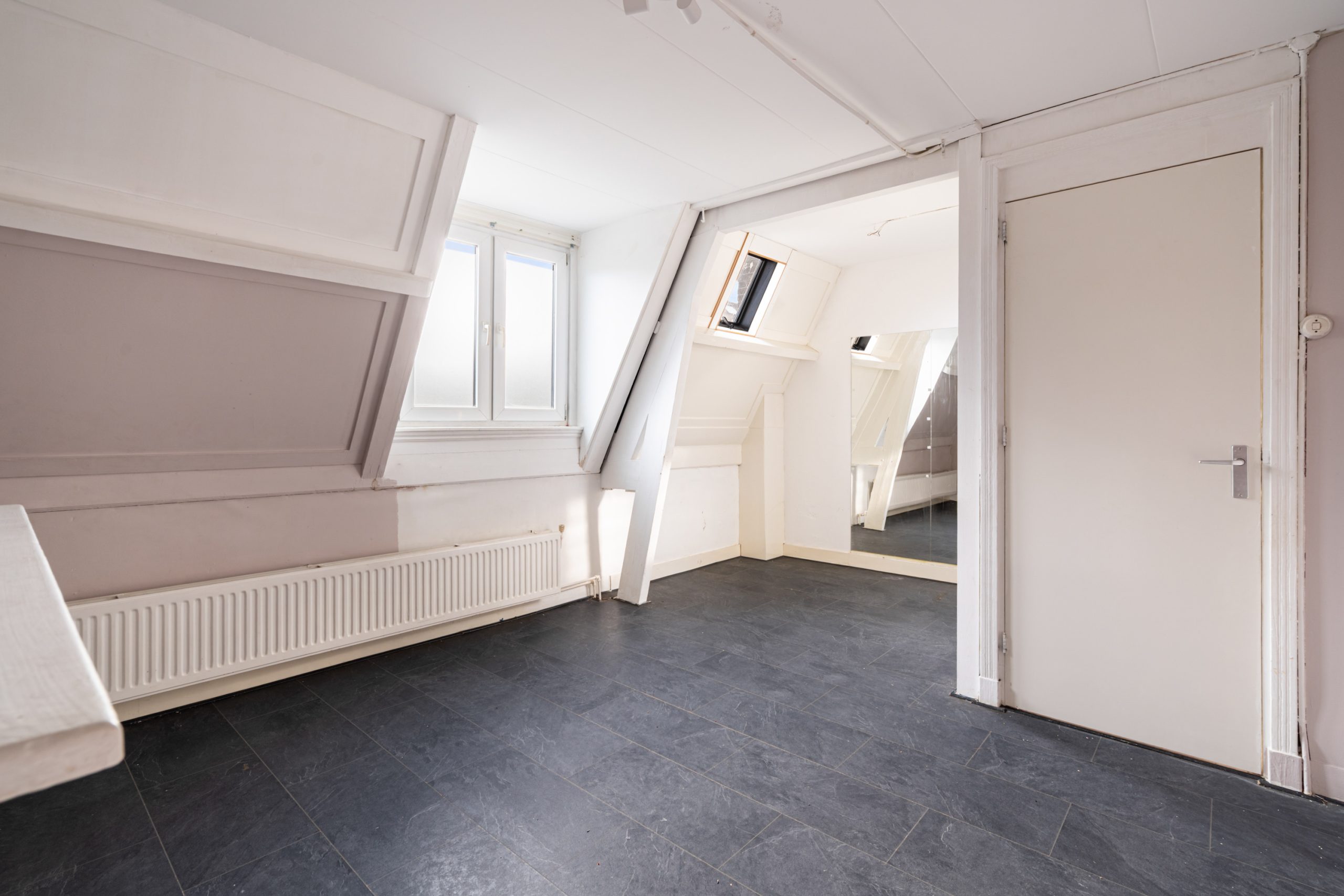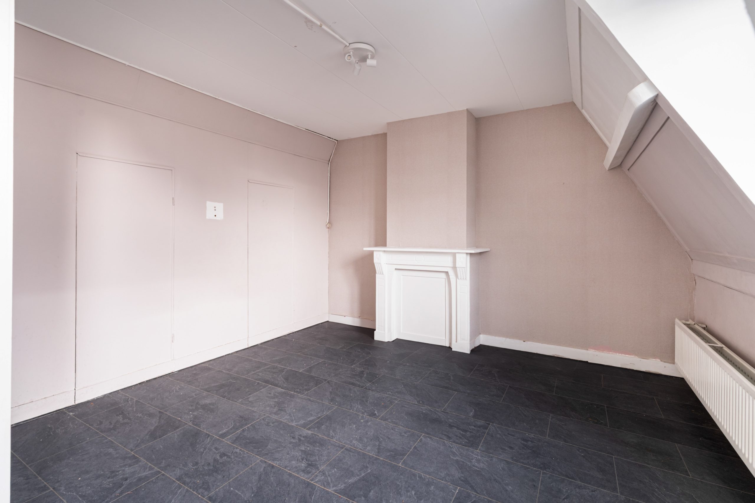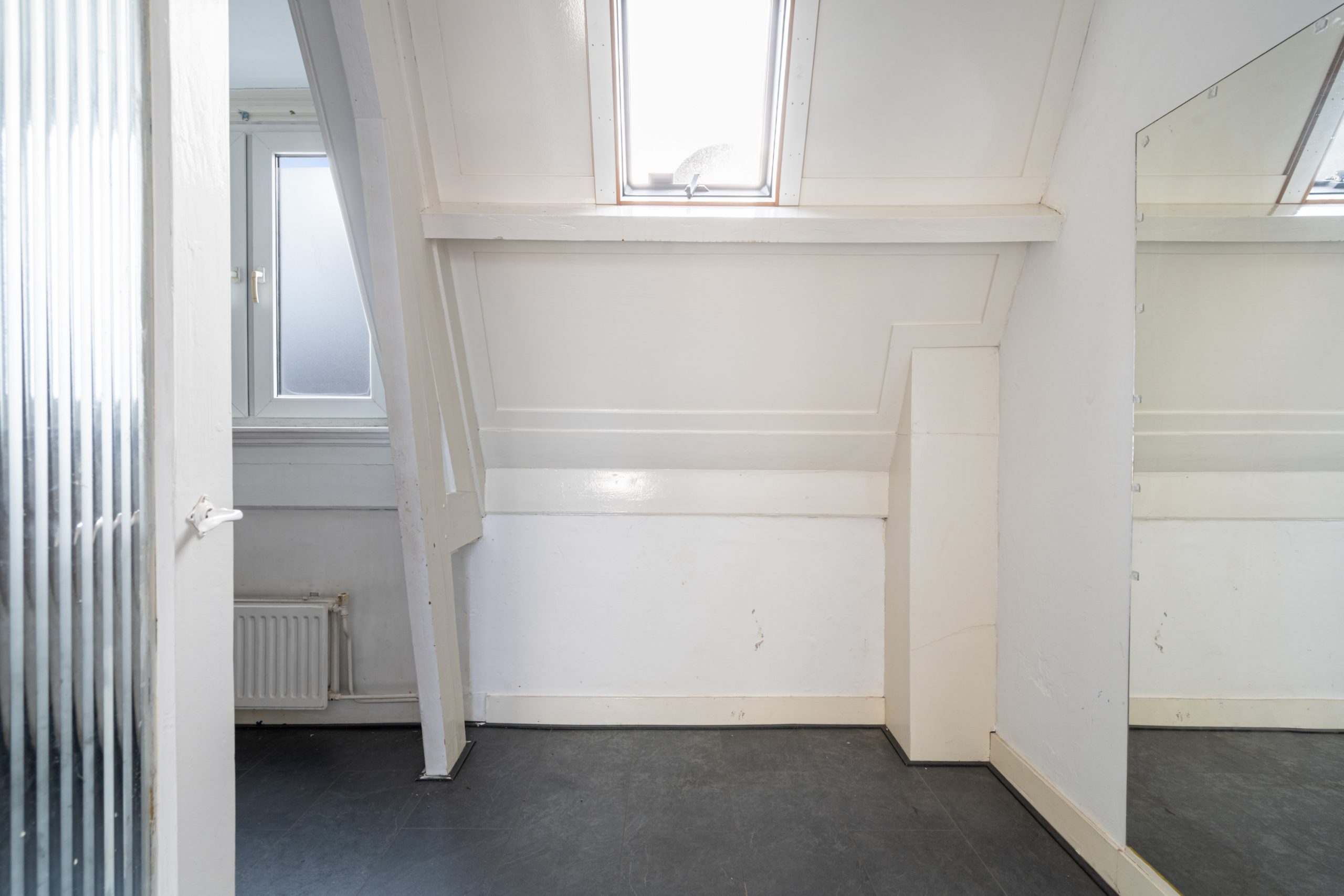Overloop met toegang tot de 3e slaapkamer. De ruimte kenmerkt zich door het schuine dak, wat zorgt voor een knusse sfeer. Daarnaast is er een nette schouw aanwezig, die de kamer extra karakter geeft. Verder is er een radiator aanwezig en bieden de ingebouwde kastruimtes praktische opbergruimte.