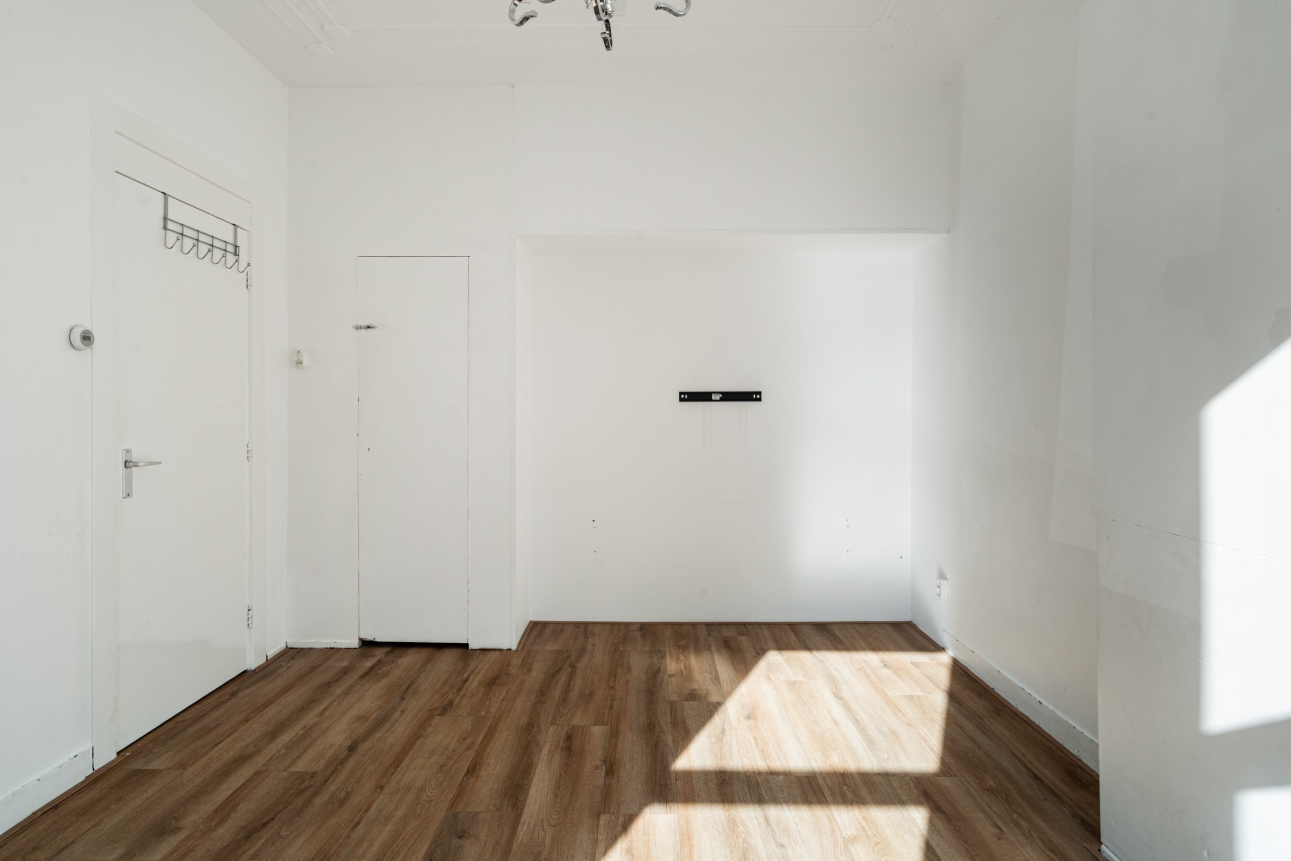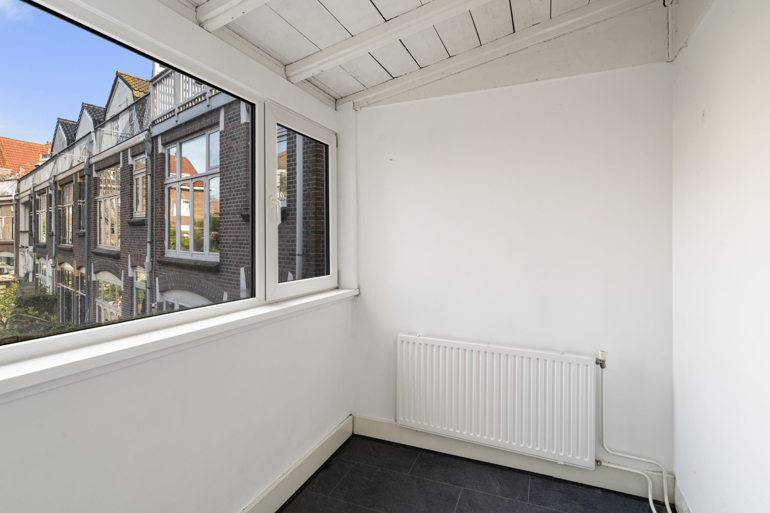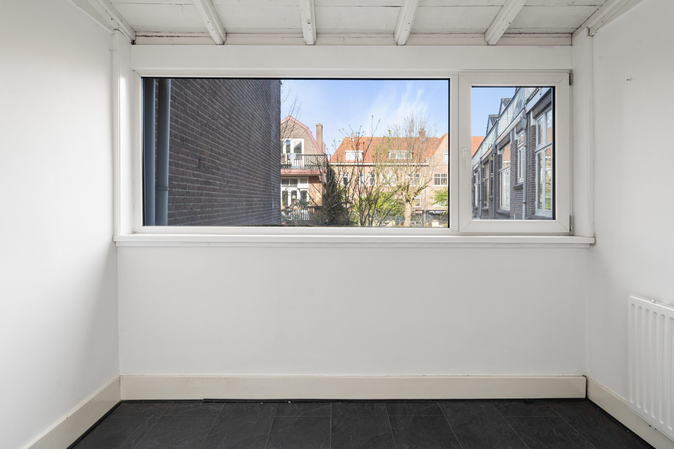 Overloop met toegang tot de 3e slaapkamer. De ruimte kenmerkt zich door het schuine dak, wat zorgt voor een knusse sfeer. Daarnaast is er een nette schouw aanwezig, die de kamer extra karakter geeft. Verder is er een radiator aanwezig en bieden de ingebouwde kastruimtes praktische opbergruimte.