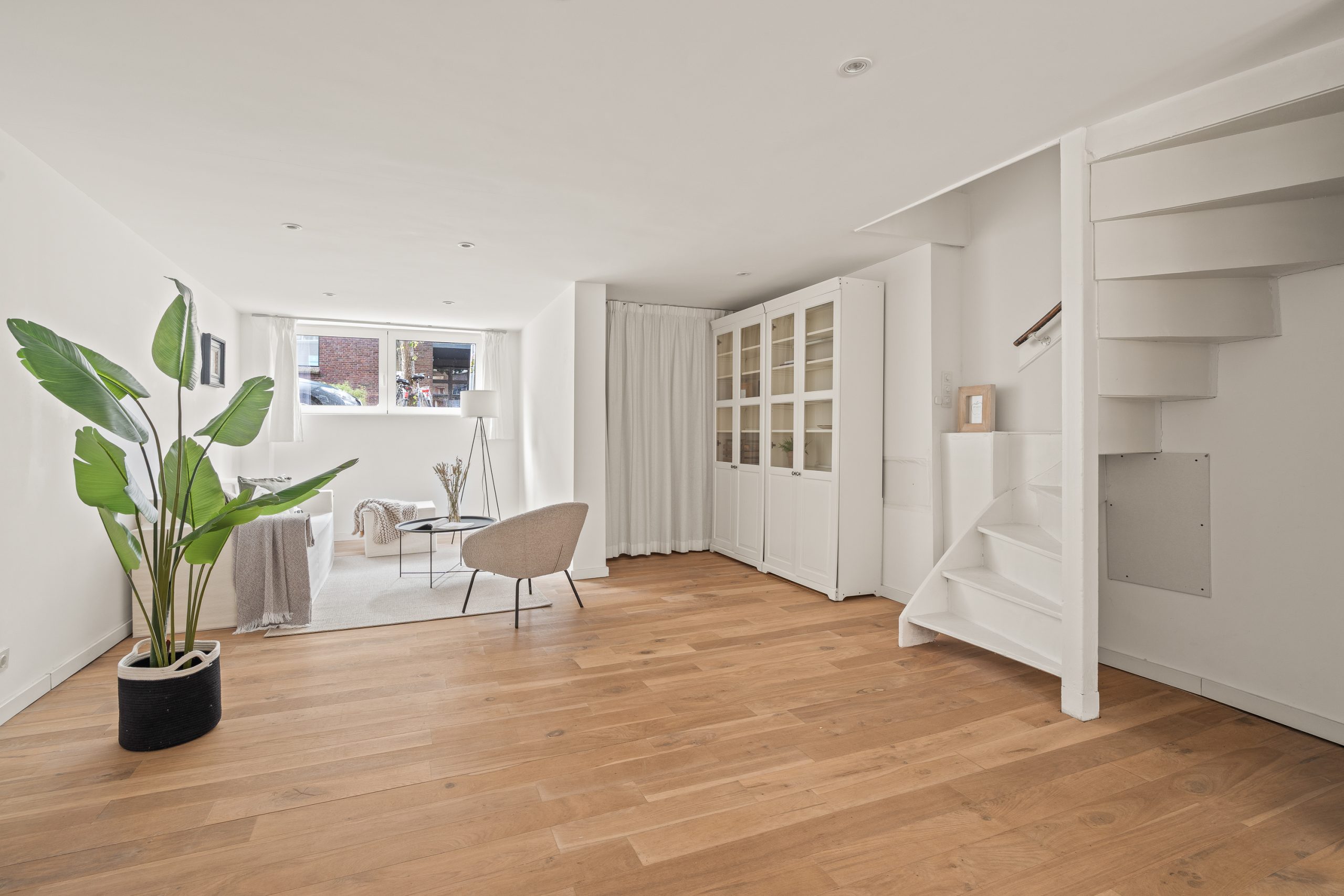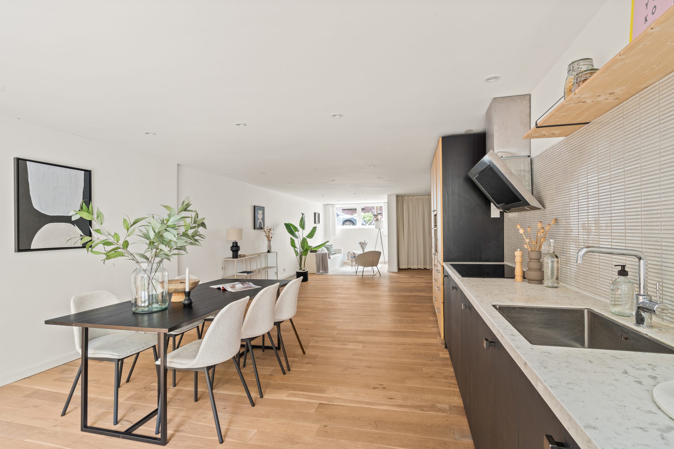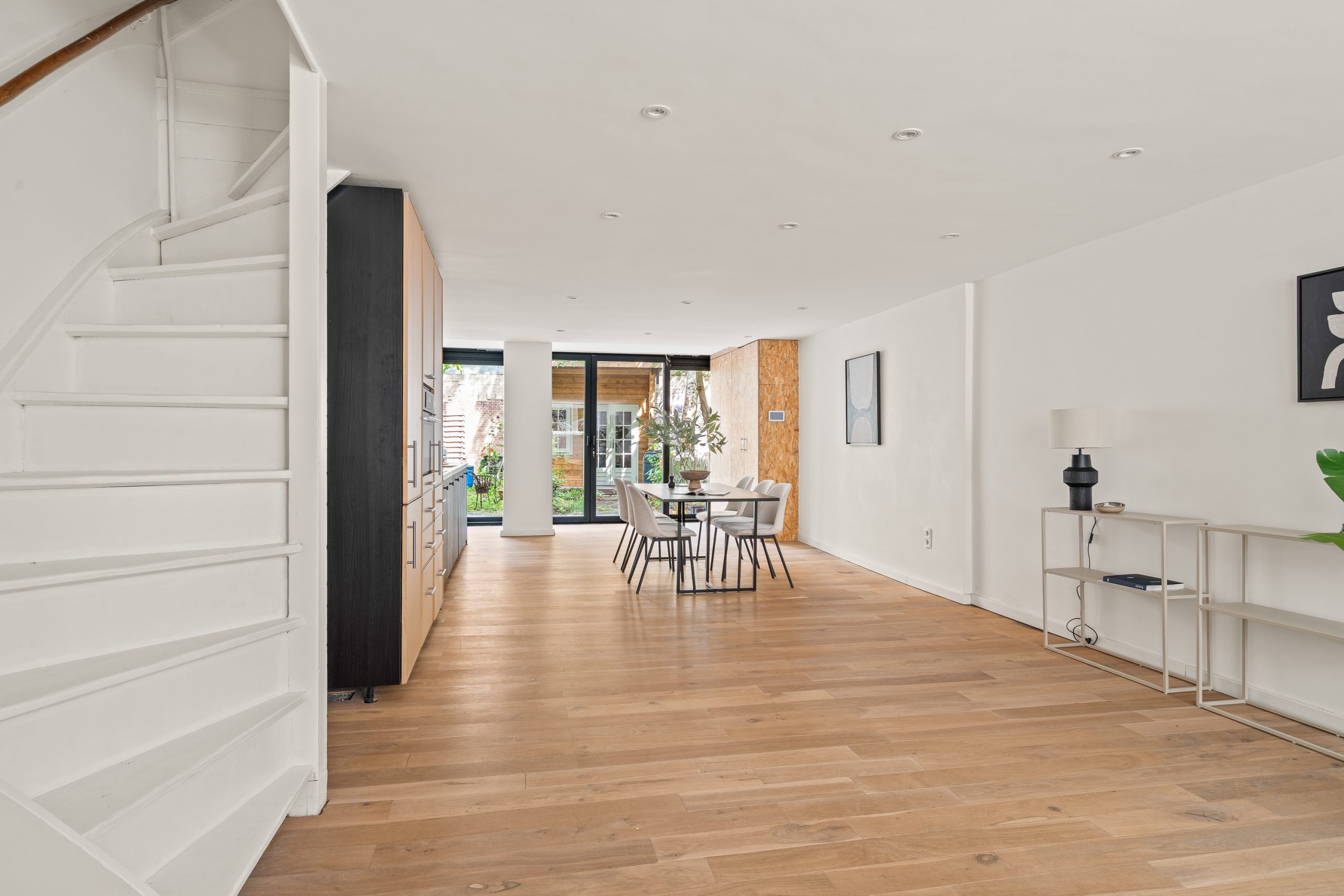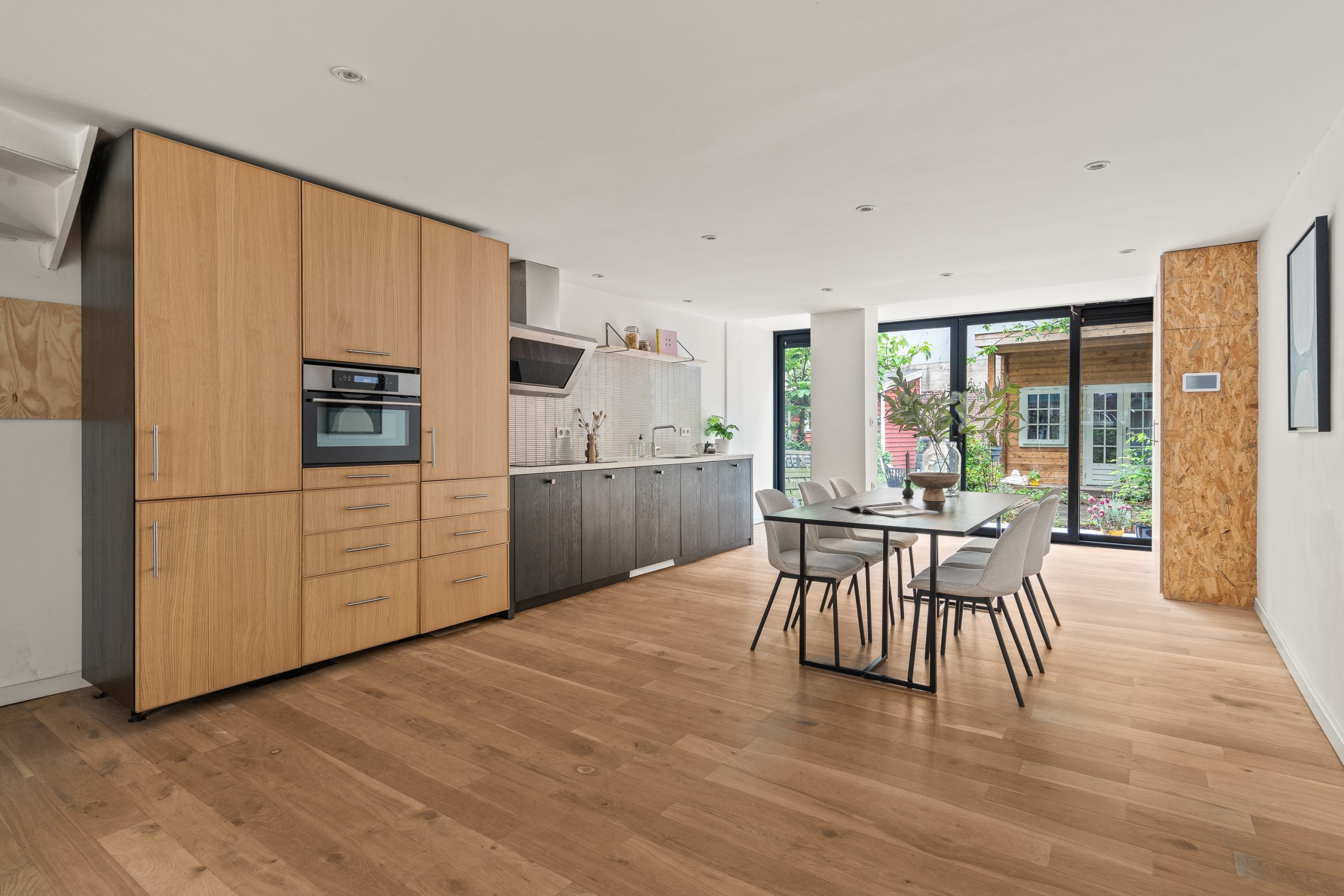 Vanuit de hal op de begane grond, bereik je middels een vaste trap de benedenverdieping welke als het woongedeelte is ingericht. De gehele kamer beschikt tevens over vloerverwarming. Met een lengte van ruim 13 meter lang biedt de woonkamer ontzettend veel mogelijkheden! De open keuken is in het midden van de woonkamer gesitueerd waardoor je tijdens het koken altijd contact kunt houden met je gezelschap. De keuken beschikt over een elektrische kookplaat, afzuiging, oven, vaatwasser en koel-/vriescombinatie. Er is voldoende kastruimte om al het keukengerei in op te bergen. De prachtige schuifpui biedt toegang tot de tuin, gelegen op het noordwesten. De tuin heeft een oppervlakte van ca. 60 m2, waardoor deze tal van mogelijkheden biedt om in te richten en te genieten van de zon! Achterin de tuin is er een vrijstaande houten blokhut met hoogslaper, welke multifunctioneel ingericht kan worden! Denk hierbij aan een home-office, atelier of hobbyruimte.