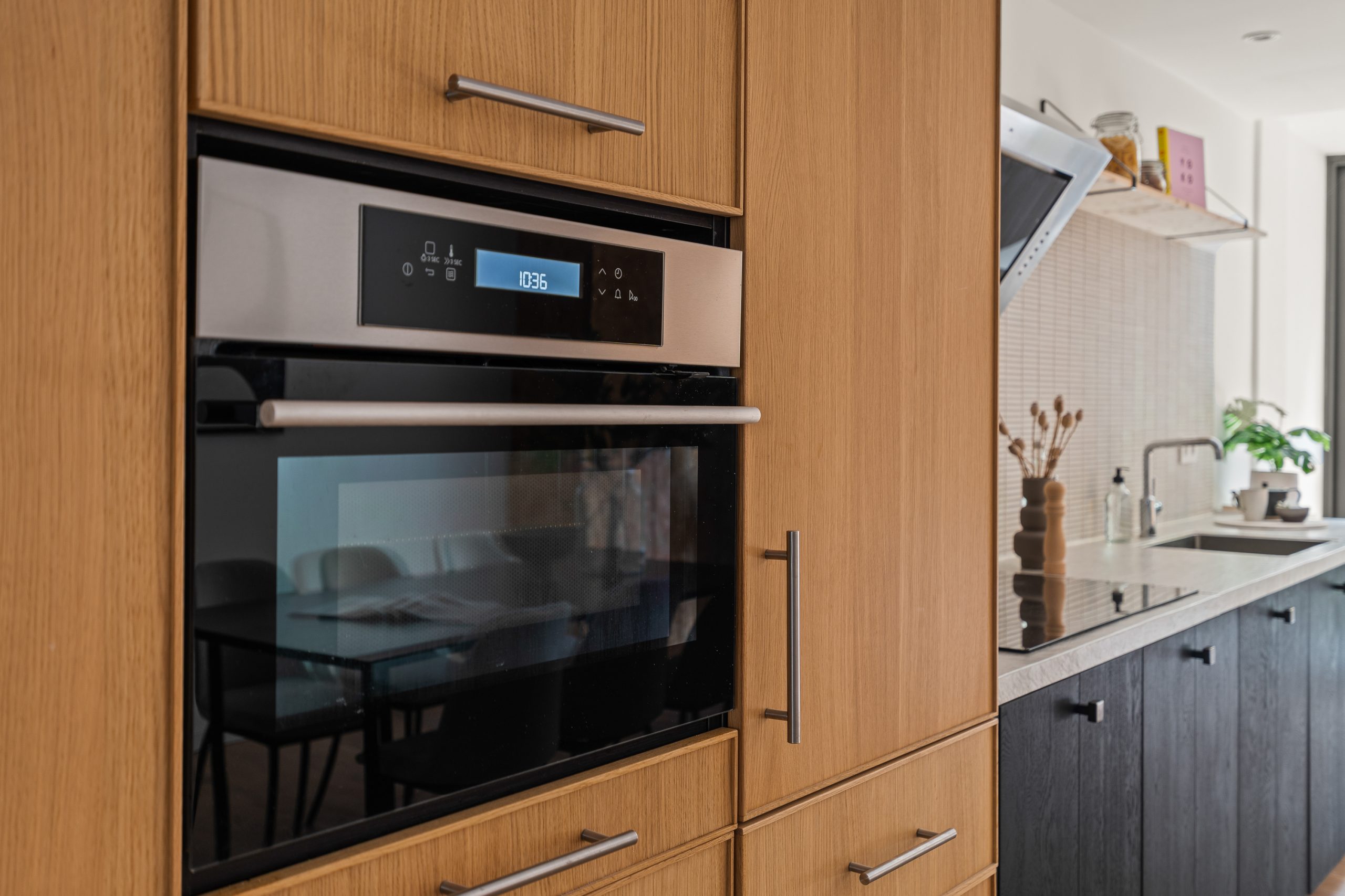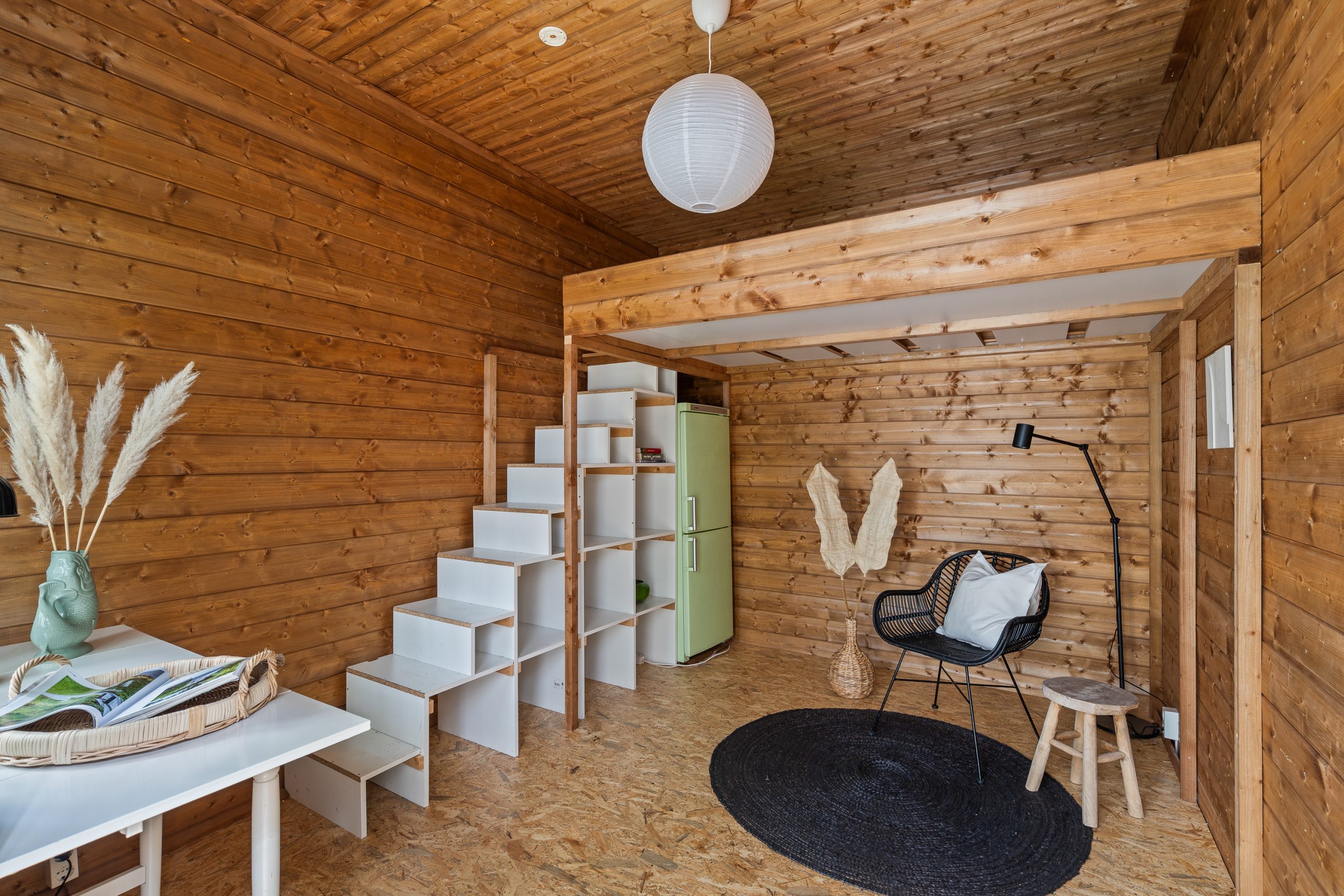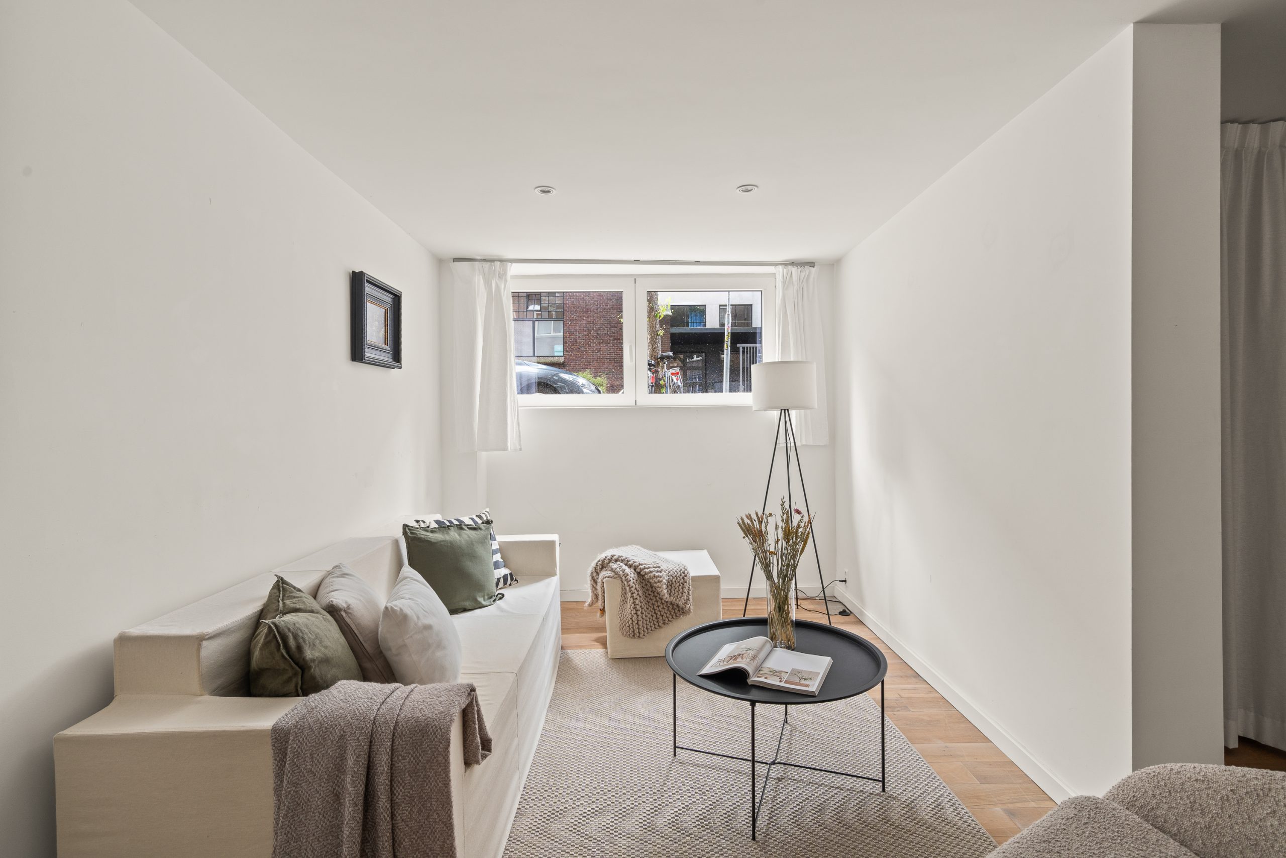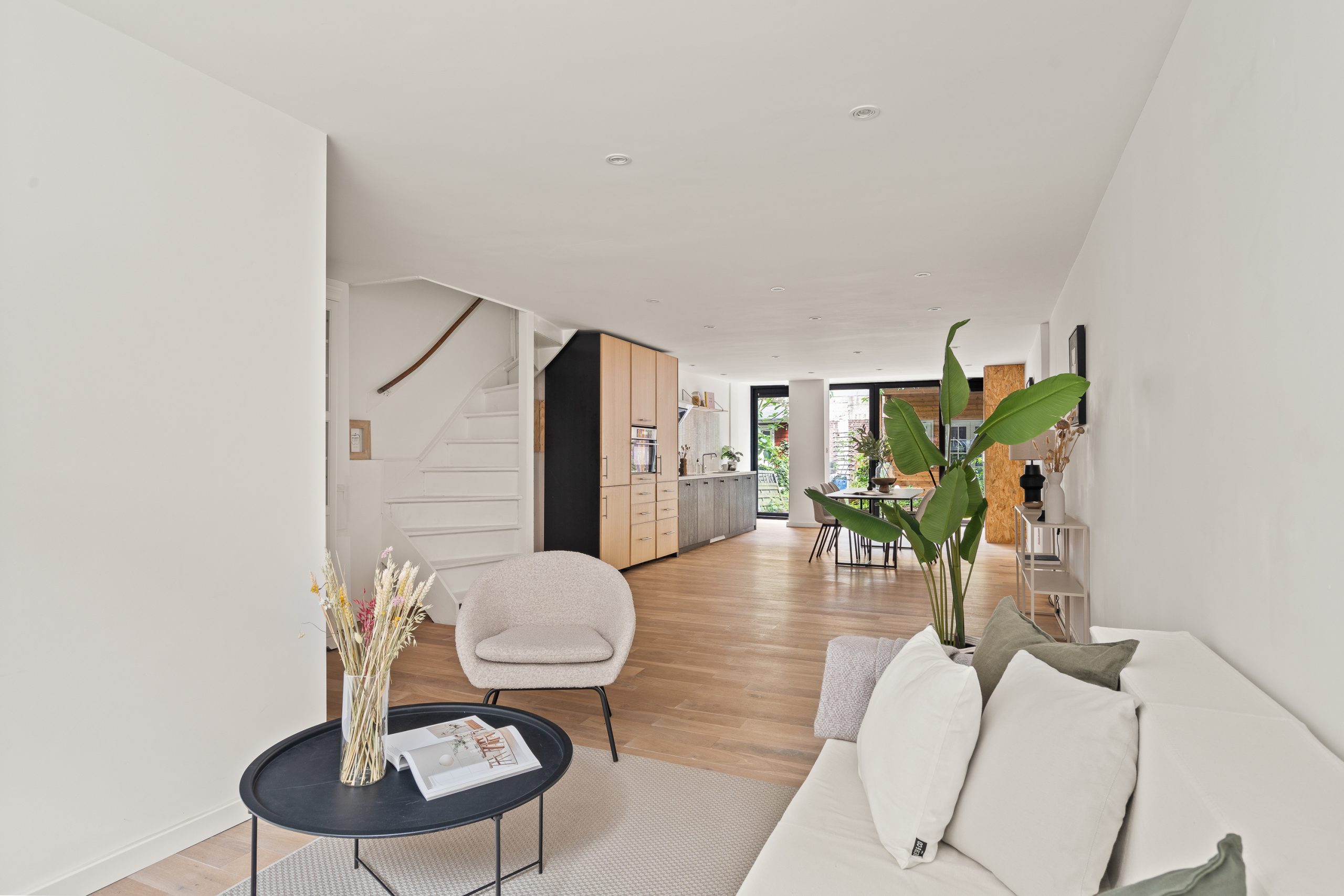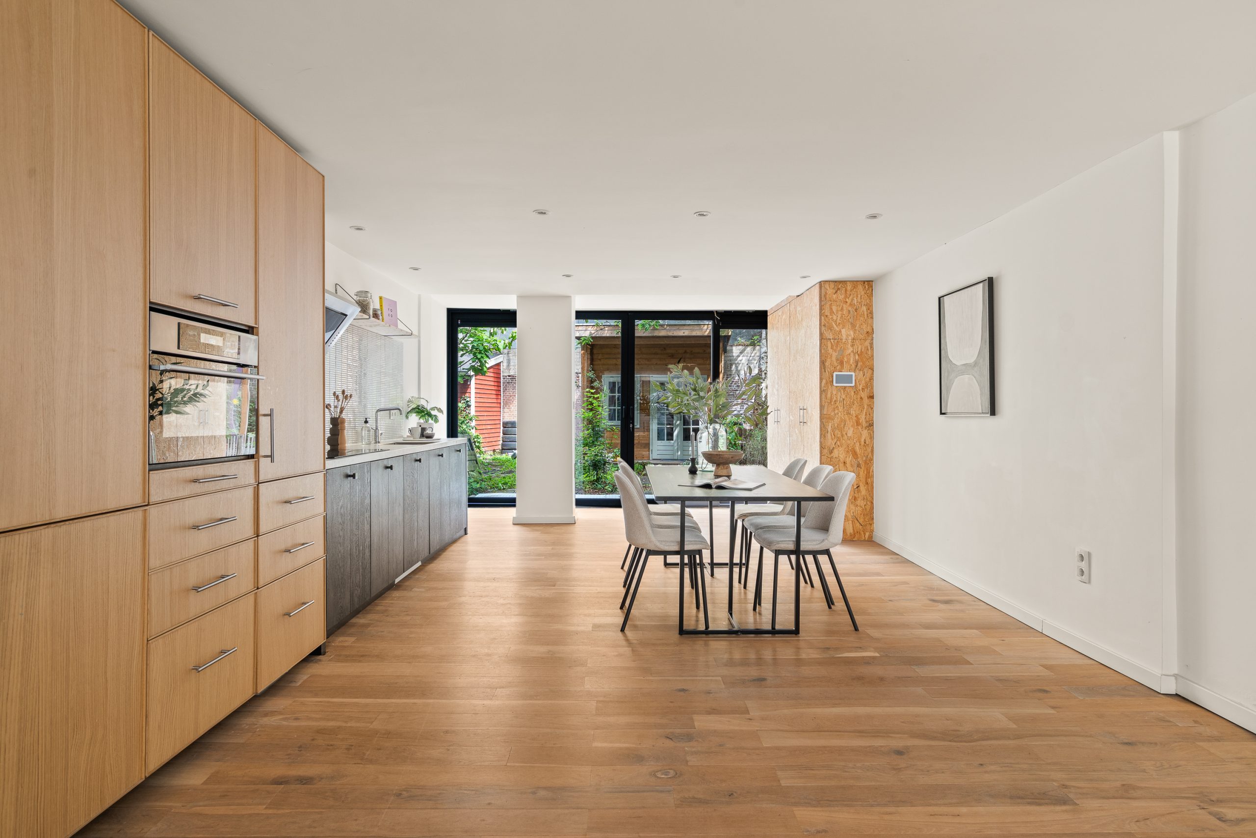 Vanuit de hal op de begane grond, bereik je middels een vaste trap de benedenverdieping welke als het woongedeelte is ingericht. De gehele kamer beschikt tevens over vloerverwarming. Met een lengte van ruim 13 meter lang biedt de woonkamer ontzettend veel mogelijkheden! De open keuken is in het midden van de woonkamer gesitueerd waardoor je tijdens het koken altijd contact kunt houden met je gezelschap. De keuken beschikt over een elektrische kookplaat, afzuiging, oven, vaatwasser en koel-/vriescombinatie. Er is voldoende kastruimte om al het keukengerei in op te bergen. De prachtige schuifpui biedt toegang tot de tuin, gelegen op het noordwesten. De tuin heeft een oppervlakte van ca. 60 m2, waardoor deze tal van mogelijkheden biedt om in te richten en te genieten van de zon! Achterin de tuin is er een vrijstaande houten blokhut met hoogslaper, welke multifunctioneel ingericht kan worden! Denk hierbij aan een home-office, atelier of hobbyruimte.