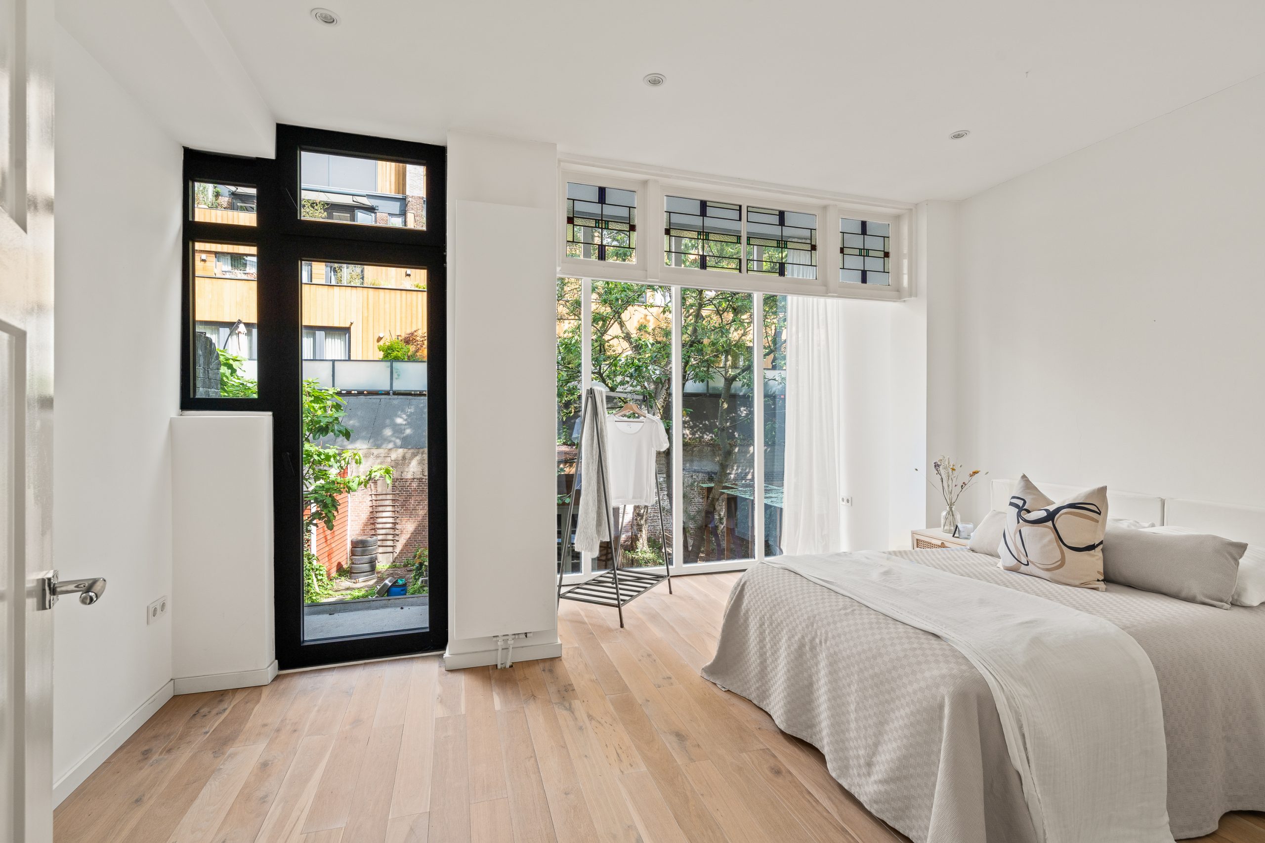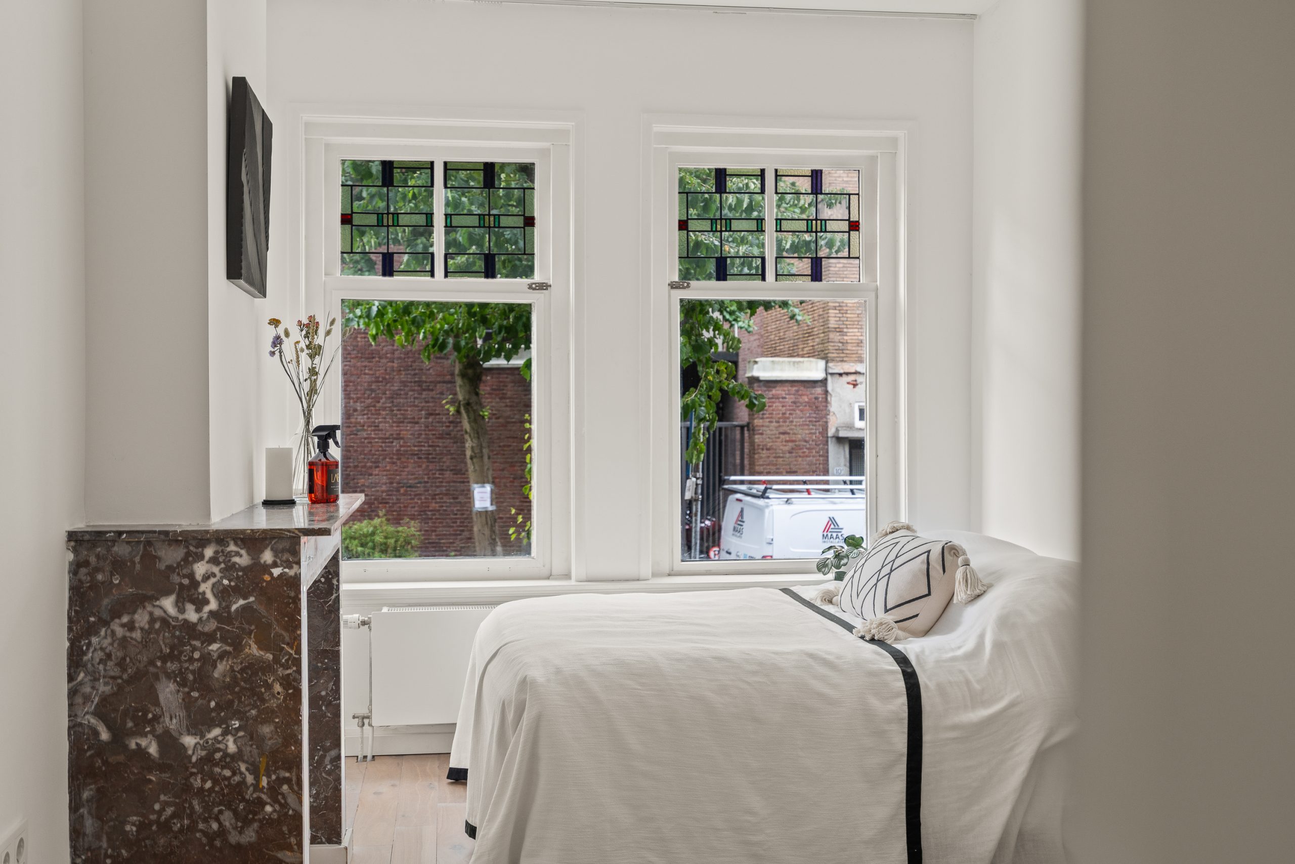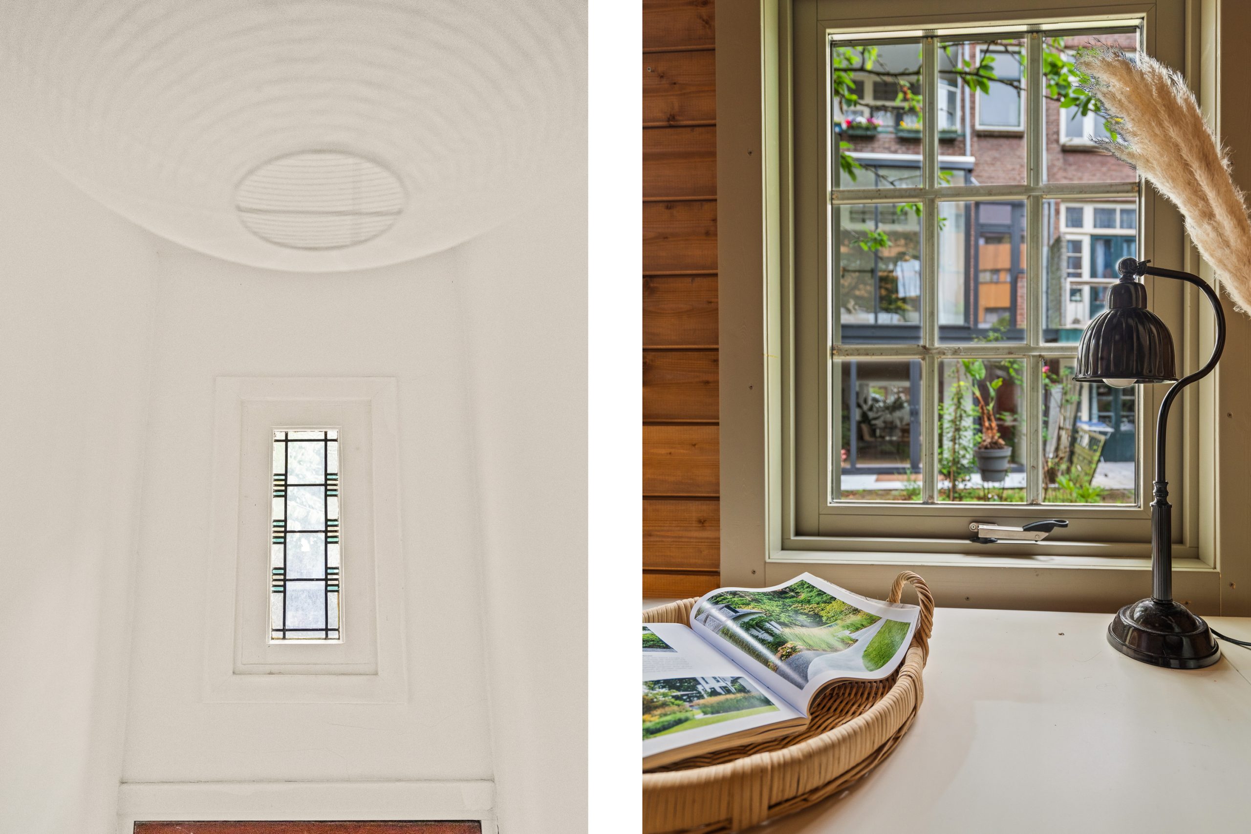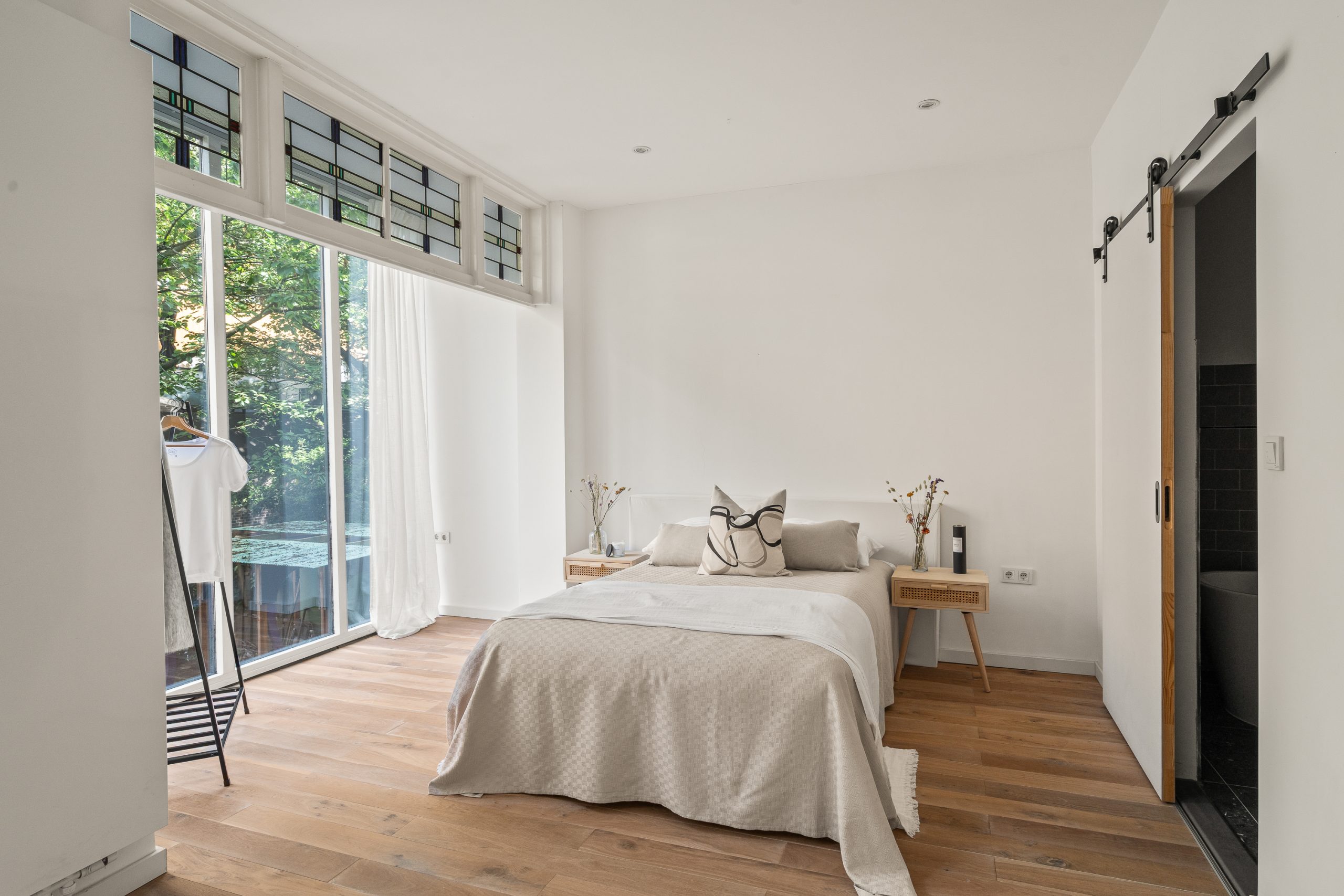 Kleine trap met tochtportaal, toilet, (meter)kast en toegang tot alle vertrekken op deze verdieping. De master bedroom is gelegen aan de achterzijde en is zeer ruim te noemen. De moderne hoge raampartijen in combinatie met de glas-in-lood ramen bieden deze ruimte de perfecte combinatie tussen authentiek en modern. Door de openslaande deur en het uitzicht op de tuin wordt er een mooie verbinding tussen het binnen- en buitenleven gecreƫerd. Vanuit zowel deze slaapkamer als de hal bereik je de badkamer. De badkamer (met vloerverwarming) beschikt over een ligbad en een wastafel met meubel. De 2e slaapkamer aan de voorzijde is tevens zeer ruim van formaat en is voorzien van een extra kleine keuken en badkamer. Hierdoor kan het ook goed gebruikt worden als aparte studio.