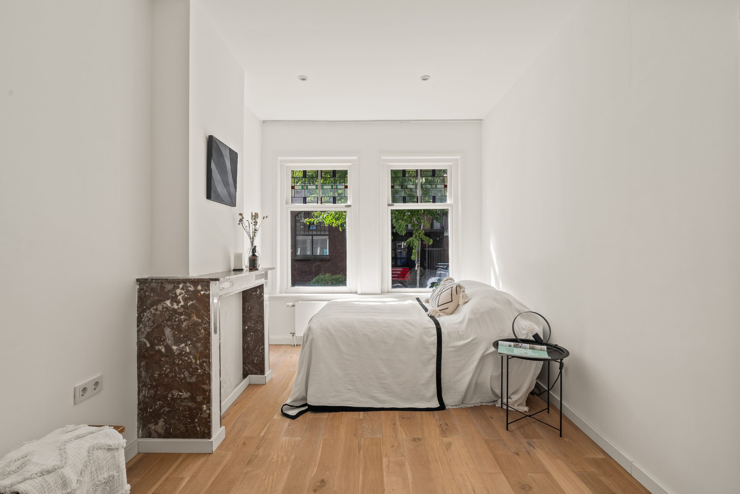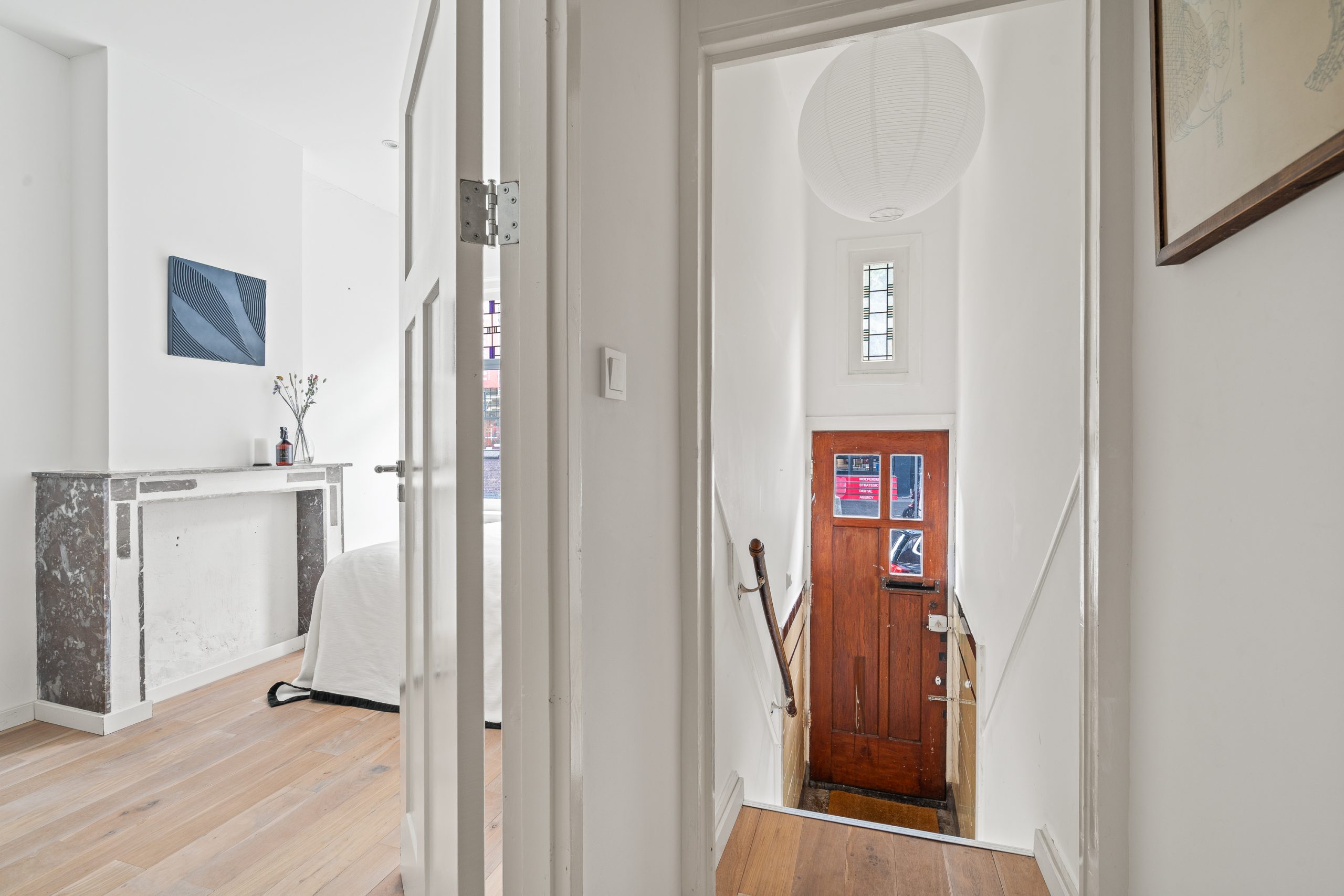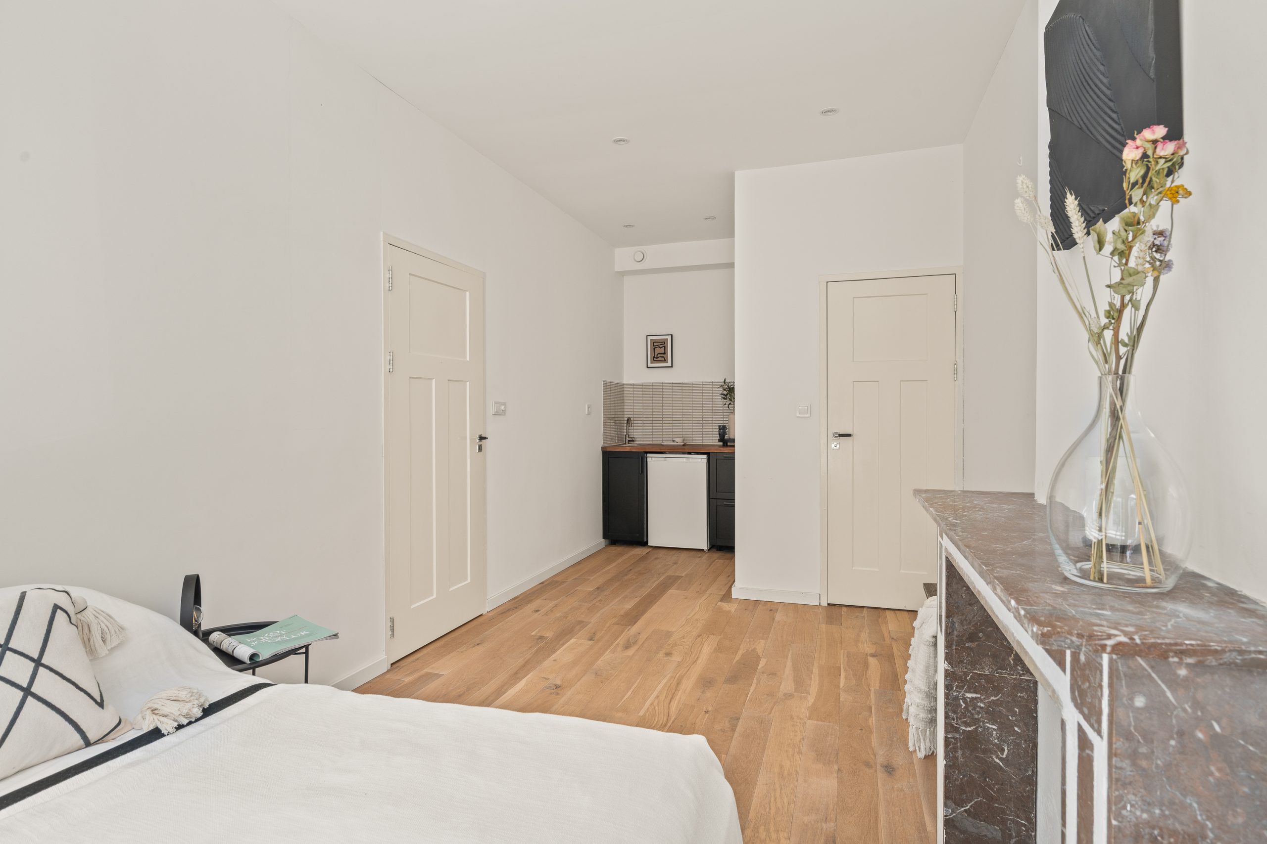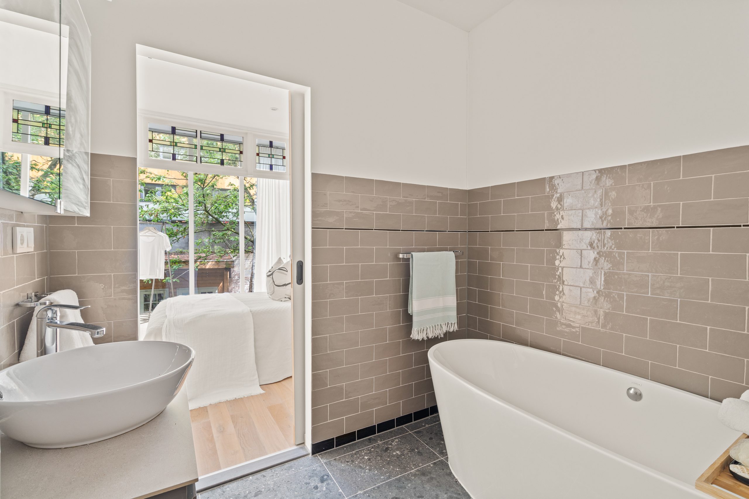 Kleine trap met tochtportaal, toilet, (meter)kast en toegang tot alle vertrekken op deze verdieping. De master bedroom is gelegen aan de achterzijde en is zeer ruim te noemen. De moderne hoge raampartijen in combinatie met de glas-in-lood ramen bieden deze ruimte de perfecte combinatie tussen authentiek en modern. Door de openslaande deur en het uitzicht op de tuin wordt er een mooie verbinding tussen het binnen- en buitenleven gecreƫerd. Vanuit zowel deze slaapkamer als de hal bereik je de badkamer. De badkamer (met vloerverwarming) beschikt over een ligbad en een wastafel met meubel. De 2e slaapkamer aan de voorzijde is tevens zeer ruim van formaat en is voorzien van een extra kleine keuken en badkamer. Hierdoor kan het ook goed gebruikt worden als aparte studio.