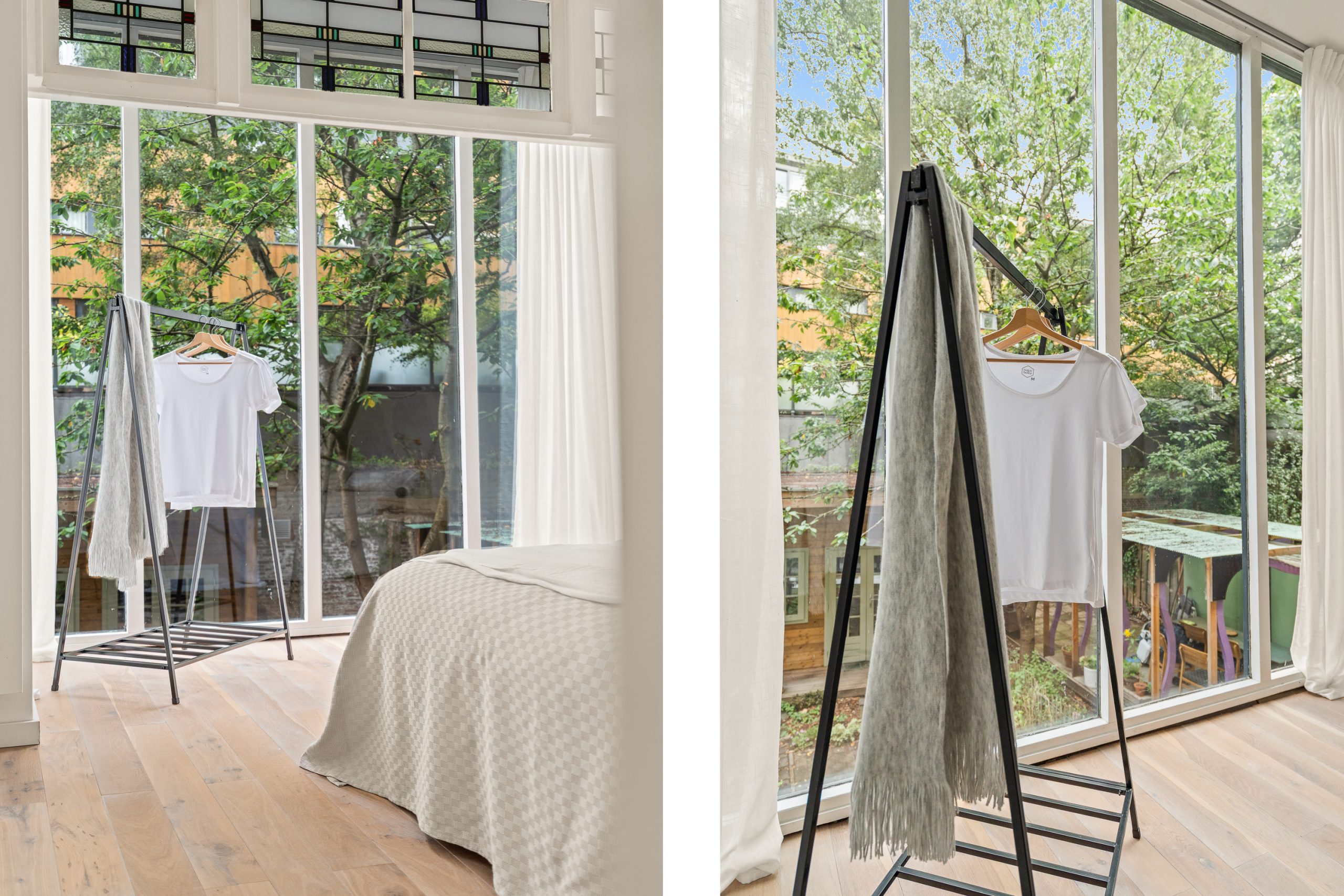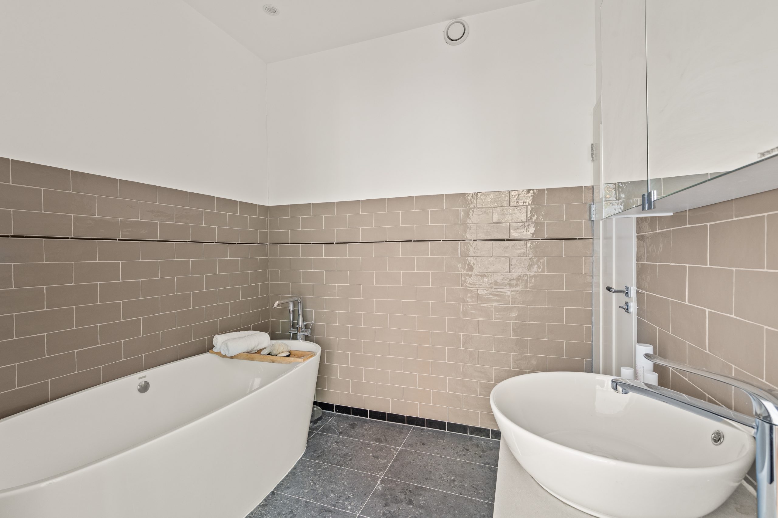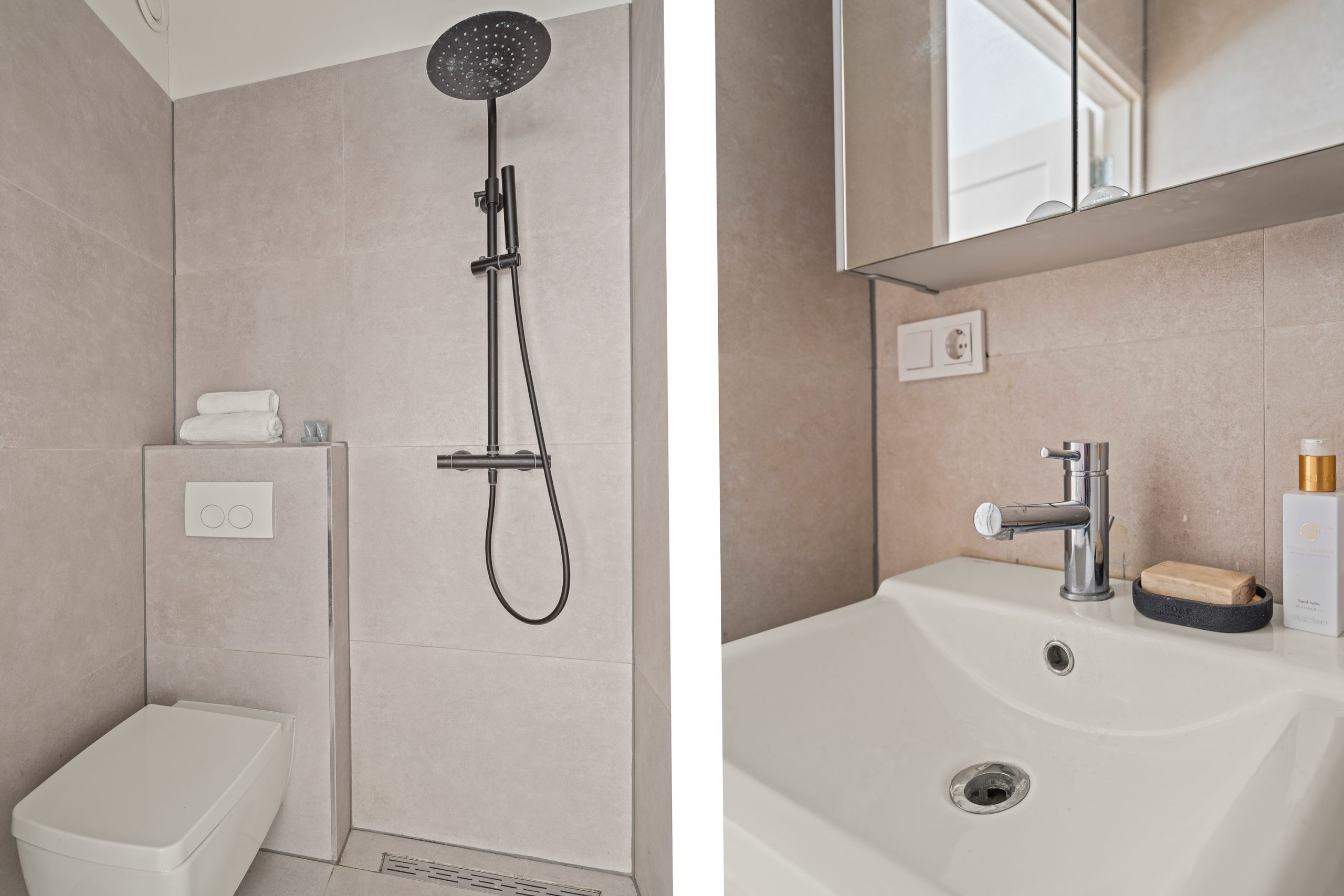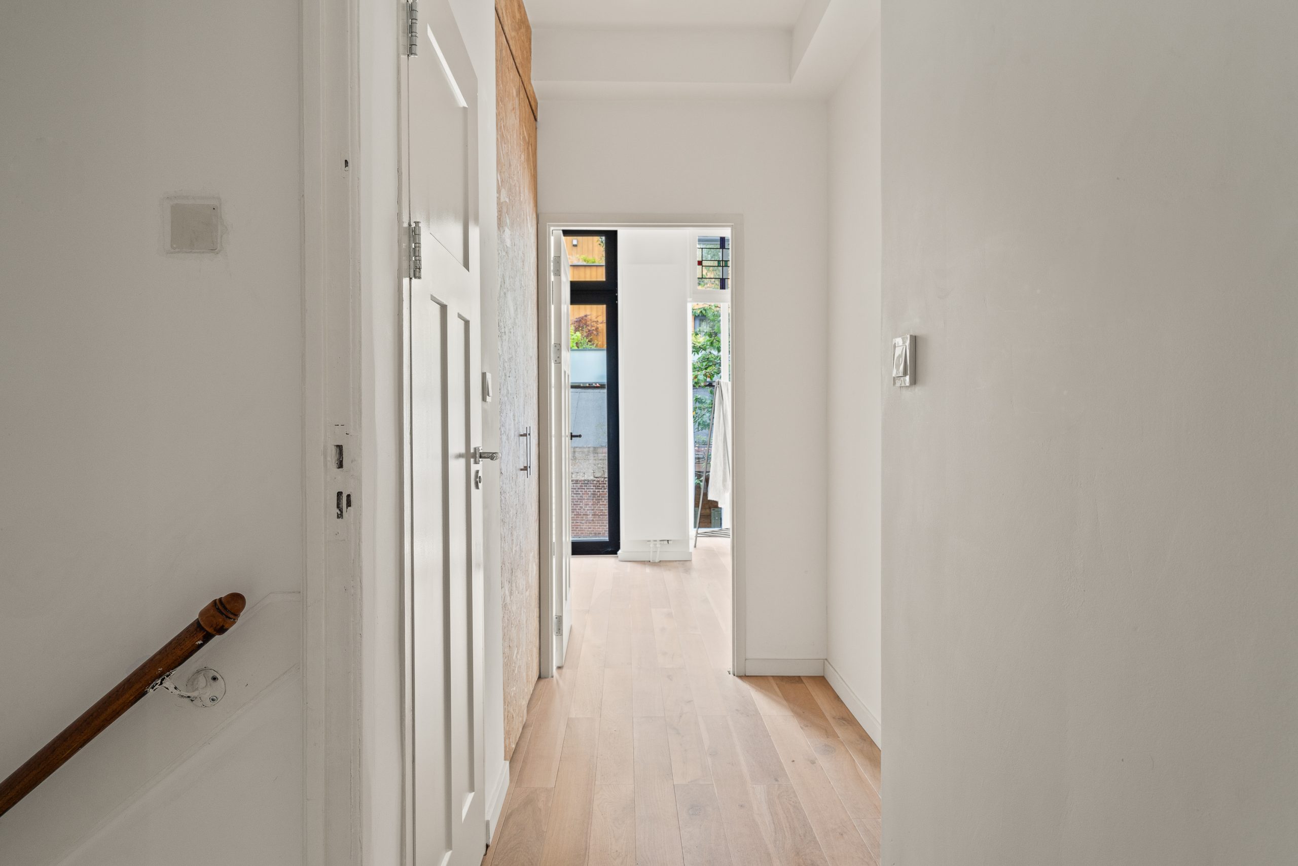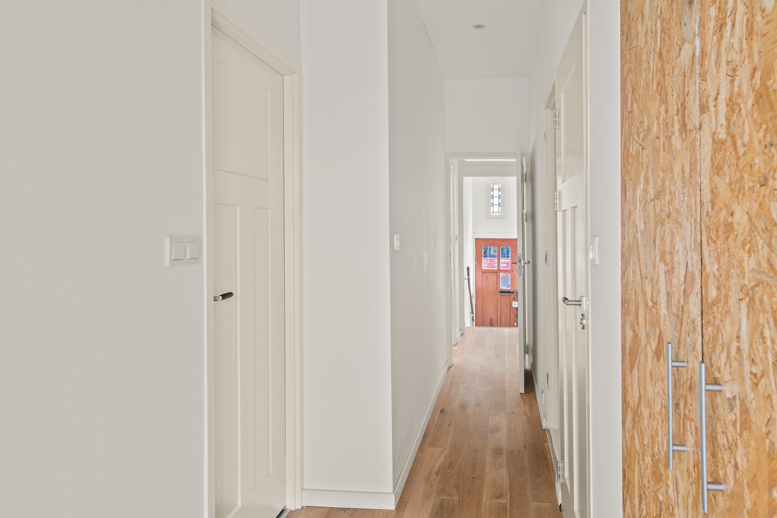 Kleine trap met tochtportaal, toilet, (meter)kast en toegang tot alle vertrekken op deze verdieping. De master bedroom is gelegen aan de achterzijde en is zeer ruim te noemen. De moderne hoge raampartijen in combinatie met de glas-in-lood ramen bieden deze ruimte de perfecte combinatie tussen authentiek en modern. Door de openslaande deur en het uitzicht op de tuin wordt er een mooie verbinding tussen het binnen- en buitenleven gecreƫerd. Vanuit zowel deze slaapkamer als de hal bereik je de badkamer. De badkamer (met vloerverwarming) beschikt over een ligbad en een wastafel met meubel. De 2e slaapkamer aan de voorzijde is tevens zeer ruim van formaat en is voorzien van een extra kleine keuken en badkamer. Hierdoor kan het ook goed gebruikt worden als aparte studio.