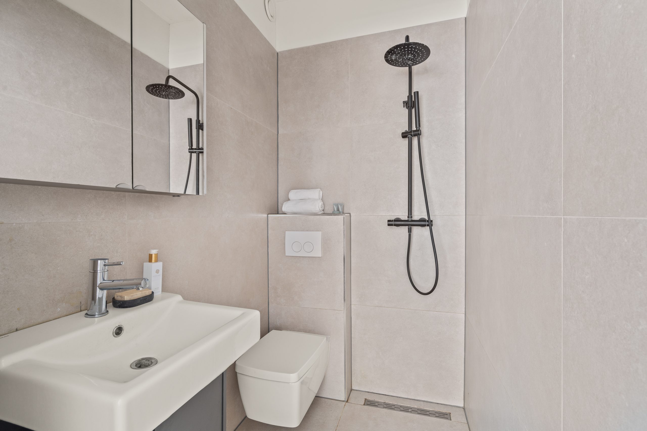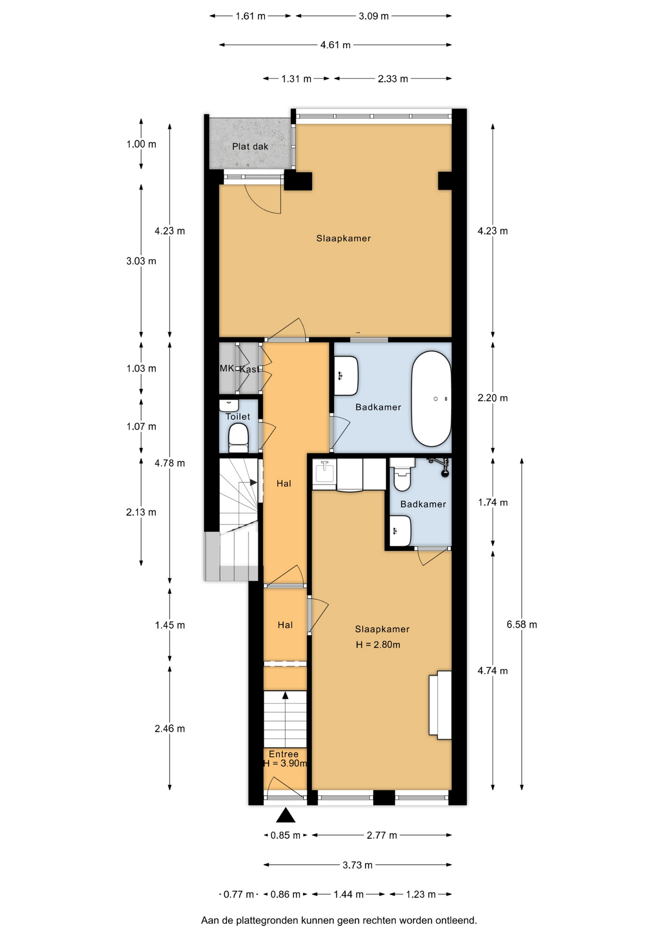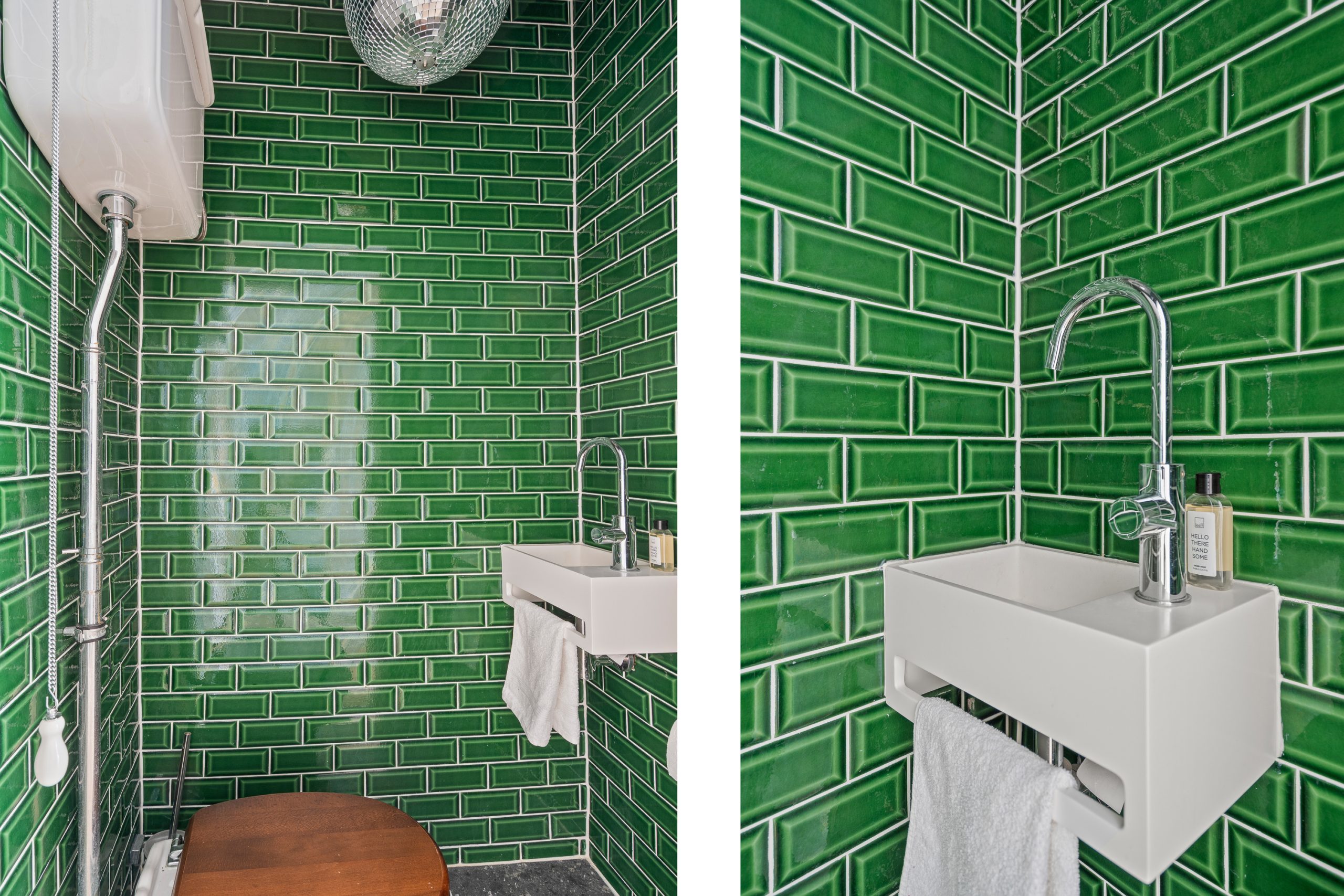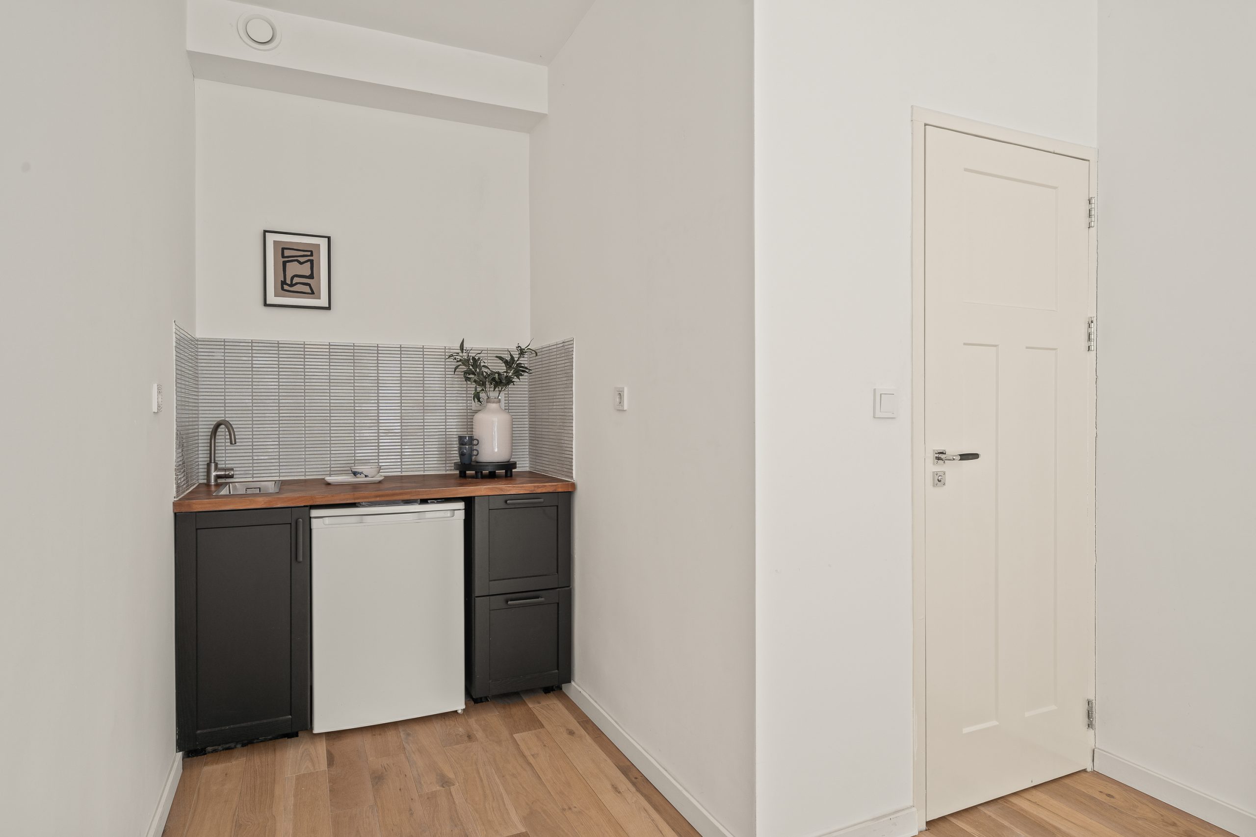 Kleine trap met tochtportaal, toilet, (meter)kast en toegang tot alle vertrekken op deze verdieping. De master bedroom is gelegen aan de achterzijde en is zeer ruim te noemen. De moderne hoge raampartijen in combinatie met de glas-in-lood ramen bieden deze ruimte de perfecte combinatie tussen authentiek en modern. Door de openslaande deur en het uitzicht op de tuin wordt er een mooie verbinding tussen het binnen- en buitenleven gecreƫerd. Vanuit zowel deze slaapkamer als de hal bereik je de badkamer. De badkamer (met vloerverwarming) beschikt over een ligbad en een wastafel met meubel. De 2e slaapkamer aan de voorzijde is tevens zeer ruim van formaat en is voorzien van een extra kleine keuken en badkamer. Hierdoor kan het ook goed gebruikt worden als aparte studio.