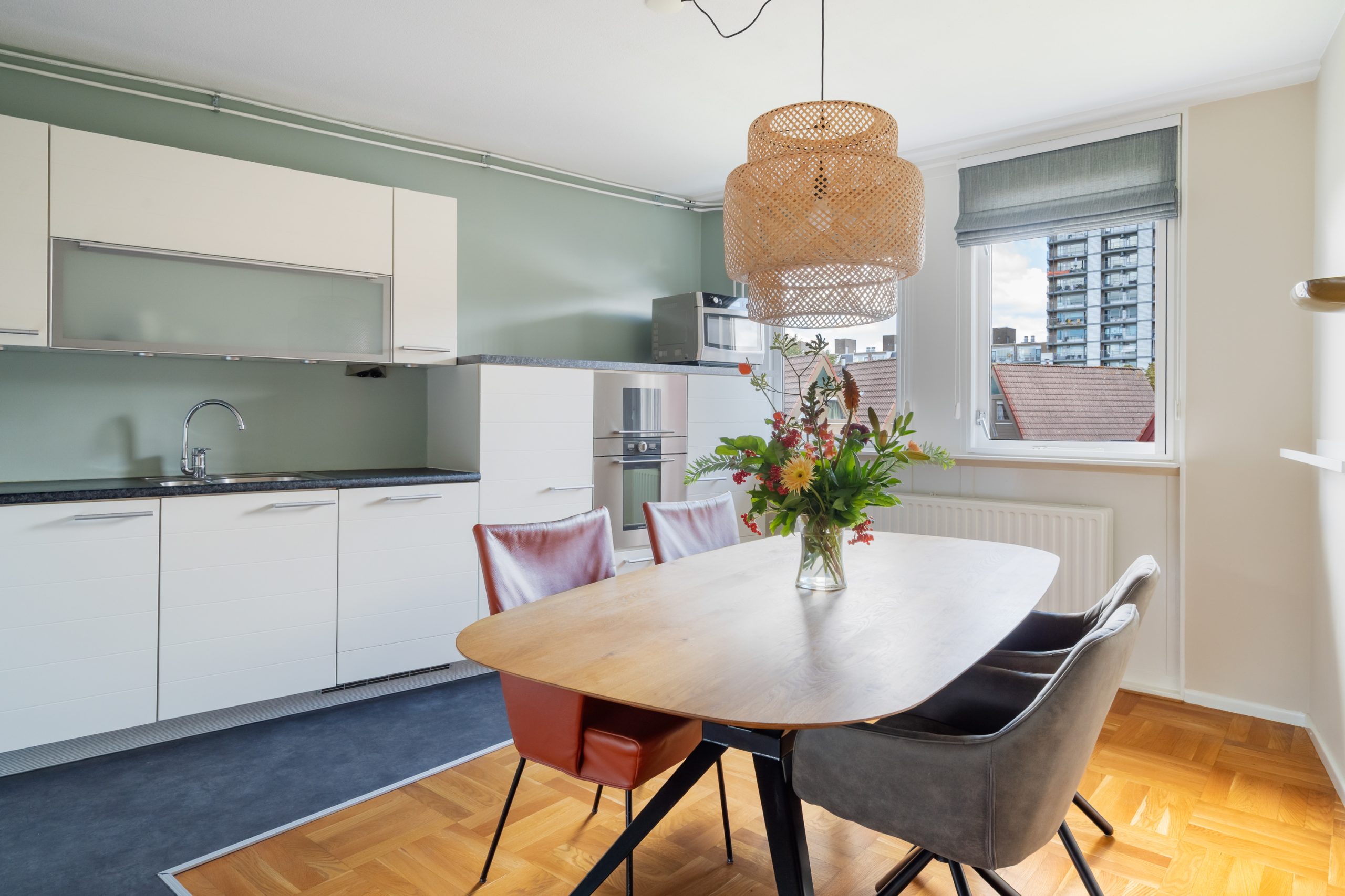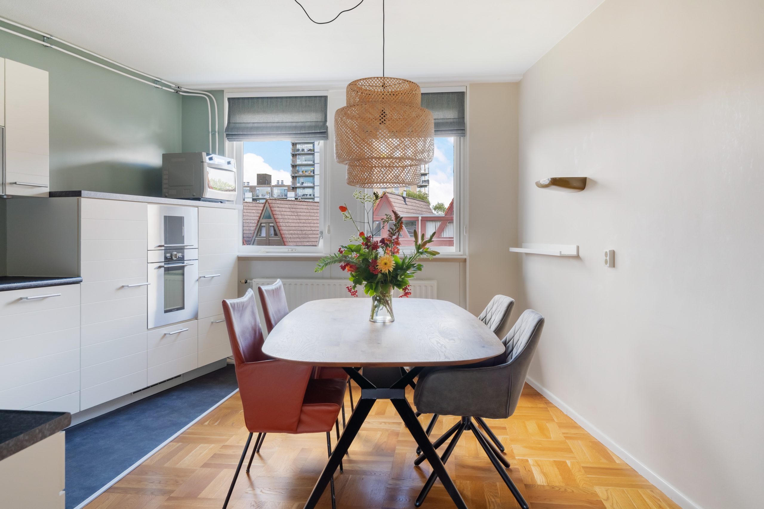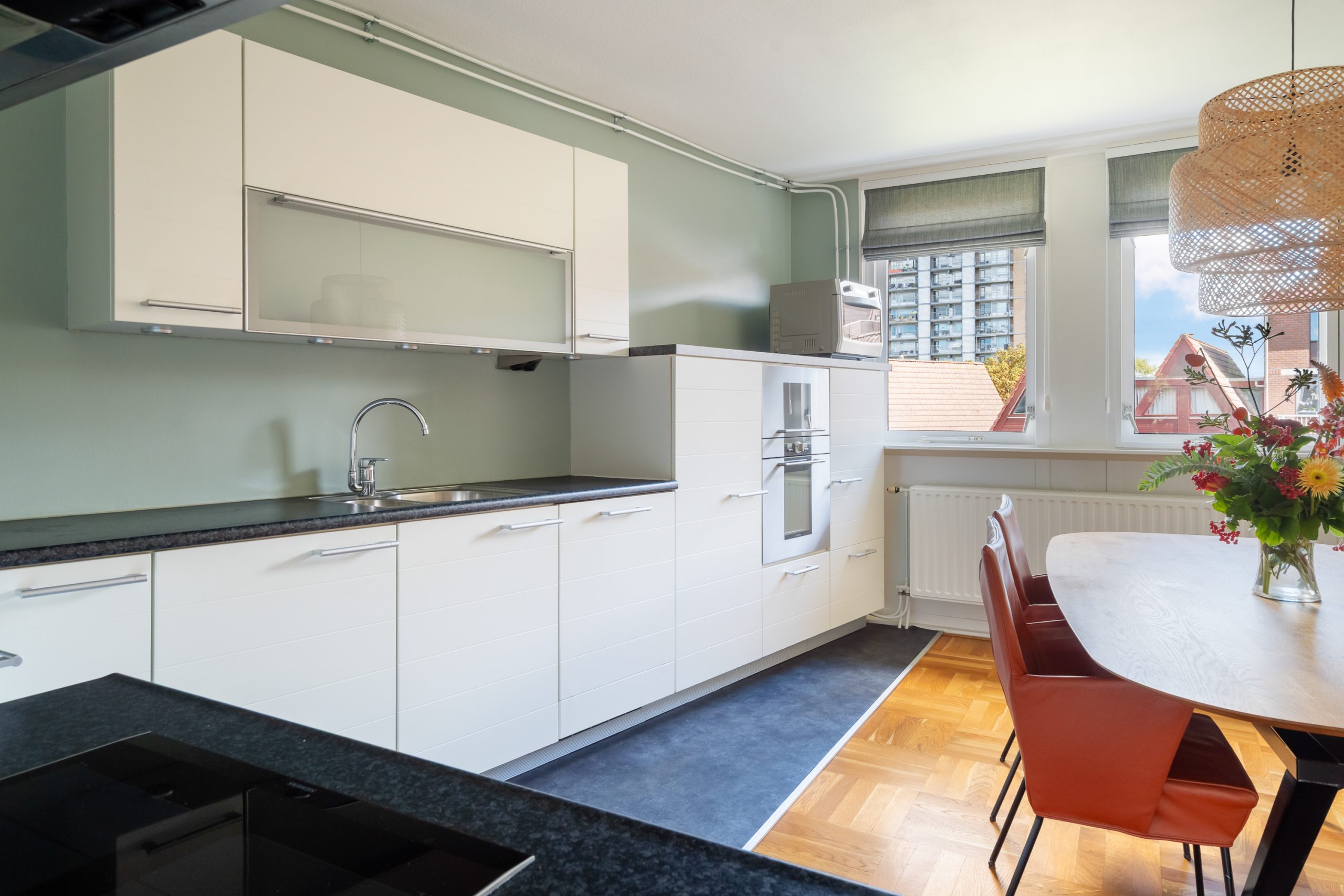 De woonkamer is een fijne ruimte met raampartijen aan beide zijden, waardoor er veel licht de woning binnenvalt. Het eetgedeelte staat in directe verbinding met de prachtige open keuken. De keuken beschikt over diverse soorten inbouwapparatuur zoals een 4-pits inductiekookplaat, afzuigkap, oven en hogedruk stoomoven, vaatwasser, koel-/vriescombinatie en voldoende opbergruimte. Vanuit de woonkamer bereik je het ruime balkon, met modern zonnescherm, waar je het gehele jaar heerlijk kan zitten. Hier bevindt je je in een oase van rust, terwijl het bruisende centrum van Rotterdam op loopafstand ligt! Tevens zijn de ramen en deuren grotendeels voorzien van moderne horren.