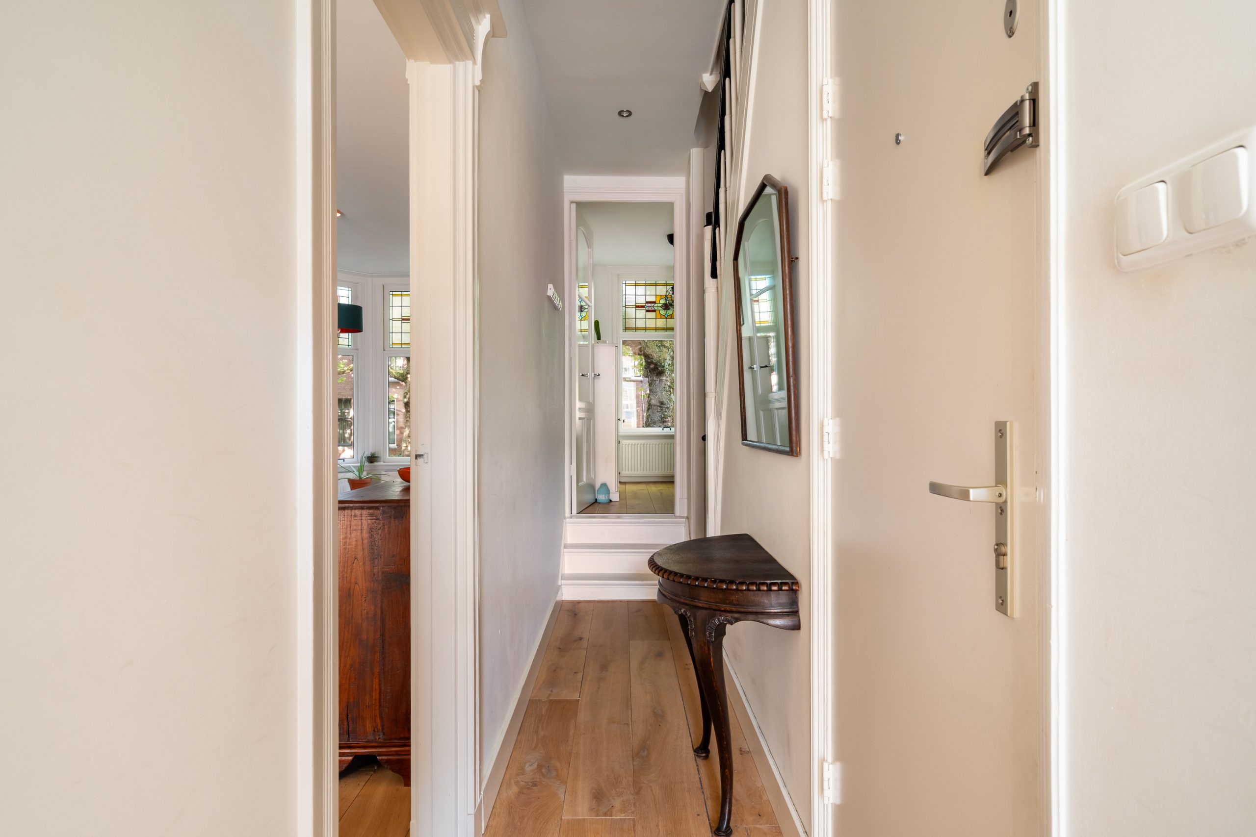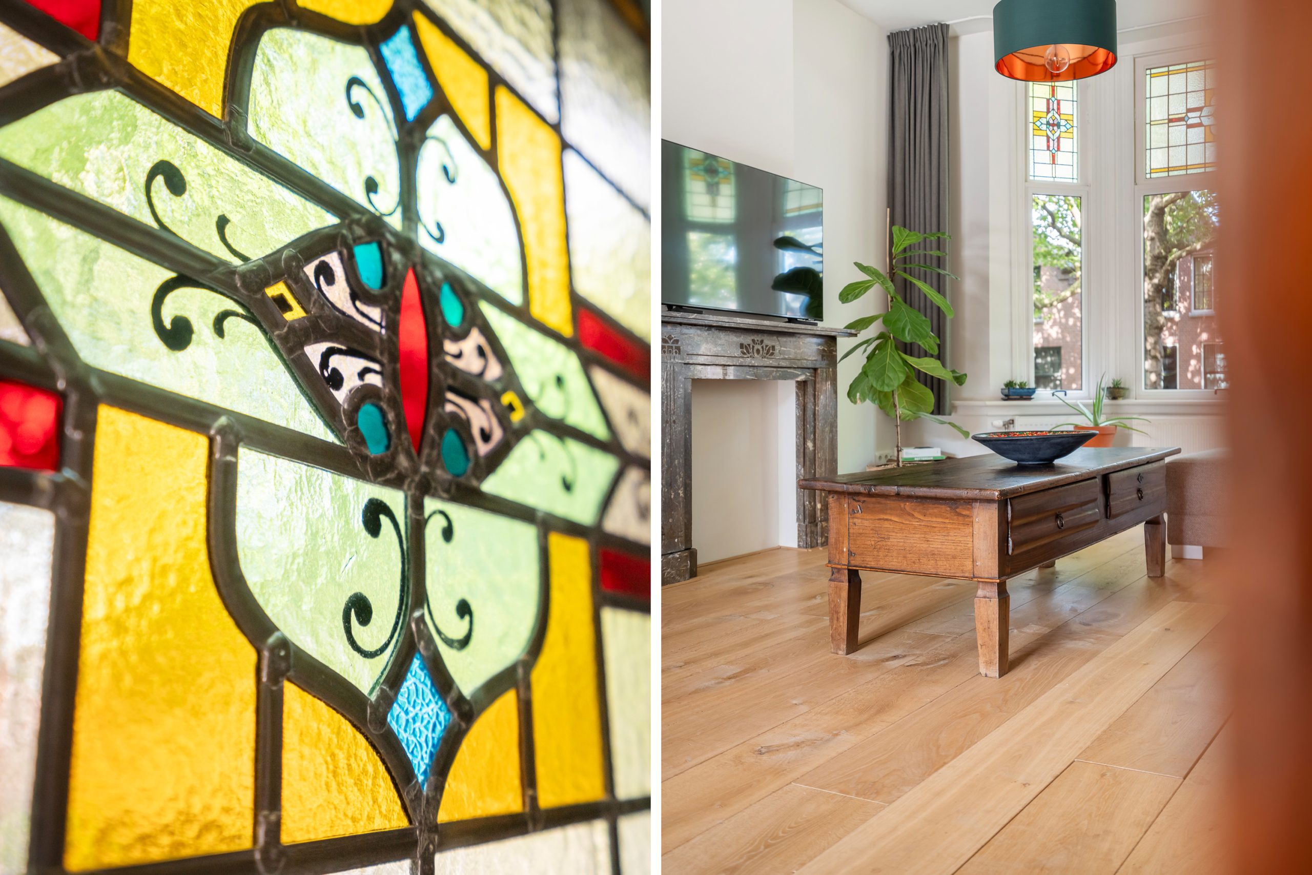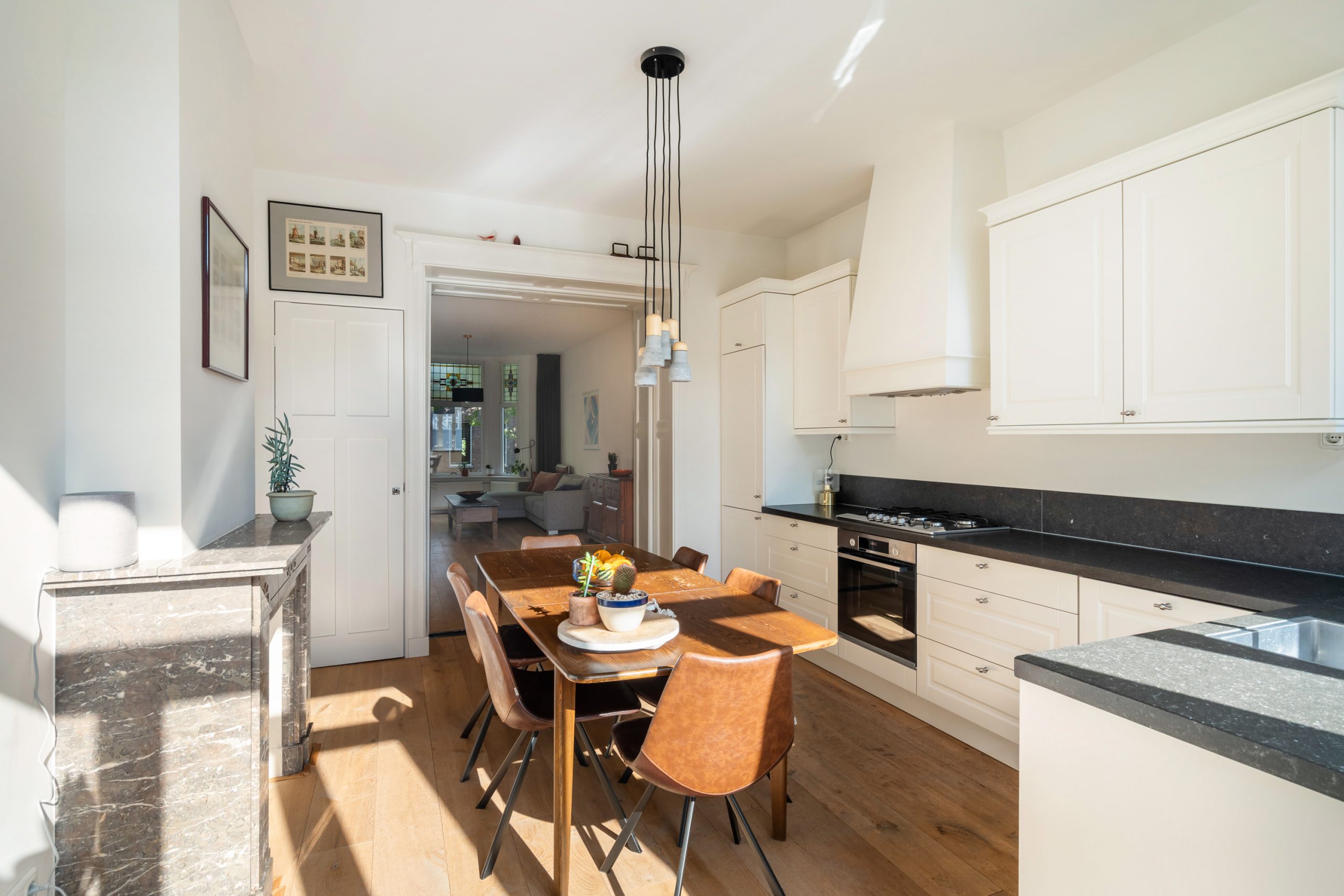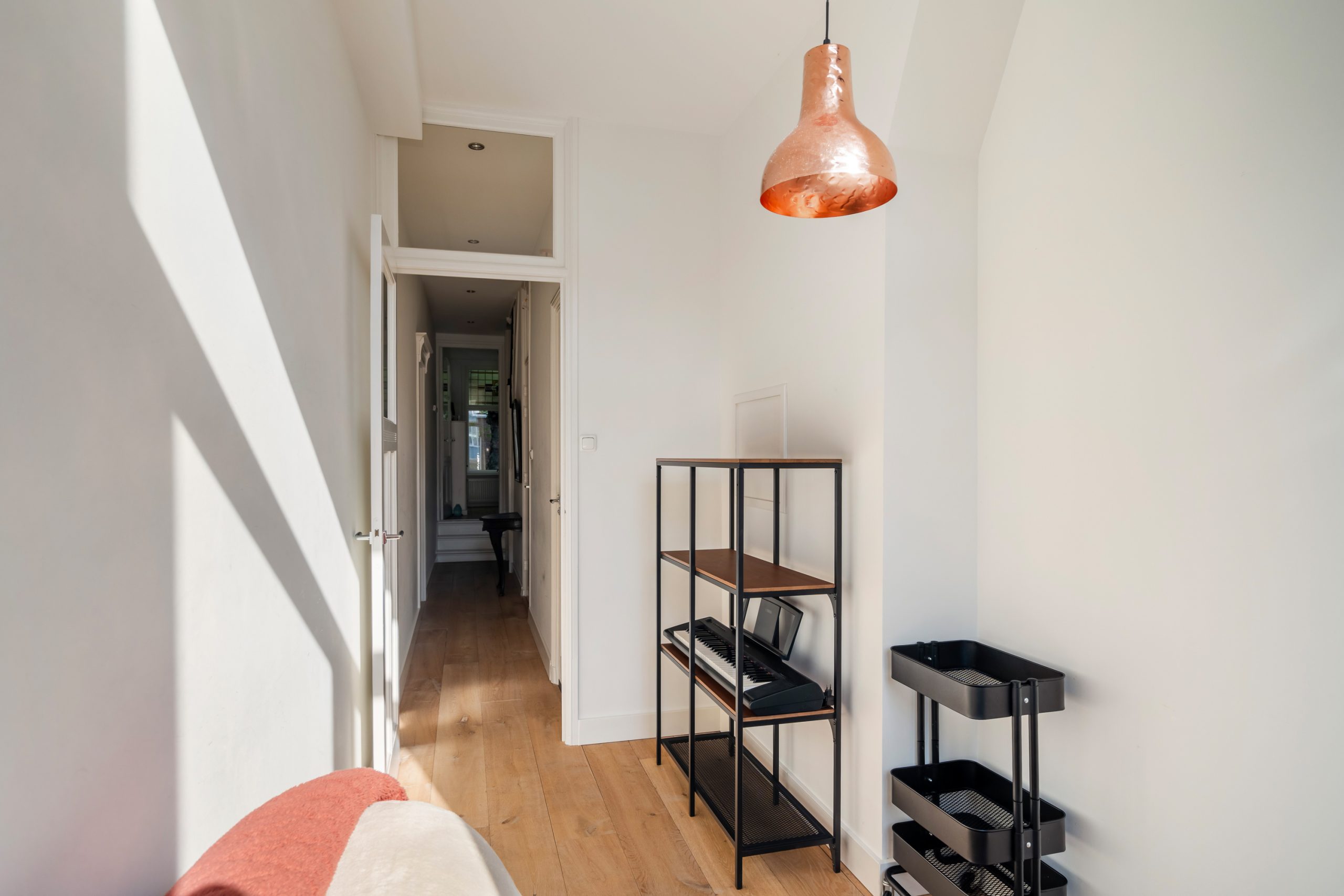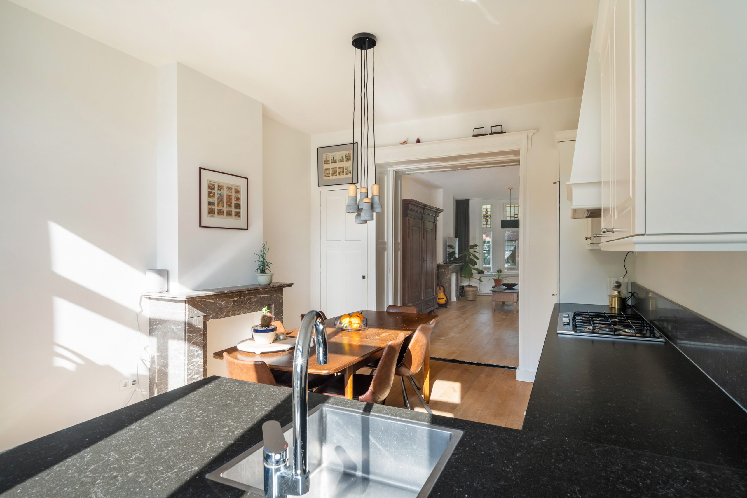 Hal met toilet en toegang tot de woonkamer. Het woongedeelte is gelegen aan de voorzijde van de woning en beschikt over een prachtige lichtinval door de grote raampartijen. Direct bij binnenkomst word je overspoeld door talloze authentieke jaren ’10 details zoals de prachtige glas-in-lood ramen, de erker, de originele schouwen en paneeldeuren. Het woongedeelte kan gescheiden worden van het eetgedeelte middels de en suite deuren (met 3 inbouwkasten). De eetkamer staat in directe verbinding met de open keuken, waardoor je tijdens het koken altijd in contact kunt blijven met je gezelschap. De open keuken beschikt over diverse soorten inbouwapparatuur, zoals een 5-pits gasfornuis, afzuigkap, oven, vaatwasser en koel-/vriescombinatie. Op deze verdieping zijn er 2 slaapkamers. De kamer aan de voorzijde beschikt over een inbouwkast, handig voor extra opbergruimte.