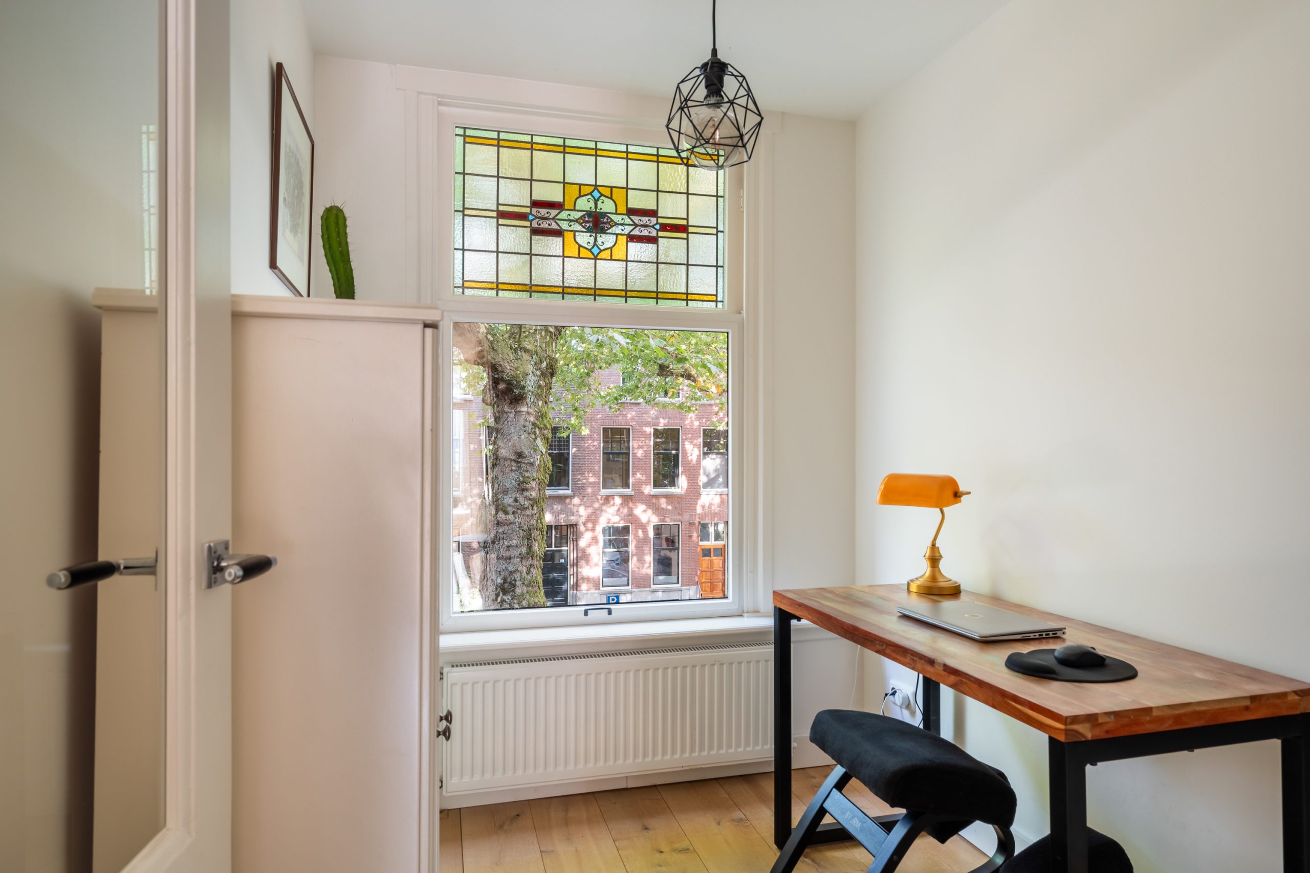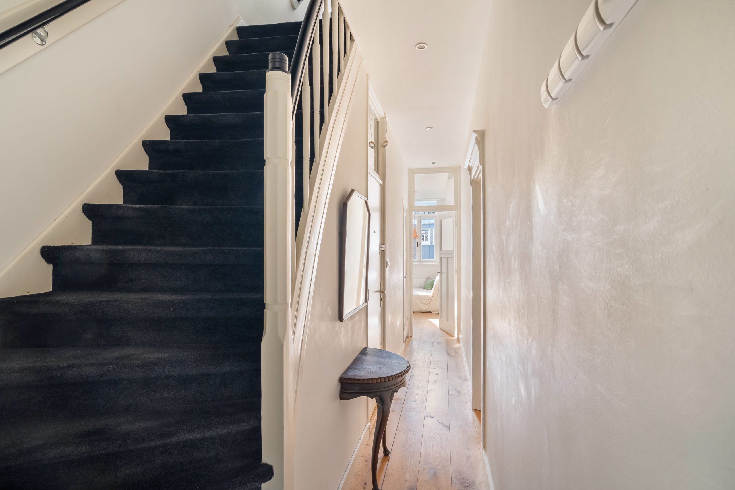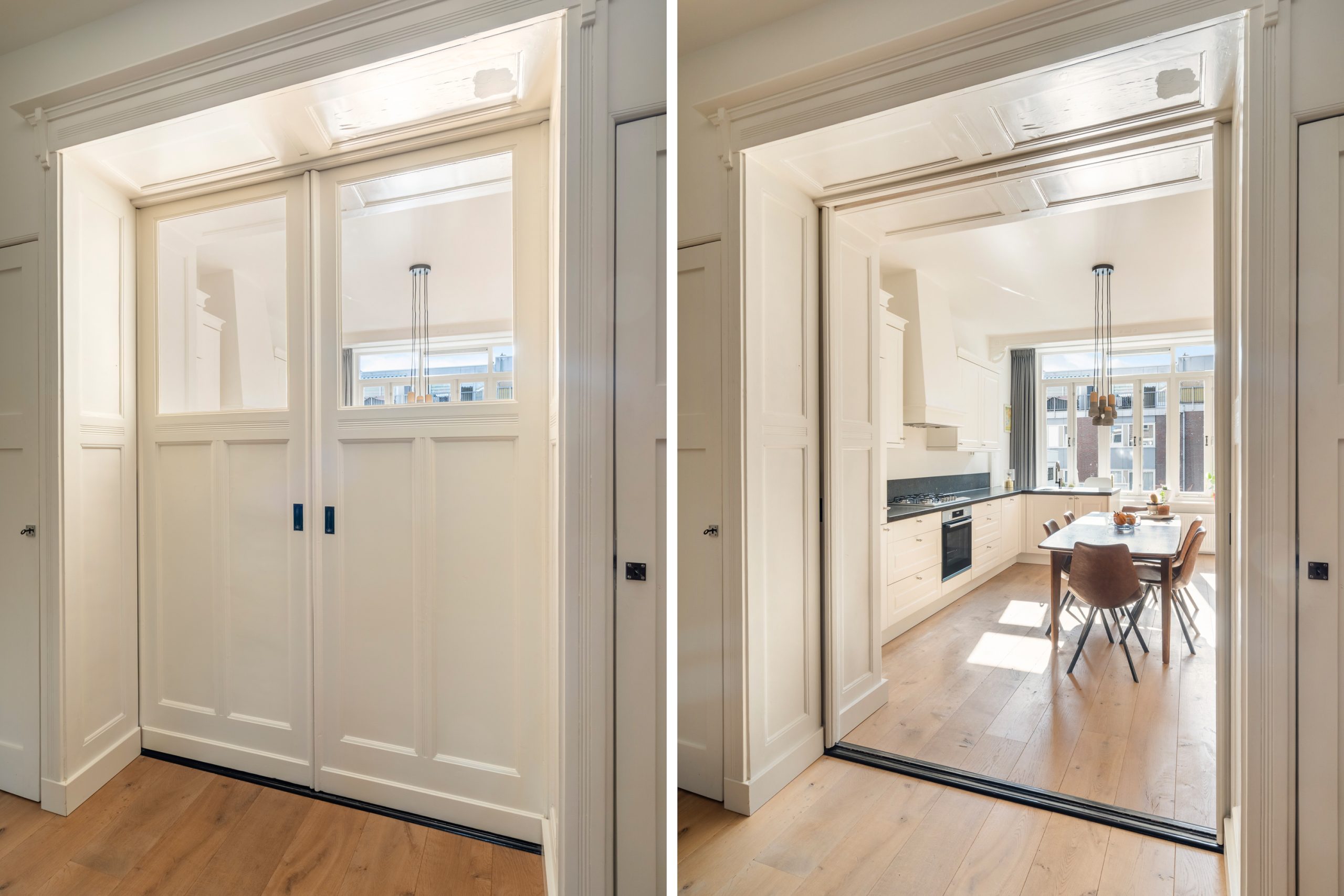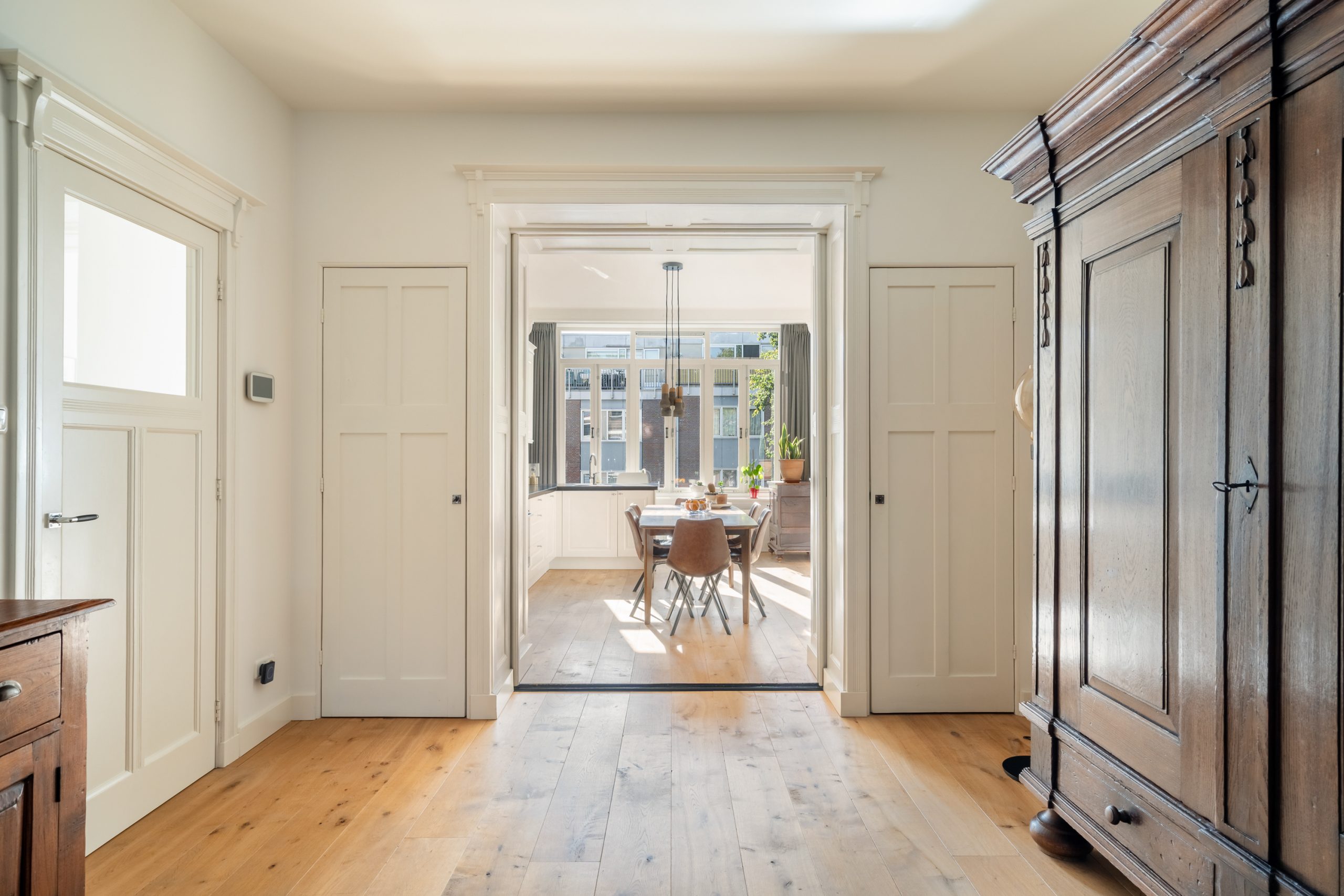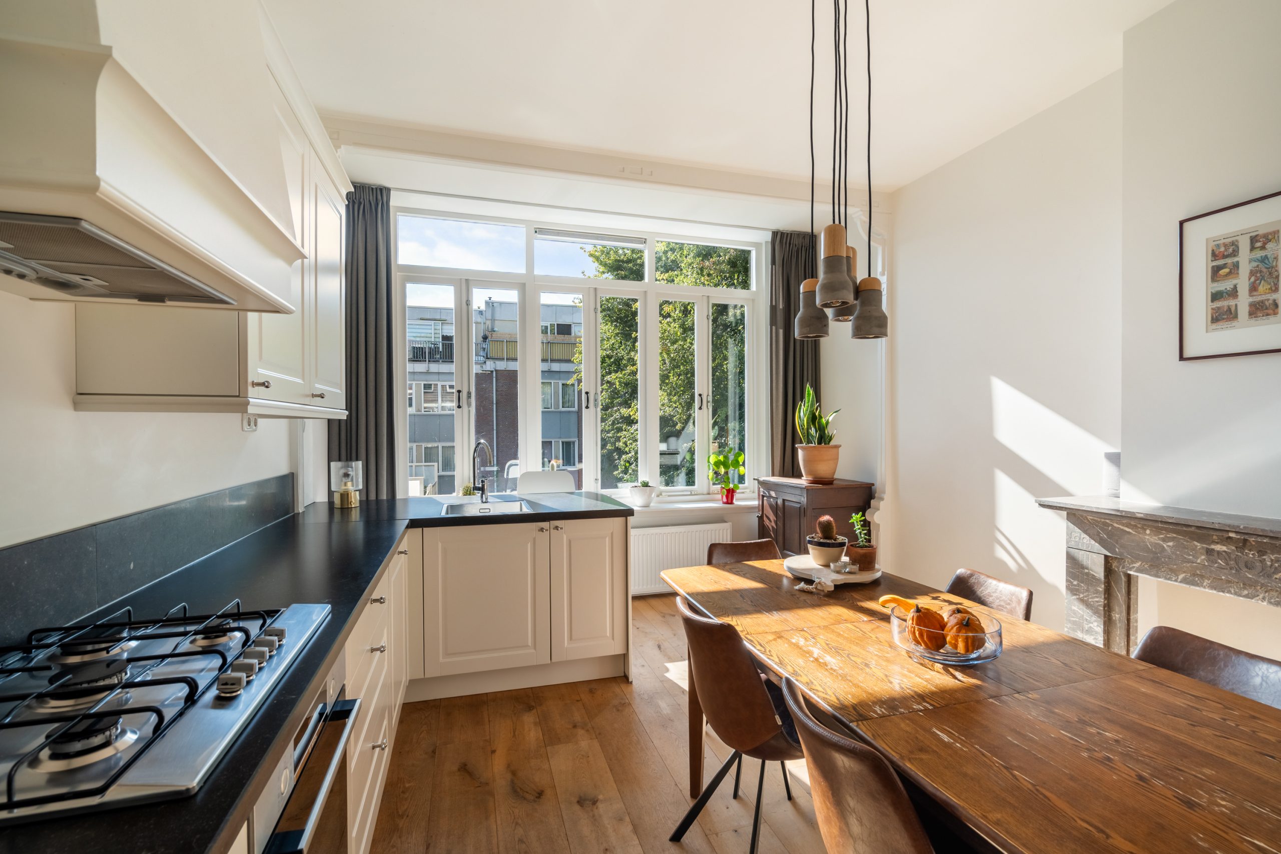 Hal met toilet en toegang tot de woonkamer. Het woongedeelte is gelegen aan de voorzijde van de woning en beschikt over een prachtige lichtinval door de grote raampartijen. Direct bij binnenkomst word je overspoeld door talloze authentieke jaren ’10 details zoals de prachtige glas-in-lood ramen, de erker, de originele schouwen en paneeldeuren. Het woongedeelte kan gescheiden worden van het eetgedeelte middels de en suite deuren (met 3 inbouwkasten). De eetkamer staat in directe verbinding met de open keuken, waardoor je tijdens het koken altijd in contact kunt blijven met je gezelschap. De open keuken beschikt over diverse soorten inbouwapparatuur, zoals een 5-pits gasfornuis, afzuigkap, oven, vaatwasser en koel-/vriescombinatie. Op deze verdieping zijn er 2 slaapkamers. De kamer aan de voorzijde beschikt over een inbouwkast, handig voor extra opbergruimte.