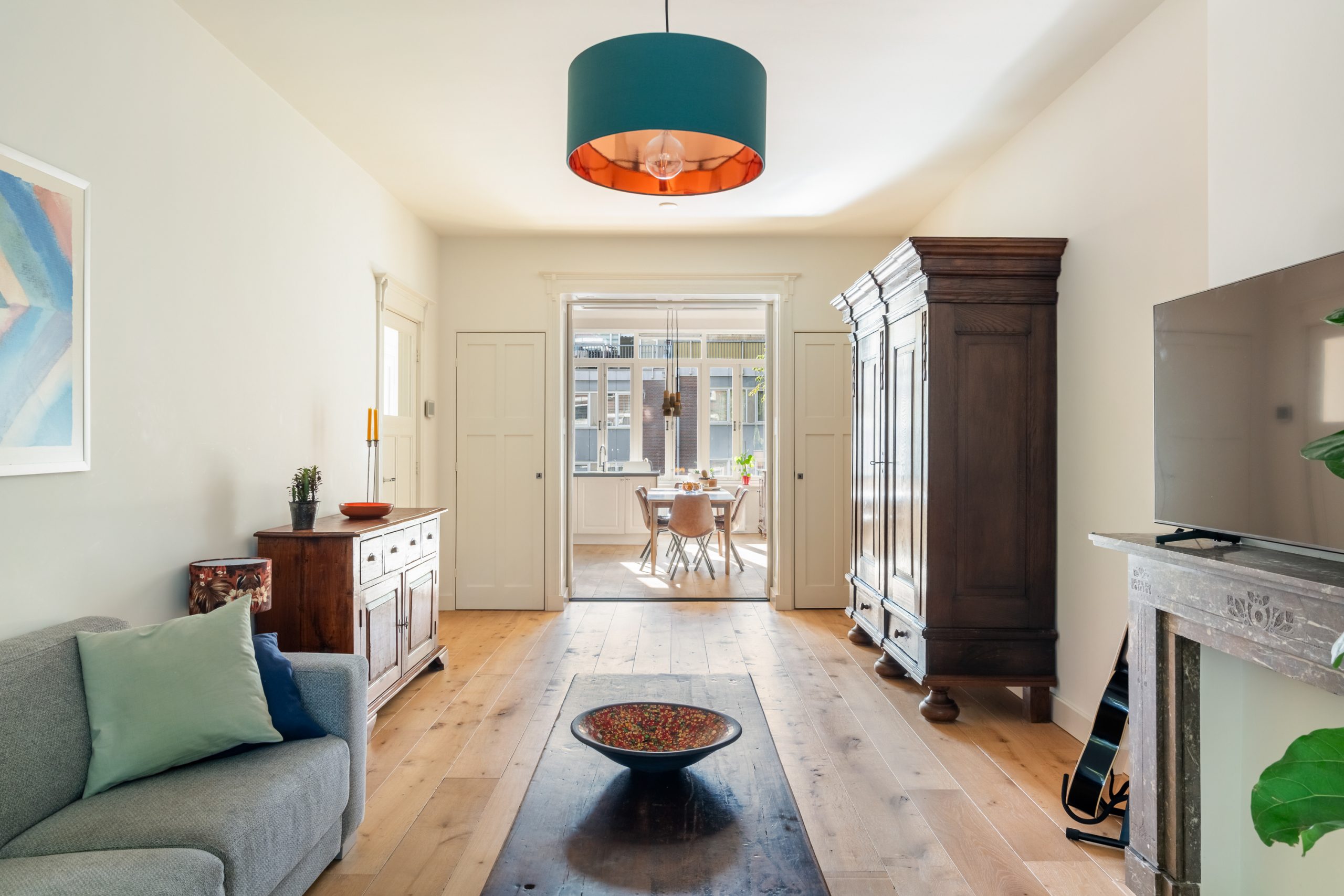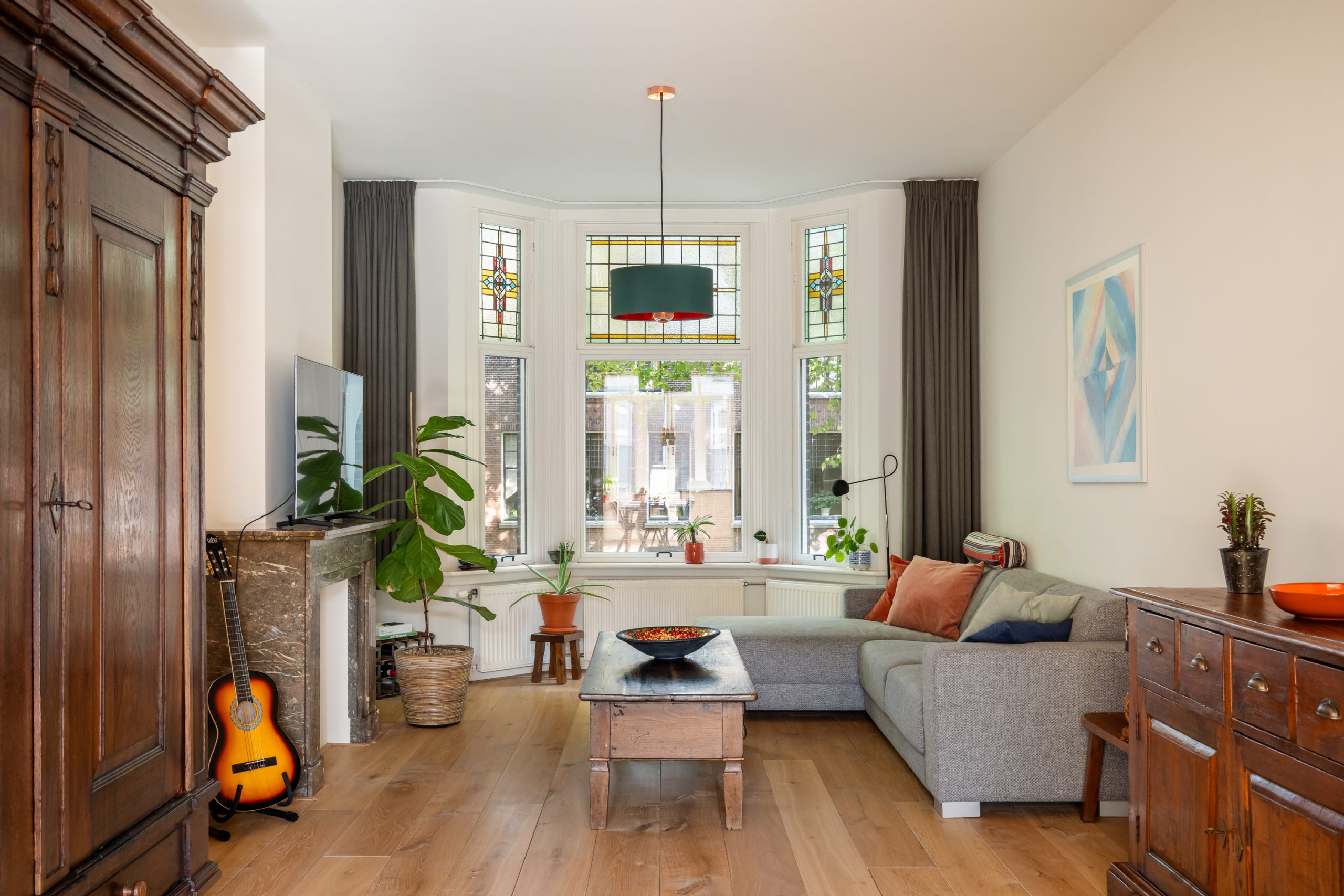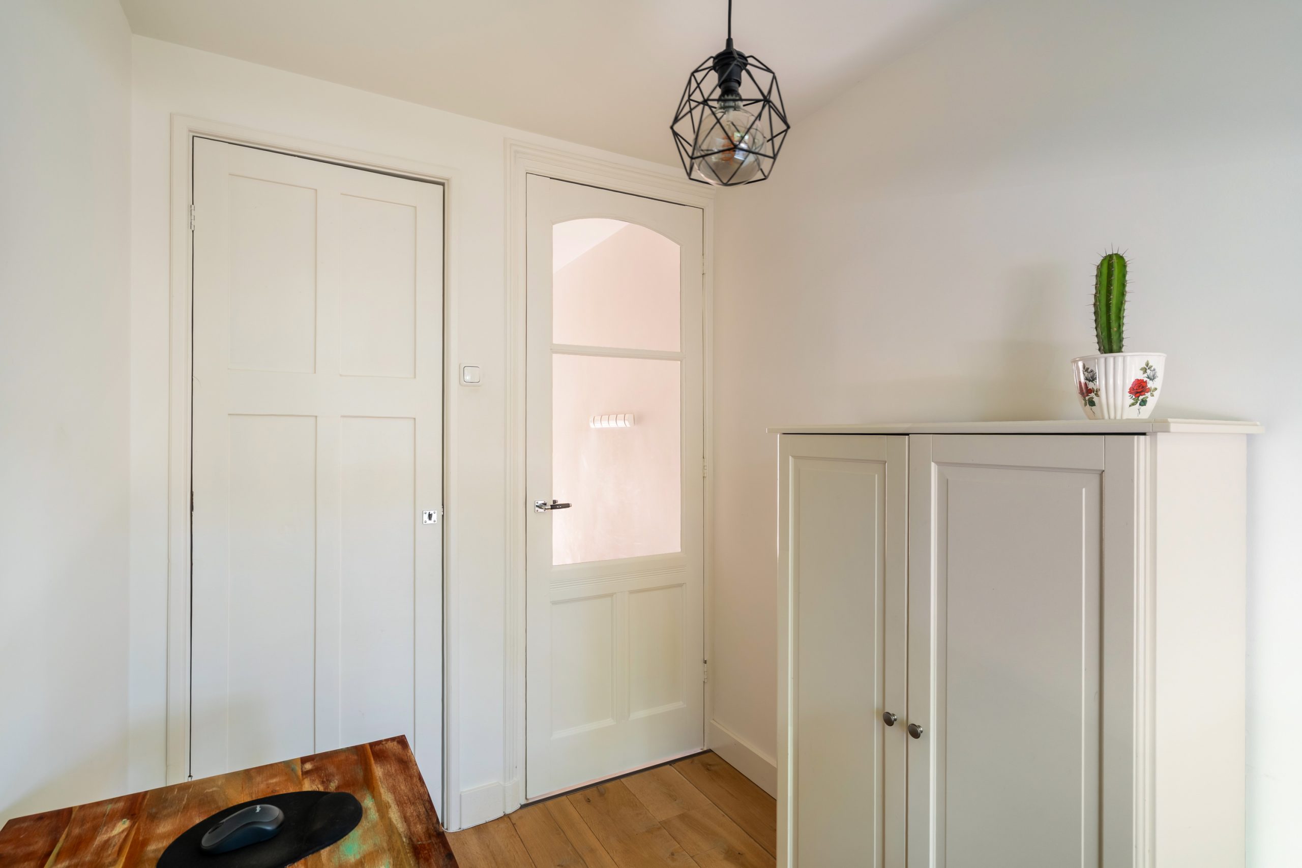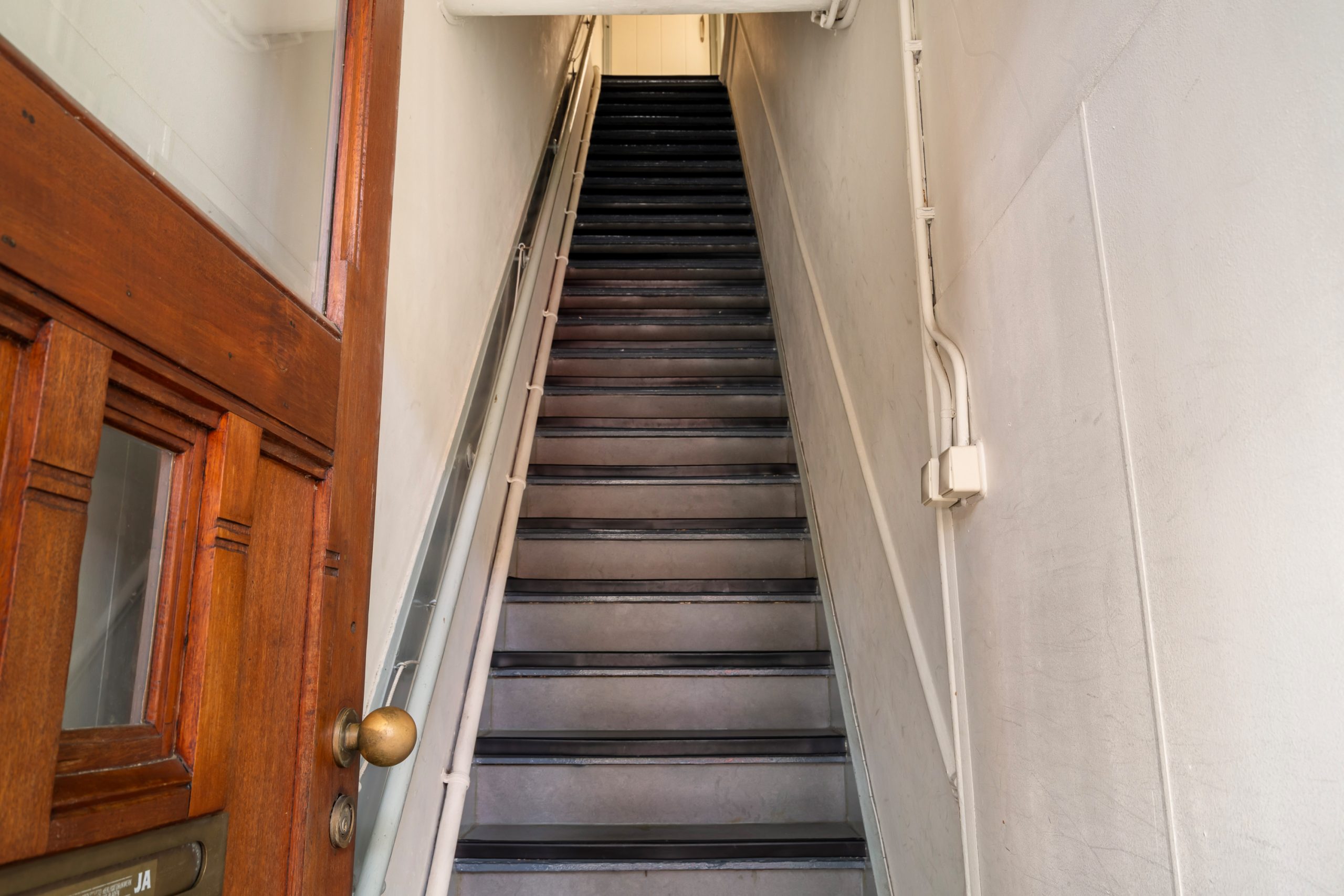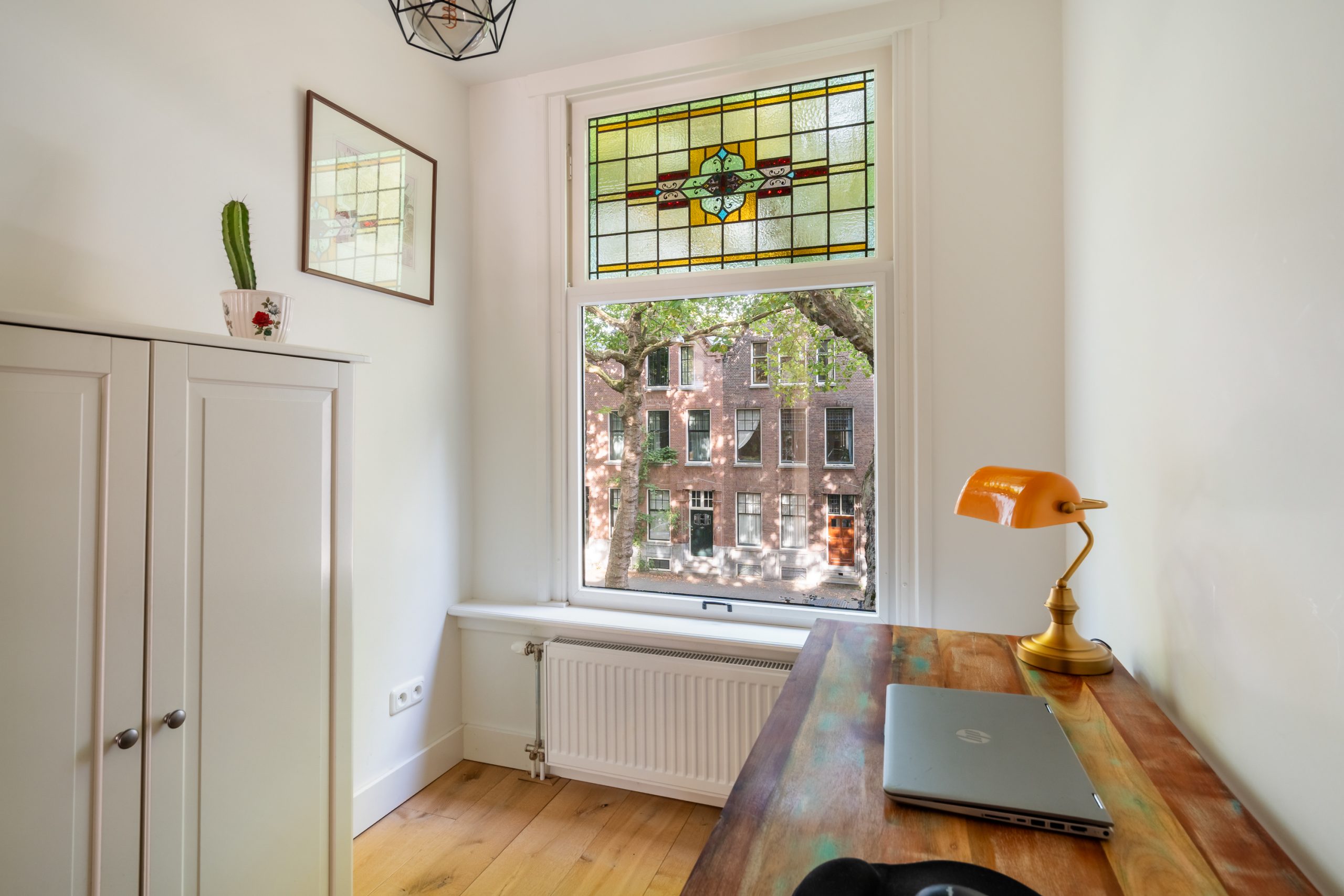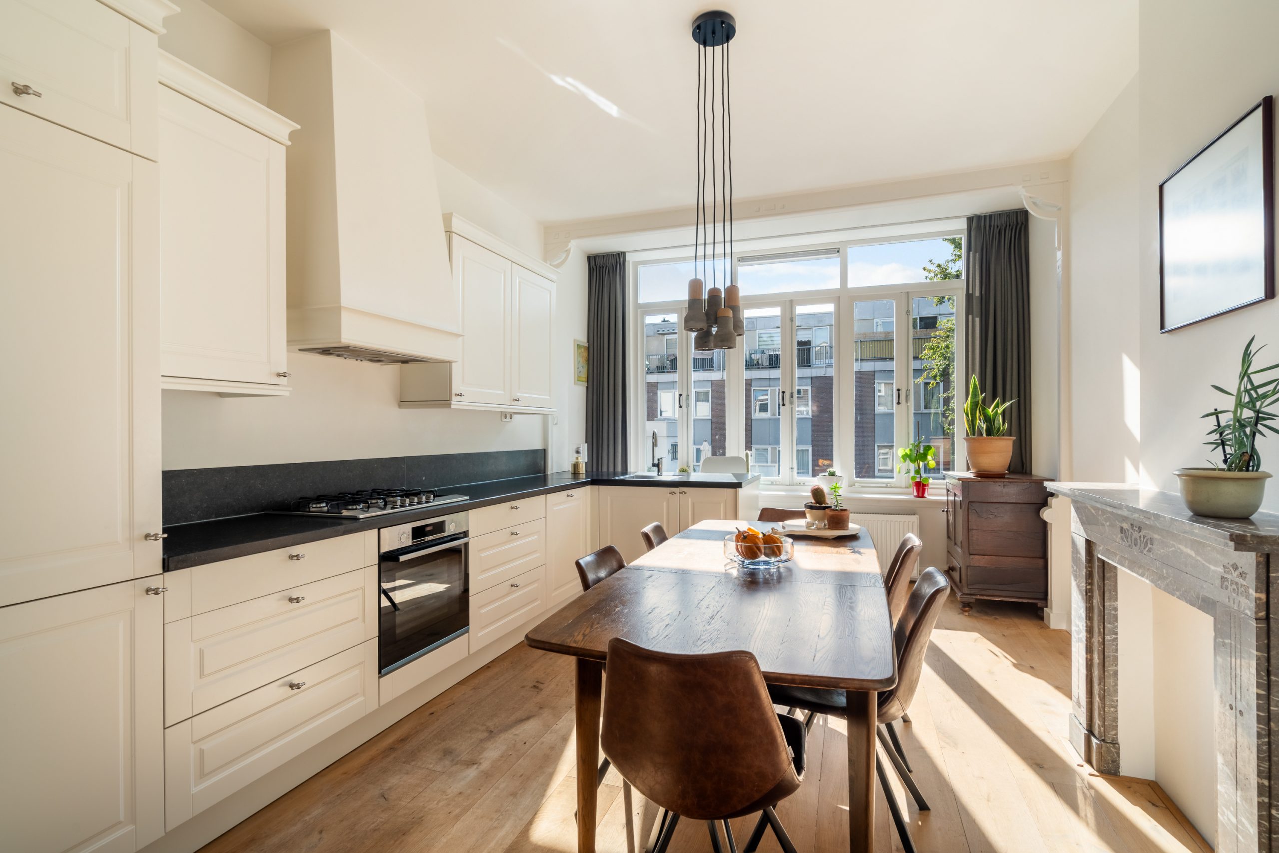 Hal met toilet en toegang tot de woonkamer. Het woongedeelte is gelegen aan de voorzijde van de woning en beschikt over een prachtige lichtinval door de grote raampartijen. Direct bij binnenkomst word je overspoeld door talloze authentieke jaren ’10 details zoals de prachtige glas-in-lood ramen, de erker, de originele schouwen en paneeldeuren. Het woongedeelte kan gescheiden worden van het eetgedeelte middels de en suite deuren (met 3 inbouwkasten). De eetkamer staat in directe verbinding met de open keuken, waardoor je tijdens het koken altijd in contact kunt blijven met je gezelschap. De open keuken beschikt over diverse soorten inbouwapparatuur, zoals een 5-pits gasfornuis, afzuigkap, oven, vaatwasser en koel-/vriescombinatie. Op deze verdieping zijn er 2 slaapkamers. De kamer aan de voorzijde beschikt over een inbouwkast, handig voor extra opbergruimte.