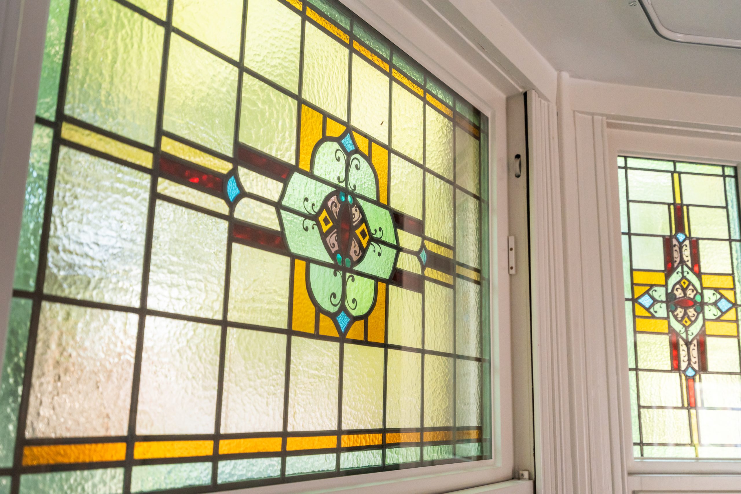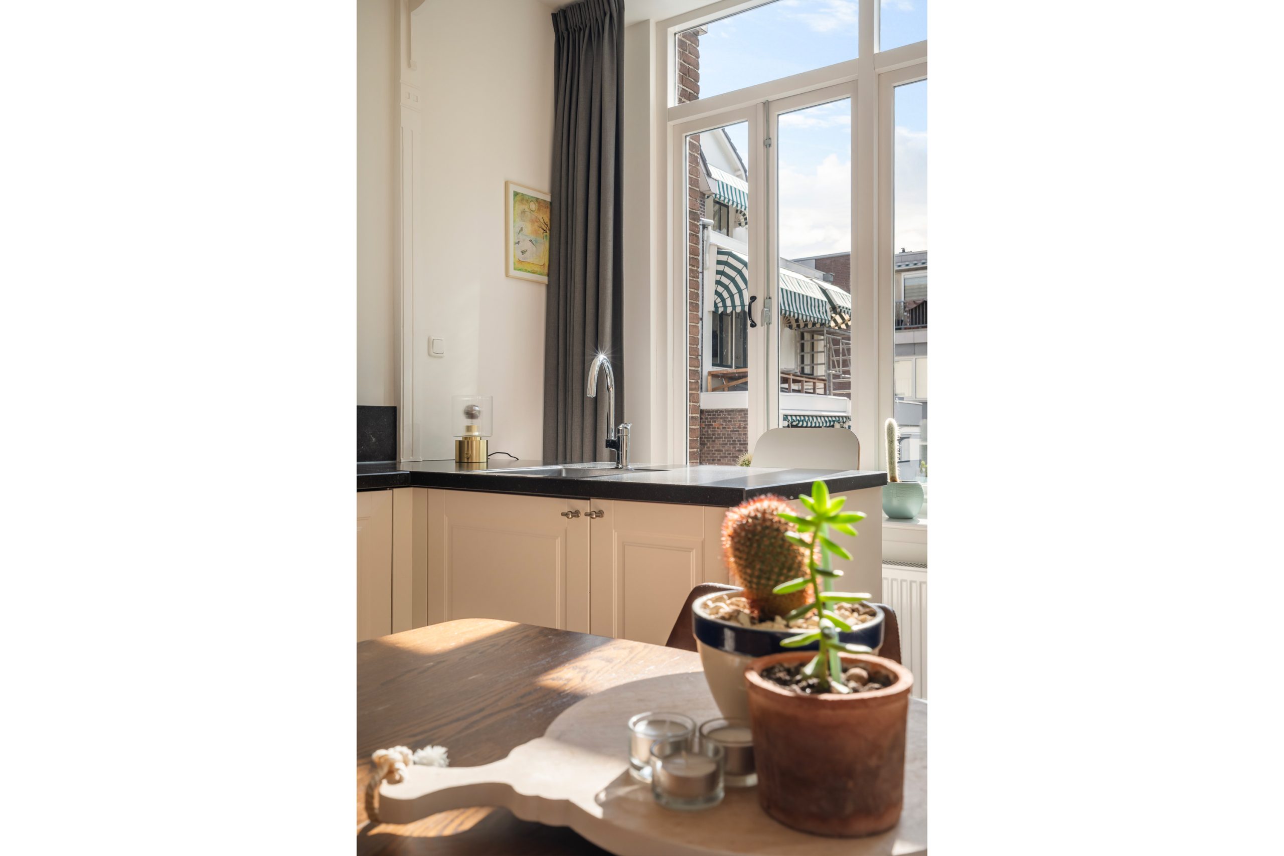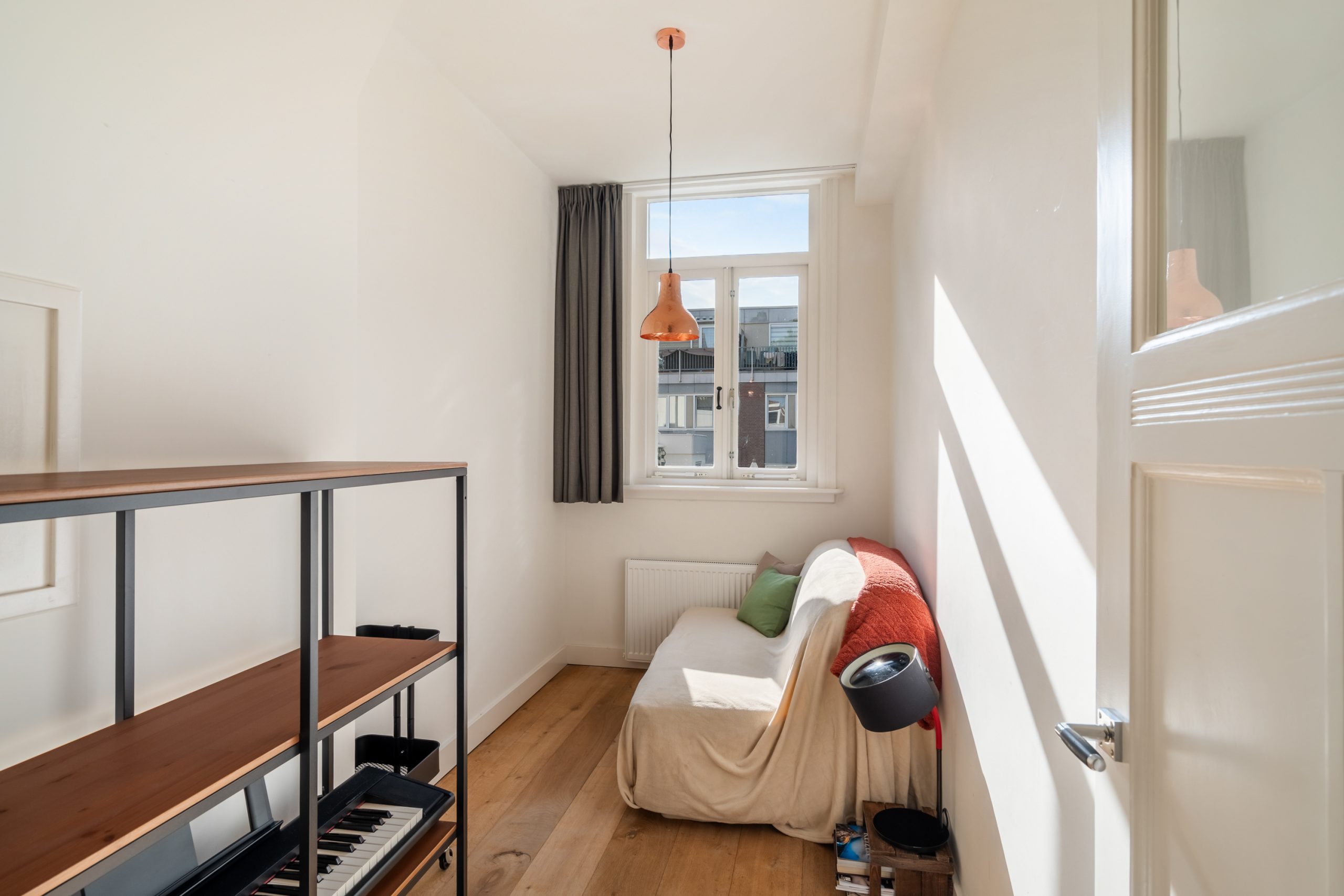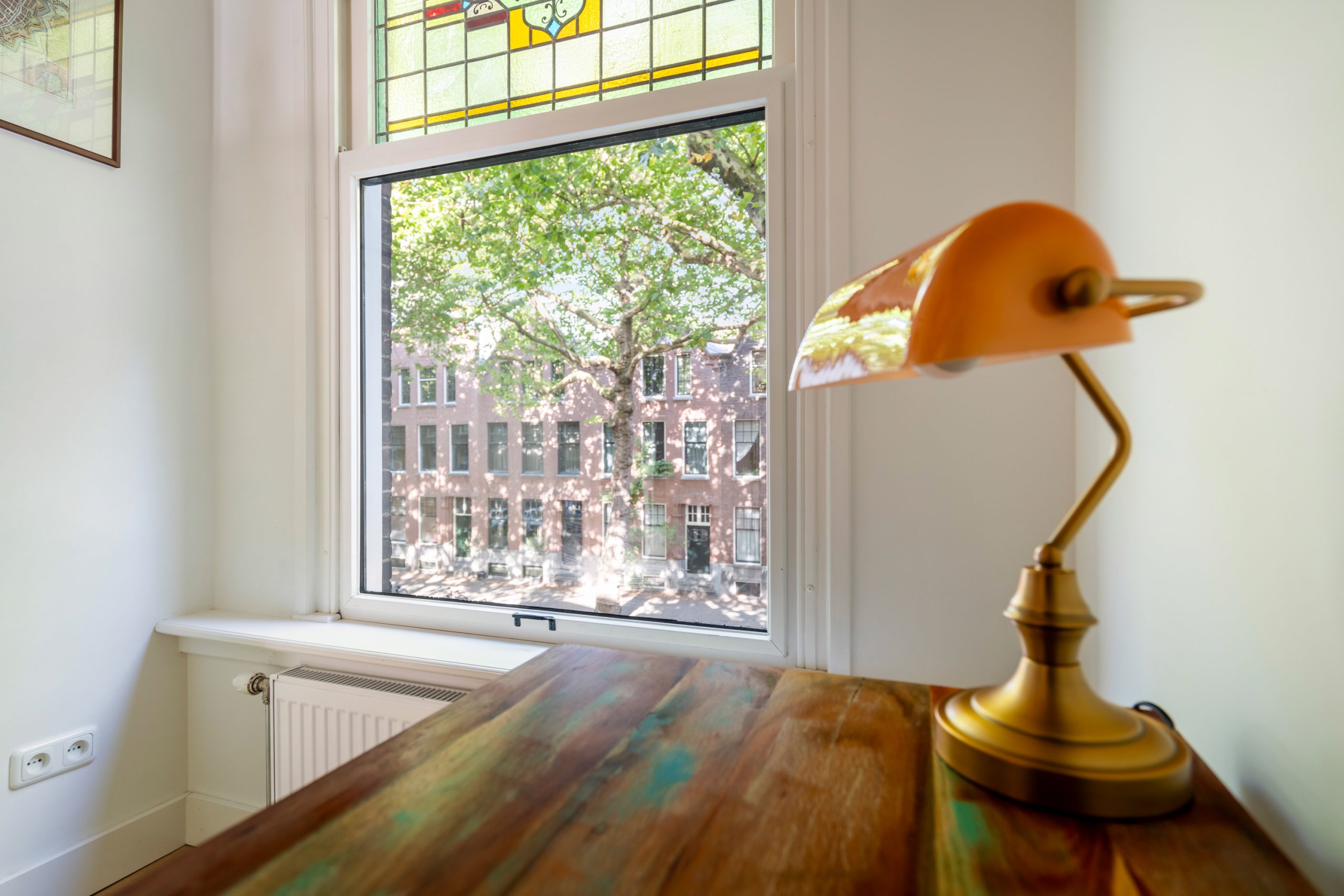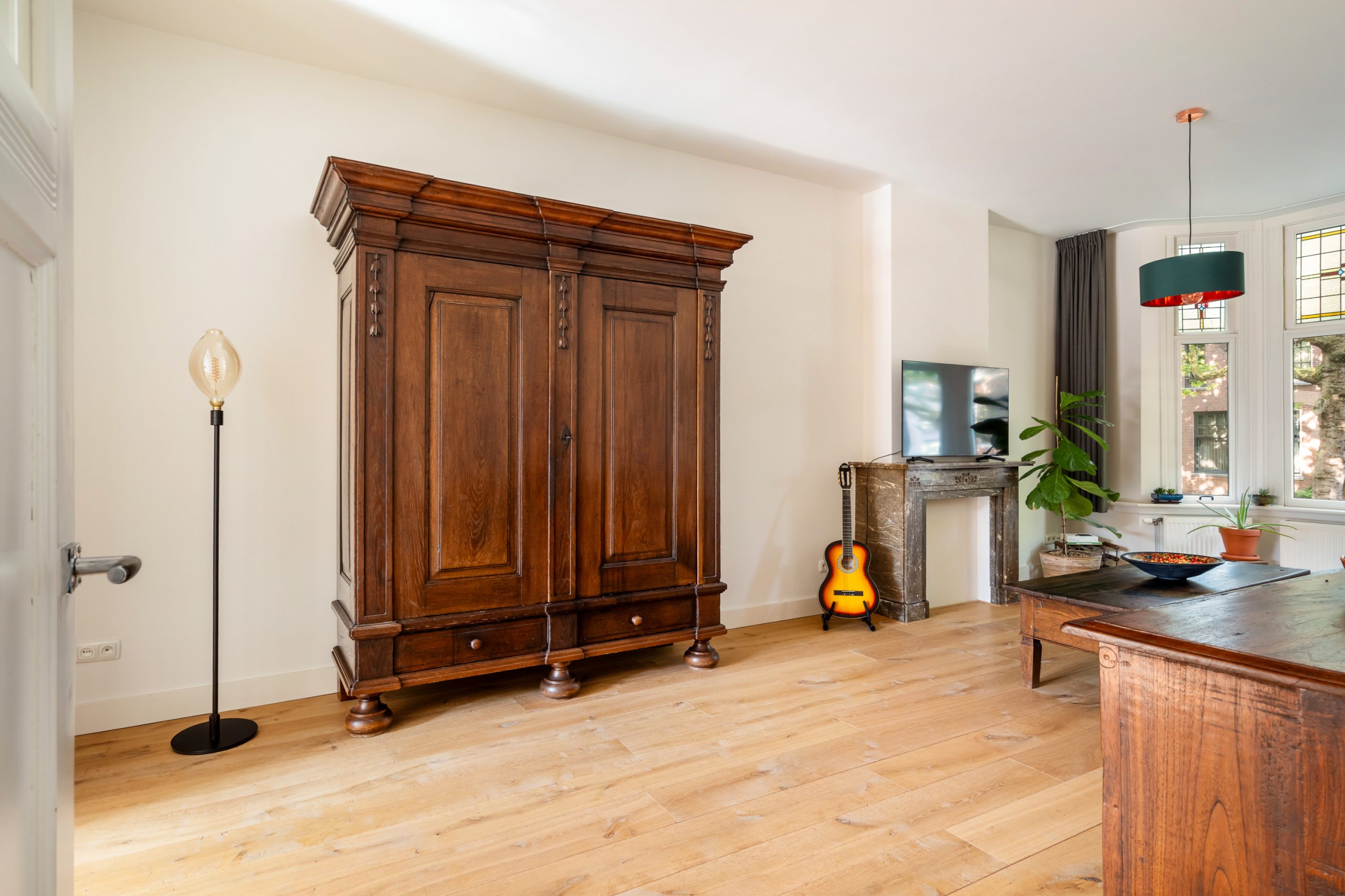 Hal met toilet en toegang tot de woonkamer. Het woongedeelte is gelegen aan de voorzijde van de woning en beschikt over een prachtige lichtinval door de grote raampartijen. Direct bij binnenkomst word je overspoeld door talloze authentieke jaren ’10 details zoals de prachtige glas-in-lood ramen, de erker, de originele schouwen en paneeldeuren. Het woongedeelte kan gescheiden worden van het eetgedeelte middels de en suite deuren (met 3 inbouwkasten). De eetkamer staat in directe verbinding met de open keuken, waardoor je tijdens het koken altijd in contact kunt blijven met je gezelschap. De open keuken beschikt over diverse soorten inbouwapparatuur, zoals een 5-pits gasfornuis, afzuigkap, oven, vaatwasser en koel-/vriescombinatie. Op deze verdieping zijn er 2 slaapkamers. De kamer aan de voorzijde beschikt over een inbouwkast, handig voor extra opbergruimte.