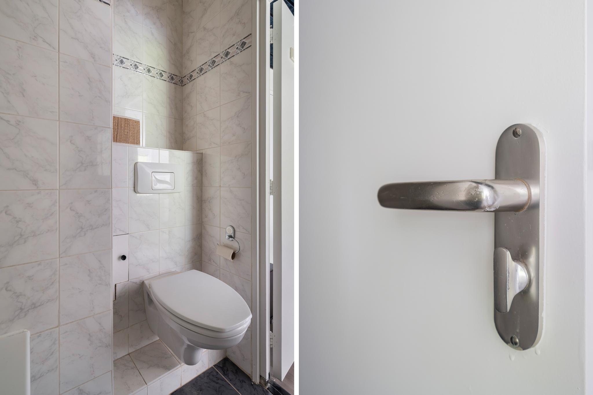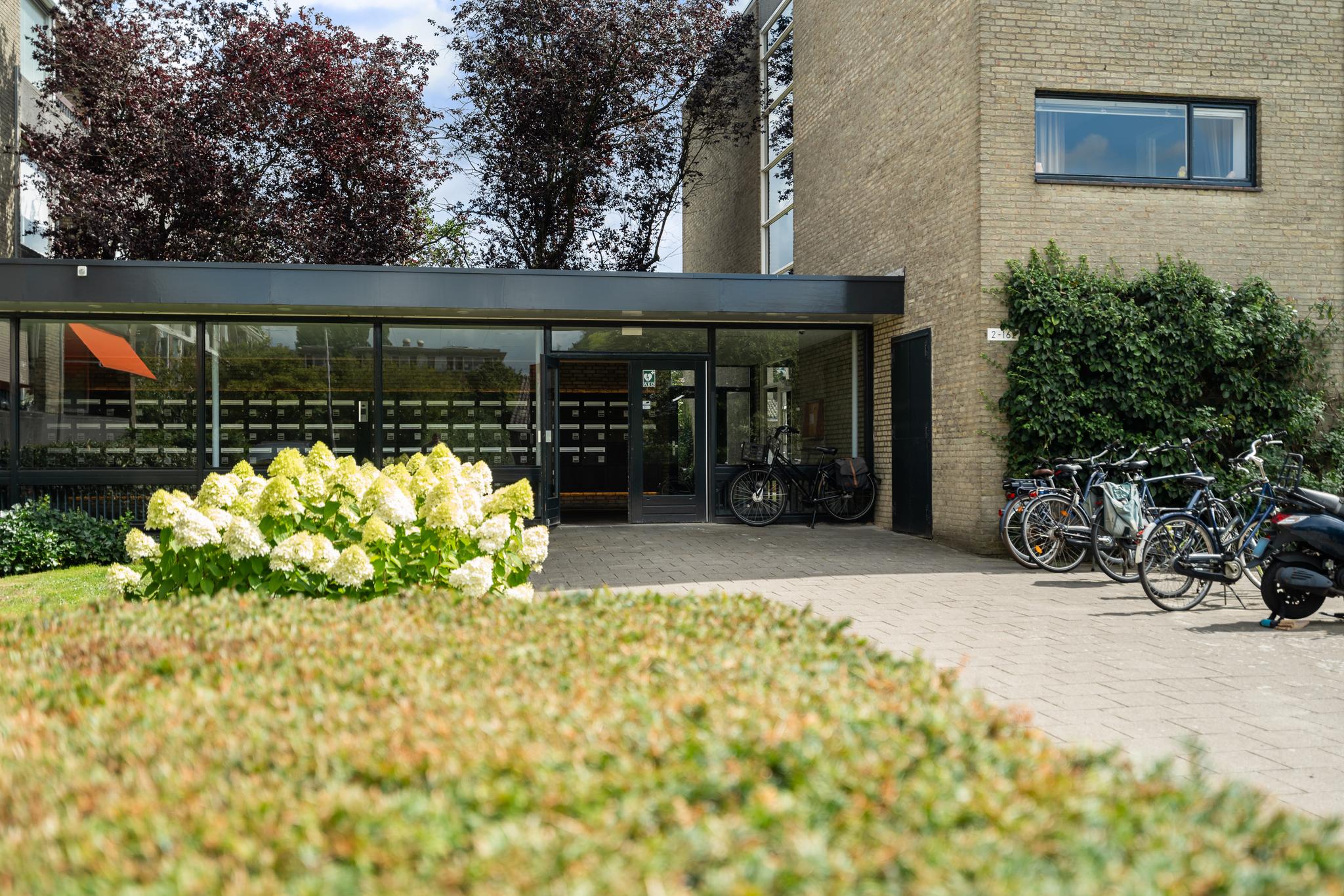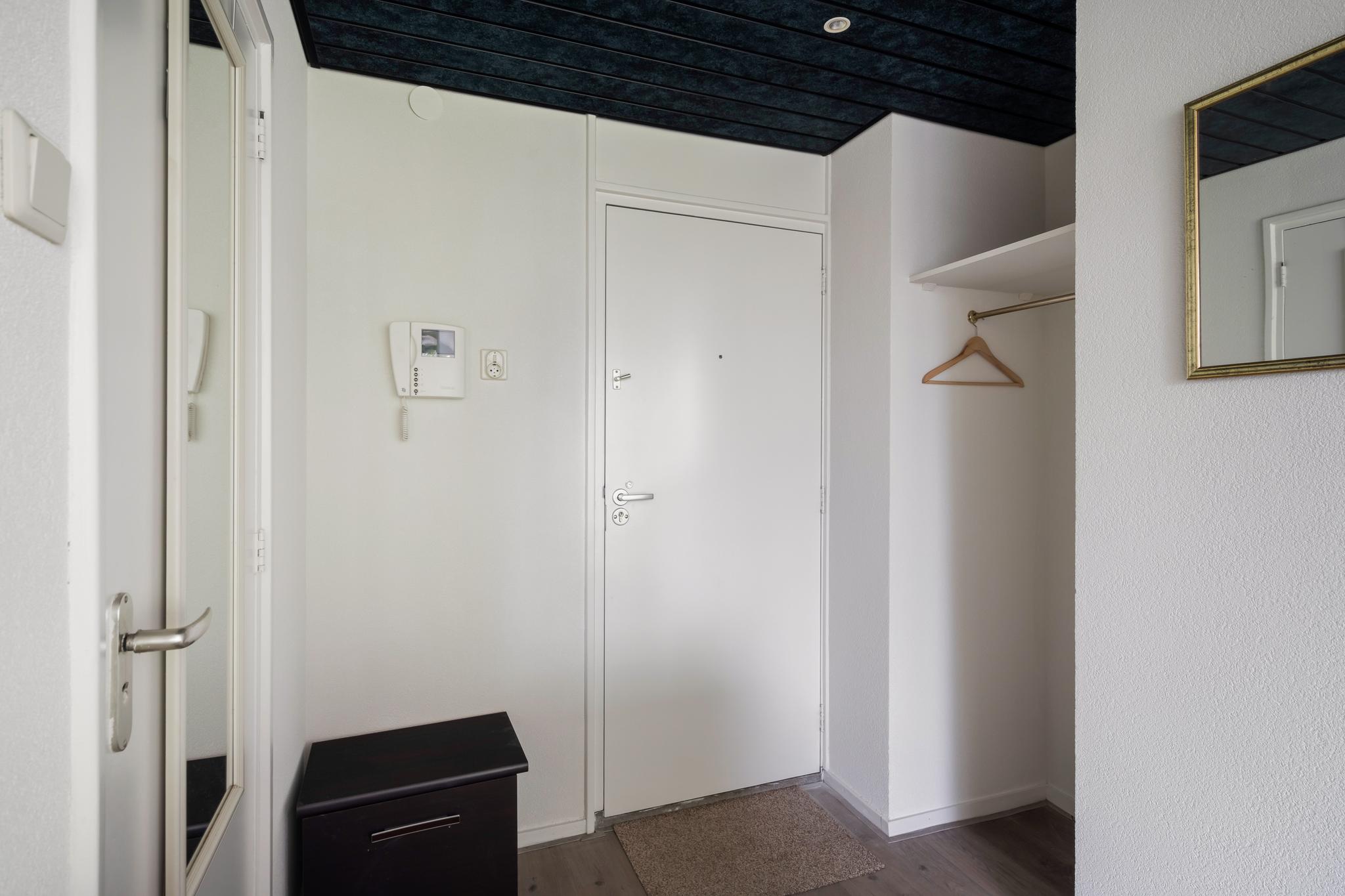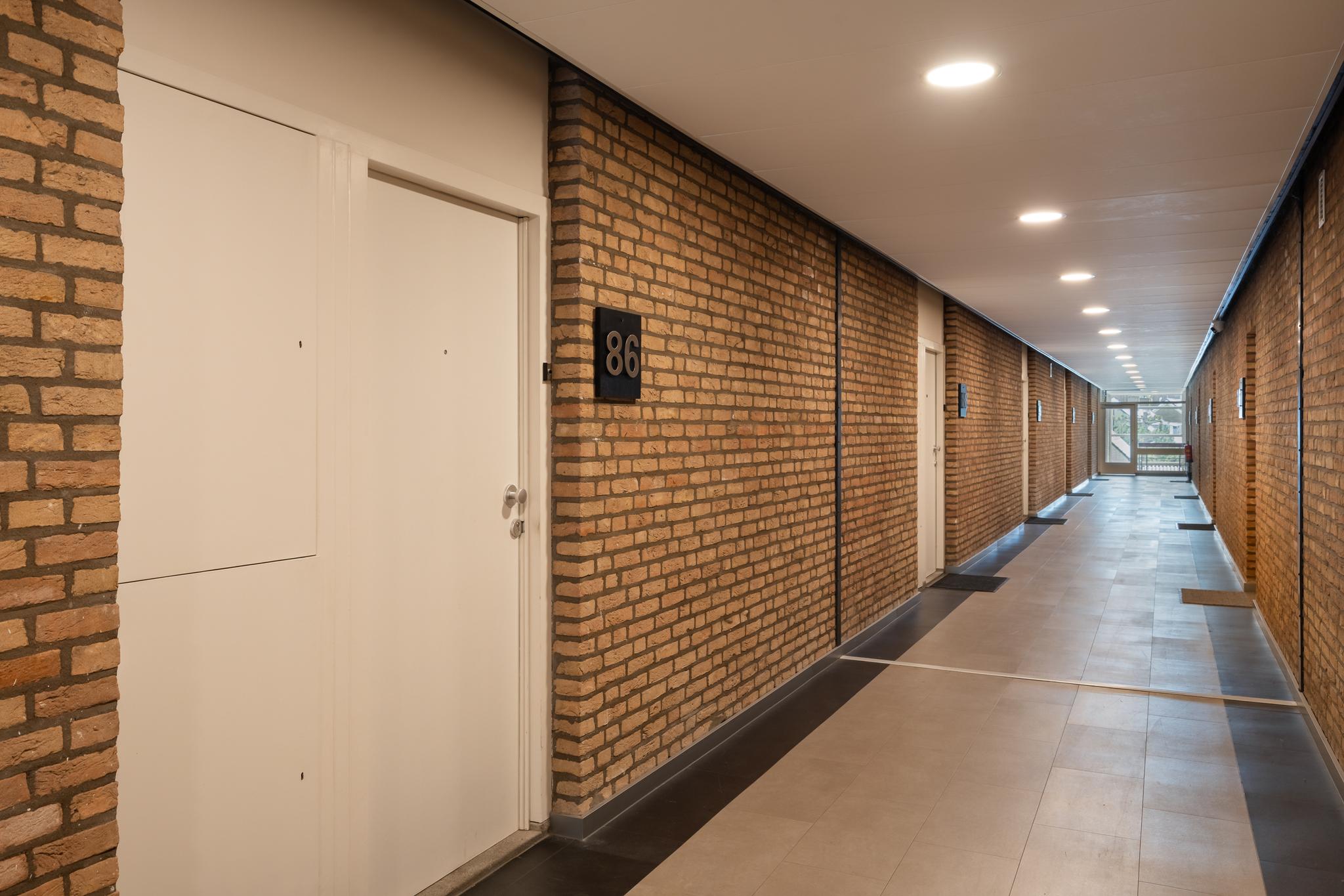 Gesloten portiek met brievenbussen, bellentableau en trapopgang naar de 2e verdieping. Het bellentableau is voorzien van intercom met beeldscherm.