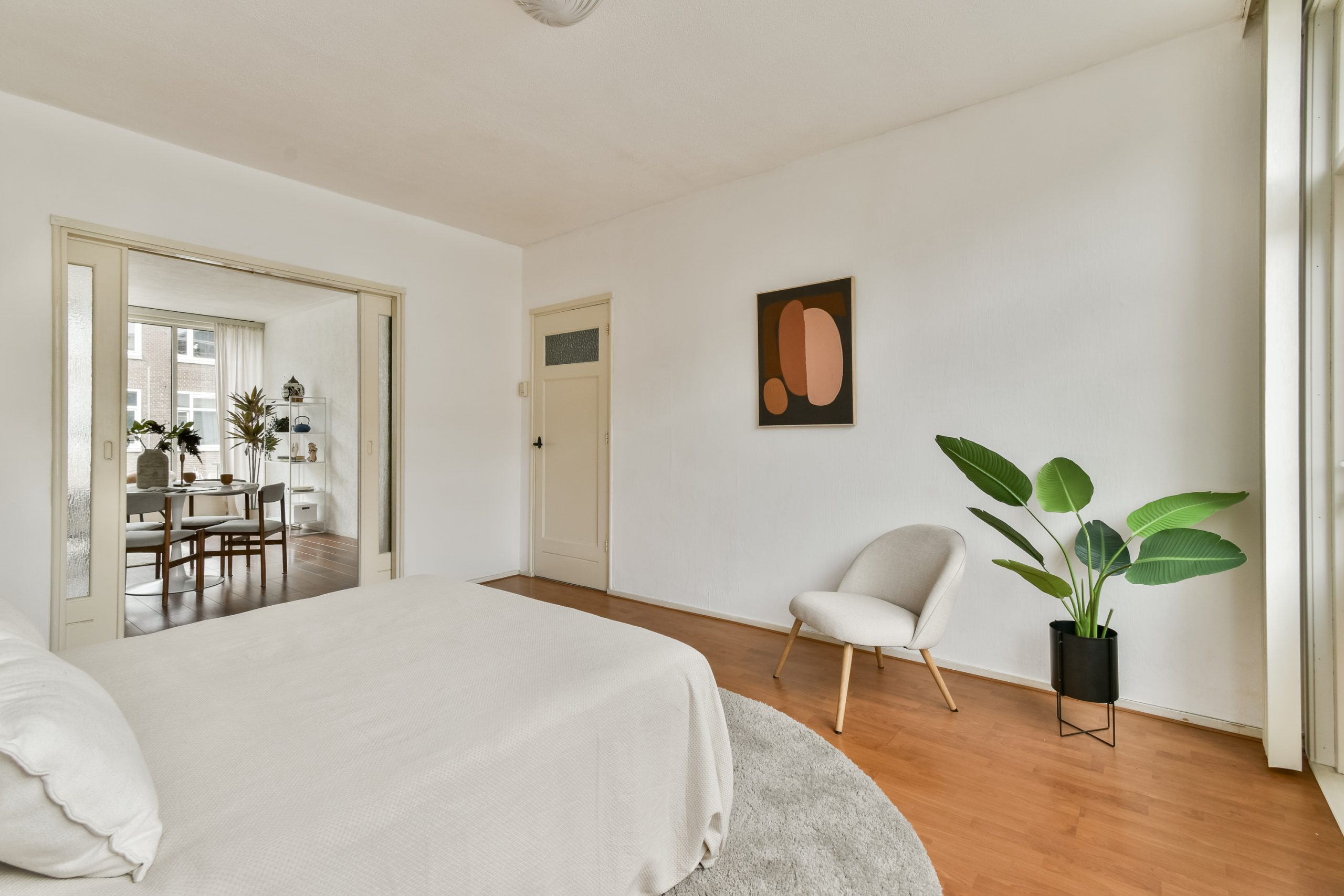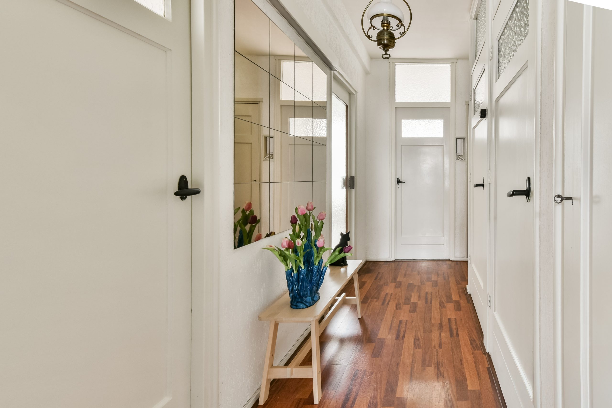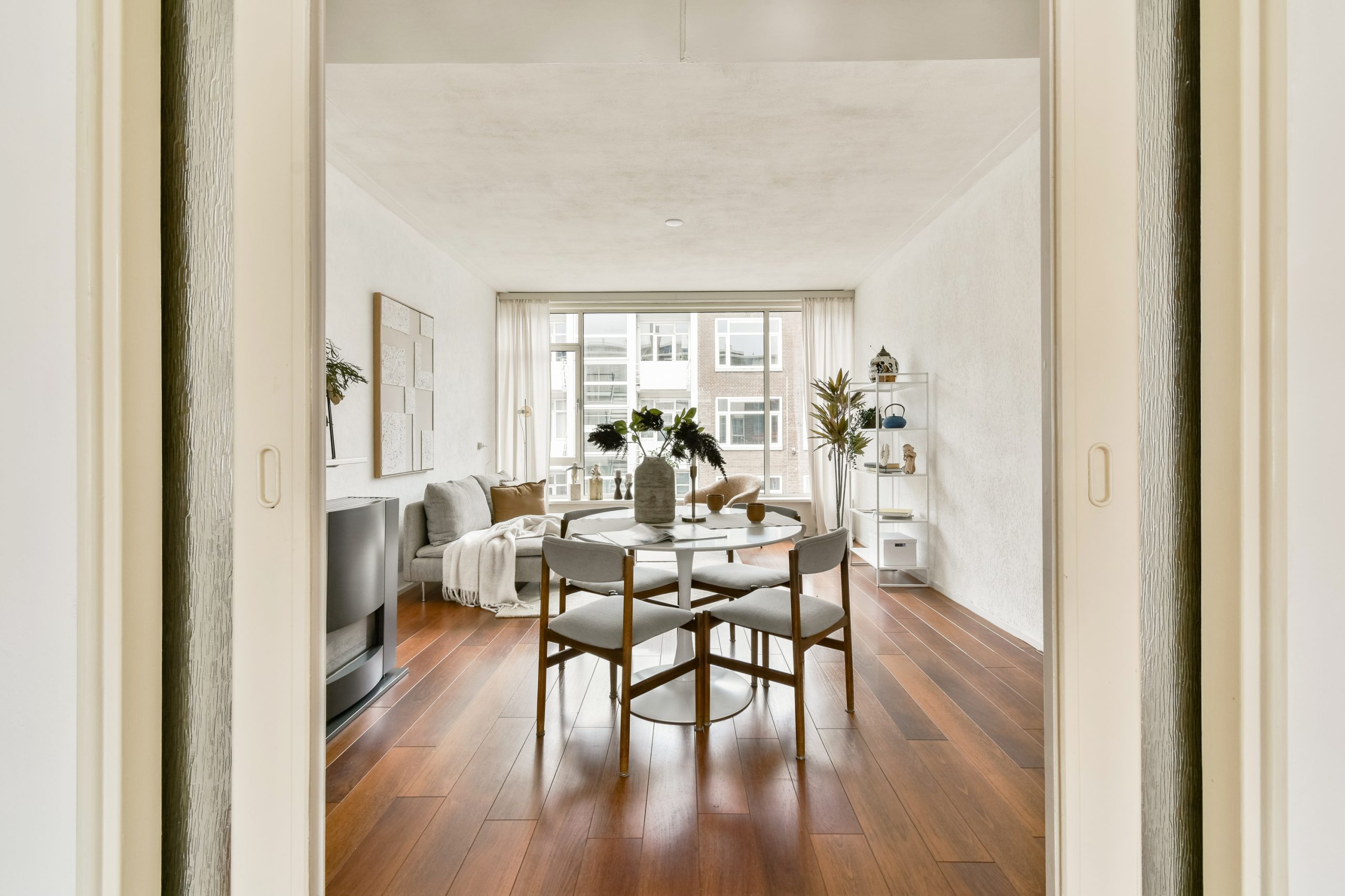 Entree met ruime hal en toegang tot alle vertrekken. De woonkamer met vaste kasten is gelegen aan de voorzijde van de woning. Dankzij de grote raampartijen valt er veel natuurlijk licht naar binnen, wat zorgt voor een fijne en lichte sfeer. Er is ruimte voor zowel een comfortabele zithoek als een aparte eethoek, waardoor de woonkamer praktisch is in te delen. De neutrale afwerking en warme houten vloer vormen een rustige basis en geven het geheel een verzorgde uitstraling.