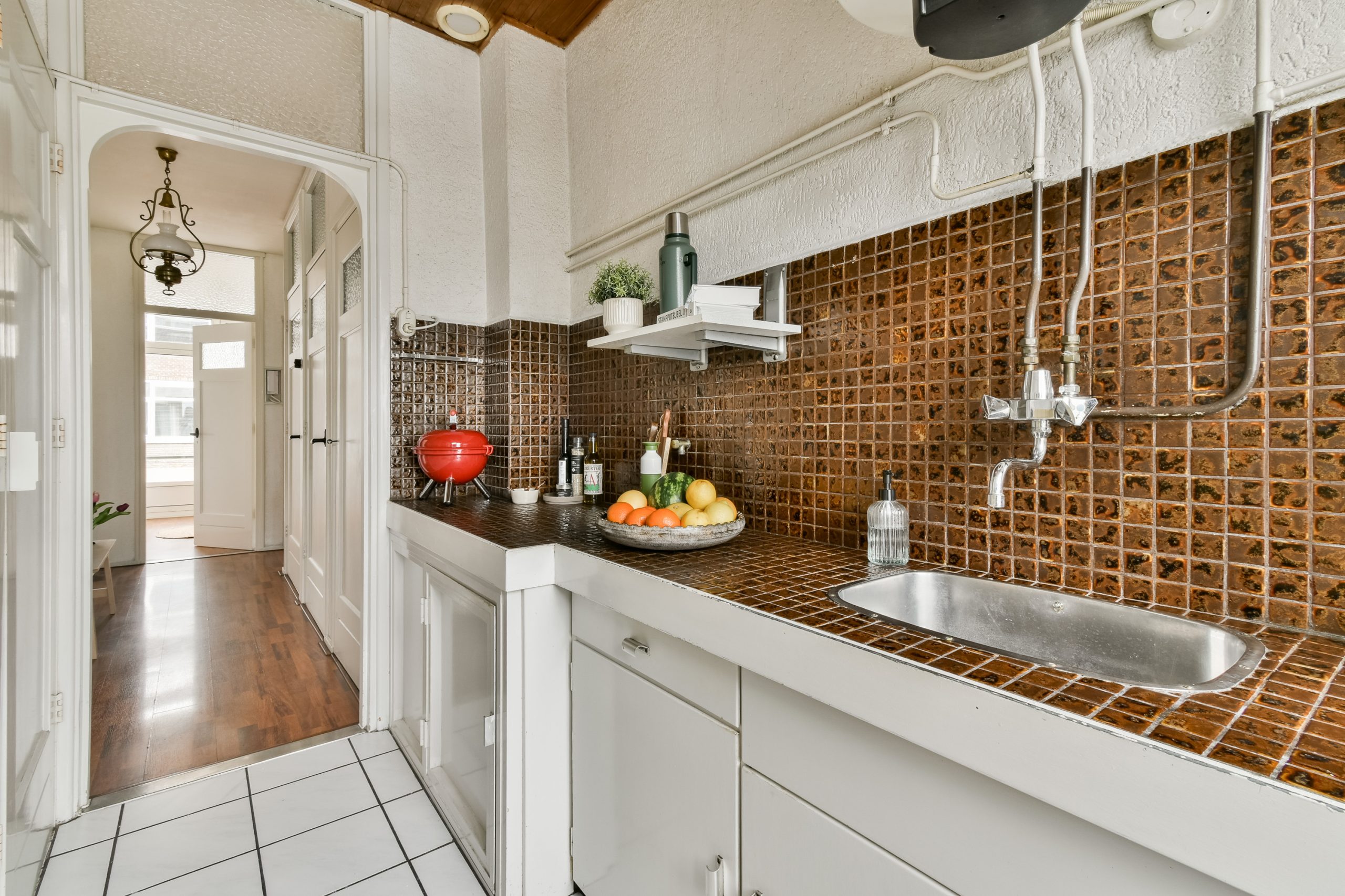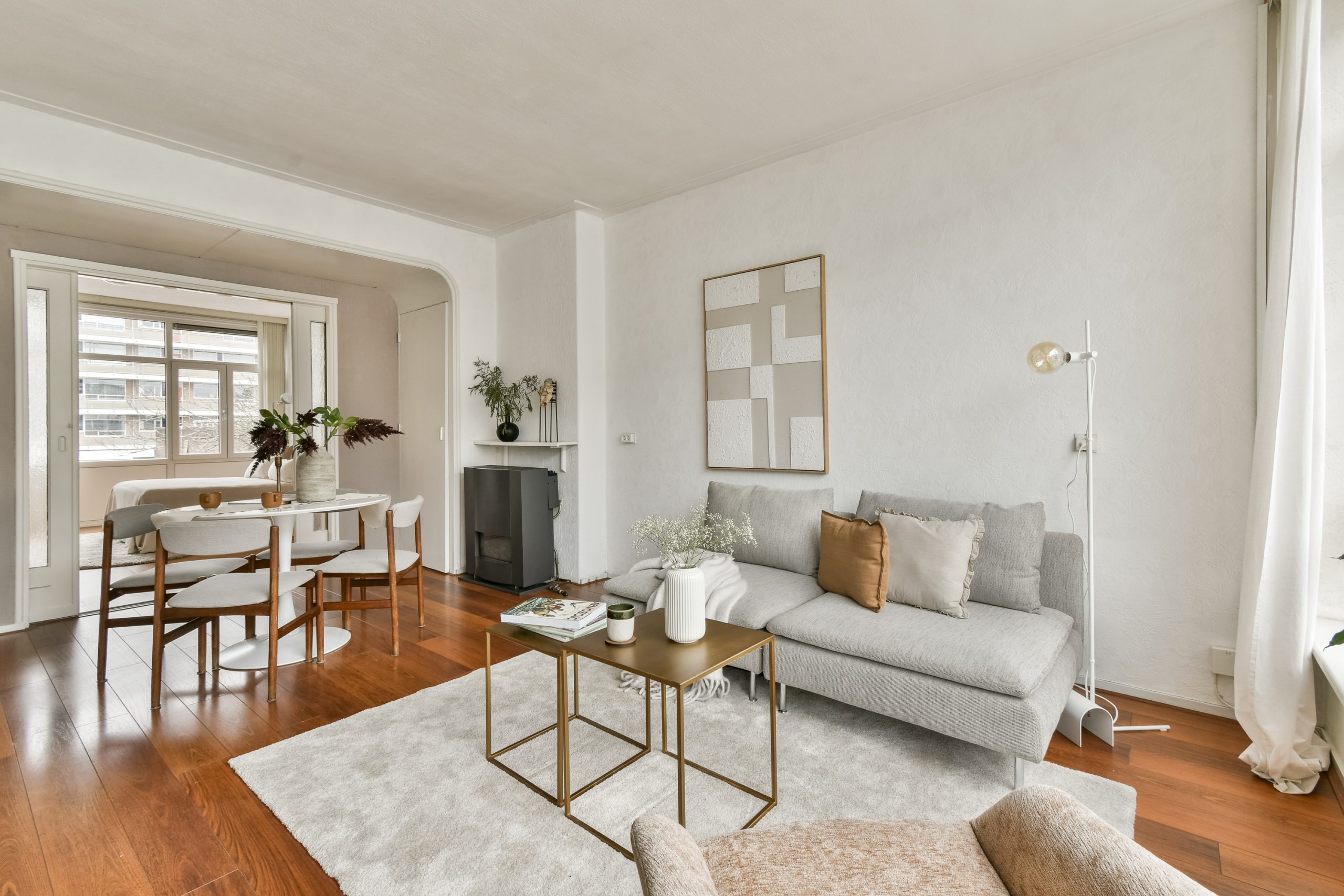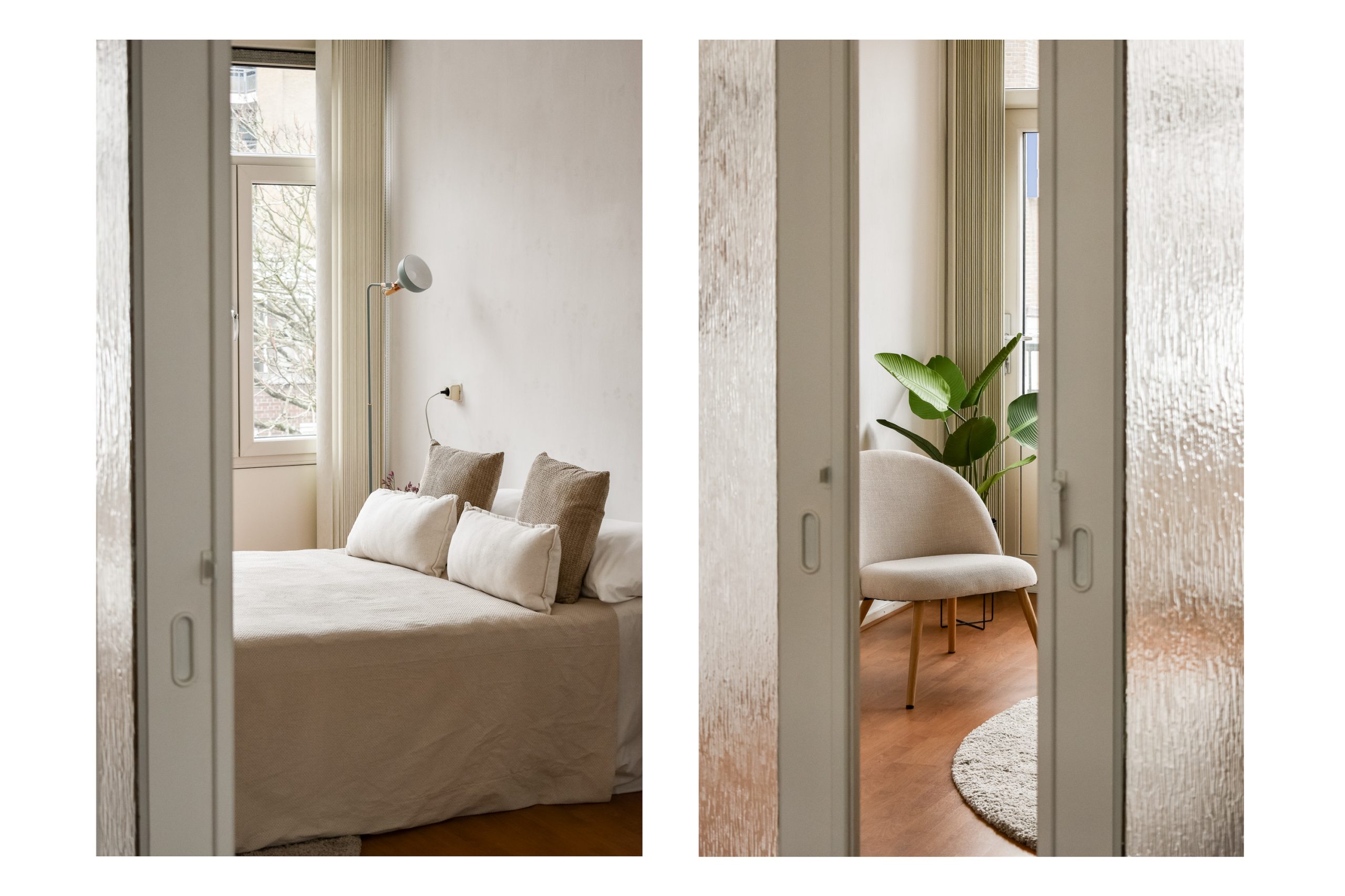 Entree met ruime hal en toegang tot alle vertrekken. De woonkamer met vaste kasten is gelegen aan de voorzijde van de woning. Dankzij de grote raampartijen valt er veel natuurlijk licht naar binnen, wat zorgt voor een fijne en lichte sfeer. Er is ruimte voor zowel een comfortabele zithoek als een aparte eethoek, waardoor de woonkamer praktisch is in te delen. De neutrale afwerking en warme houten vloer vormen een rustige basis en geven het geheel een verzorgde uitstraling.