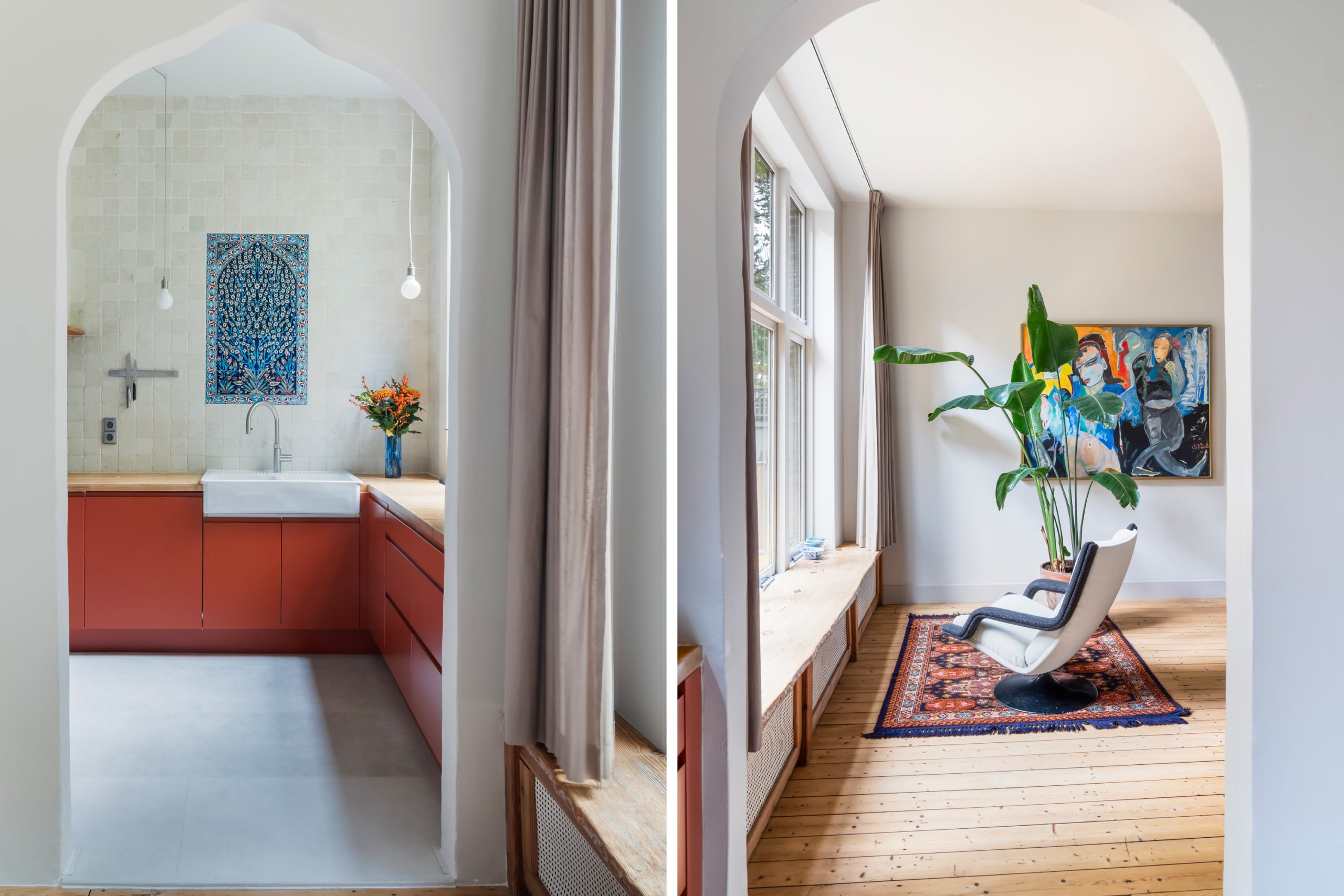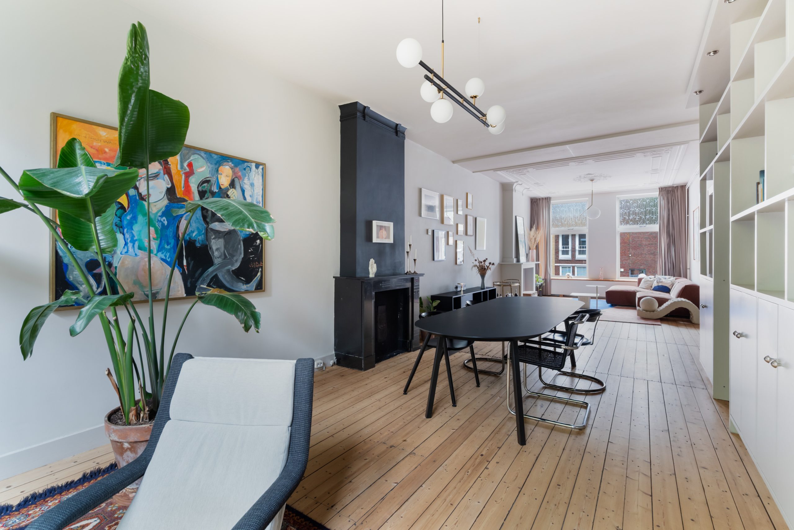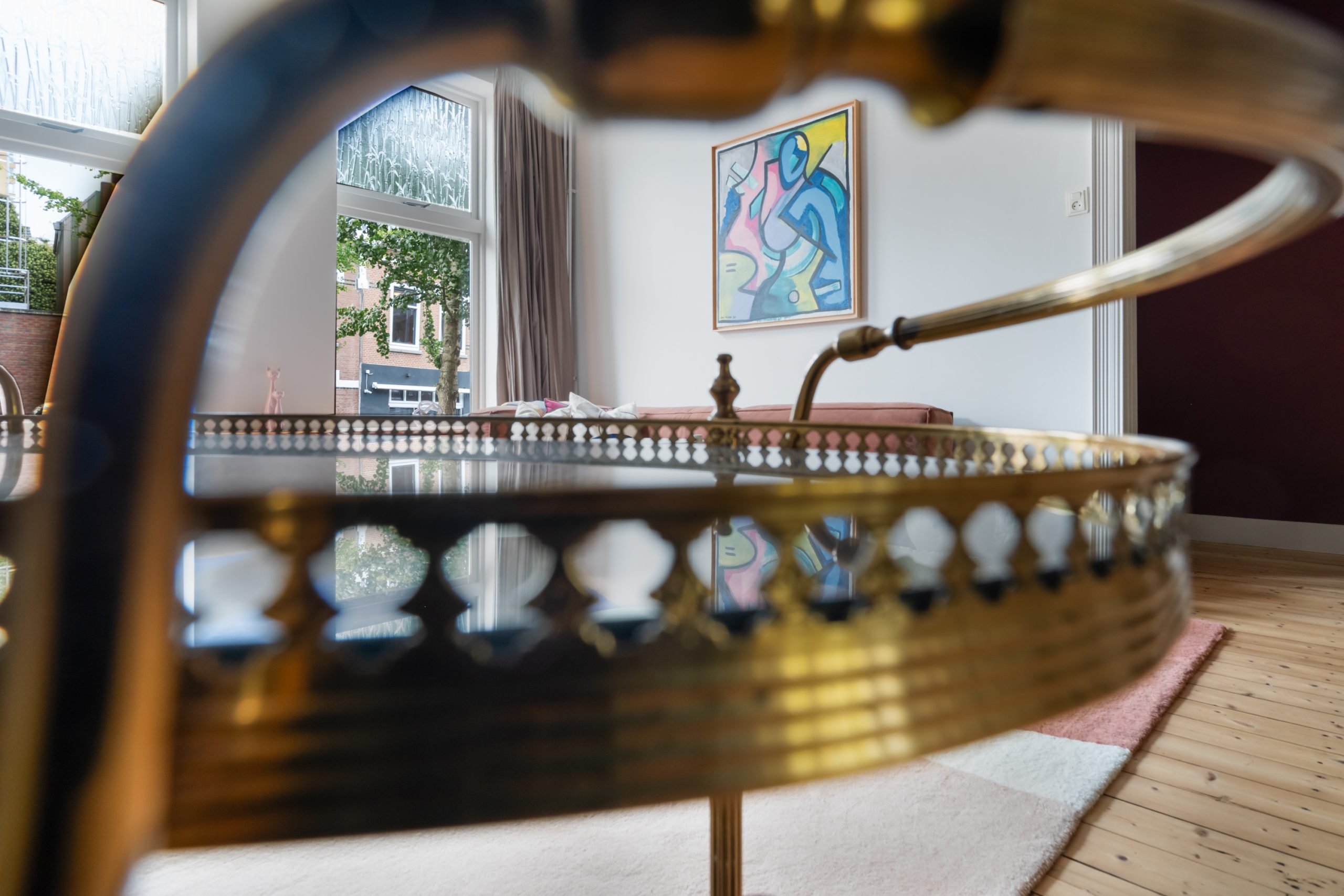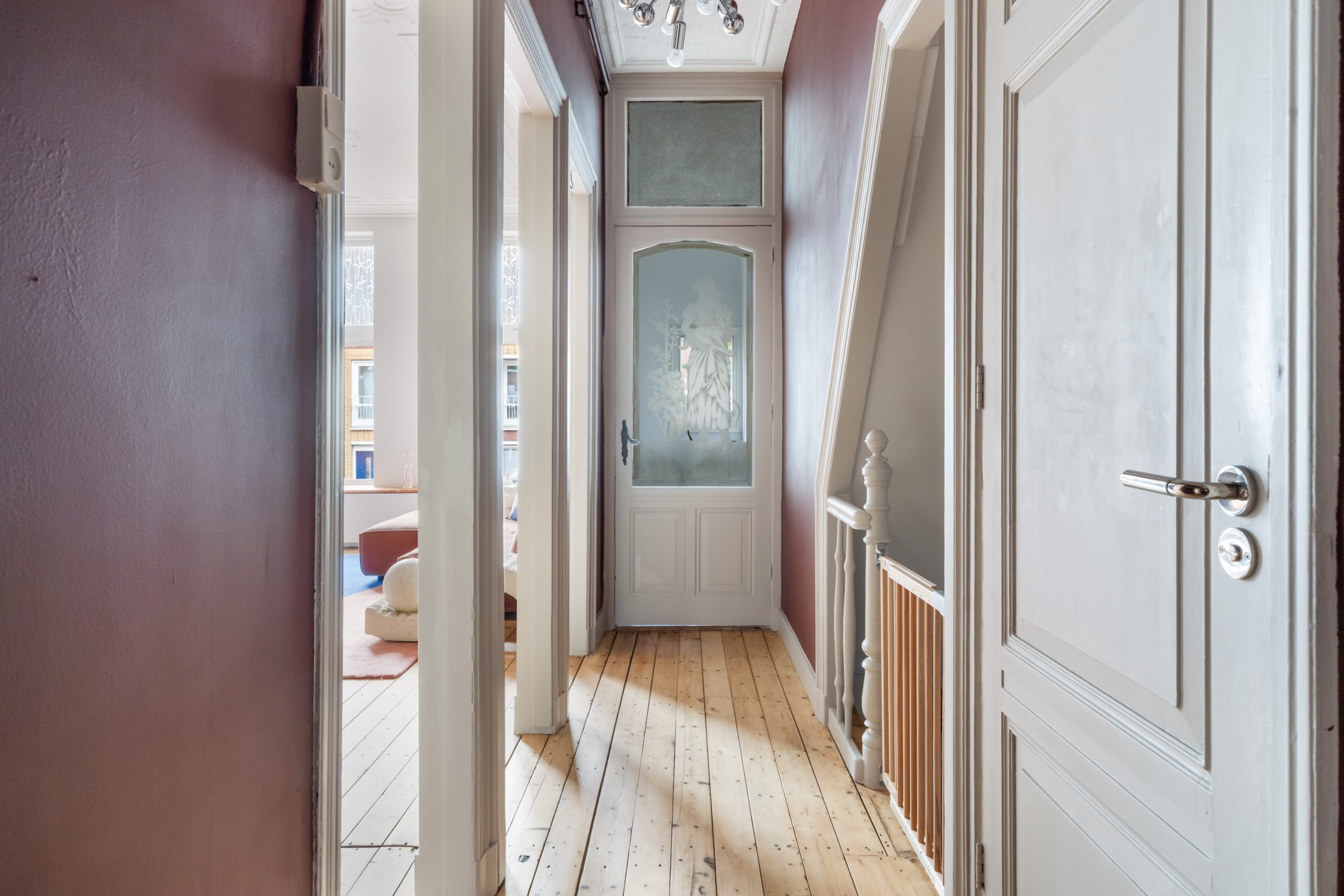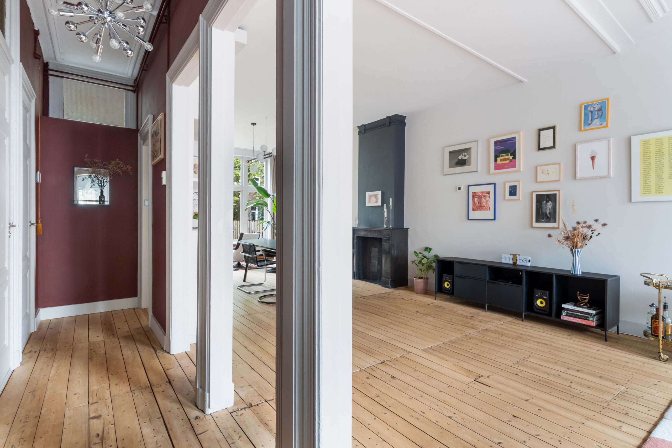 Karakteristieke overloop met een open verbinding naar de woonkamer, separaat toilet, vaste kast (CV-opstelling) en toegang tot alle vertrekken. De authentieke en brede woon-/eetkamer heeft een lengte van maar liefst 13 meter en een royale hoogte van meer dan 3 meter! De originele jaren ’10-details, zoals prachtige ornamenten, glas-in-loodramen en paneeldeuren, schouw, geven de woning een sfeervol karakter. Door de grote raampartijen aan beide zijde van de woning treedt ere veel natuurlijk licht de woning binnen wat zorgt voor een fijne, lichte sfeer. Het zitgedeelte is gelegen aan de voorzijde van de woning. Hier kan je een heerlijke zithoek creeren. Het eetgedeelte is gelegen aan de achterzijde. Via openslaande ramen bereik je het balkon, gelegen op het zuidwesten. Via het eetgedeelte bereik je via een organische doorgang de moderne keuken. De keuken berschikt over diverse soorten inbouwapparatuur zoals een 5-pits gasfornuis met afzuigkap, oven, vaatwasser en een quoocker.