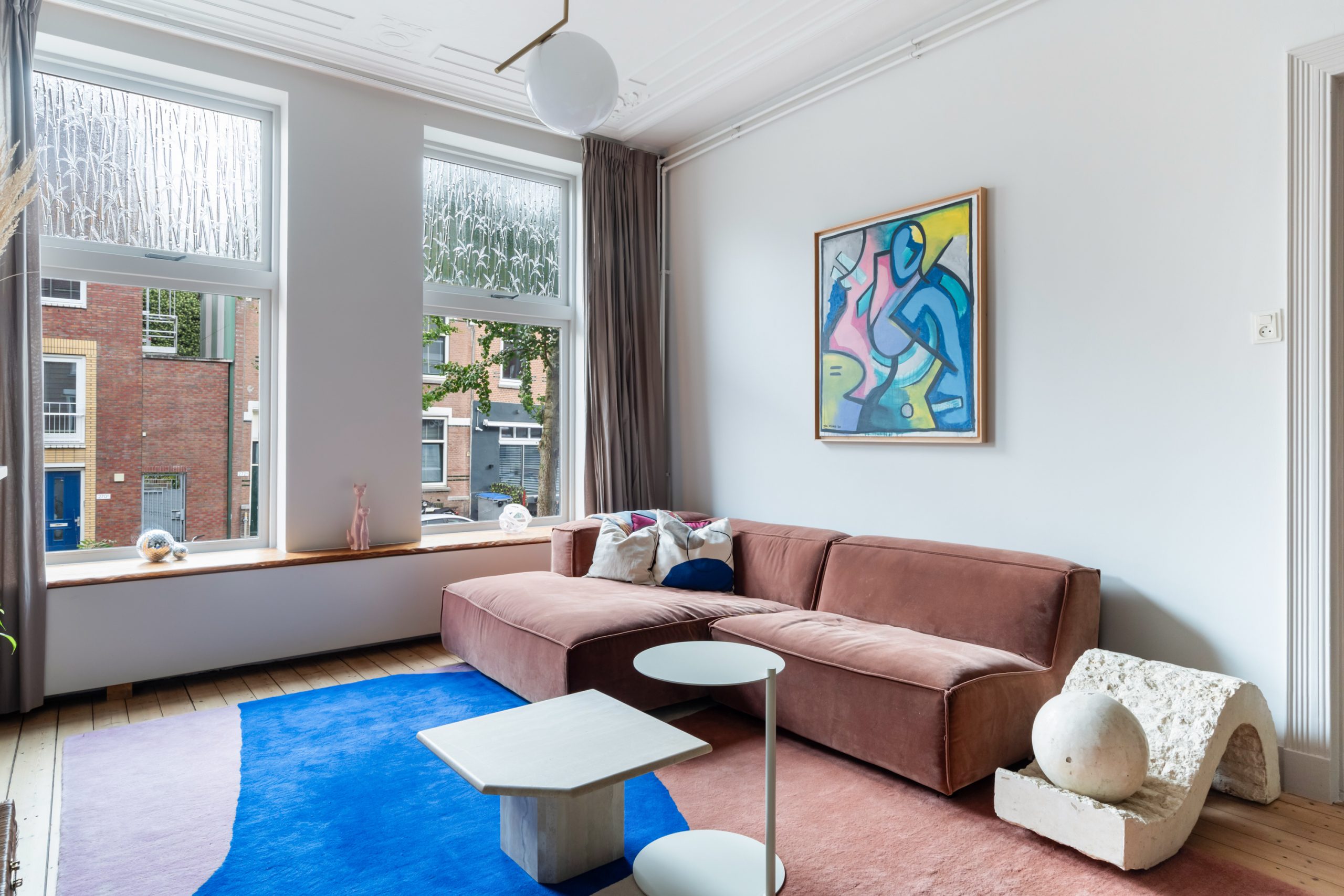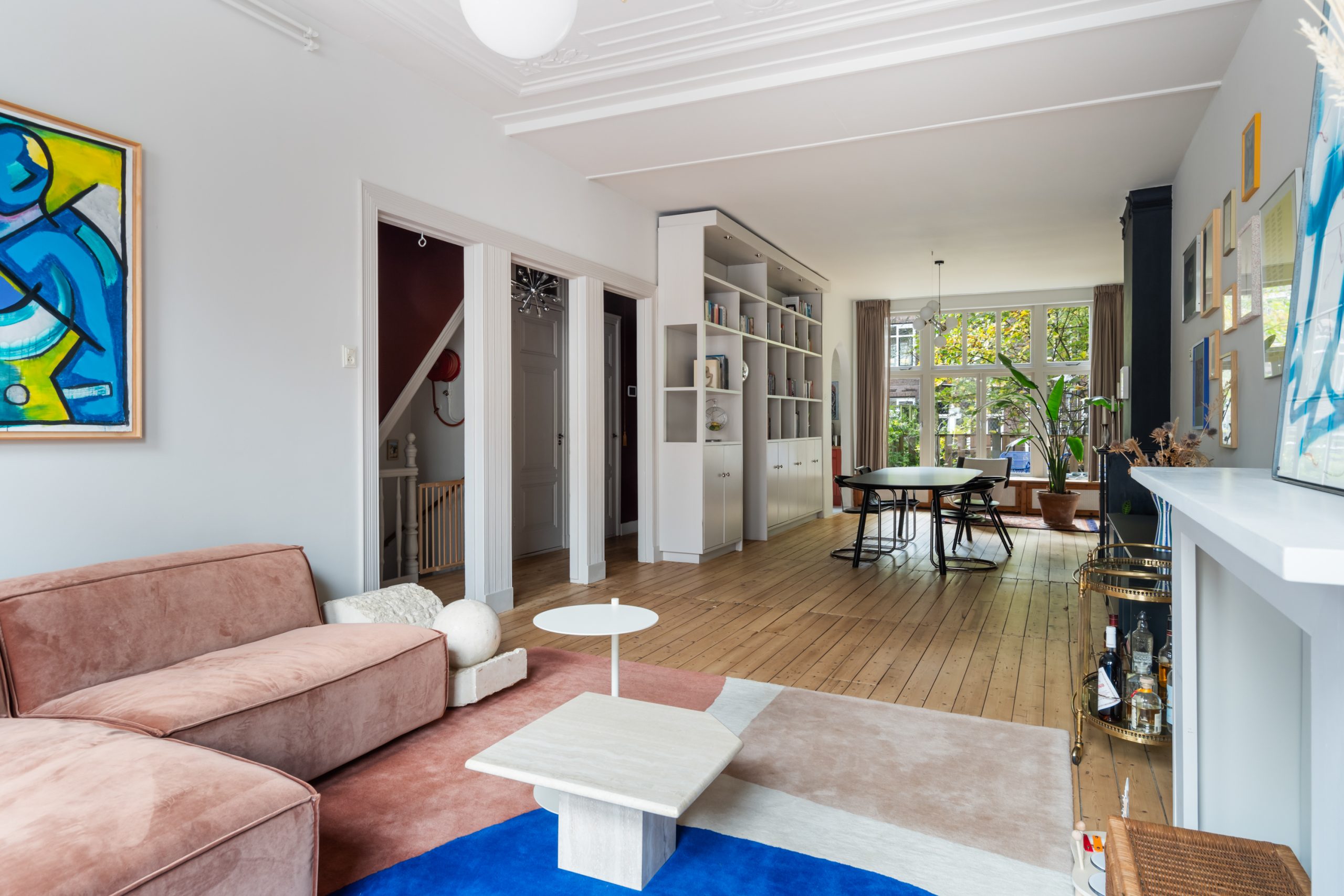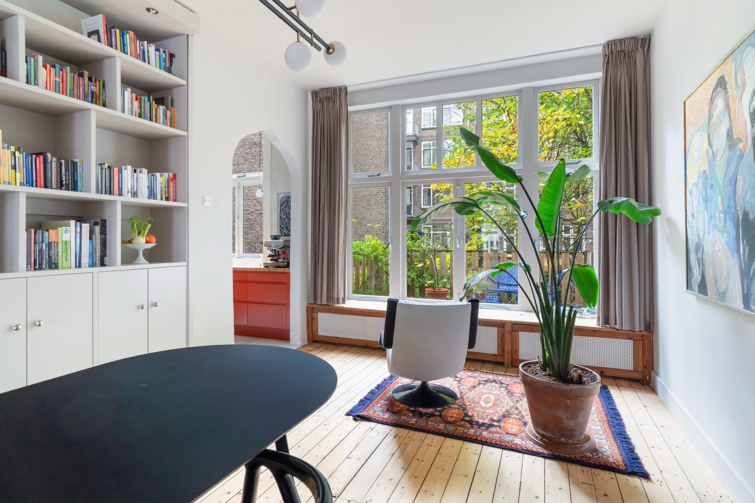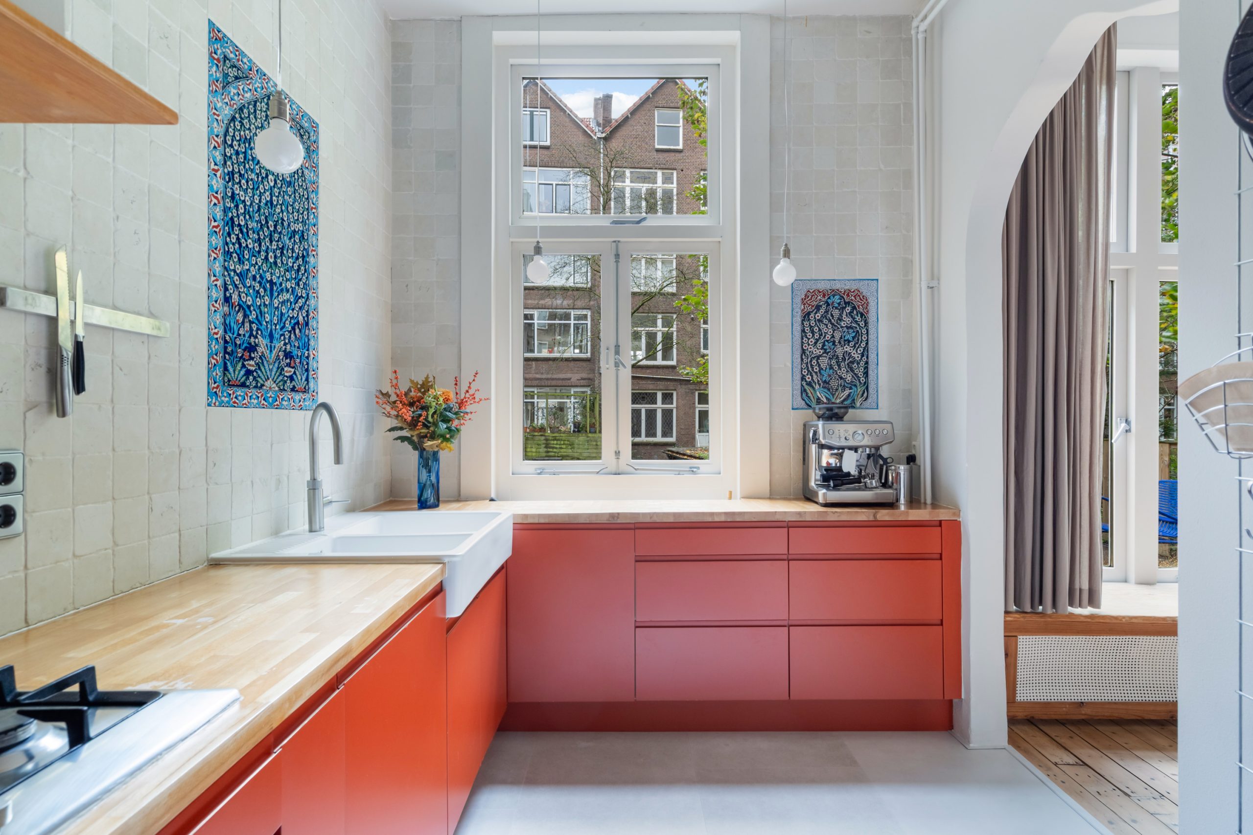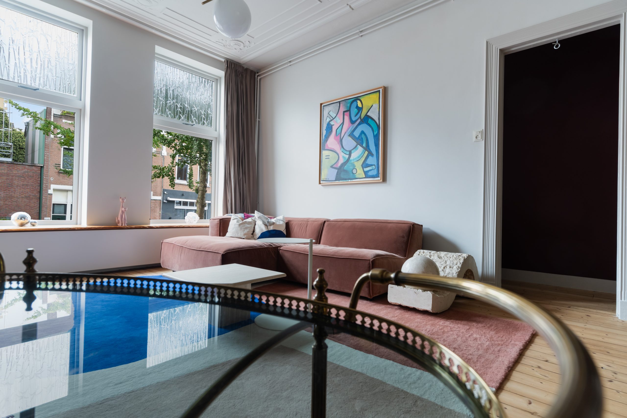 Karakteristieke overloop met een open verbinding naar de woonkamer, separaat toilet, vaste kast (CV-opstelling) en toegang tot alle vertrekken. De authentieke en brede woon-/eetkamer heeft een lengte van maar liefst 13 meter en een royale hoogte van meer dan 3 meter! De originele jaren ’10-details, zoals prachtige ornamenten, glas-in-loodramen en paneeldeuren, schouw, geven de woning een sfeervol karakter. Door de grote raampartijen aan beide zijde van de woning treedt ere veel natuurlijk licht de woning binnen wat zorgt voor een fijne, lichte sfeer. Het zitgedeelte is gelegen aan de voorzijde van de woning. Hier kan je een heerlijke zithoek creeren. Het eetgedeelte is gelegen aan de achterzijde. Via openslaande ramen bereik je het balkon, gelegen op het zuidwesten. Via het eetgedeelte bereik je via een organische doorgang de moderne keuken. De keuken berschikt over diverse soorten inbouwapparatuur zoals een 5-pits gasfornuis met afzuigkap, oven, vaatwasser en een quoocker.