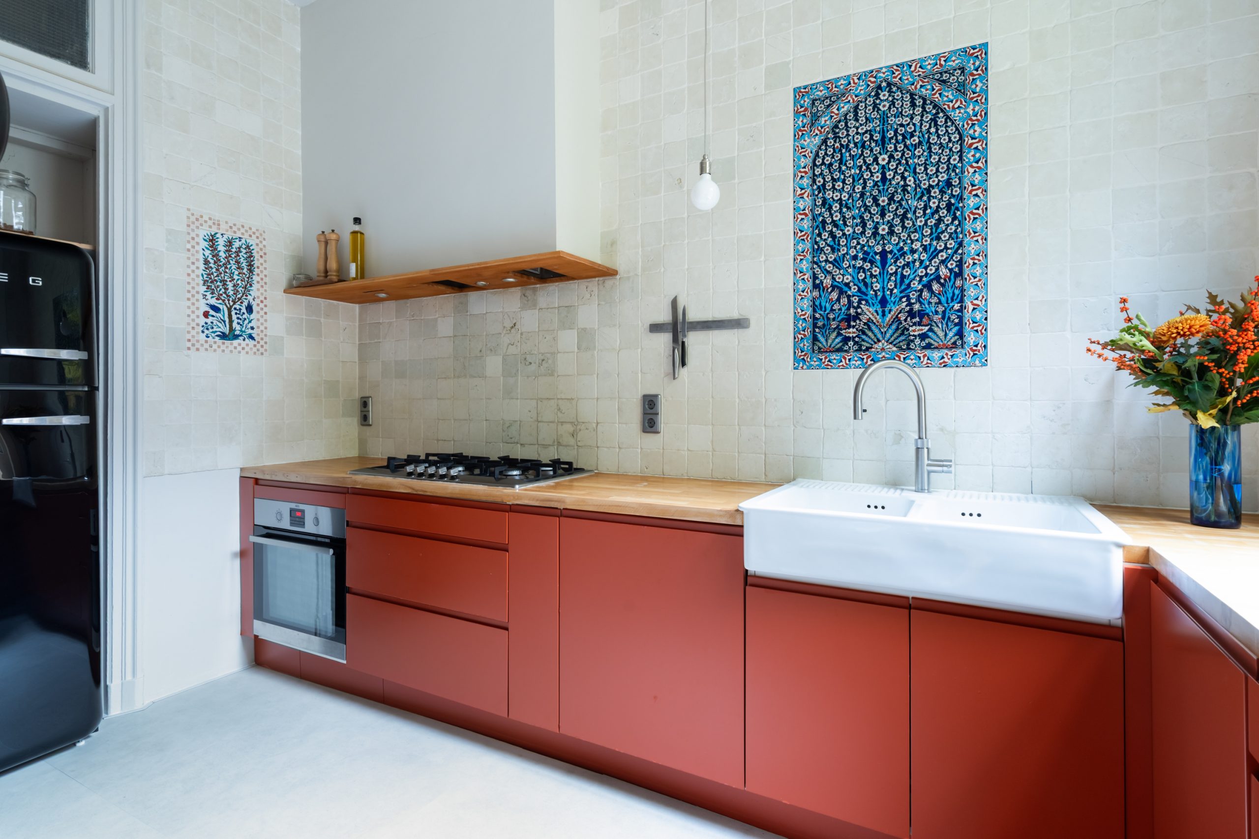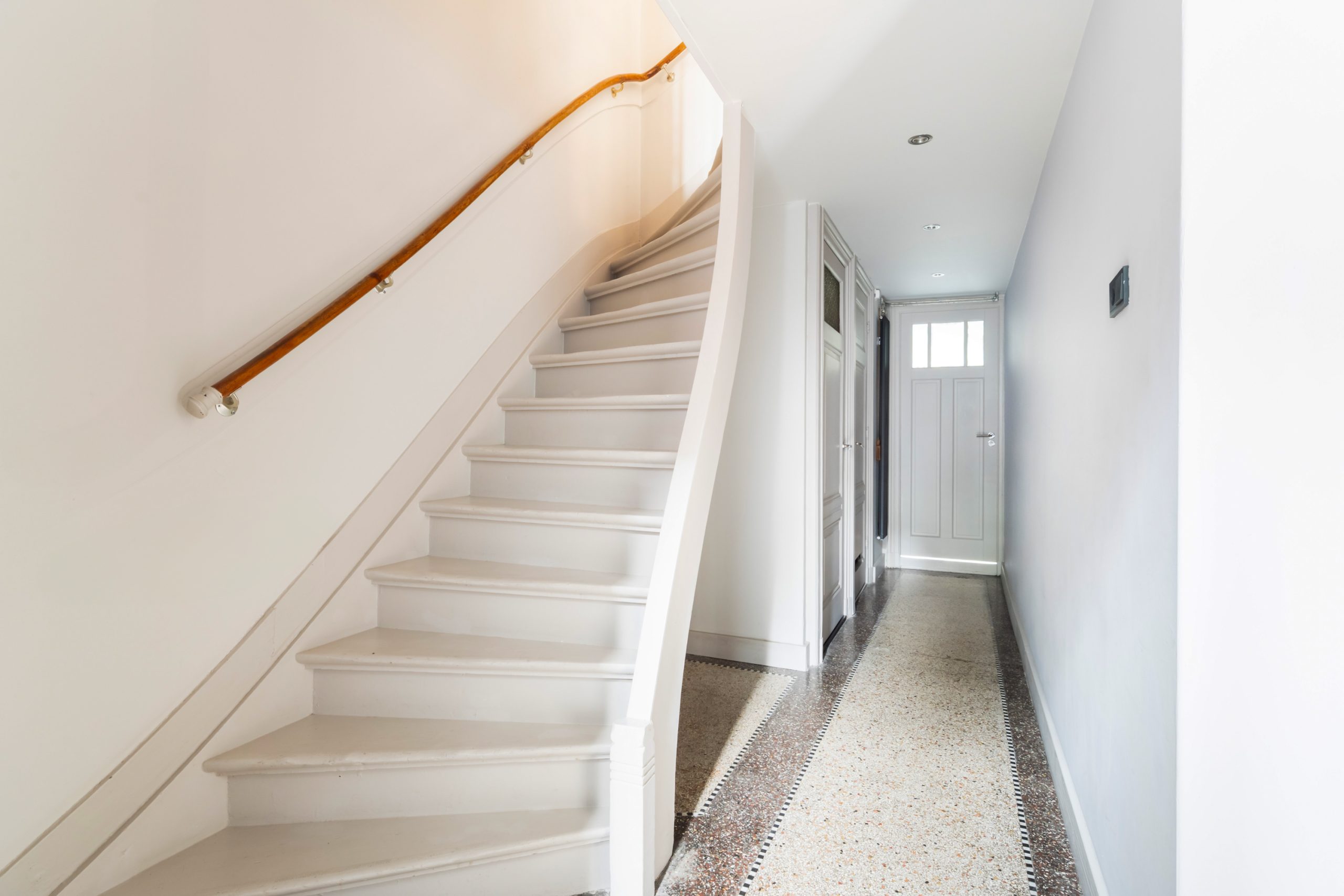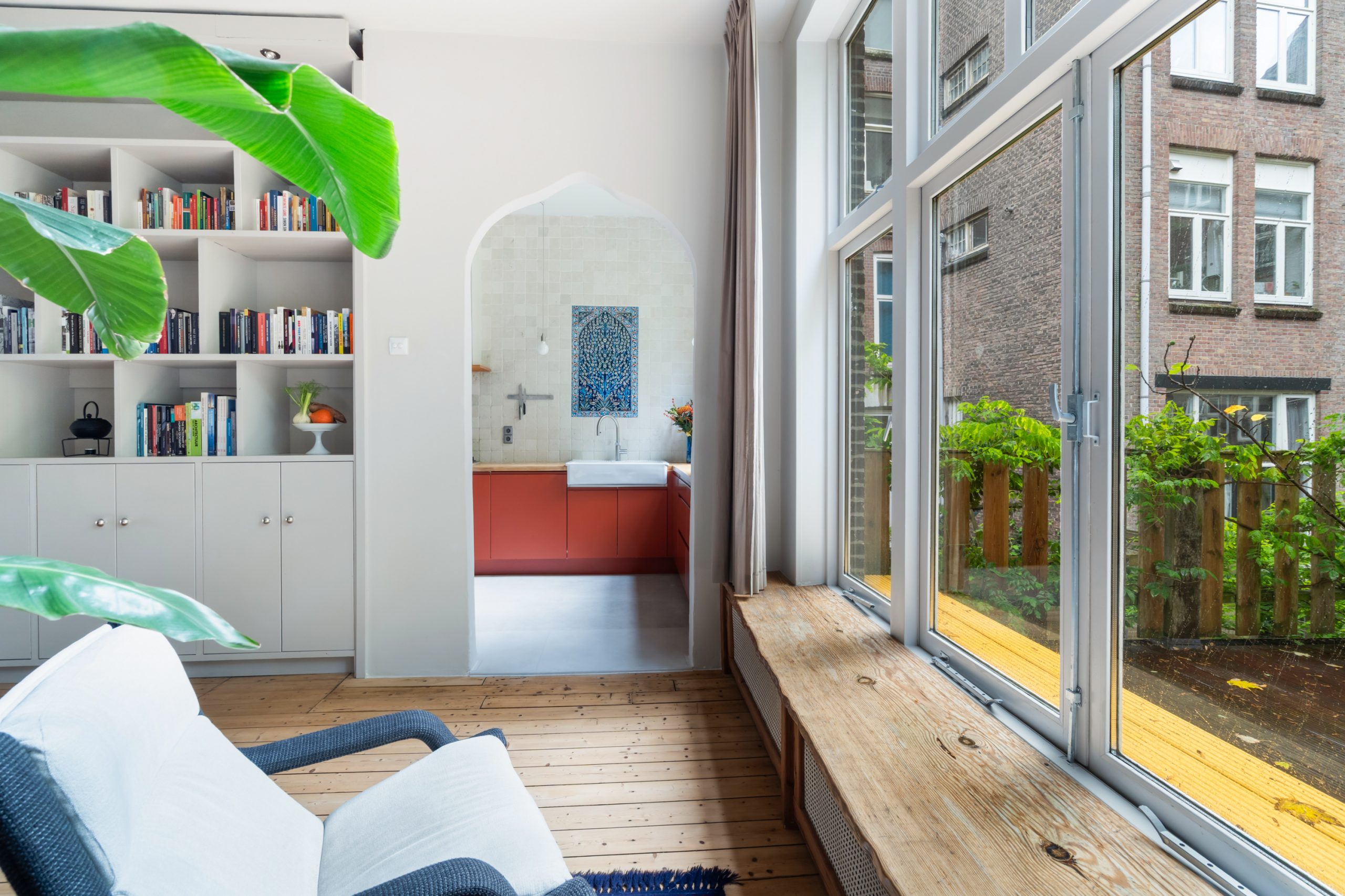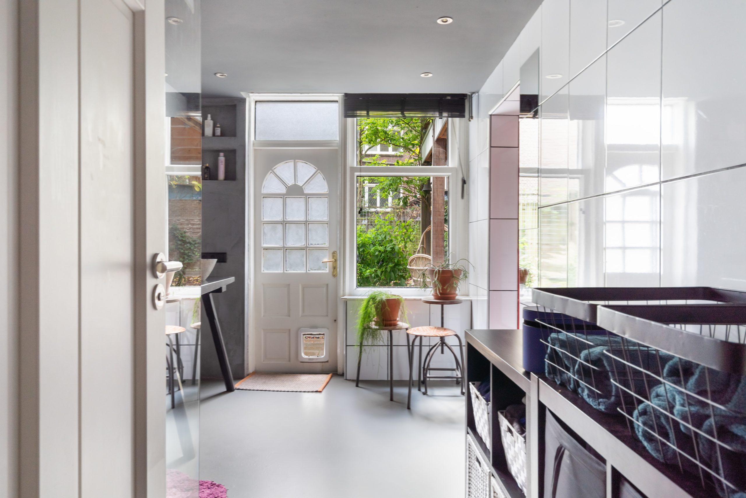 Karakteristieke overloop met een open verbinding naar de woonkamer, separaat toilet, vaste kast (CV-opstelling) en toegang tot alle vertrekken. De authentieke en brede woon-/eetkamer heeft een lengte van maar liefst 13 meter en een royale hoogte van meer dan 3 meter! De originele jaren ’10-details, zoals prachtige ornamenten, glas-in-loodramen en paneeldeuren, schouw, geven de woning een sfeervol karakter. Door de grote raampartijen aan beide zijde van de woning treedt ere veel natuurlijk licht de woning binnen wat zorgt voor een fijne, lichte sfeer. Het zitgedeelte is gelegen aan de voorzijde van de woning. Hier kan je een heerlijke zithoek creeren. Het eetgedeelte is gelegen aan de achterzijde. Via openslaande ramen bereik je het balkon, gelegen op het zuidwesten. Via het eetgedeelte bereik je via een organische doorgang de moderne keuken. De keuken berschikt over diverse soorten inbouwapparatuur zoals een 5-pits gasfornuis met afzuigkap, oven, vaatwasser en een quoocker.