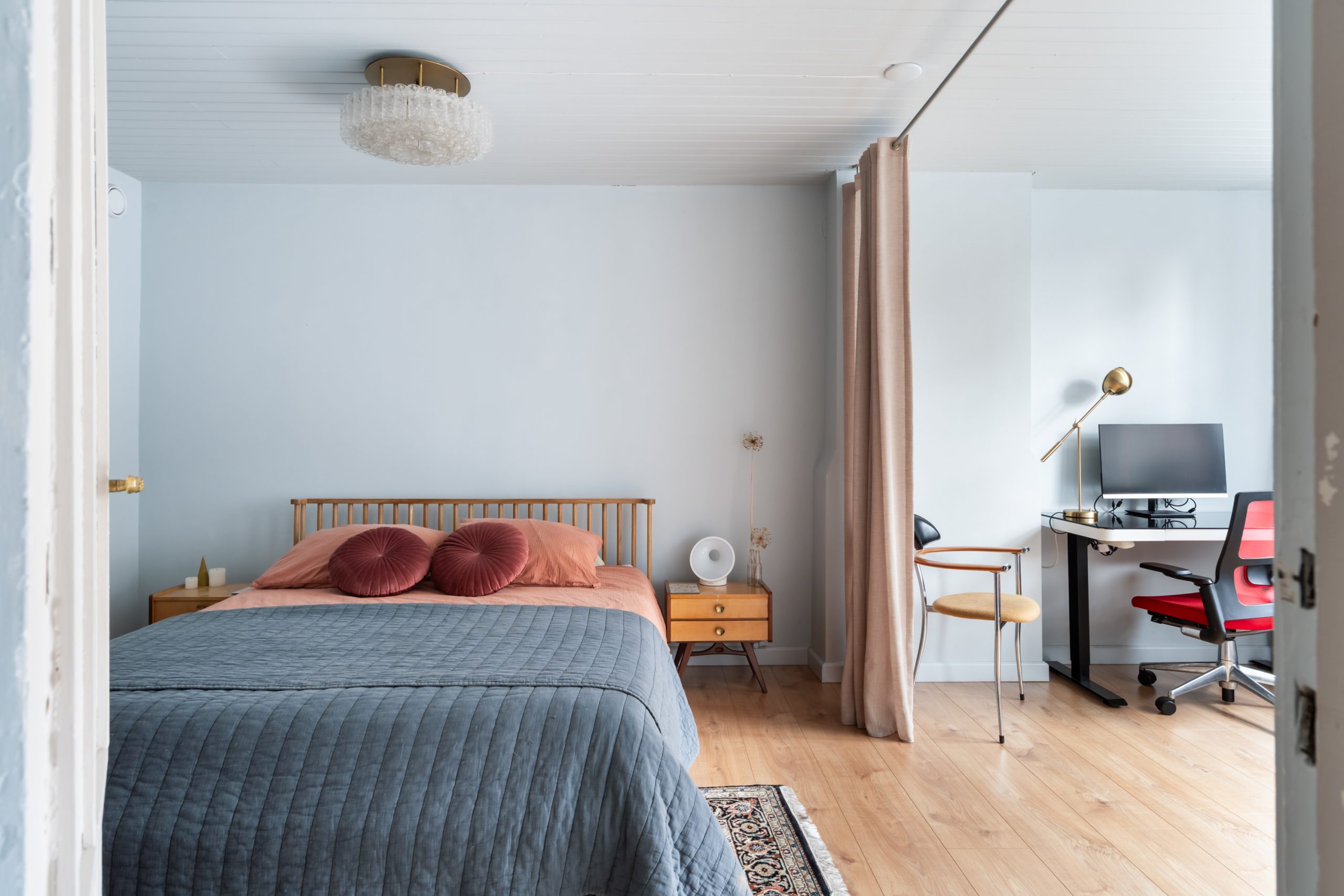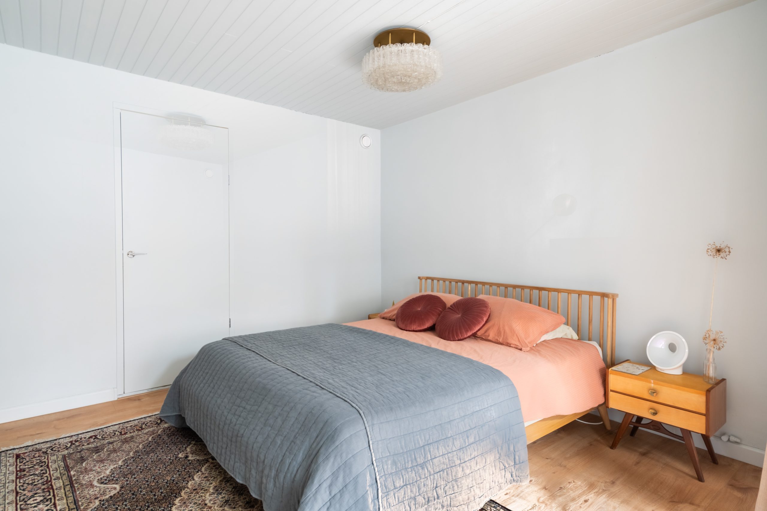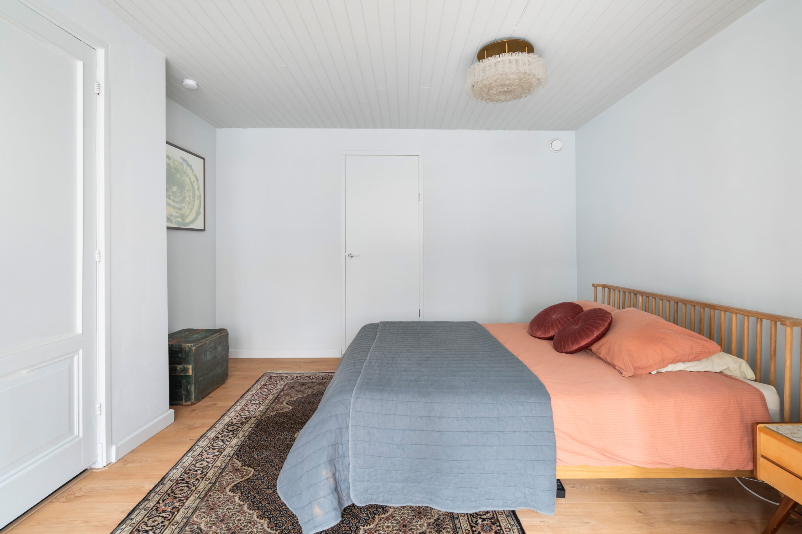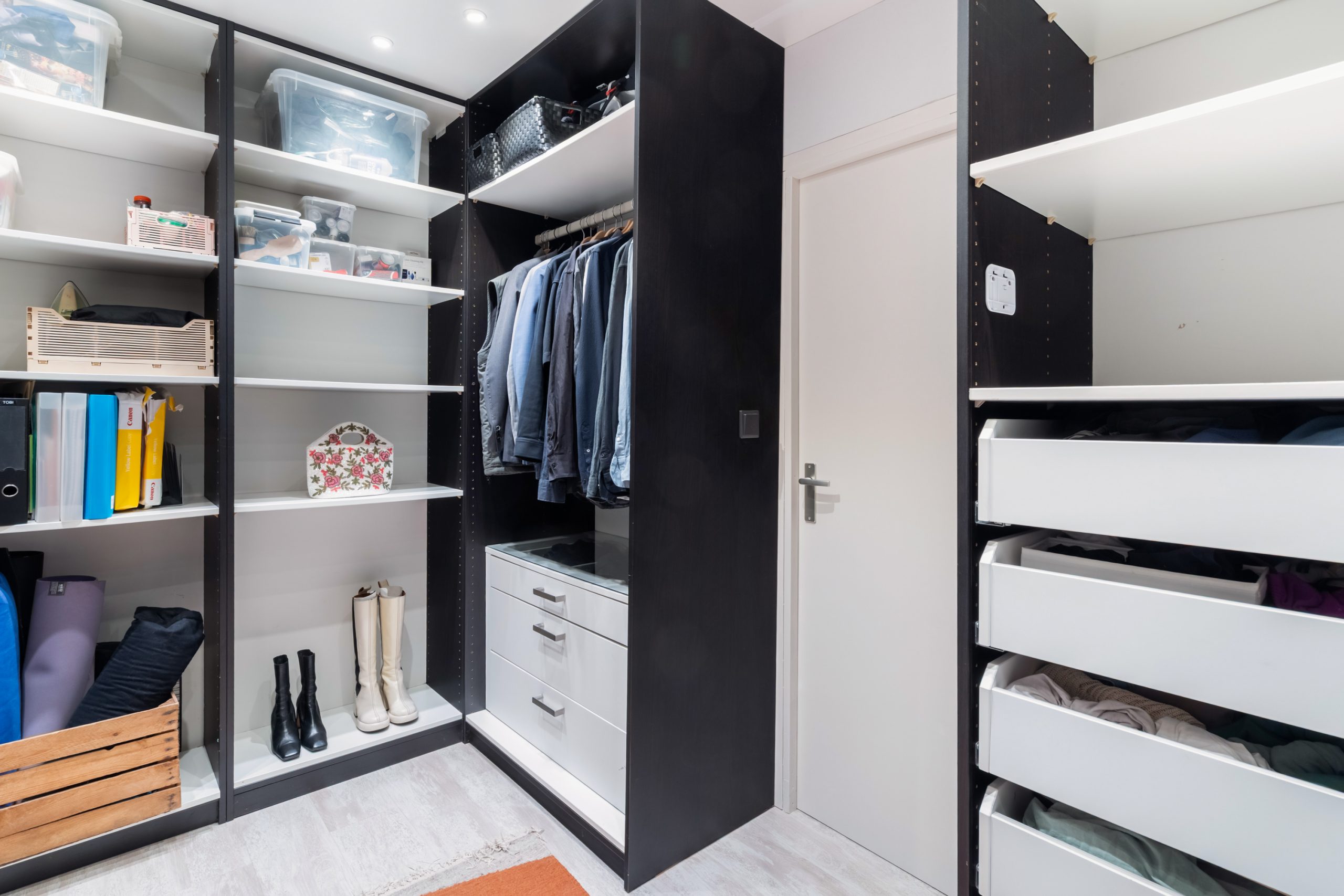 De master bedroom is gelegen aan de voorzijde van de woning. Dit is een erg ruime en lichte kamer. Door de royale grootte van de master bedroom is hier meer dan voldoende ruimte voor een home-office. Aan de achterzijde van de woning bevindt zich de 2e slaapkamer die multifunctioneel kan worden ingericht als kinder-, werk- of slaapkamer. Tussen de slaapkamers in ligt een stijlvolle en praktisch ingedeelde inloopkast. Via de hal en de 2e slaapkamer bereik je de moderne volledig gestucte badkamer. Deze beschikt over een mooie (regenval)inloopdouche en een dubbele wastafel. Middels een deur in de badkamer en openslaande deuren in de 2e slaapkamer bereik je de achtertuin van 86 m2, gelegen op het zuidwesten. Hier kan je heerlijk genieten van de middag-/avondzon. Mede door het balkon erboven is hier een prettige overkapping gecreëerd, waardoor je ook bij minder weer heerlijk beschut buiten kunt zitten. Via een trap gelegen in de tuin, bereik je de berging. Erg handig voor wat extra opbergruimte.