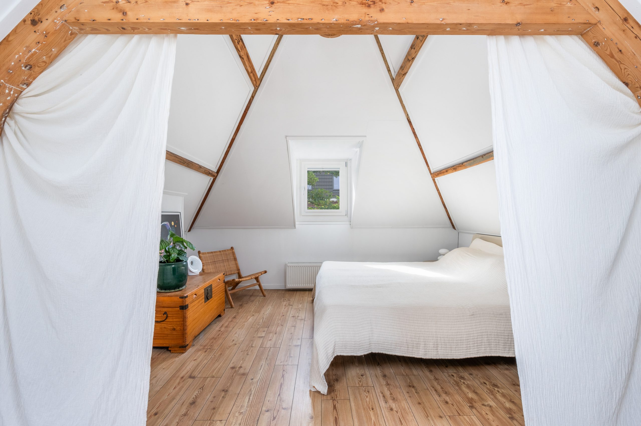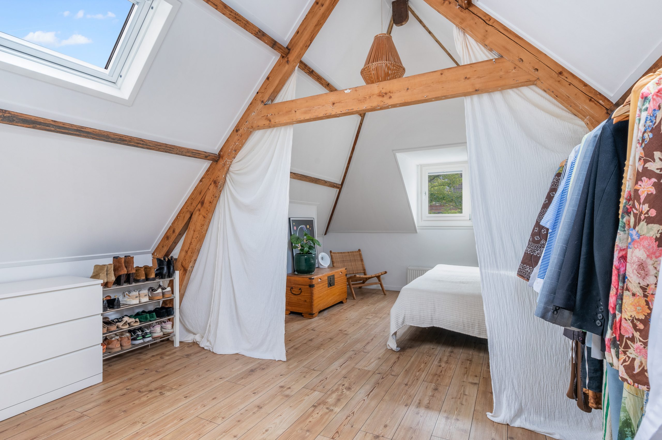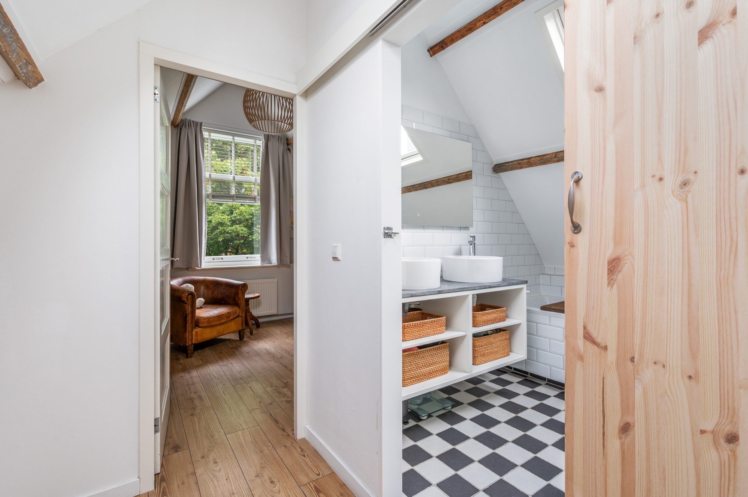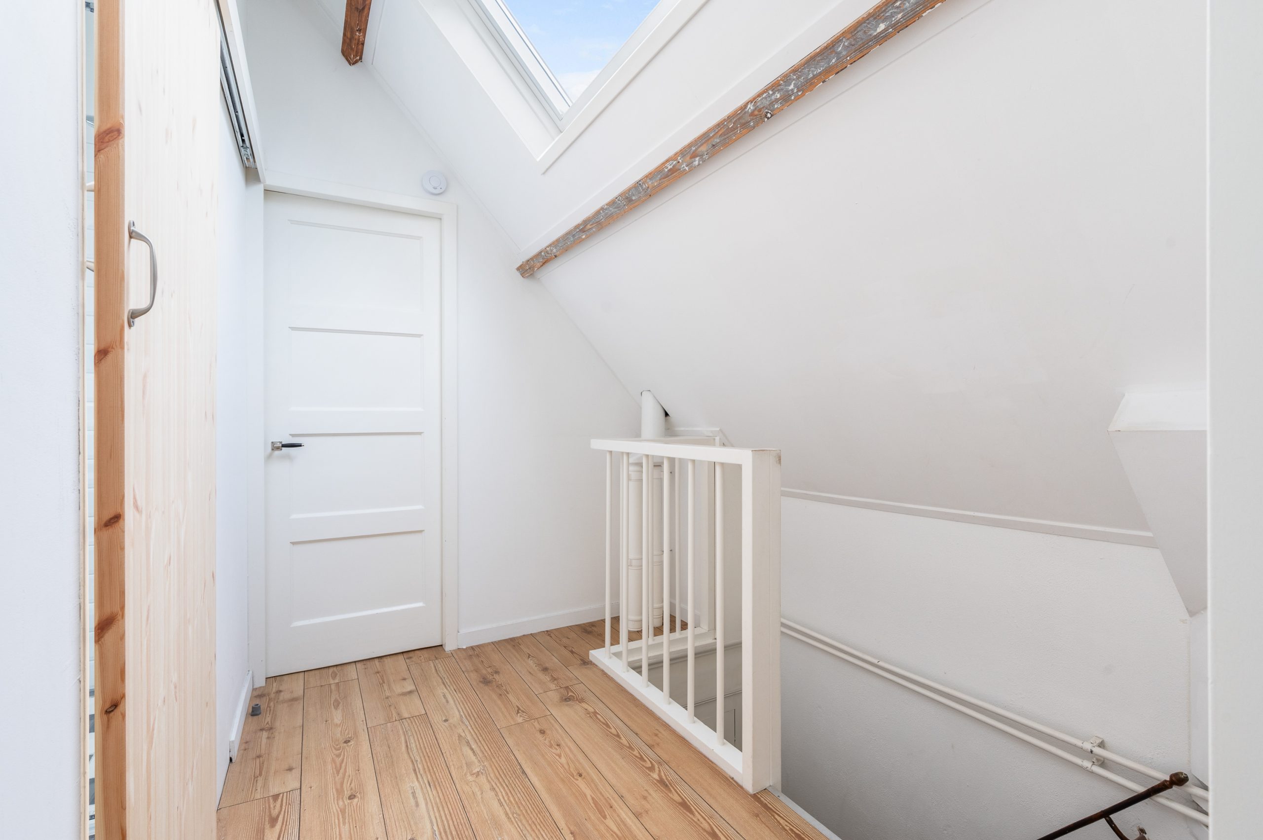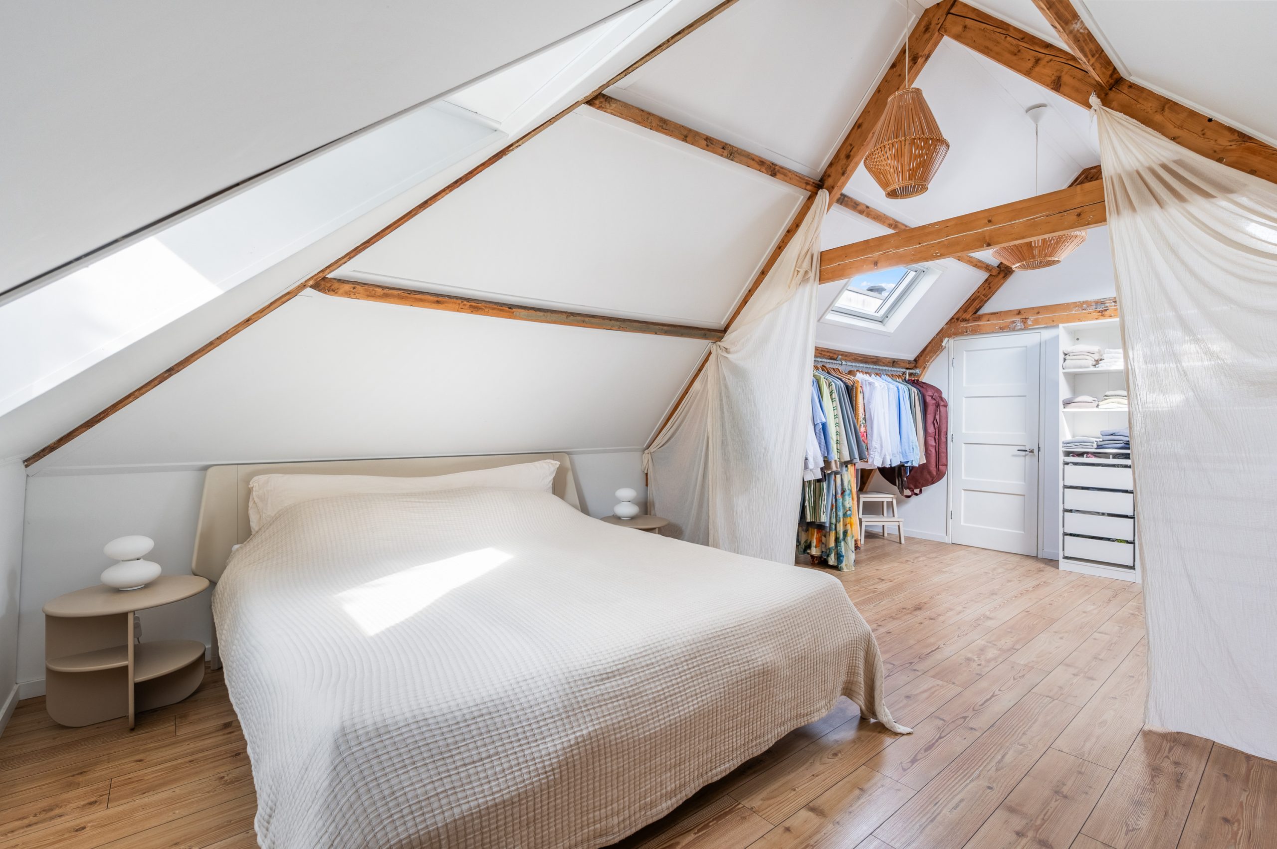 Ruime overloop met dakraam en toegang tot de 2 slaapkamers en badkamer. De royale master bedroom is gelegen aan de voorzijde van de woning en is ontzettend ruim. Mede door de nokhoogte van ruim 3 meter hoog, de balkenstructuur en de dakramen die zorgen voor extra daglicht is dit echt een waanzinnige ruimte. Aan de achterzijde bevindt zich de 2e slaapkamer, tevens goed van formaat. Temidden van de slaapkamers ligt de badkamer welke beschikt over een ligbad, aparte douche, dubbele wastafel en toilet.
