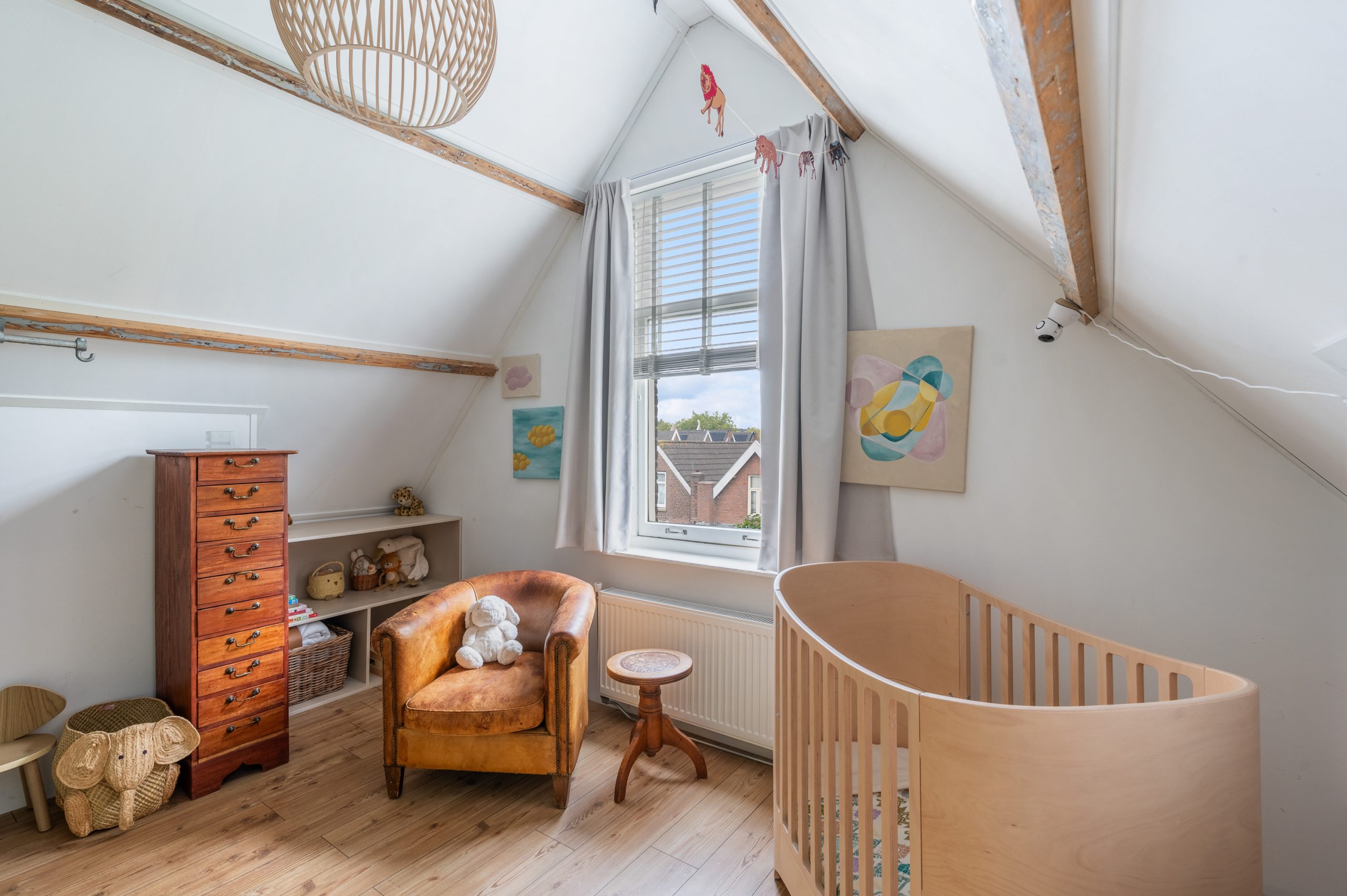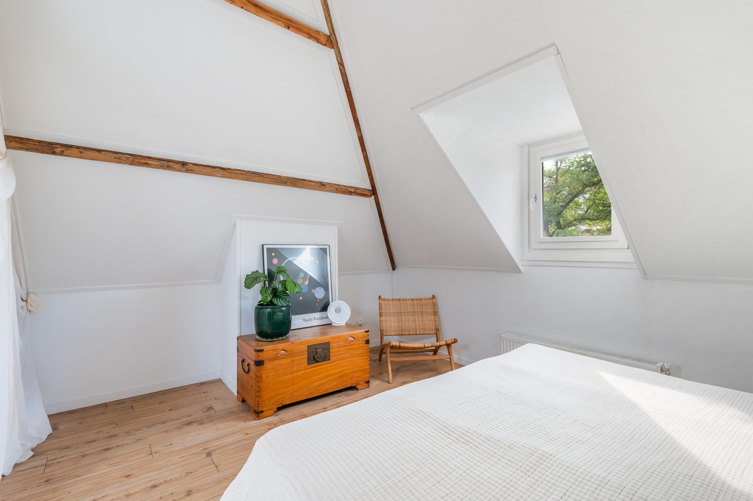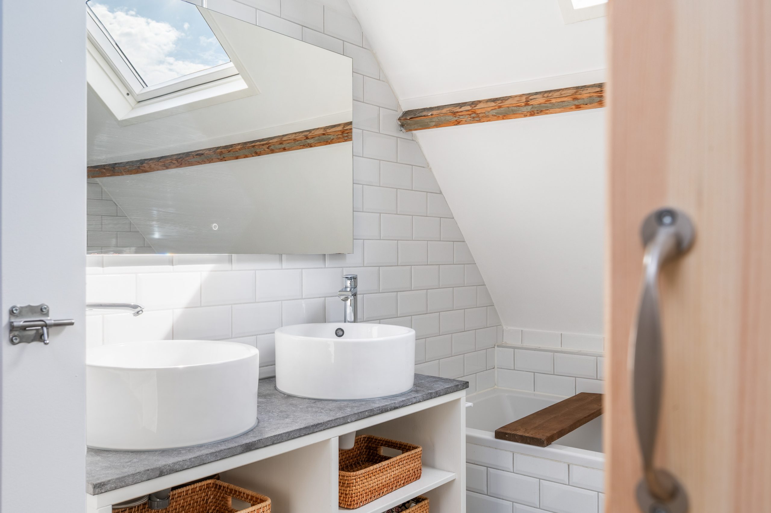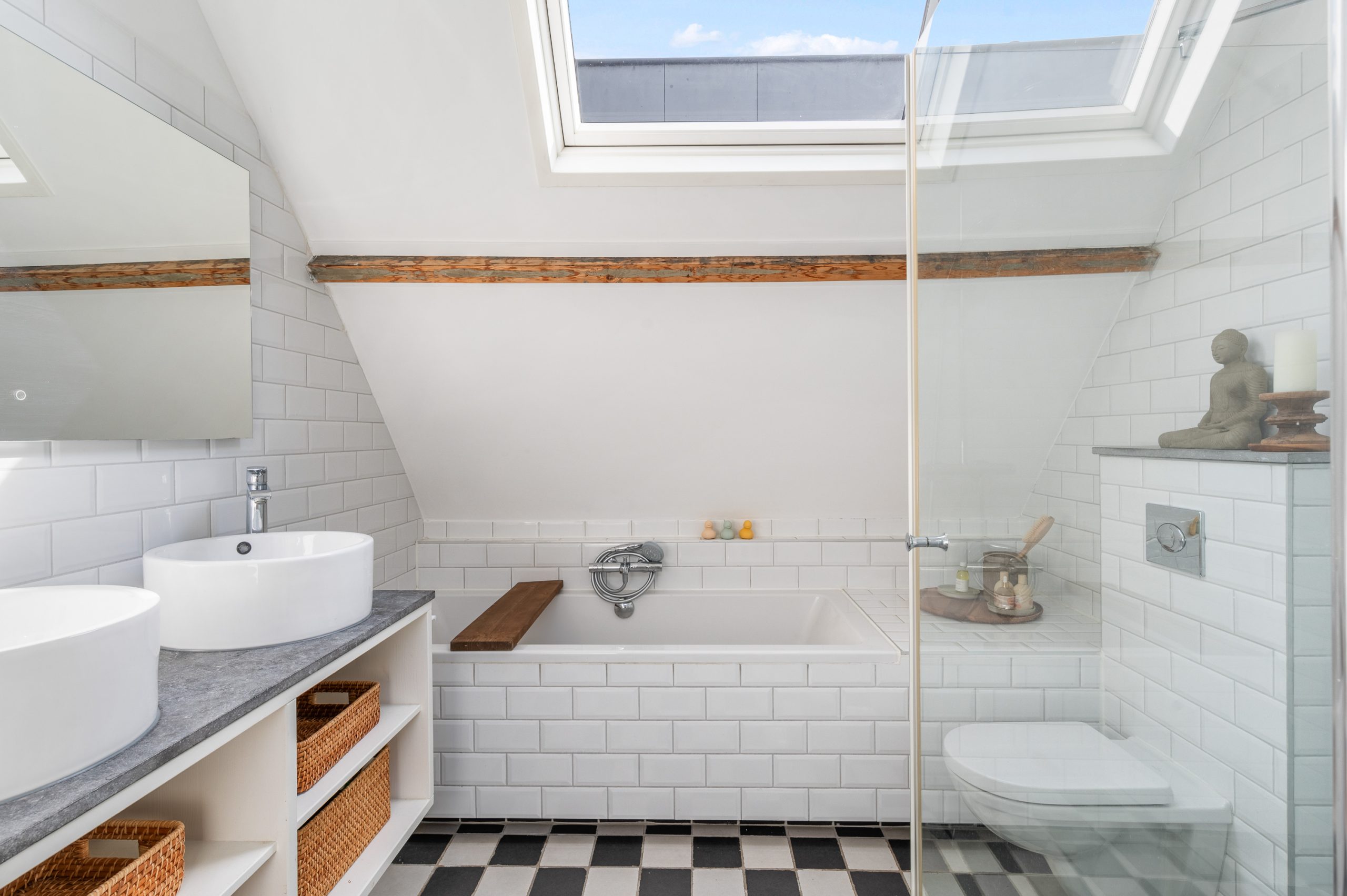 Ruime overloop met dakraam en toegang tot de 2 slaapkamers en badkamer. De royale master bedroom is gelegen aan de voorzijde van de woning en is ontzettend ruim. Mede door de nokhoogte van ruim 3 meter hoog, de balkenstructuur en de dakramen die zorgen voor extra daglicht is dit echt een waanzinnige ruimte. Aan de achterzijde bevindt zich de 2e slaapkamer, tevens goed van formaat. Temidden van de slaapkamers ligt de badkamer welke beschikt over een ligbad, aparte douche, dubbele wastafel en toilet.