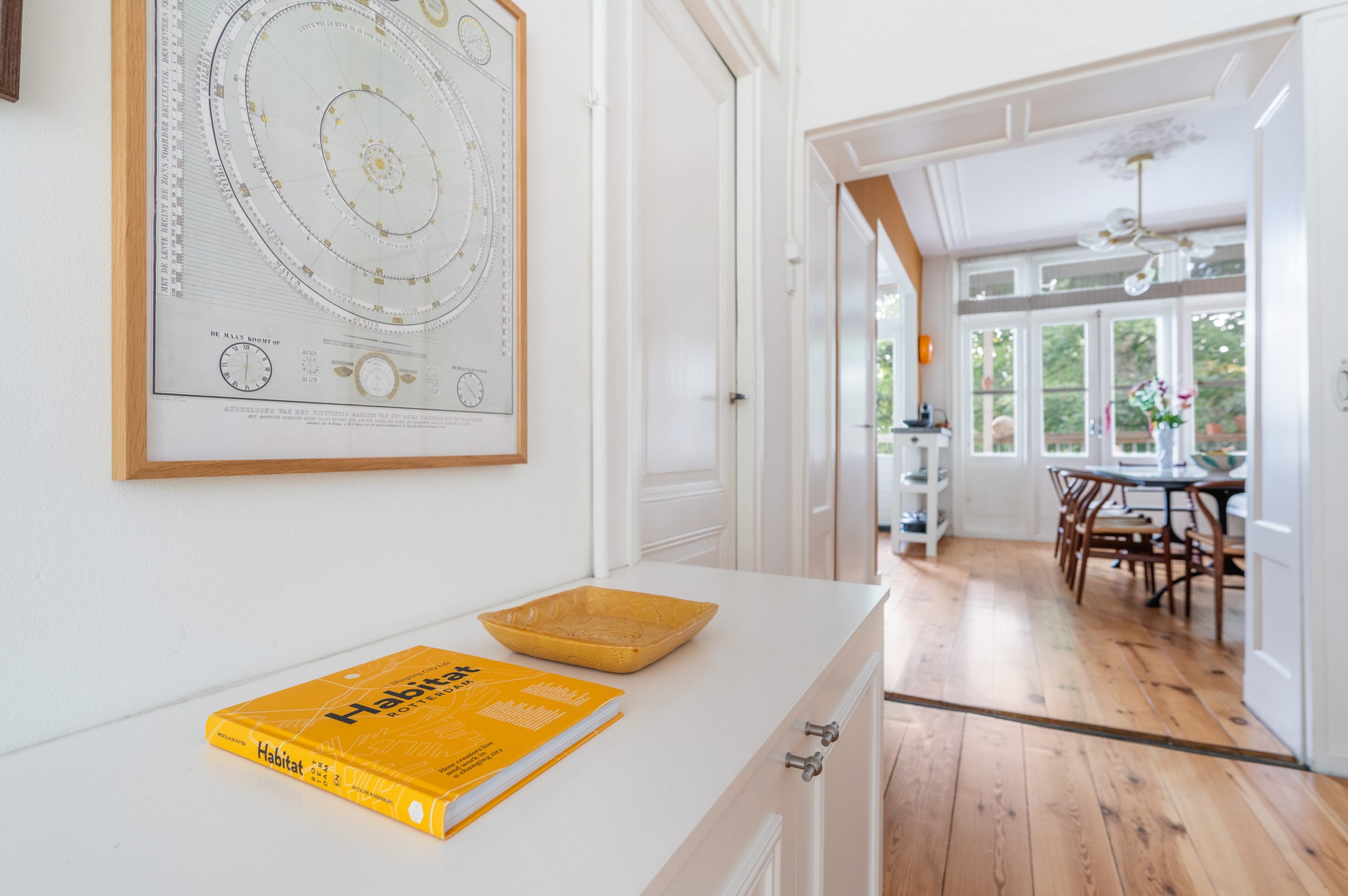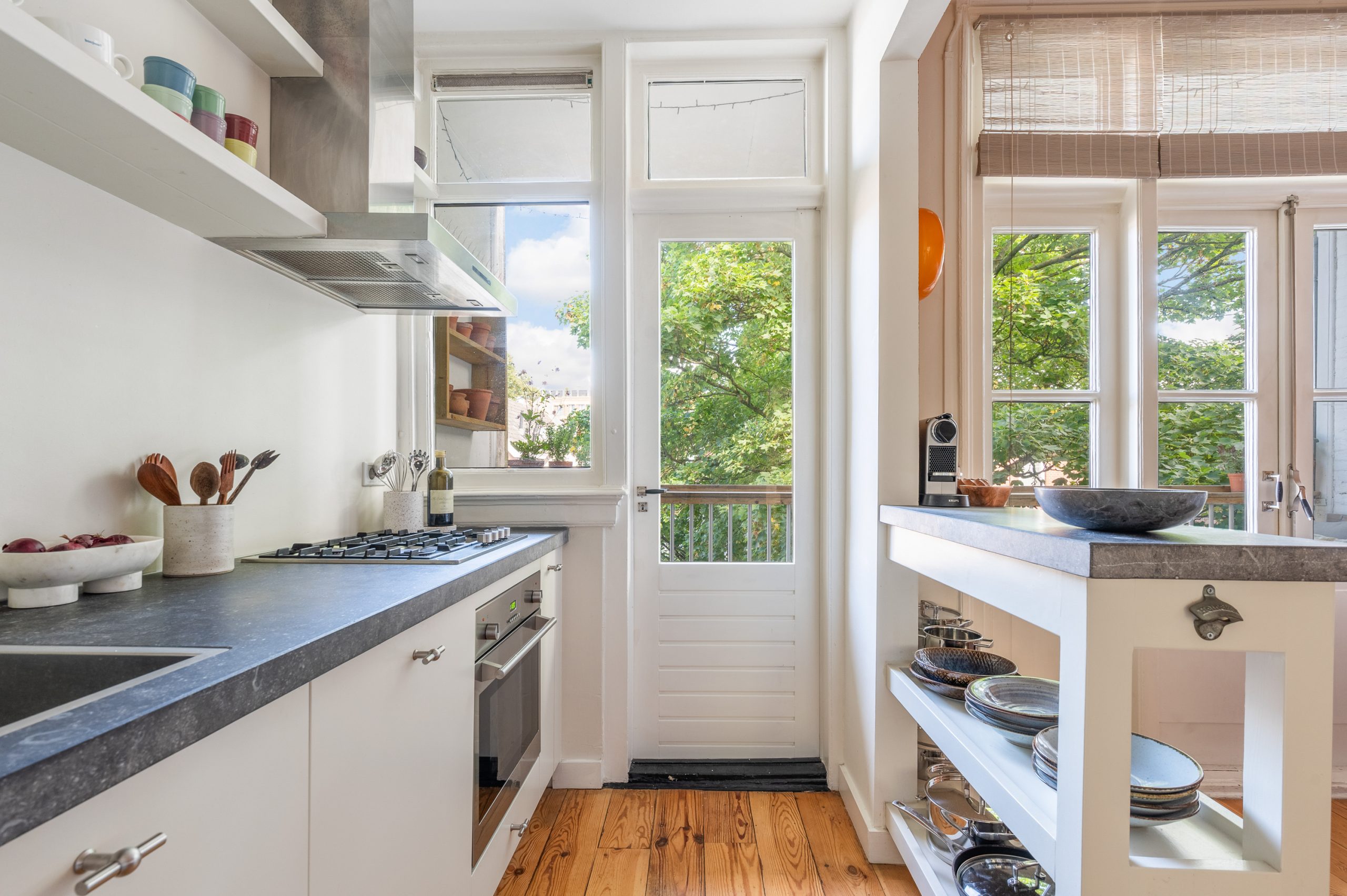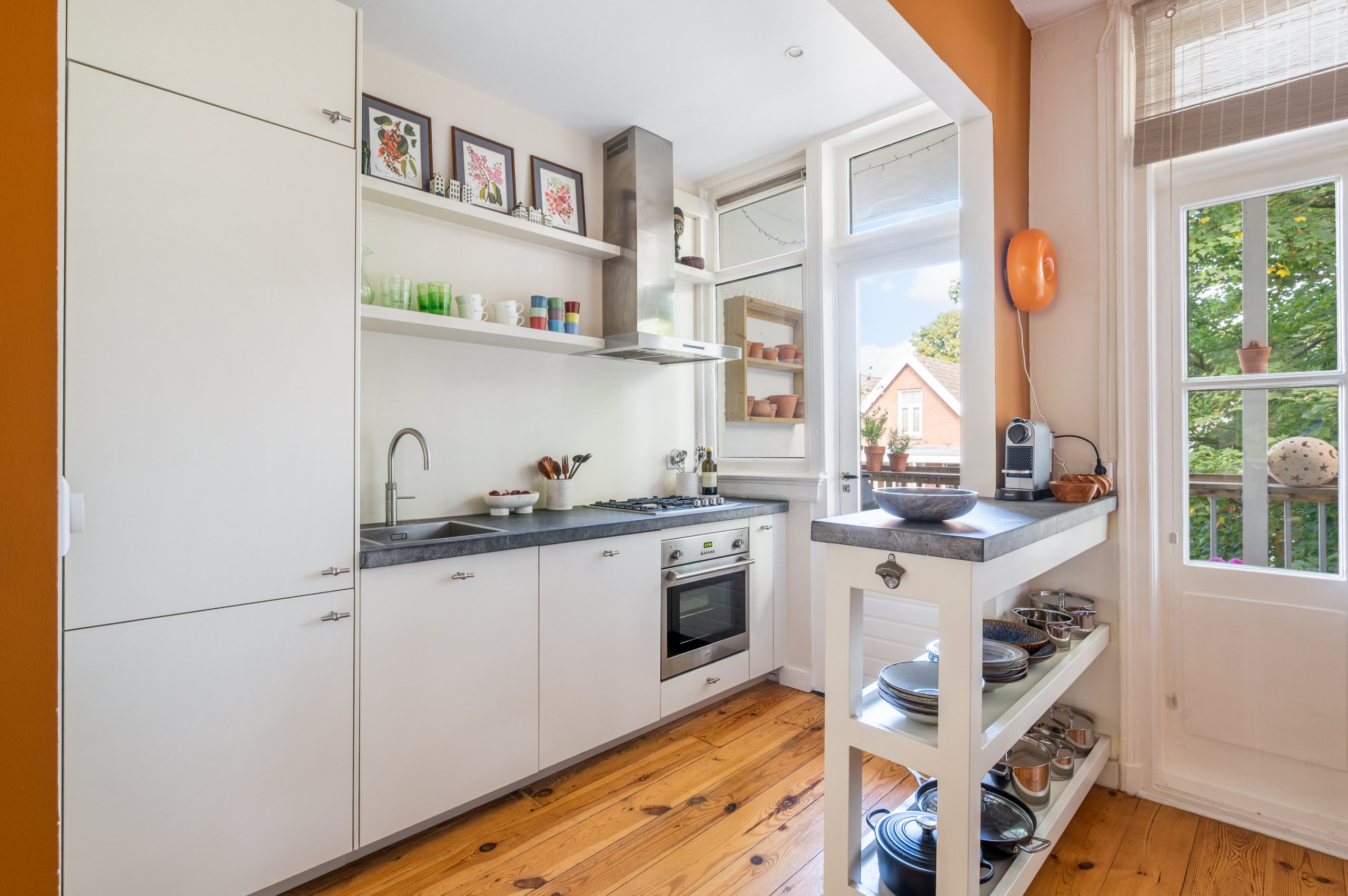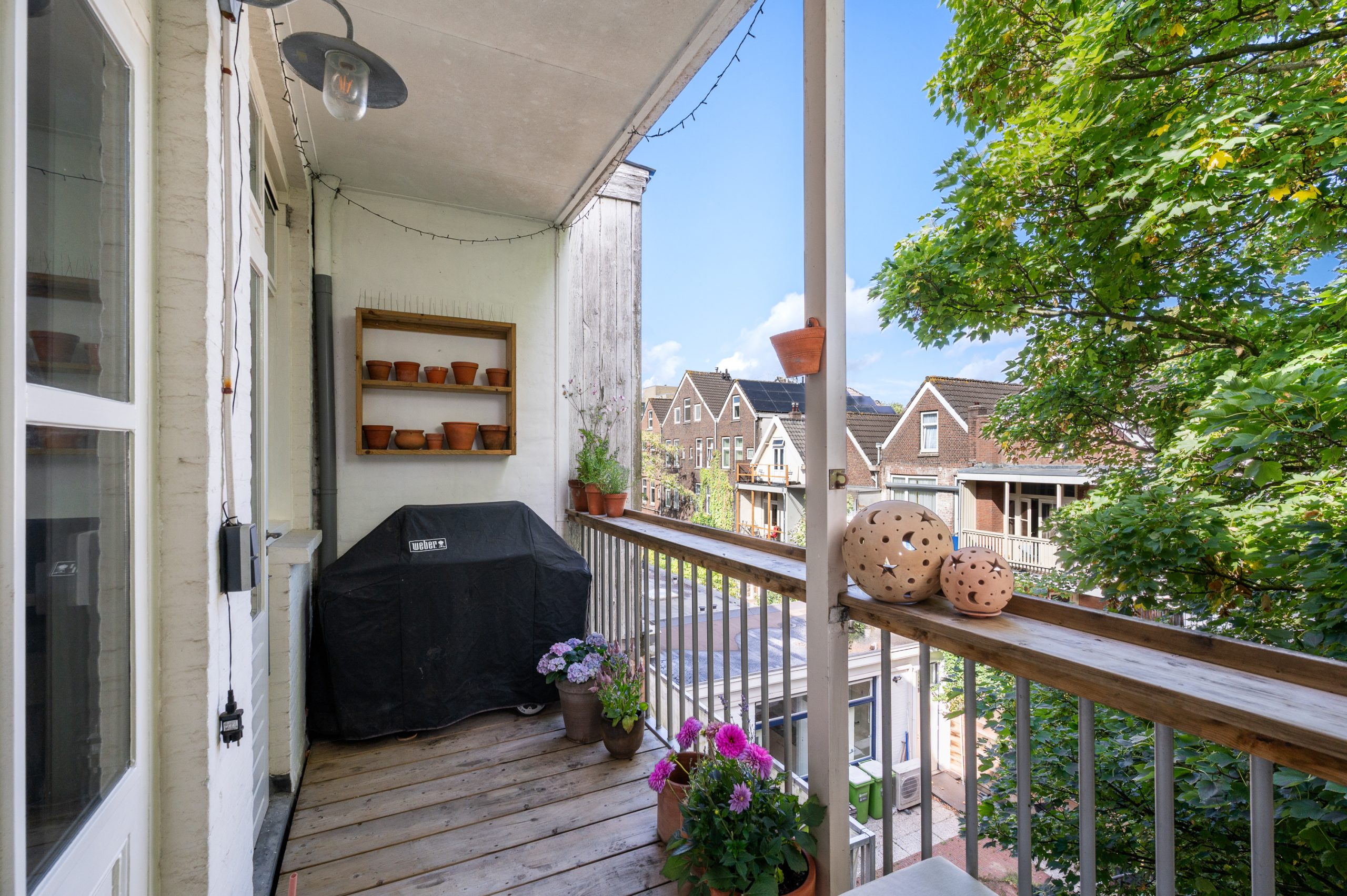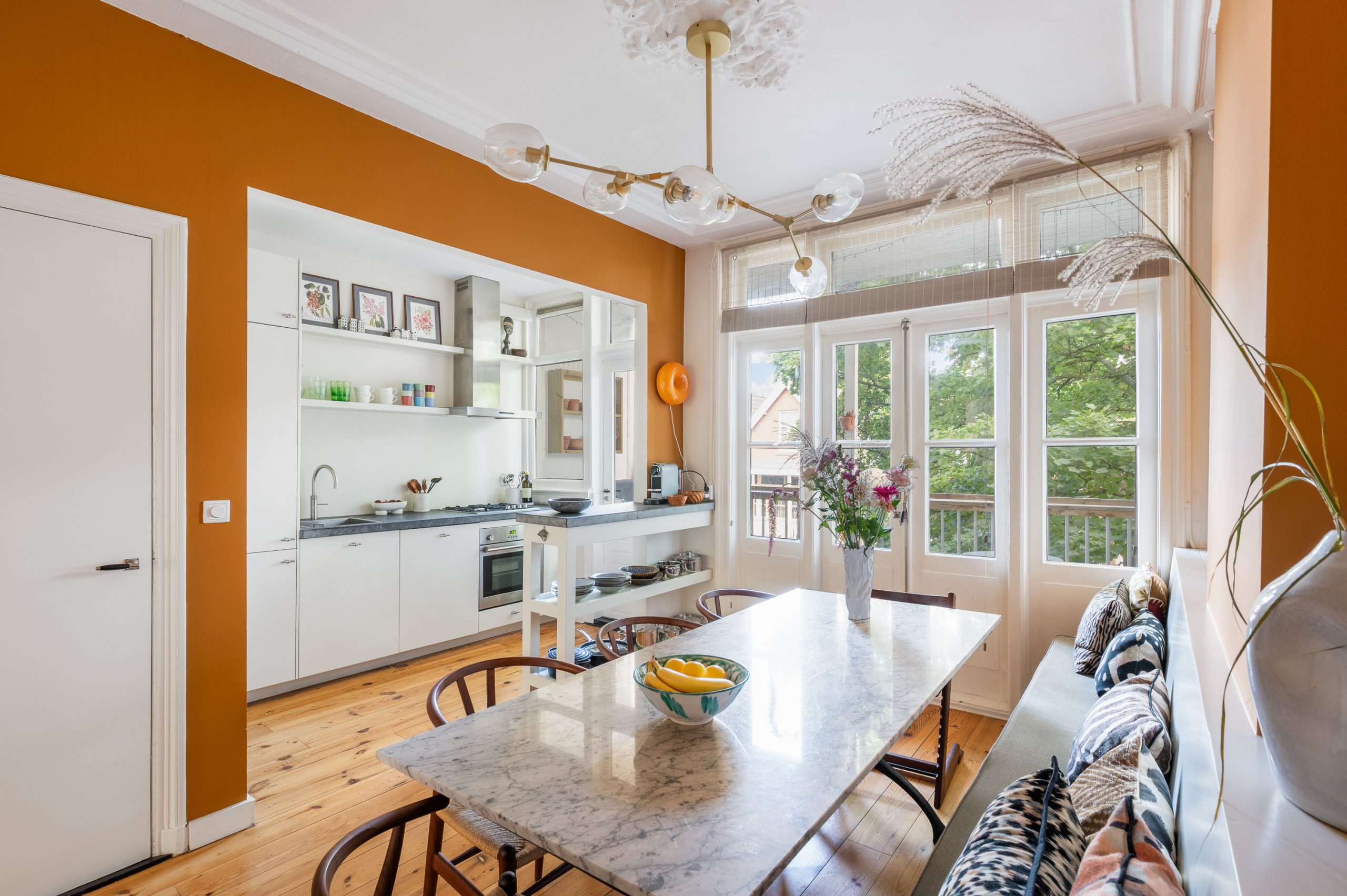 Hal/entree met berging, toilet en kast met CV-opstelling en toegang tot alle vertrekken op deze verdieping. De L-vormige woonkamer (met meterkast) is gelegen aan de voorzijde en beschikt over een prachtige lichtinval door de hoge raampartijen. Direct word je overspoeld door talloze authentieke details zoals de fantastische ornamenten, de originele schouwen en paneeldeuren. Hierdoor is de ruimte zeer sfeervol te noemen. Het eetgedeelte is gemakkelijk te scheiden van het woongedeelte middels de en suite schuifdeur. Ook zijn er 2 inbouwkasten, erg handig voor extra opbergruimte. De eetkamer grenst direct aan de keuken, waardoor je tijdens het koken altijd in contact kunt blijven met je gezelschap. De moderne keuken beschikt over diverse soorten inbouwapparatuur, zoals een 4-pits gasfornuis, afzuigkap, oven, vaatwasser en koel-/vriescombinatie. Vanuit zowel de keuken als de eetkamer bereik je het balkon, gelegen op het noorden. Hier kun je heerlijk in de zon met elkaar borrelen of genieten van een diner.