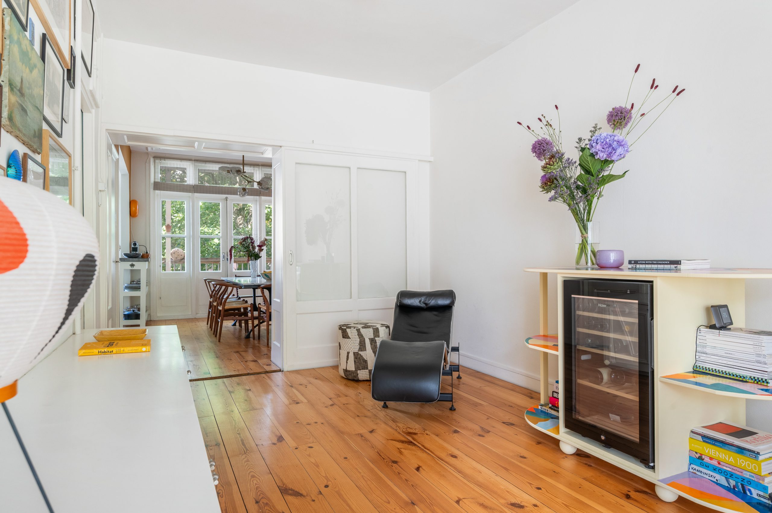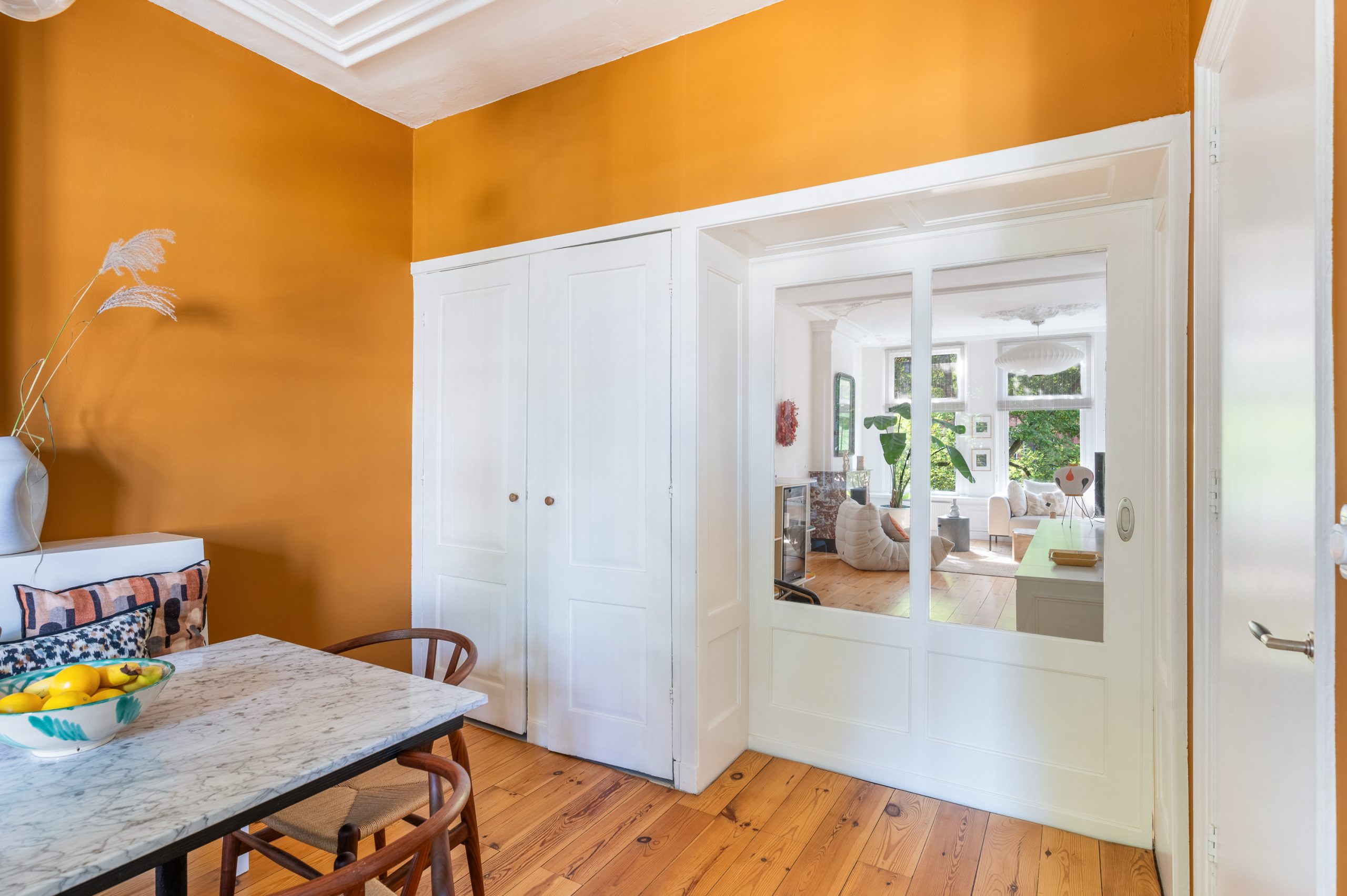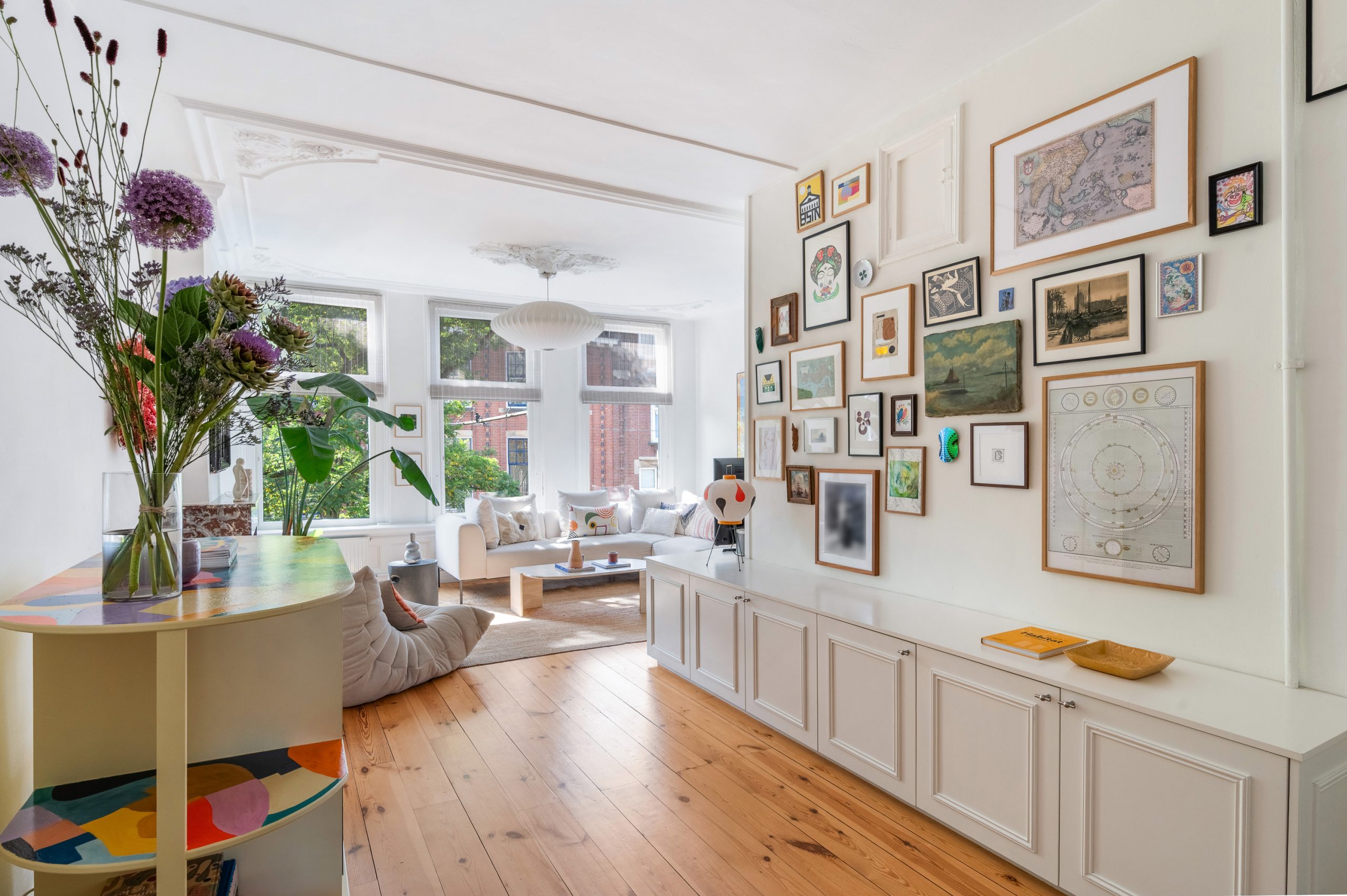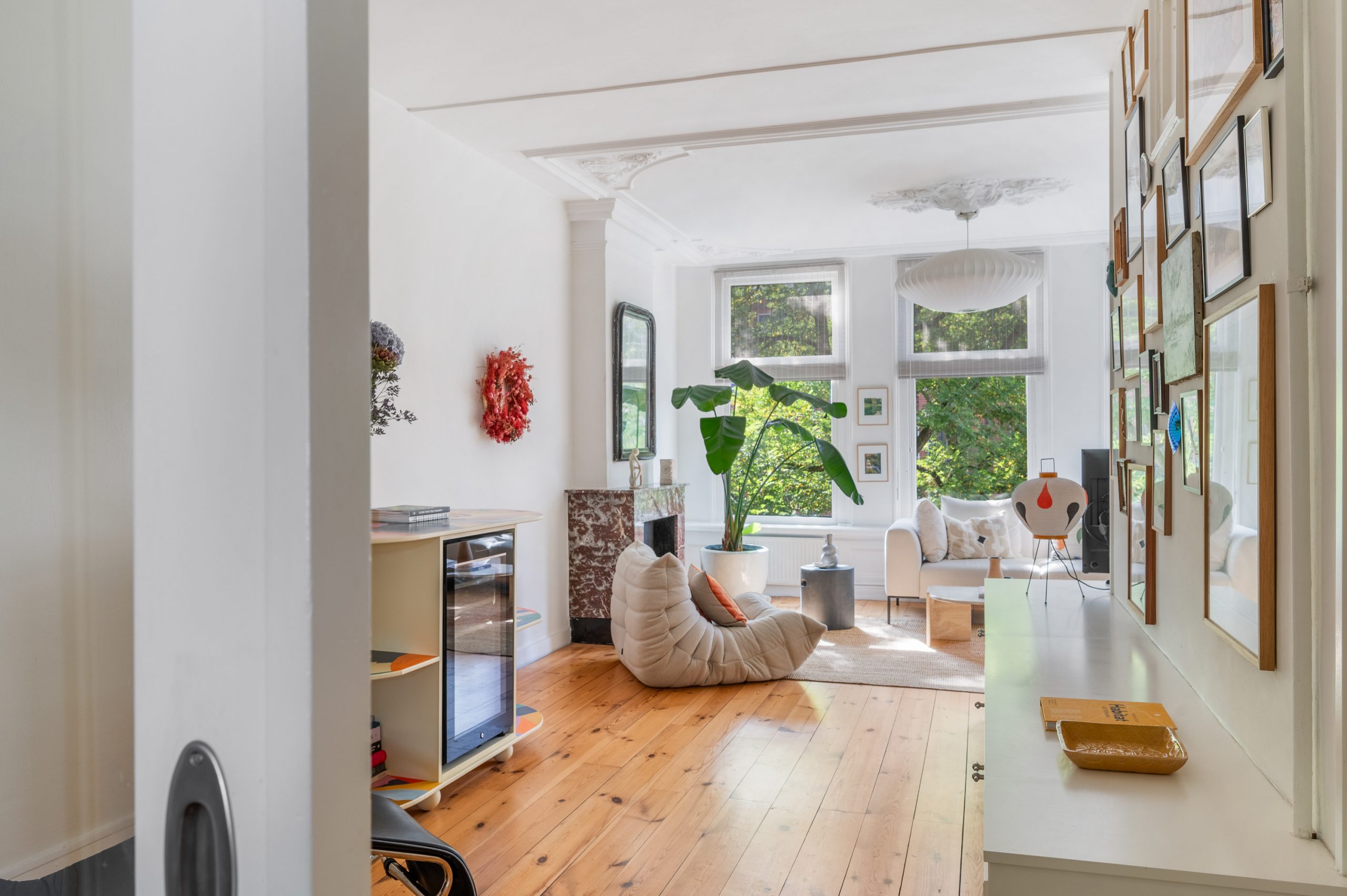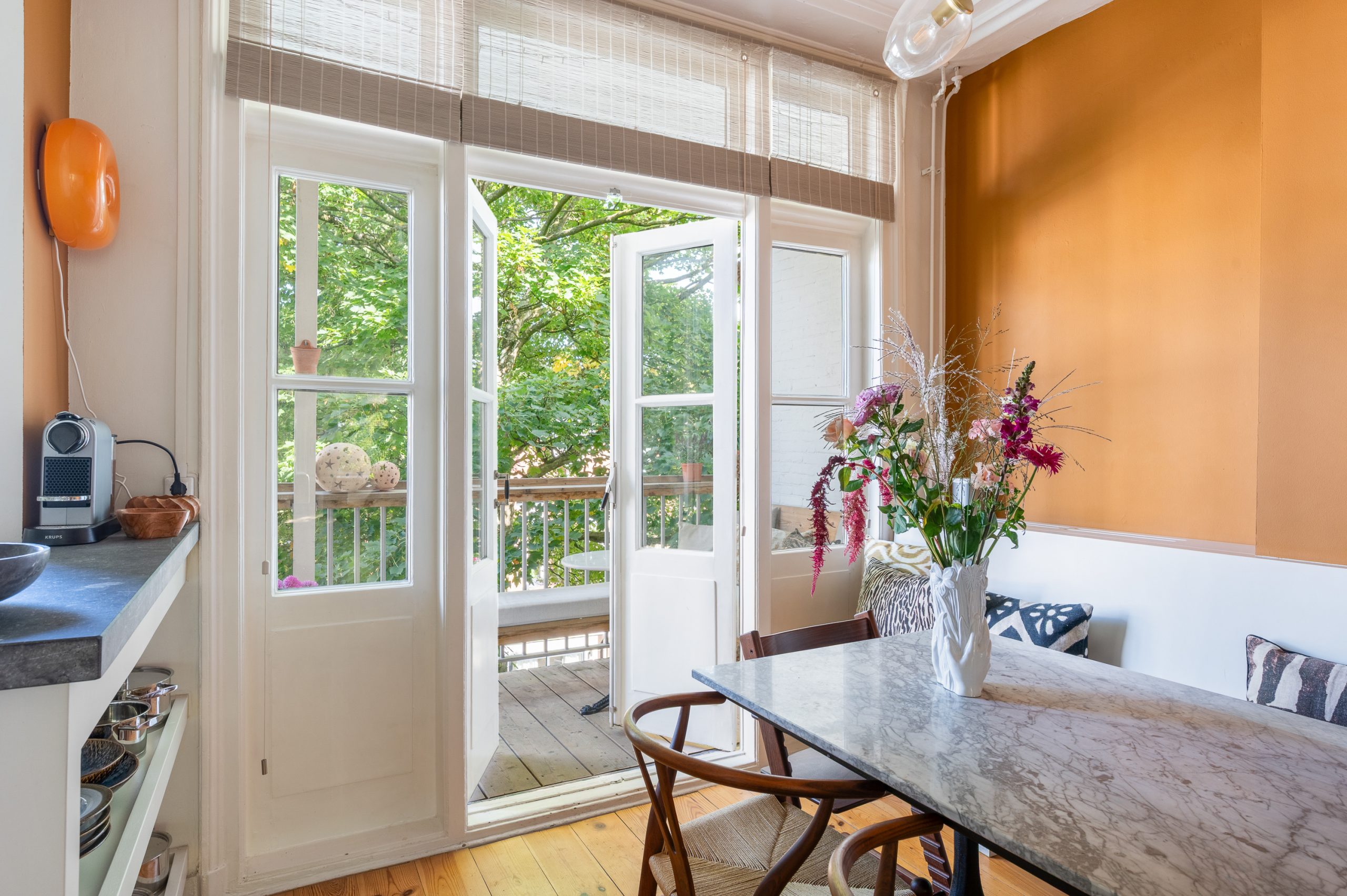 Hal/entree met berging, toilet en kast met CV-opstelling en toegang tot alle vertrekken op deze verdieping. De L-vormige woonkamer (met meterkast) is gelegen aan de voorzijde en beschikt over een prachtige lichtinval door de hoge raampartijen. Direct word je overspoeld door talloze authentieke details zoals de fantastische ornamenten, de originele schouwen en paneeldeuren. Hierdoor is de ruimte zeer sfeervol te noemen. Het eetgedeelte is gemakkelijk te scheiden van het woongedeelte middels de en suite schuifdeur. Ook zijn er 2 inbouwkasten, erg handig voor extra opbergruimte. De eetkamer grenst direct aan de keuken, waardoor je tijdens het koken altijd in contact kunt blijven met je gezelschap. De moderne keuken beschikt over diverse soorten inbouwapparatuur, zoals een 4-pits gasfornuis, afzuigkap, oven, vaatwasser en koel-/vriescombinatie. Vanuit zowel de keuken als de eetkamer bereik je het balkon, gelegen op het noorden. Hier kun je heerlijk in de zon met elkaar borrelen of genieten van een diner.