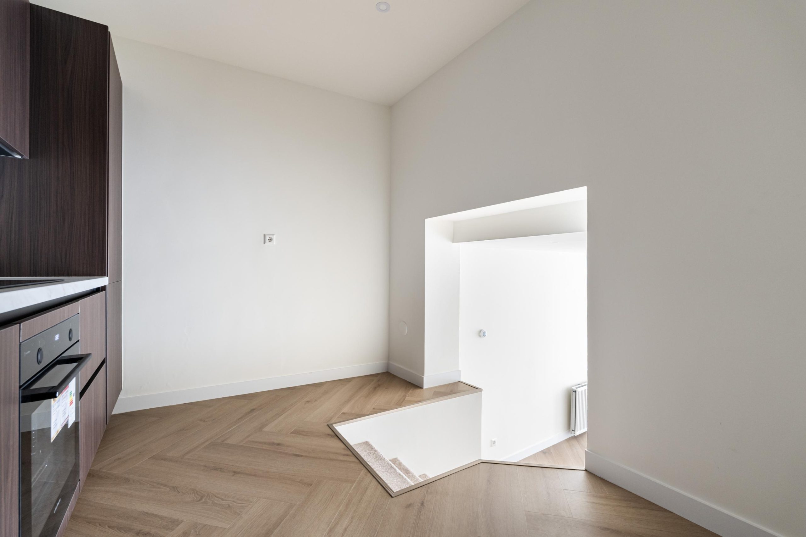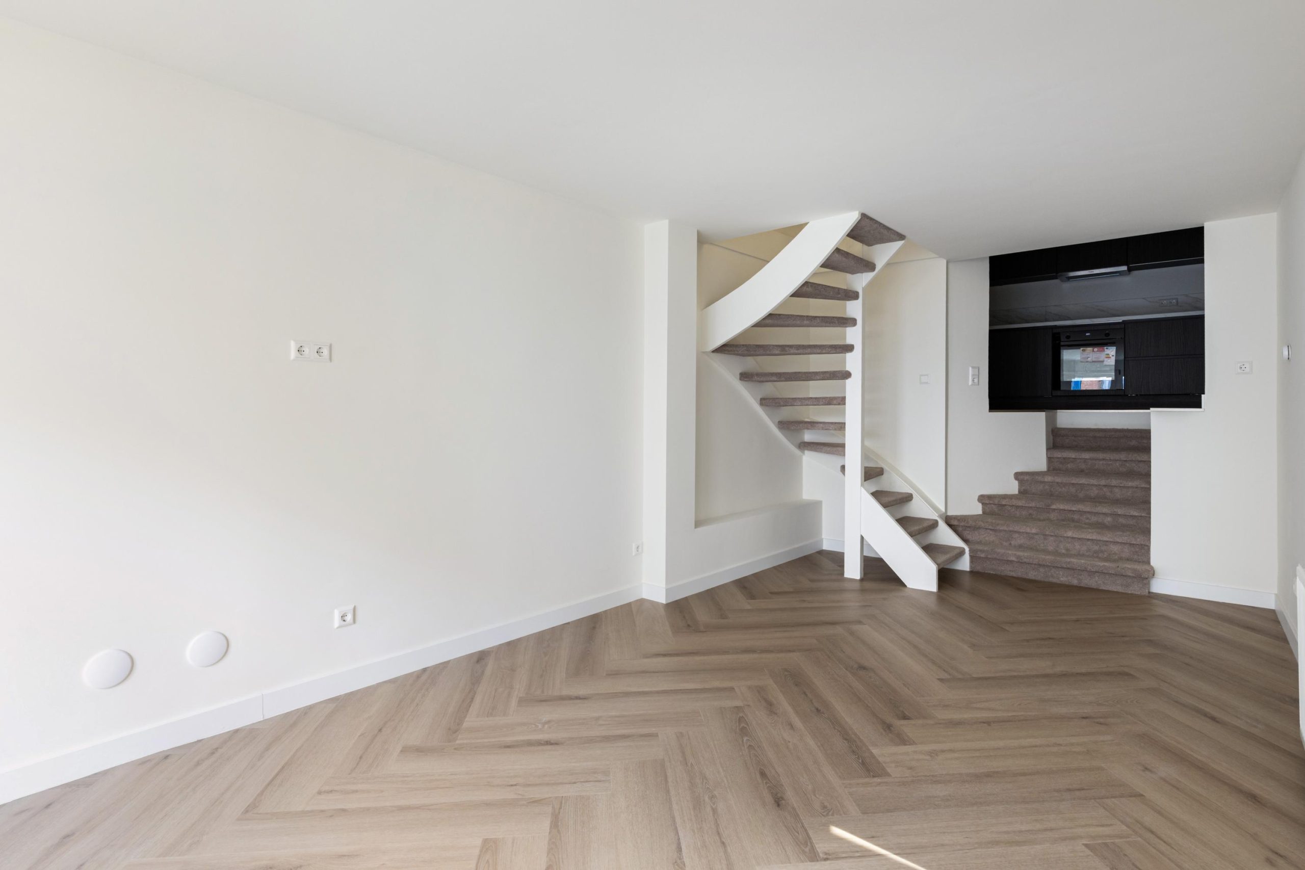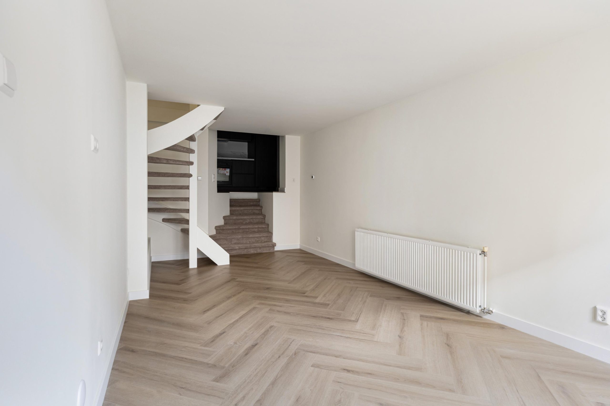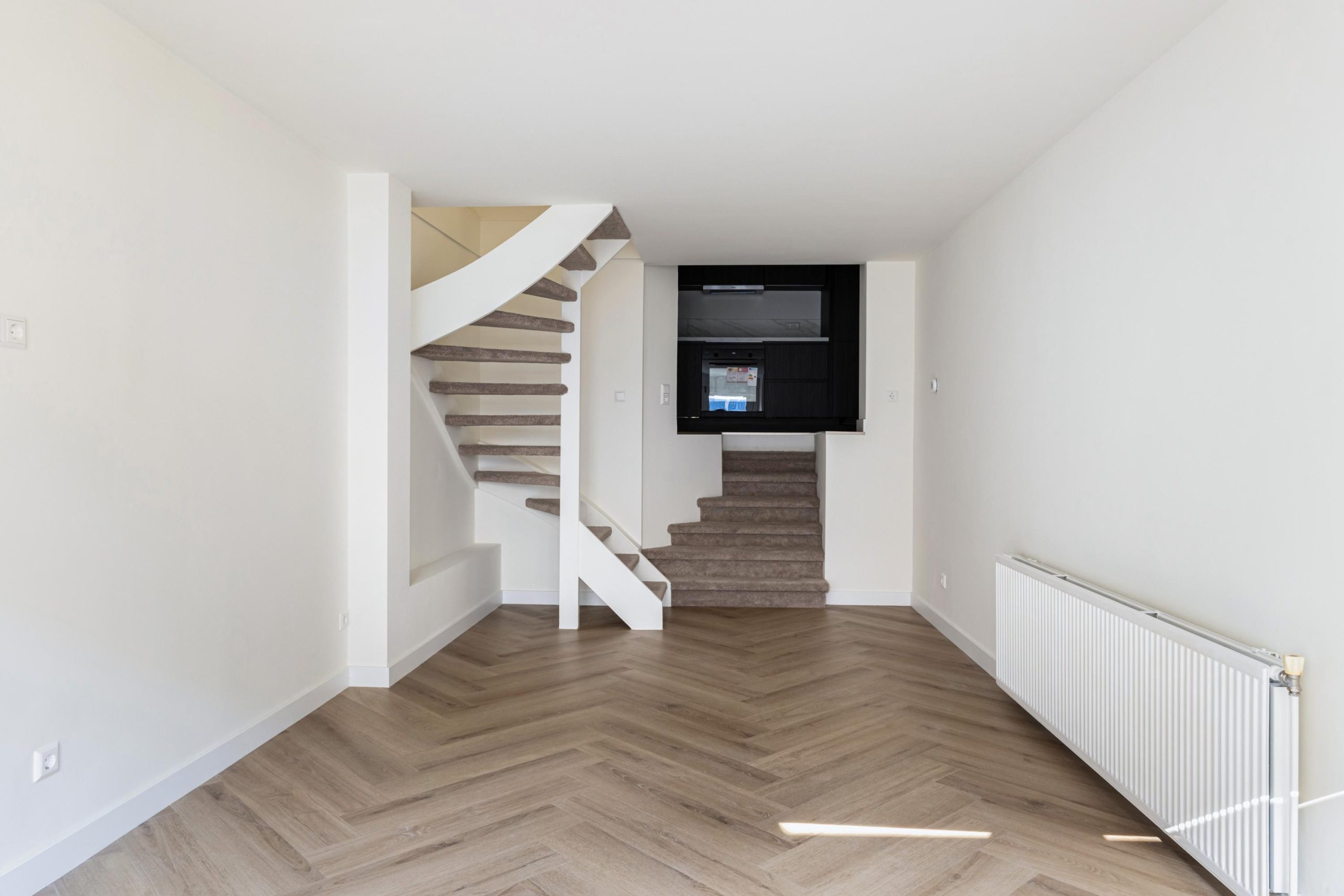 De openslaande deuren geven gelijk toegang tot de woonkamer en keuken. De woonkamer is gelegen aan de voorzijde en kenmerkt zich door de strakke, moderne afwerking. Dankzij de praktische indeling is er volop ruimte voor zowel een comfortabele zithoek als een gezellige eethoek. De open wenteltrap geeft de ruimte een speels en ruimtelijk karakter en zorgt voor een stijlvolle uitstraling. Via een trap gelegen in de woonkamer bereik je de moderne open keuken. De keuken beschikt over diverse soorten inbouwapparatuur, zoals een 4-pits inductieplaat met afzuiging, oven, vaatwasser en een koel-/vriescombinatie.