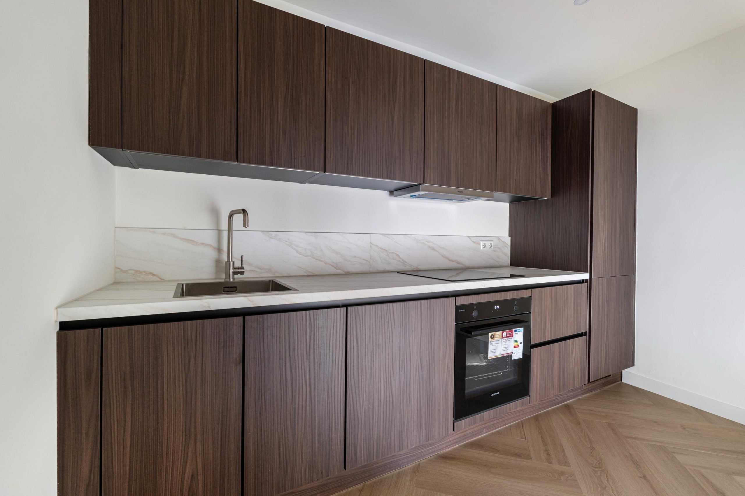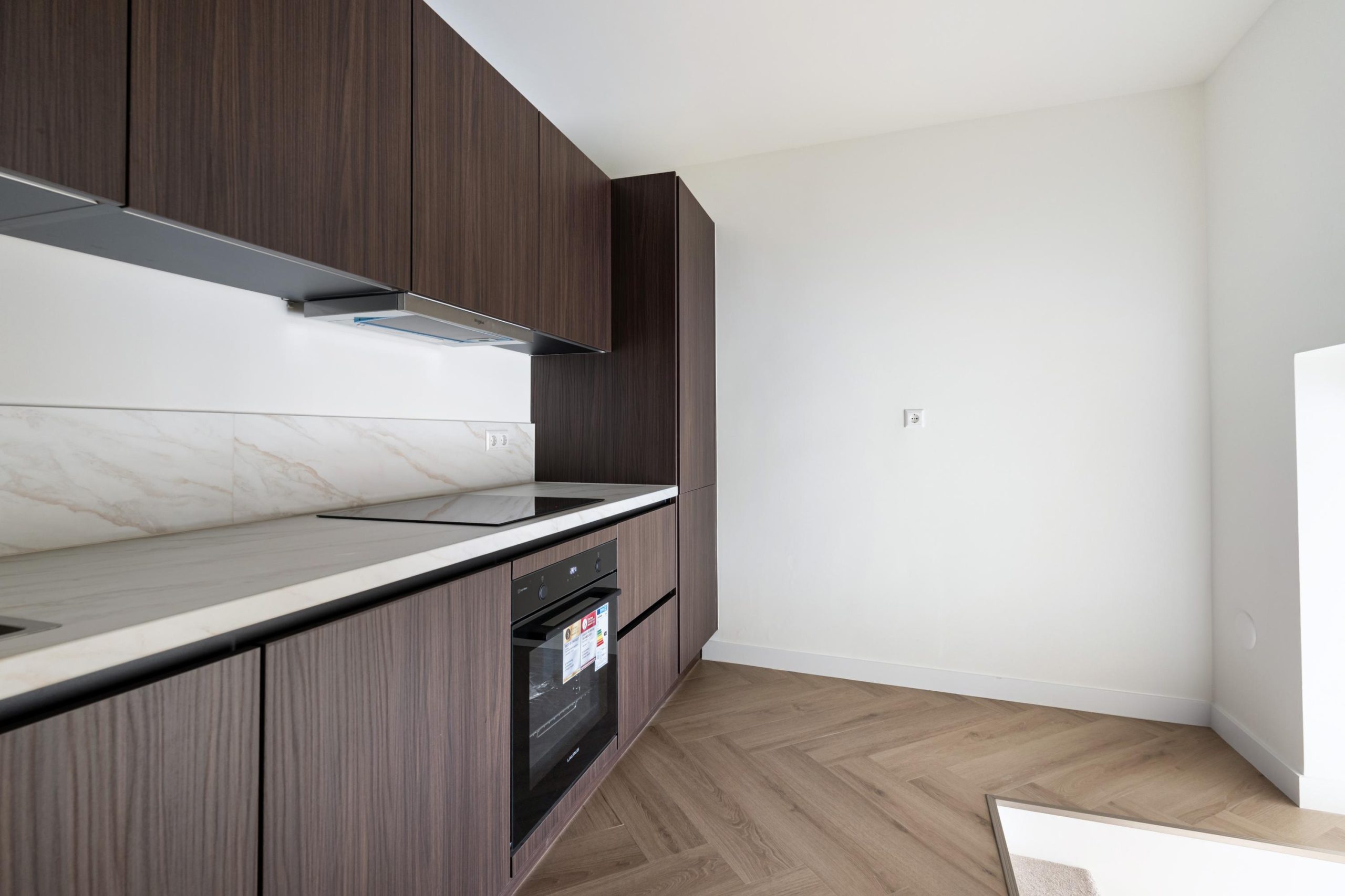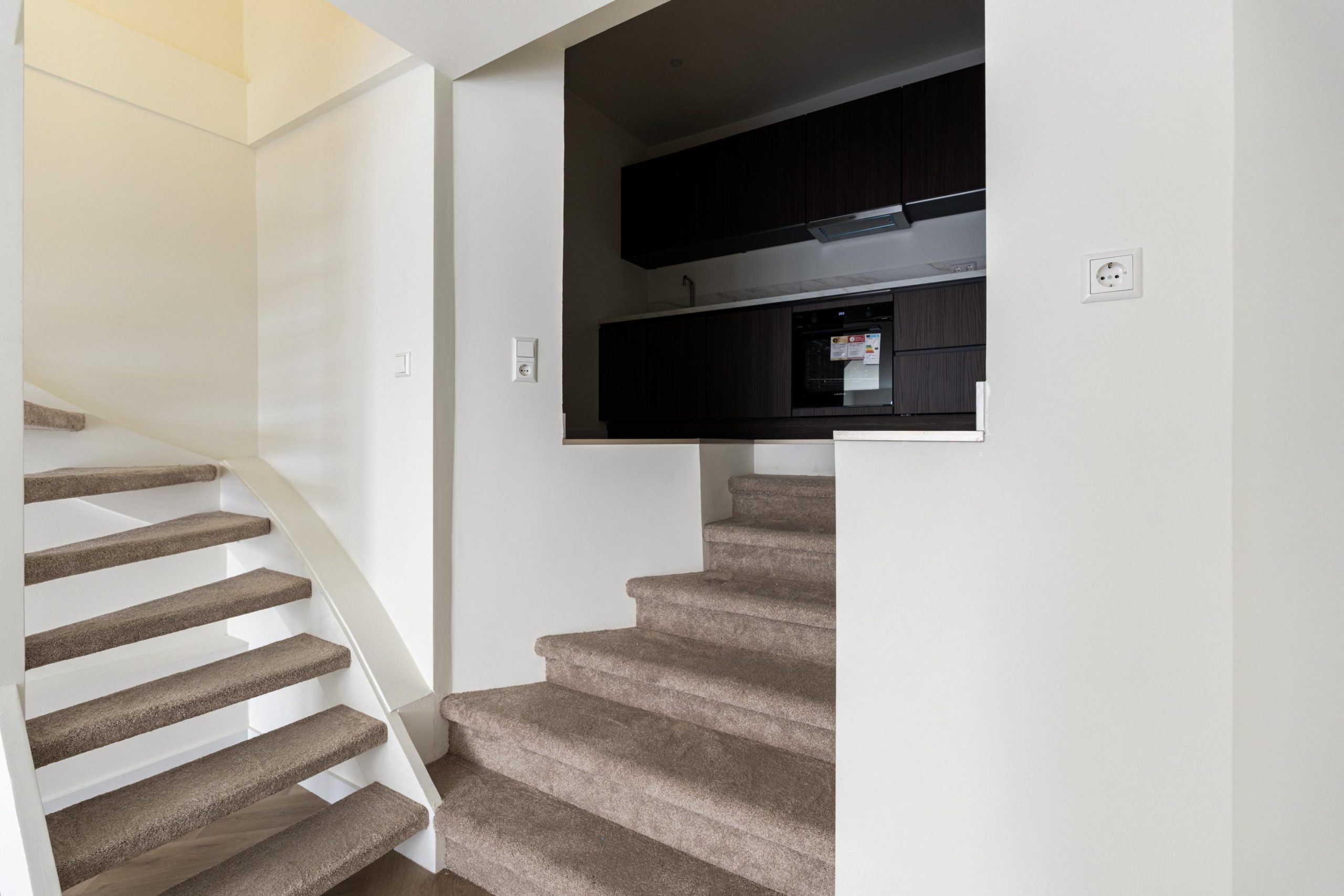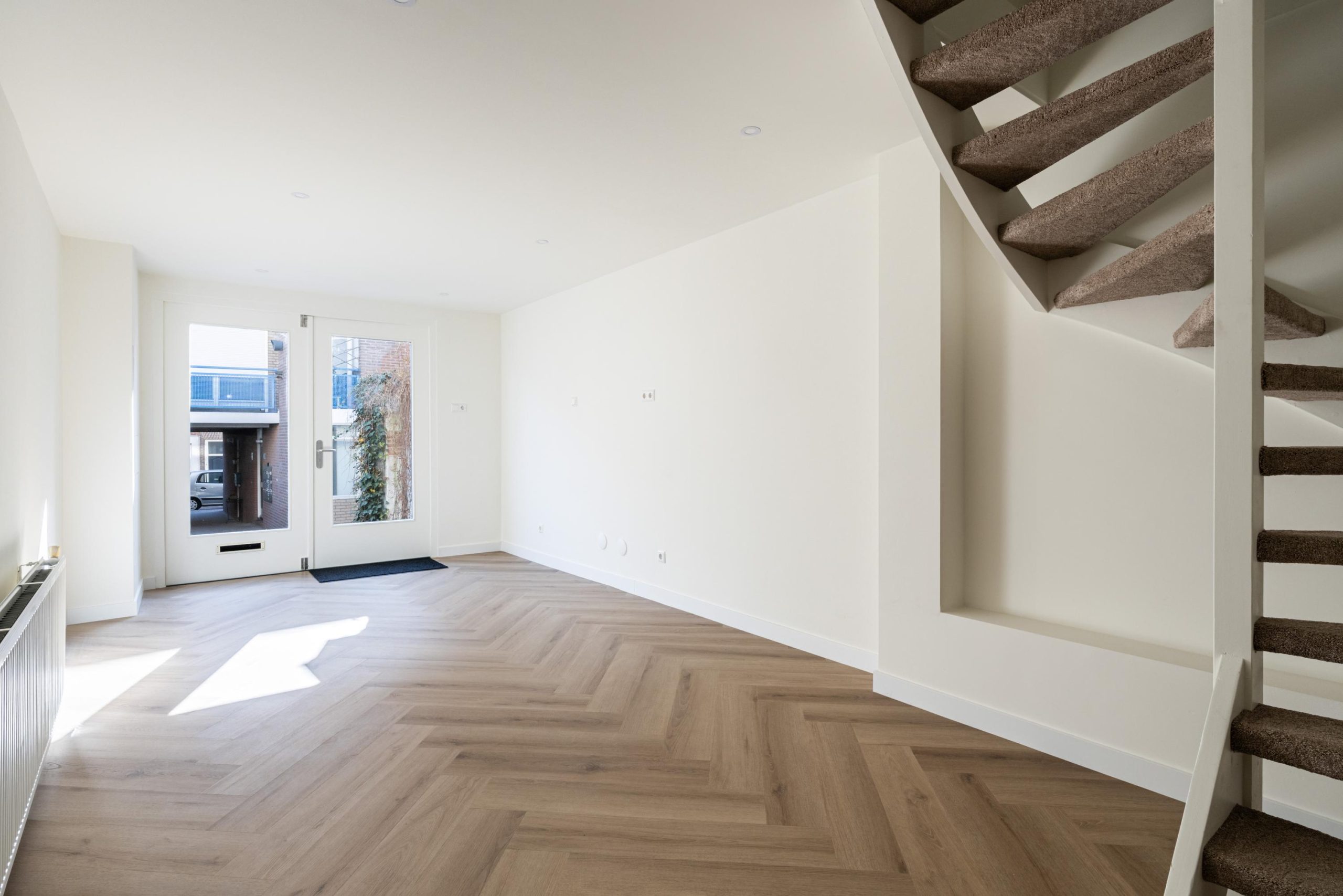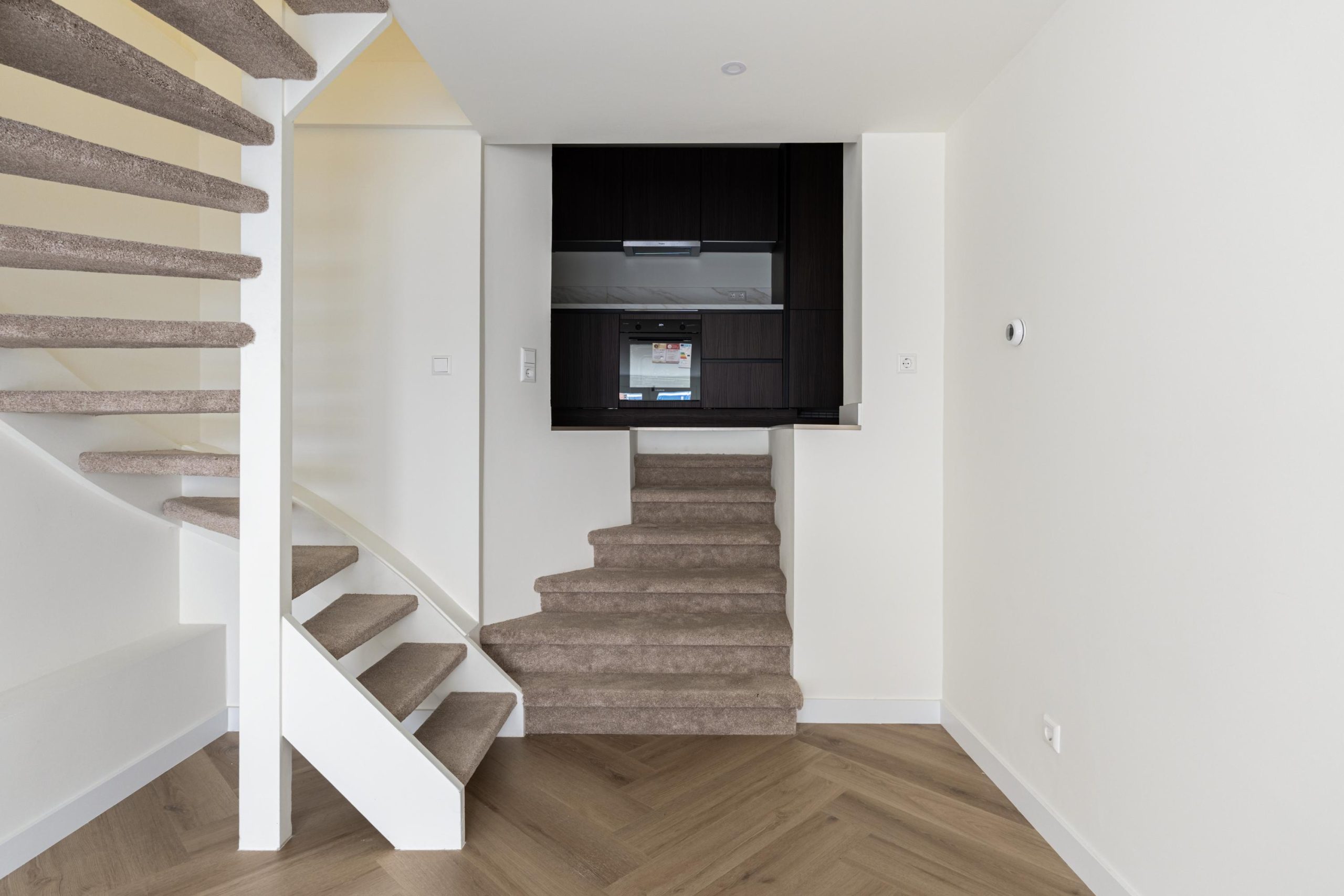 De openslaande deuren geven gelijk toegang tot de woonkamer en keuken. De woonkamer is gelegen aan de voorzijde en kenmerkt zich door de strakke, moderne afwerking. Dankzij de praktische indeling is er volop ruimte voor zowel een comfortabele zithoek als een gezellige eethoek. De open wenteltrap geeft de ruimte een speels en ruimtelijk karakter en zorgt voor een stijlvolle uitstraling. Via een trap gelegen in de woonkamer bereik je de moderne open keuken. De keuken beschikt over diverse soorten inbouwapparatuur, zoals een 4-pits inductieplaat met afzuiging, oven, vaatwasser en een koel-/vriescombinatie.