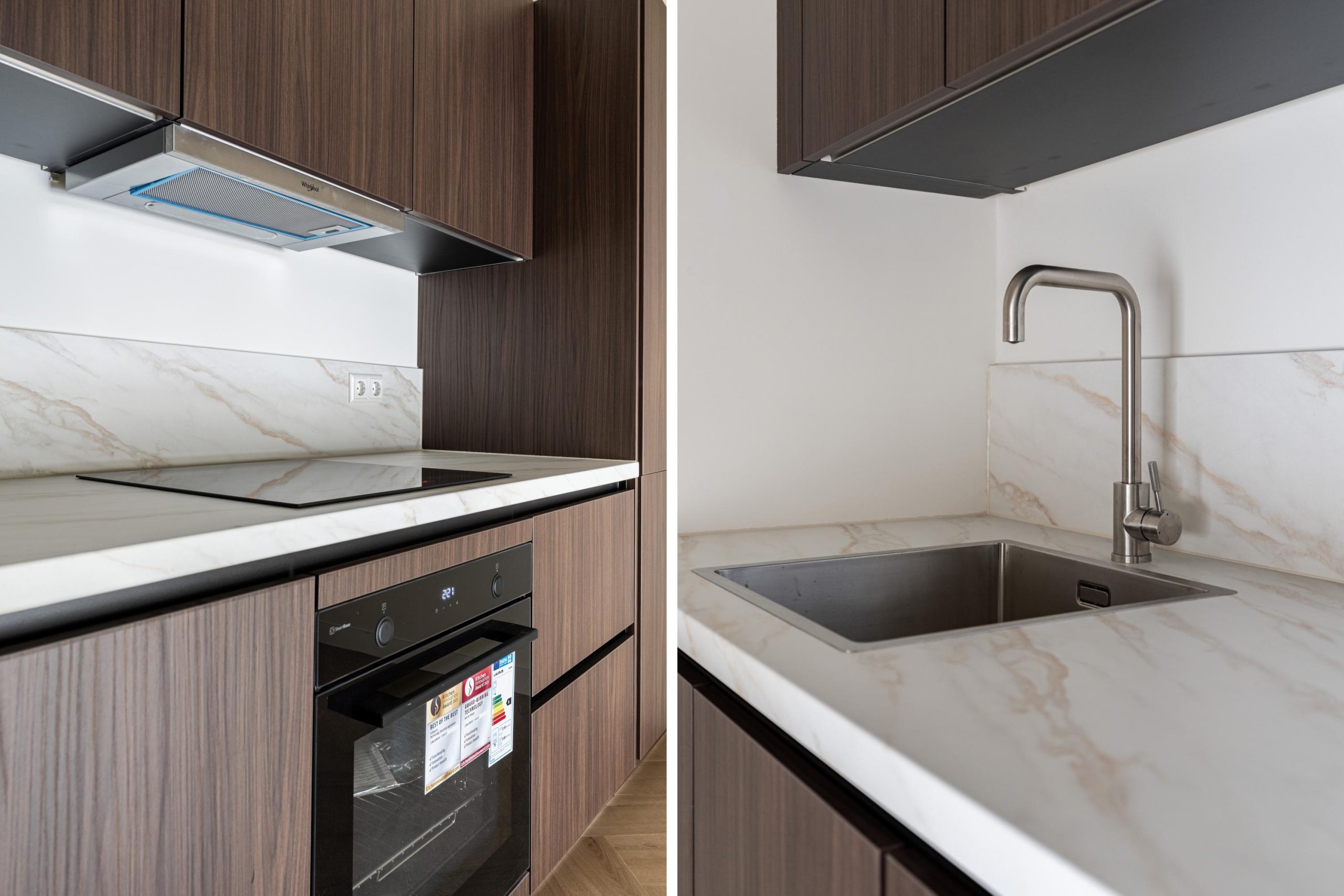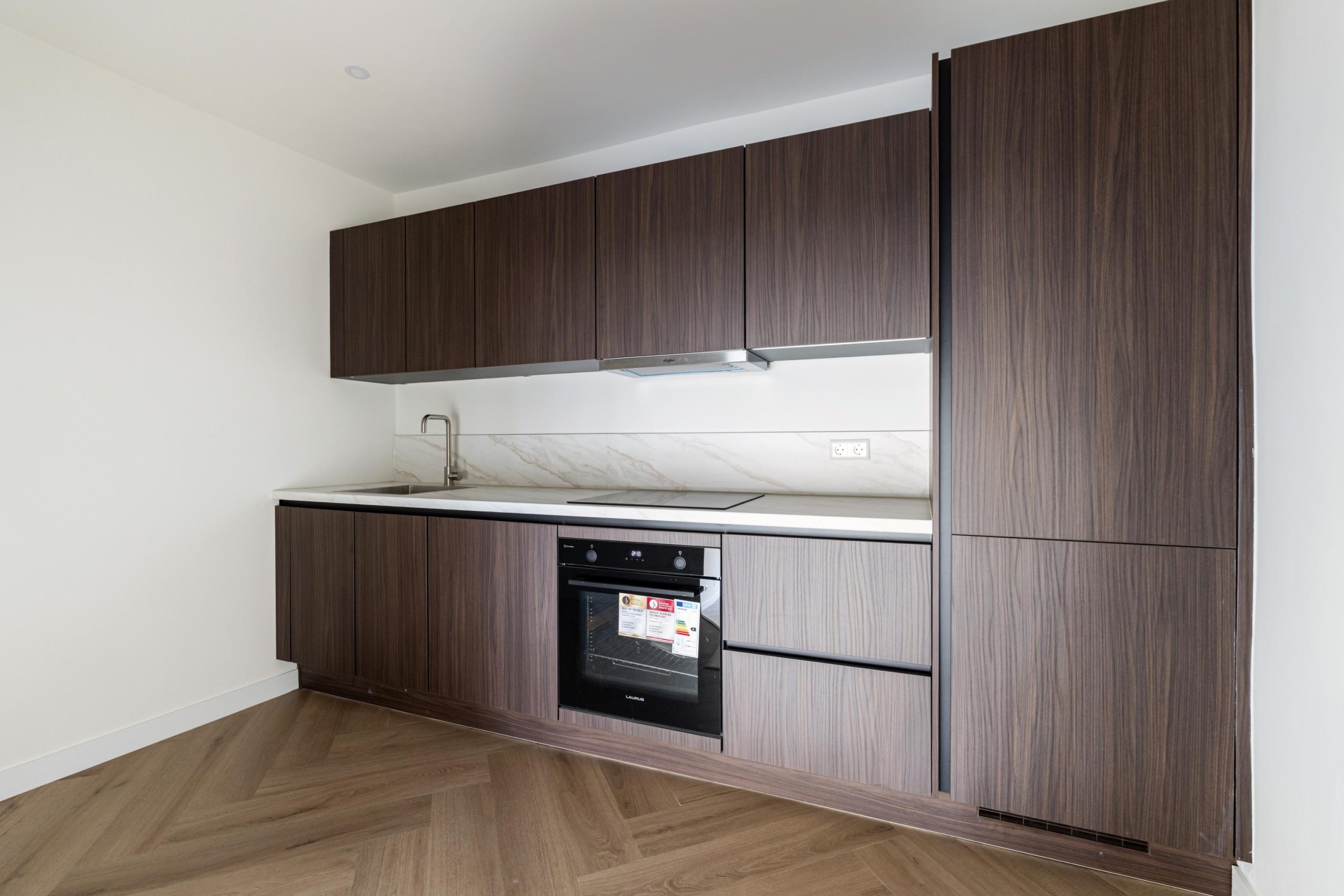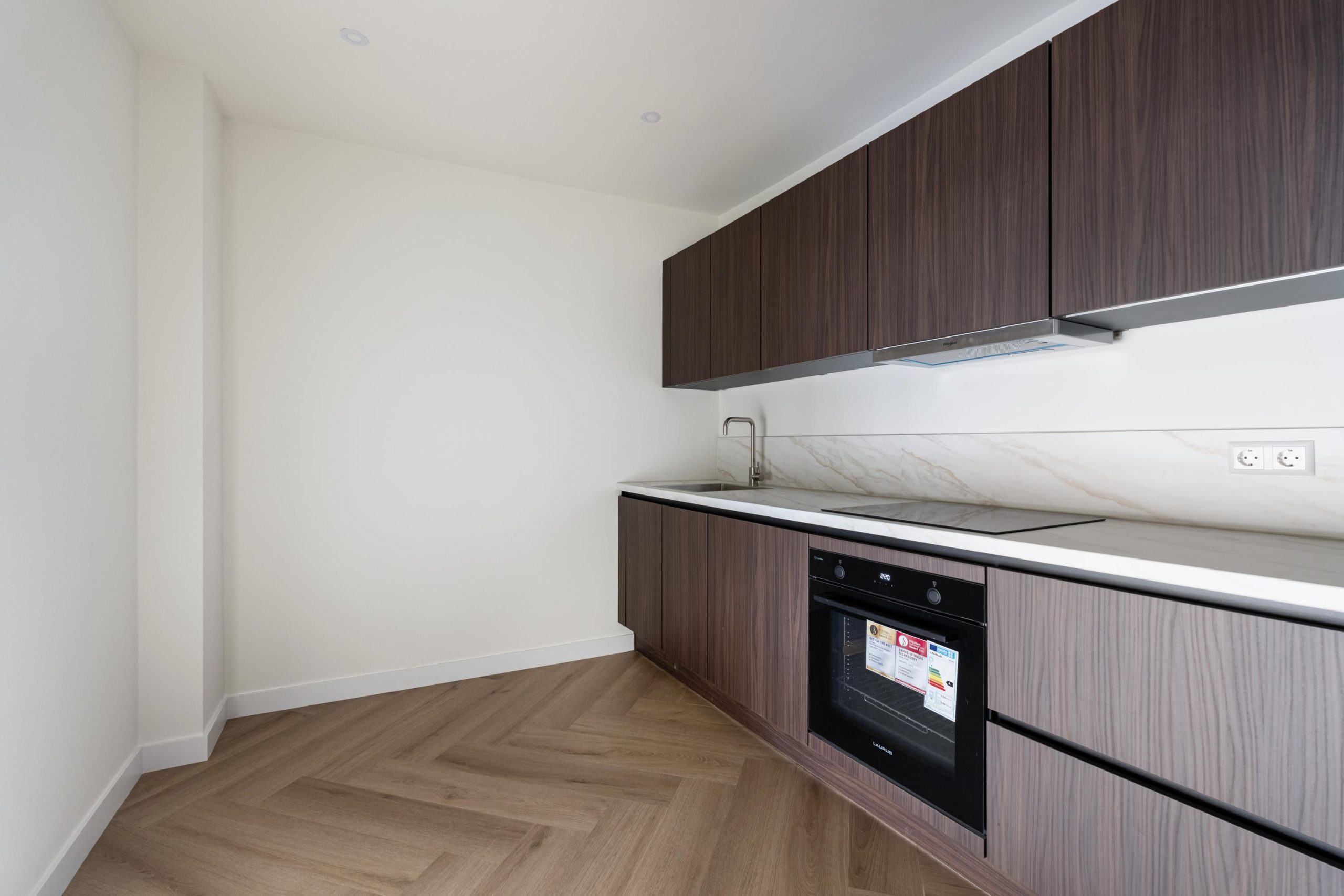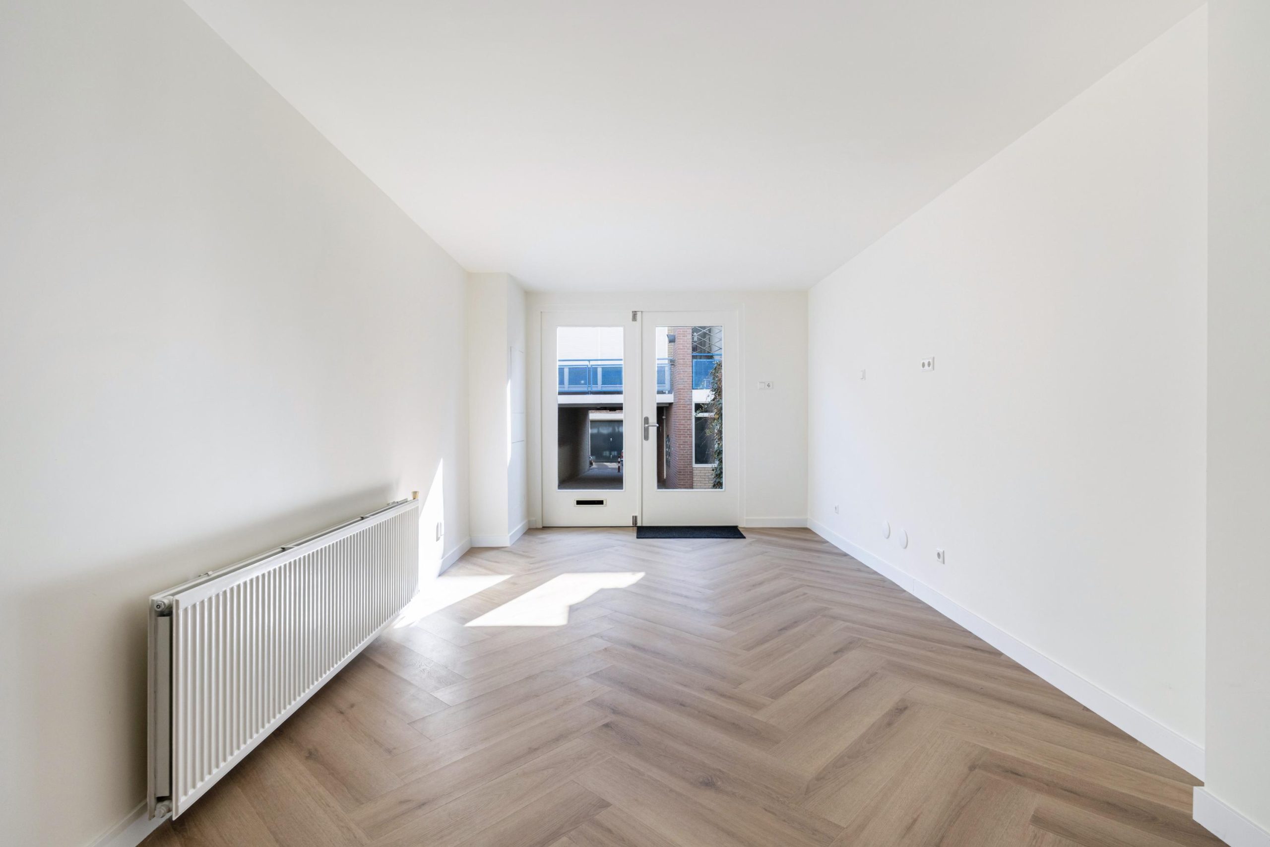 De openslaande deuren geven gelijk toegang tot de woonkamer en keuken. De woonkamer is gelegen aan de voorzijde en kenmerkt zich door de strakke, moderne afwerking. Dankzij de praktische indeling is er volop ruimte voor zowel een comfortabele zithoek als een gezellige eethoek. De open wenteltrap geeft de ruimte een speels en ruimtelijk karakter en zorgt voor een stijlvolle uitstraling. Via een trap gelegen in de woonkamer bereik je de moderne open keuken. De keuken beschikt over diverse soorten inbouwapparatuur, zoals een 4-pits inductieplaat met afzuiging, oven, vaatwasser en een koel-/vriescombinatie.