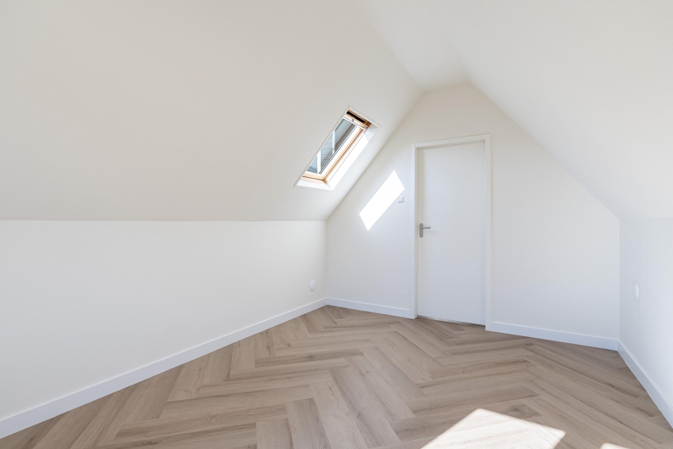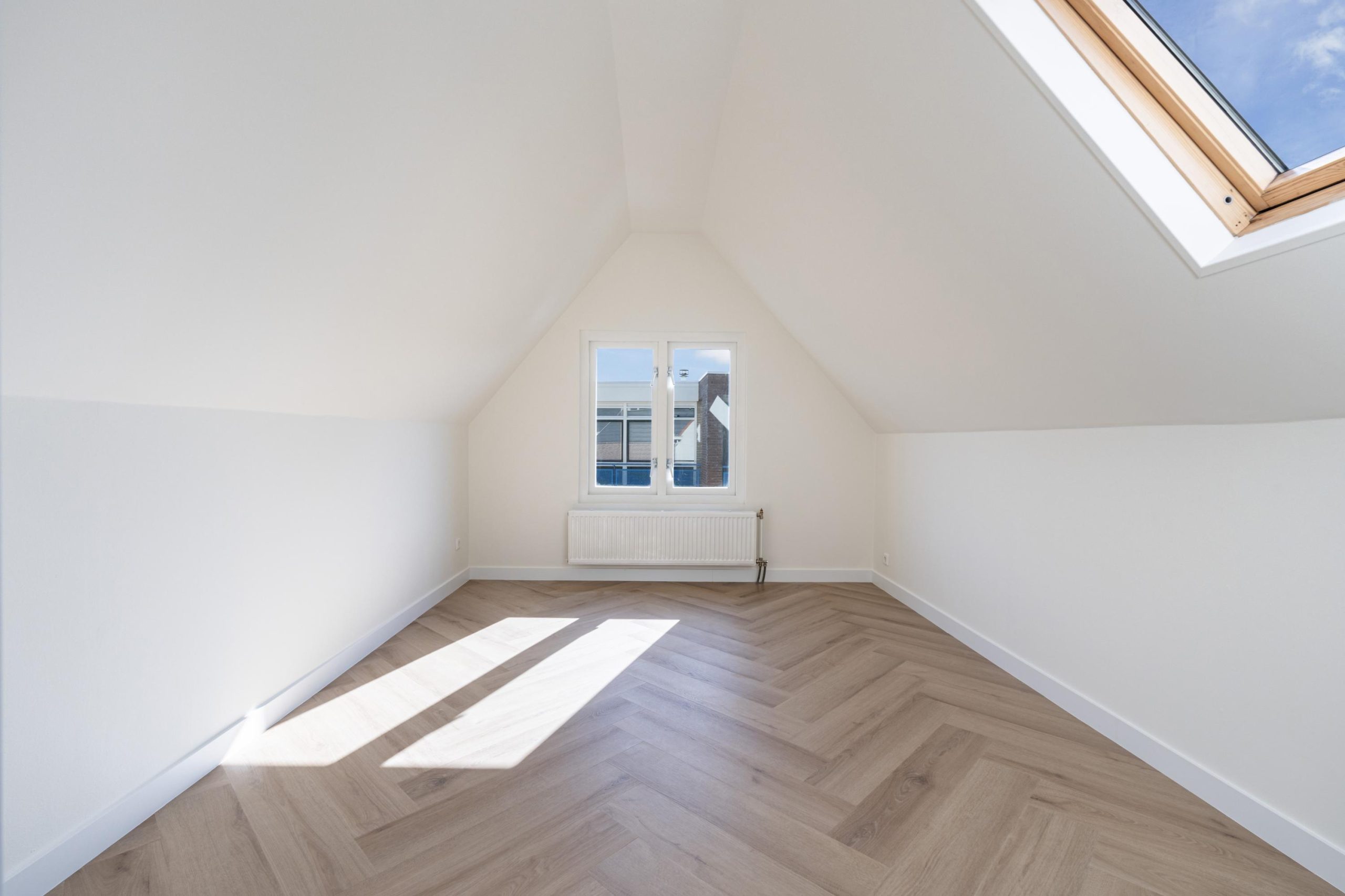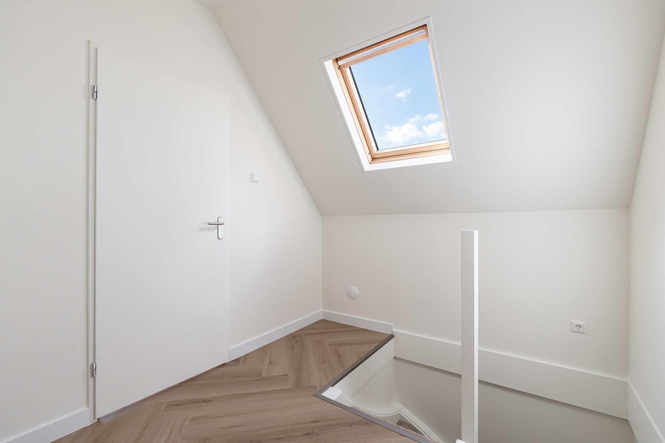 Overloop met vaste kast en toegang tot de grootste slaapkamer. De slaapkamer is gesitueerd onder het schuine dak, wat de ruimte een charmant en speels karakter geeft. Het aanwezige dakraam zorgt voor een fijne lichtinval en creƫert een aangename, ruimtelijke sfeer. Er is meer dan voldoende ruimte voor een tweepersoonsbed en een riante kledingkast.