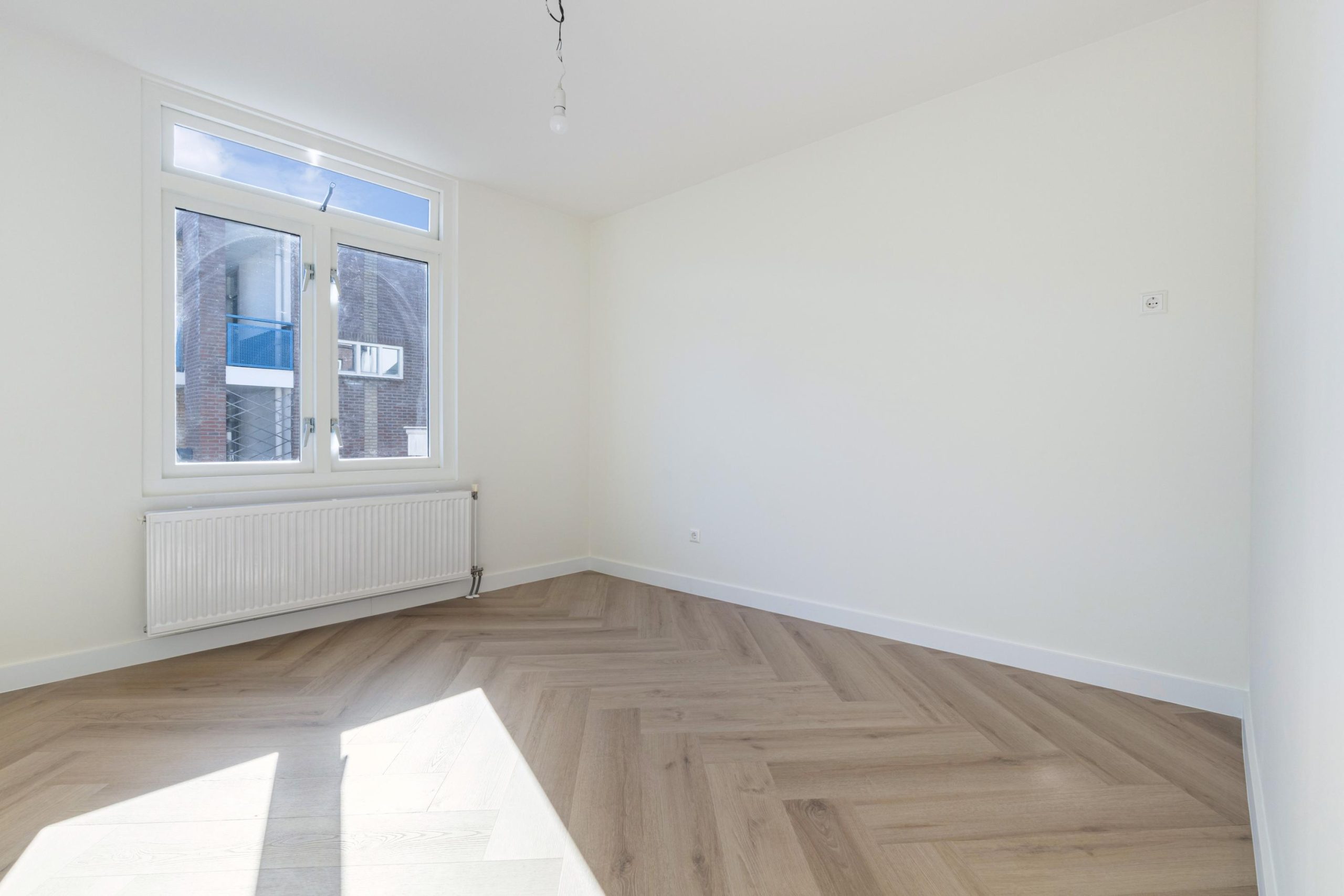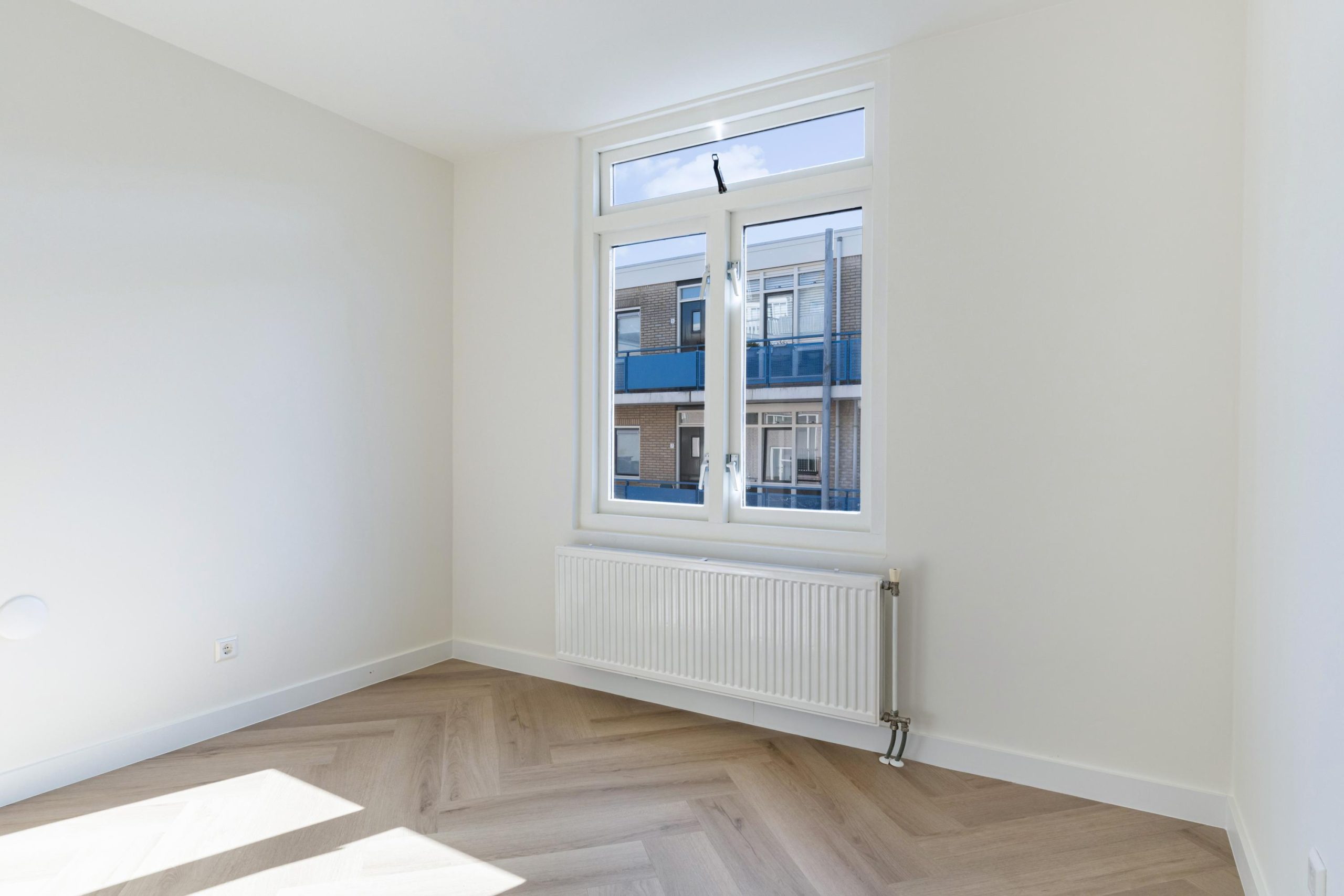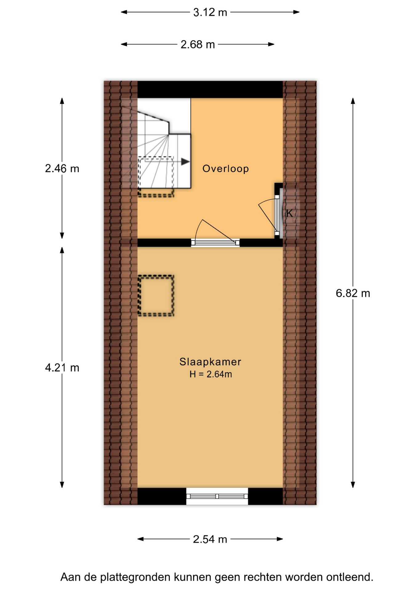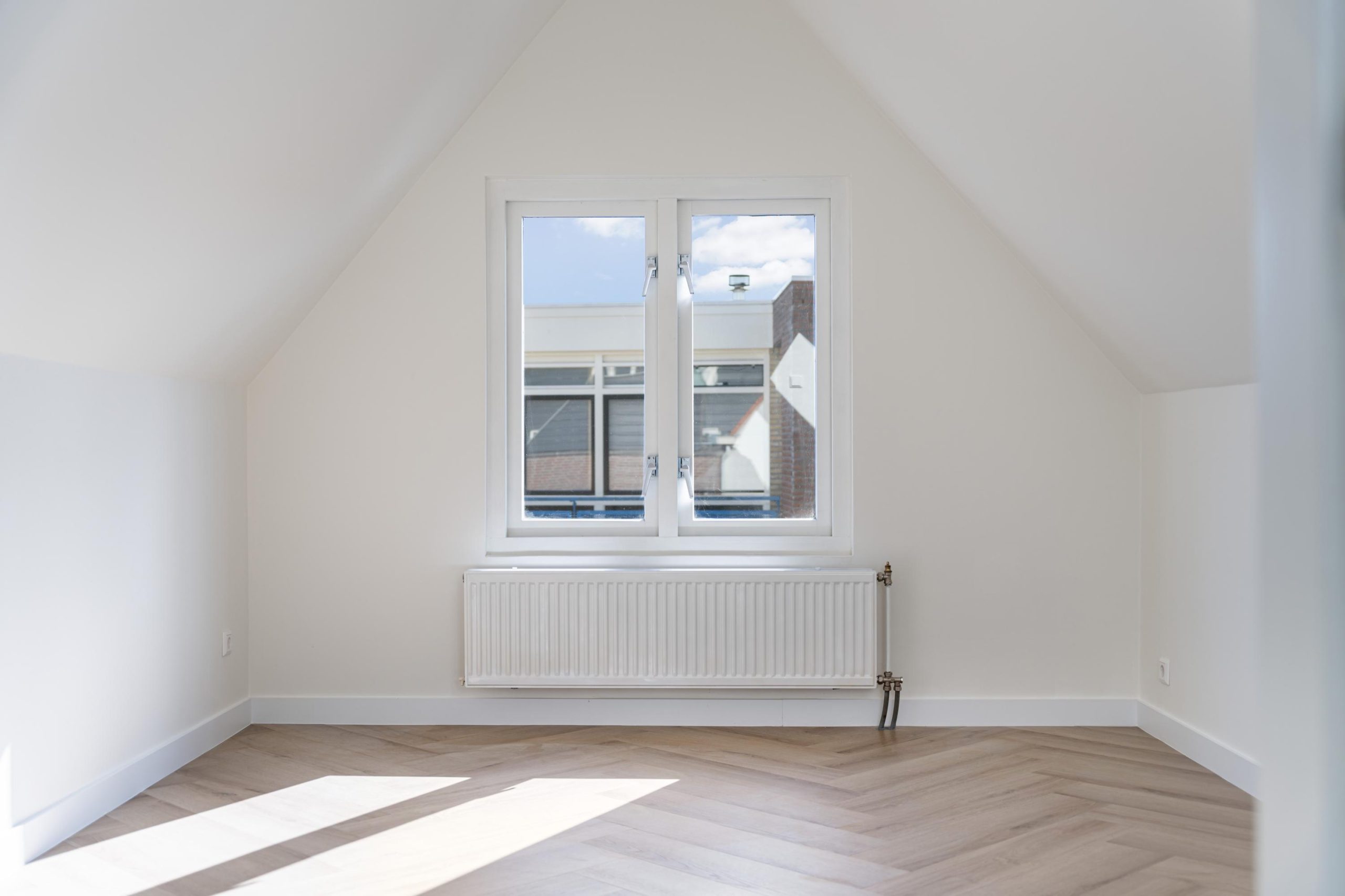 Overloop met vaste kast en toegang tot de grootste slaapkamer. De slaapkamer is gesitueerd onder het schuine dak, wat de ruimte een charmant en speels karakter geeft. Het aanwezige dakraam zorgt voor een fijne lichtinval en creƫert een aangename, ruimtelijke sfeer. Er is meer dan voldoende ruimte voor een tweepersoonsbed en een riante kledingkast.