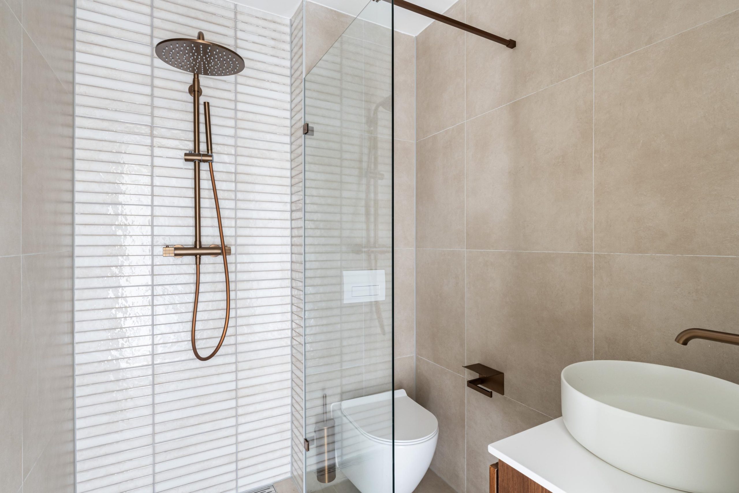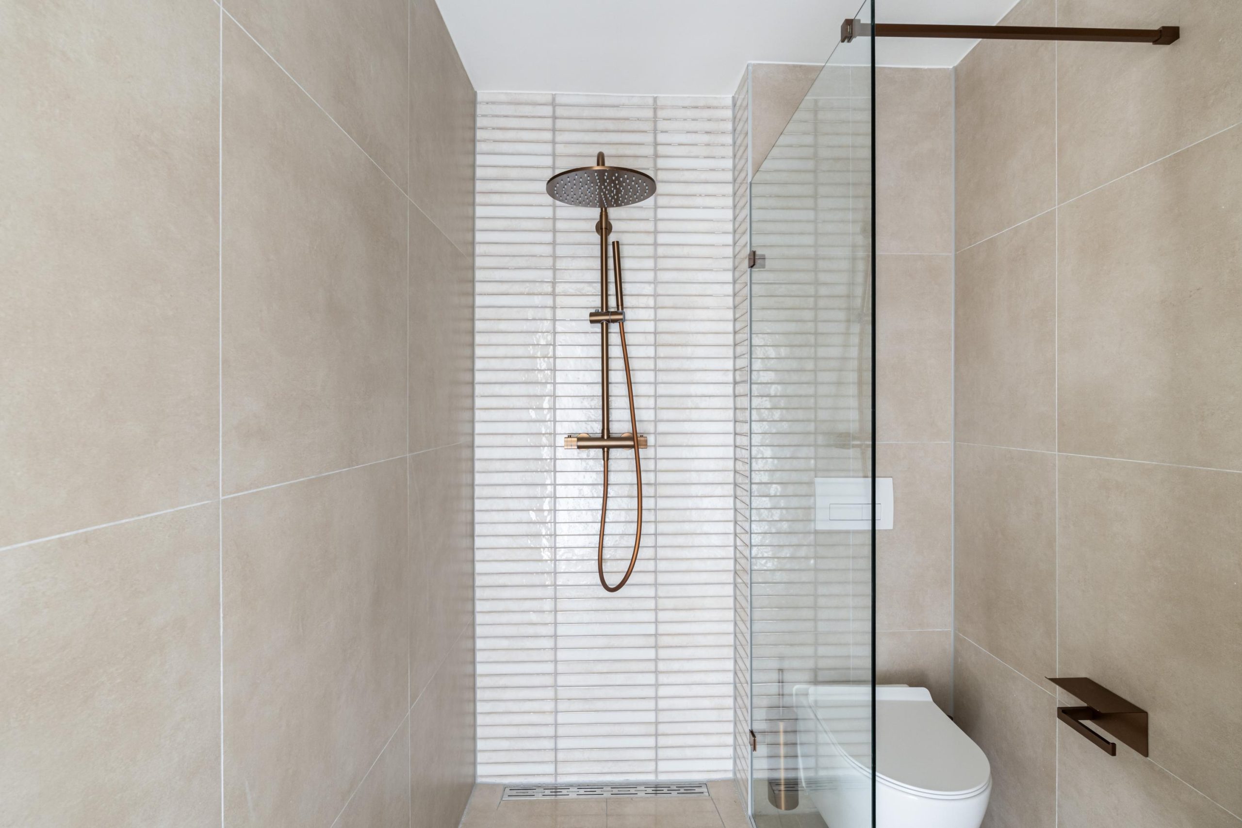 Ruime overloop met hal en toegang tot de slaapkamer en badkamer. De eerste slaapkamer is gelegen aan de voorzijde van de woning. Dit is een erg lichte, ruime kamer en beschikt over mooie raampartijen. De mooie, volledig betegelde badkamer beschikt over een inloop(regen)douche, toilet en een wastafel met meubel.