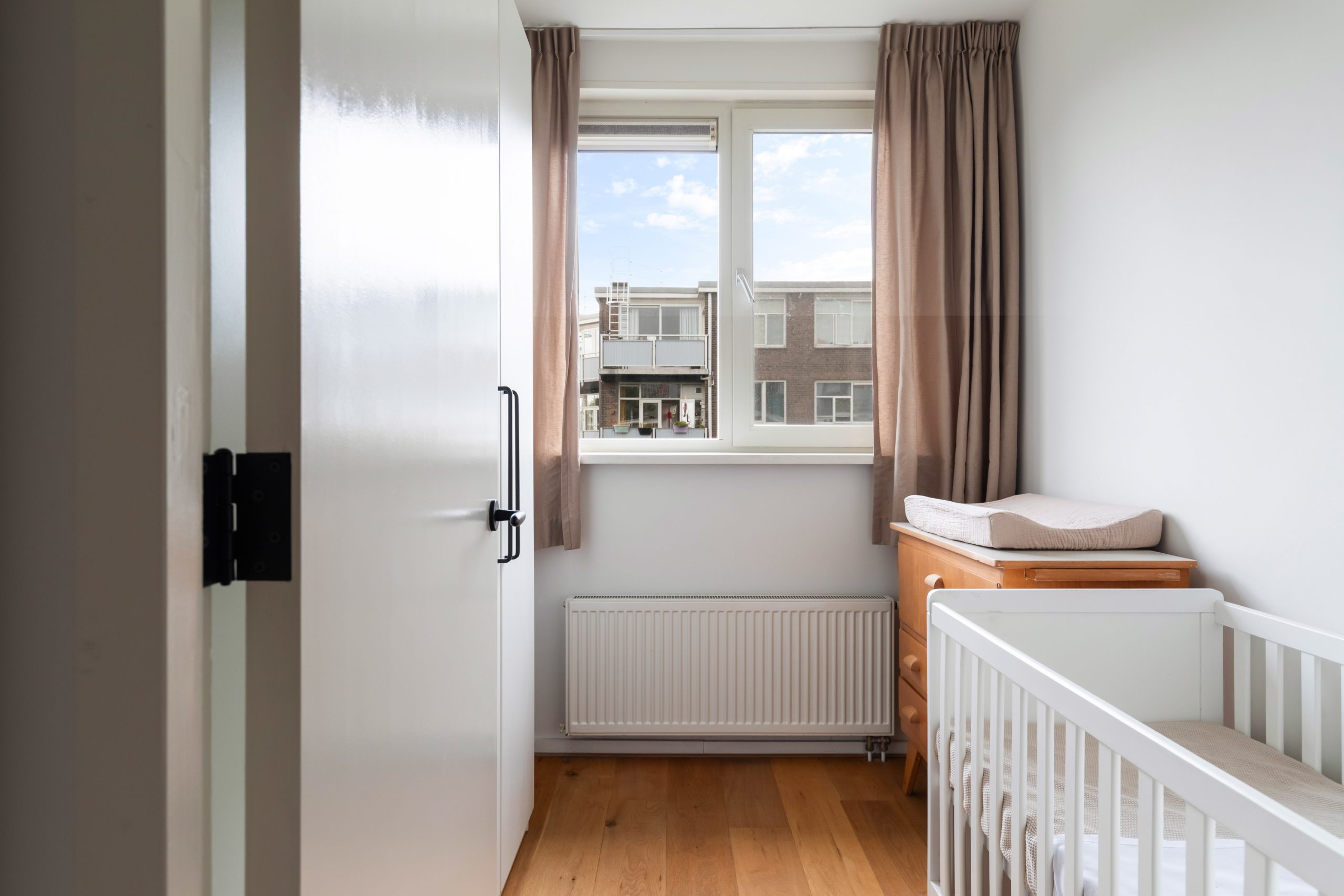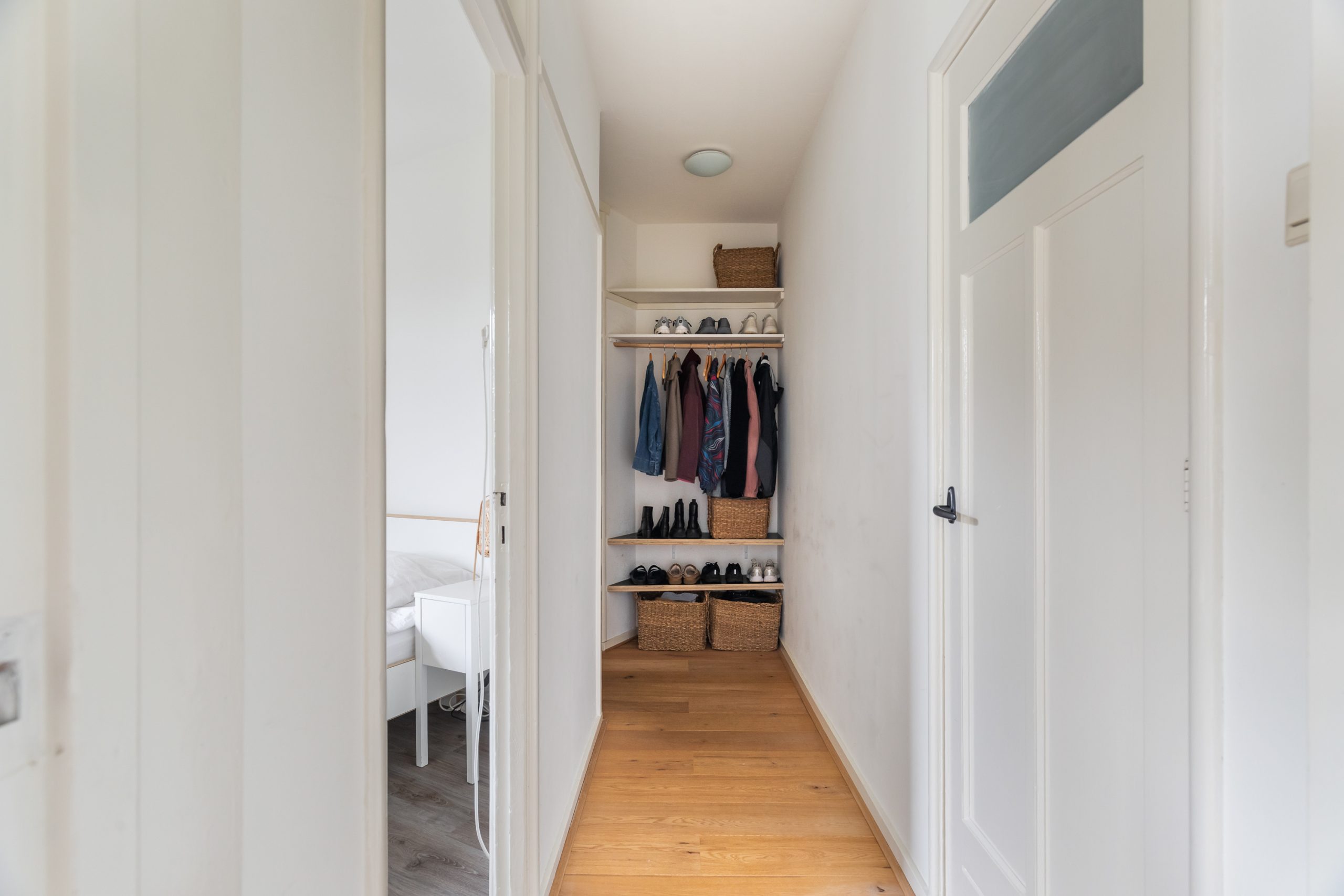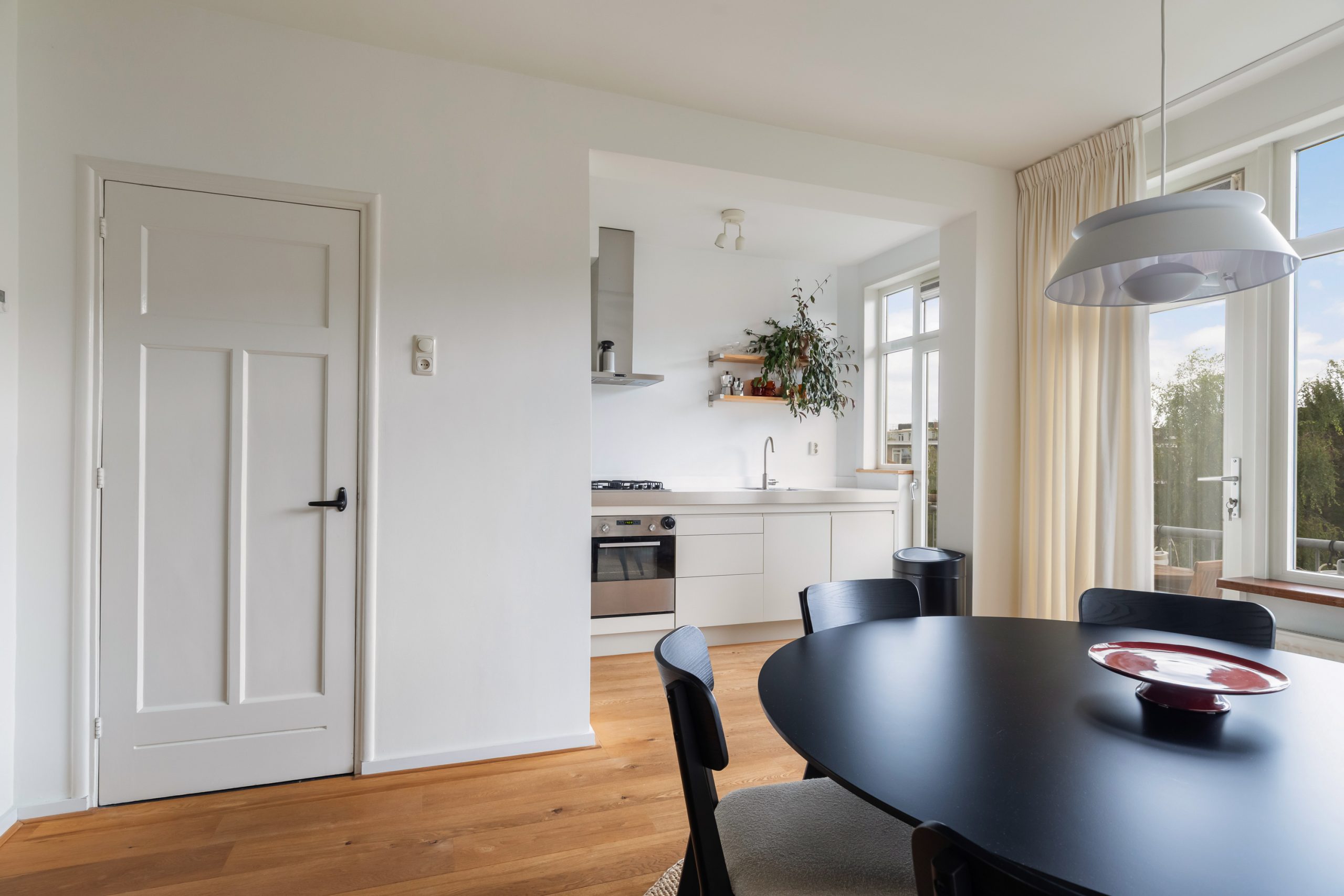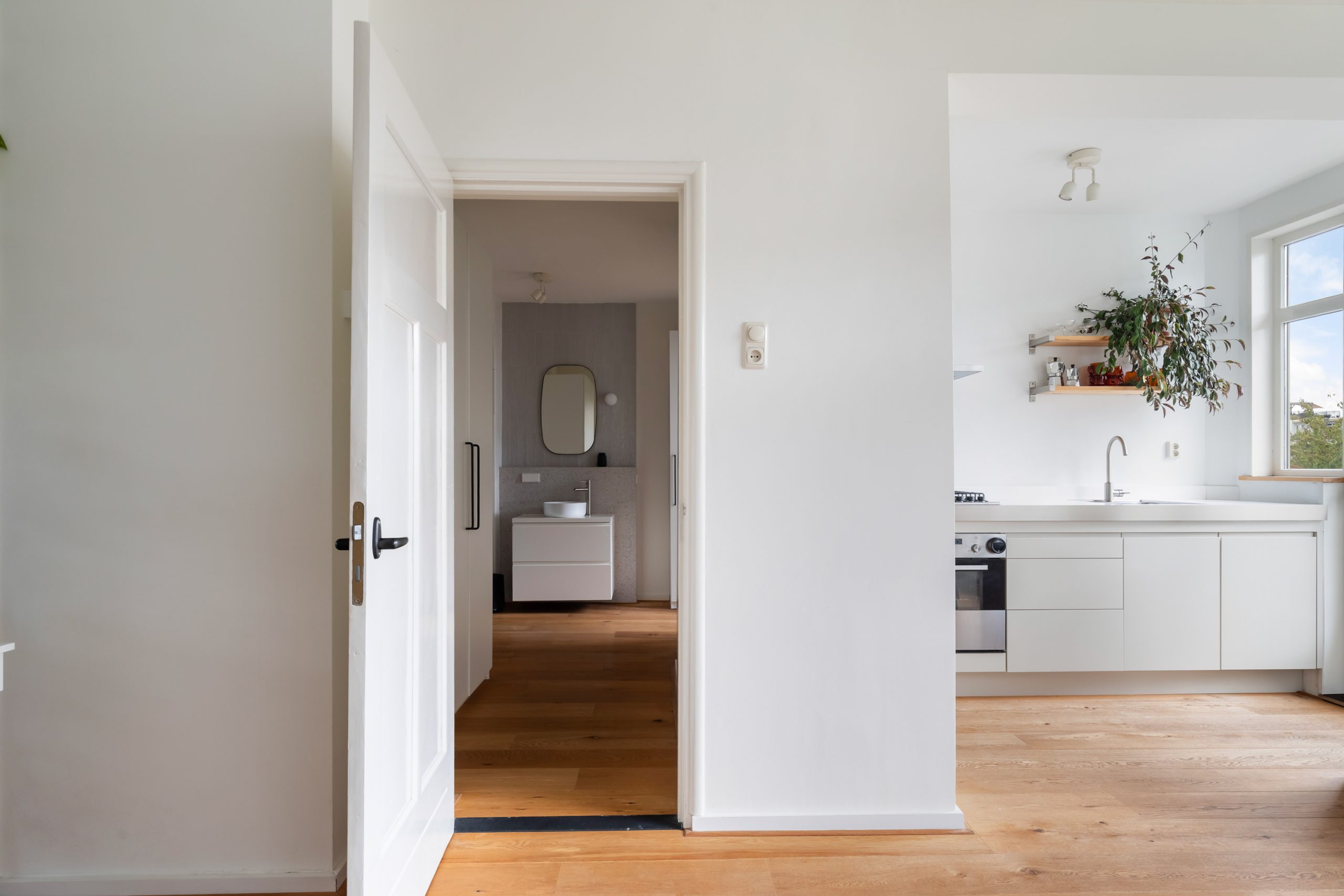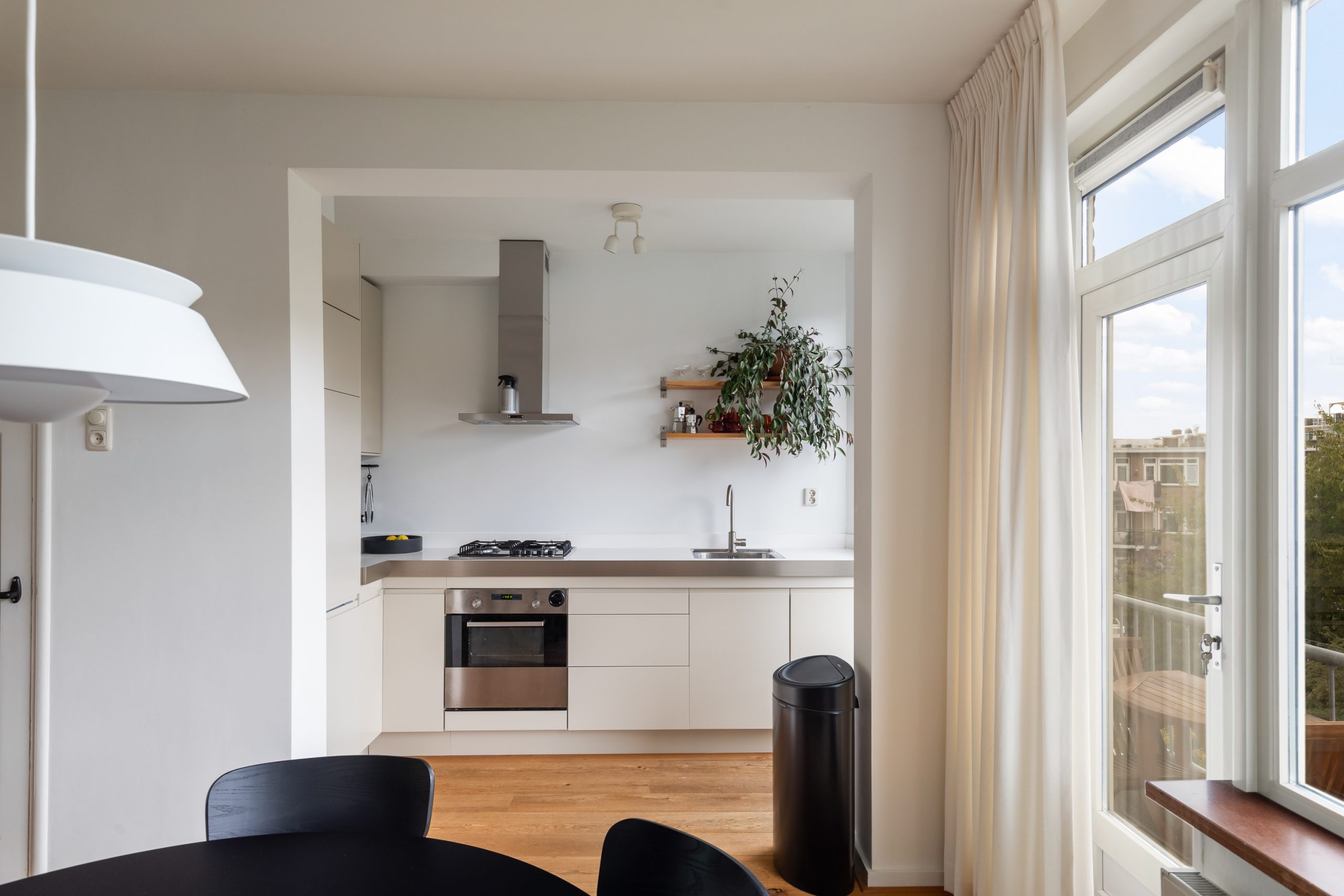 Entree met tochtportaal, separaat toilet en toegang tot alle vertrekken op deze verdieping. De woonkamer beschikt maar liefst over een lengte van ca. 11 meter! Door de grote raampartijen aan beide zijden treedt er veel natuurlijk licht de woning binnen, wat zorgt voor een fijne en lichte sfeer. Het woongedeelte is gelegen aan de voorzijde van de woning. Dankzij de slimme indeling zijn het eet- en zitgedeelte mooi van elkaar gescheiden, wat bijdraagt aan zowel comfort als sfeer. De ruimte biedt meer dan voldoende plaats voor zowel een royale zithoek als een ruime eettafel. De moderne half open keuken staat in directe verbinding met het eetgedeelte, dat gelegen is aan de achterzijde van de woning. De stijlvolle keuken beschikt over diverse inbouwapparatuur, zoals een 4-pits gasfornuis met afzuigkap, oven, vaatwasser en een ingebouwde koel-/vriescombinatie. Via de keuken bereik je het balkon, dat gelegen is op het noordwesten. Hier kun je heerlijk genieten van de middag-/avondzon. De master bedroom is gelegen aan de voorzijde van de woning. Dankzij de hoekligging van de master bedroom ontstaat een speels en ruimtelijk effect. Via een deur in de woonkamer bereik je een tweede hal met toegang tot een vaste kast, badkamer en de tweede slaapkamer. Deze kamer is multifunctioneel in te richten als bijvoorbeeld een kinder-, werk- of slaapkamer. De hal is voorzien van een stijlvol wastafelmeubel en biedt toegang tot de douche.