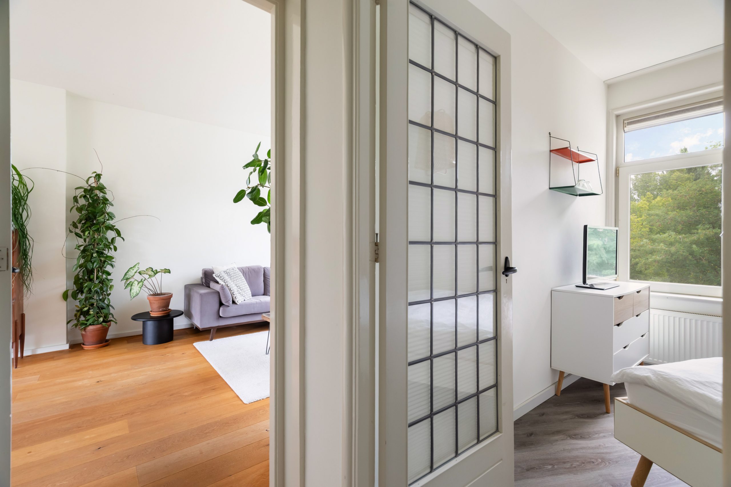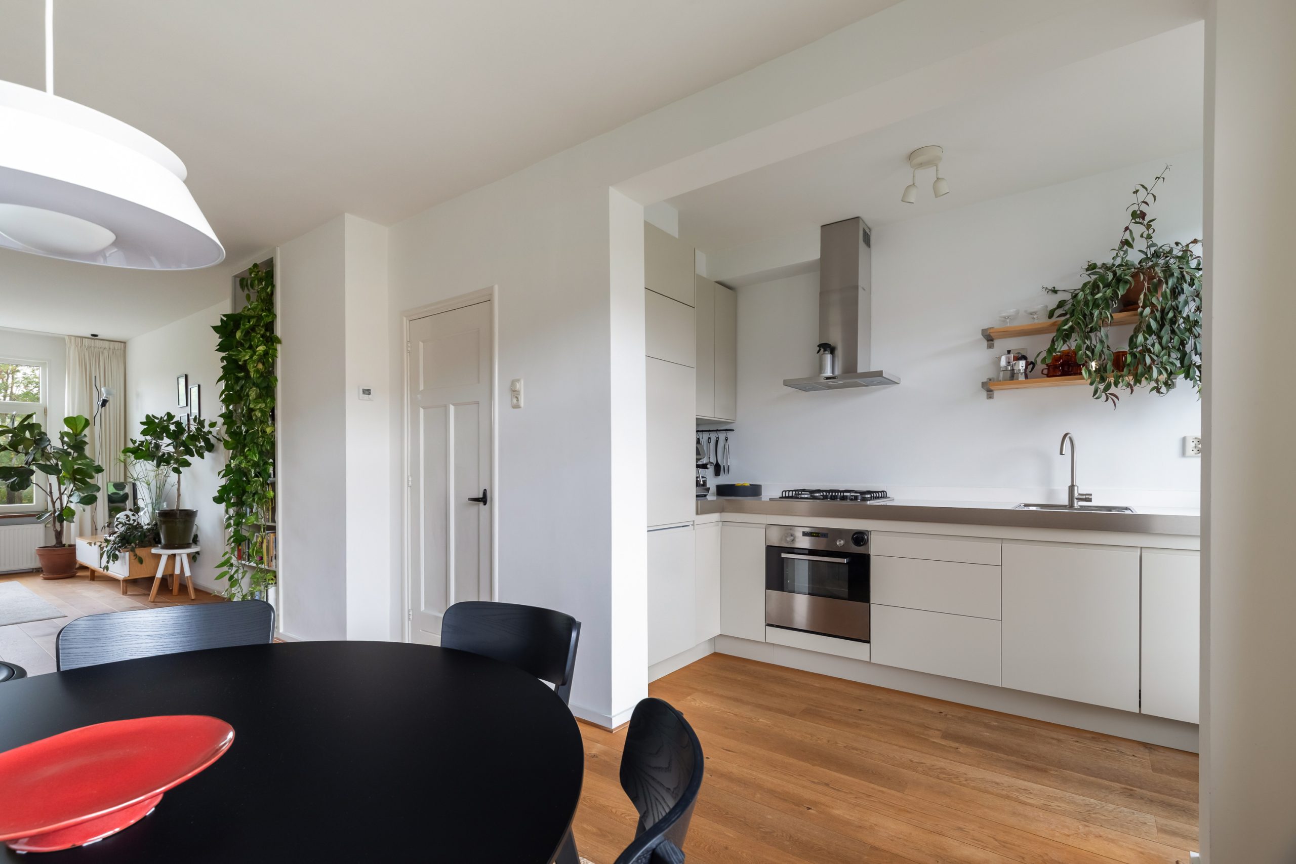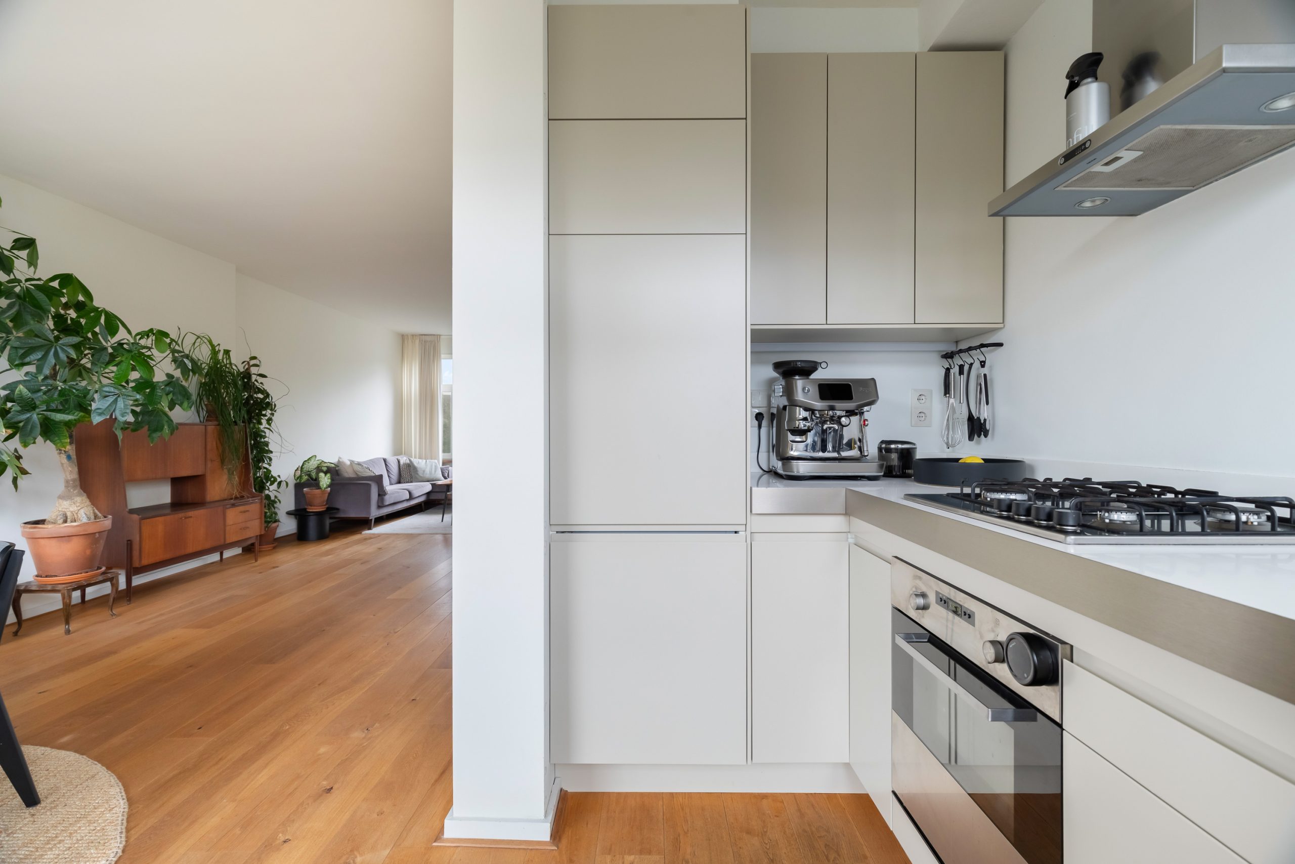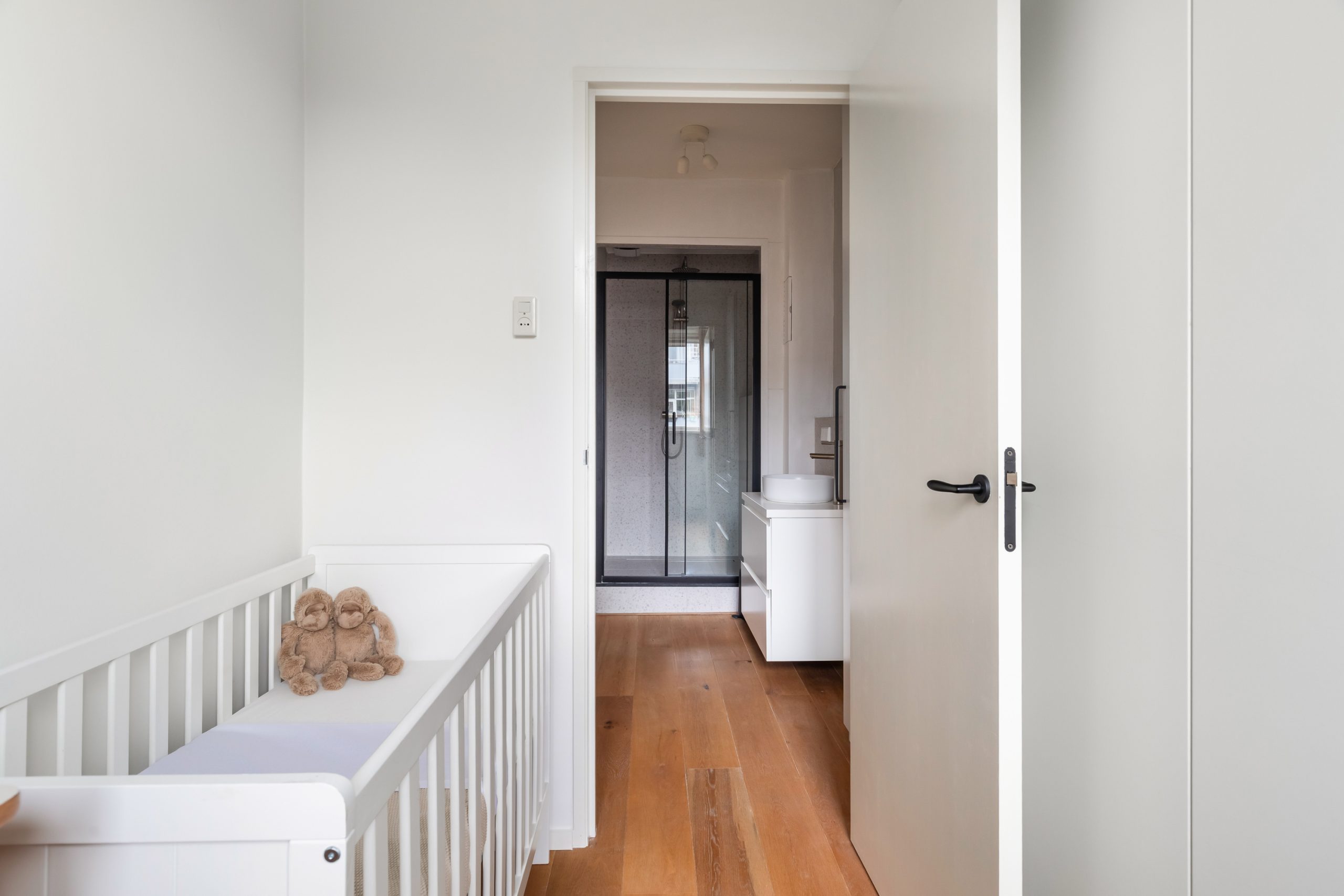 Entree met tochtportaal, separaat toilet en toegang tot alle vertrekken op deze verdieping. De woonkamer beschikt maar liefst over een lengte van ca. 11 meter! Door de grote raampartijen aan beide zijden treedt er veel natuurlijk licht de woning binnen, wat zorgt voor een fijne en lichte sfeer. Het woongedeelte is gelegen aan de voorzijde van de woning. Dankzij de slimme indeling zijn het eet- en zitgedeelte mooi van elkaar gescheiden, wat bijdraagt aan zowel comfort als sfeer. De ruimte biedt meer dan voldoende plaats voor zowel een royale zithoek als een ruime eettafel. De moderne half open keuken staat in directe verbinding met het eetgedeelte, dat gelegen is aan de achterzijde van de woning. De stijlvolle keuken beschikt over diverse inbouwapparatuur, zoals een 4-pits gasfornuis met afzuigkap, oven, vaatwasser en een ingebouwde koel-/vriescombinatie. Via de keuken bereik je het balkon, dat gelegen is op het noordwesten. Hier kun je heerlijk genieten van de middag-/avondzon. De master bedroom is gelegen aan de voorzijde van de woning. Dankzij de hoekligging van de master bedroom ontstaat een speels en ruimtelijk effect. Via een deur in de woonkamer bereik je een tweede hal met toegang tot een vaste kast, badkamer en de tweede slaapkamer. Deze kamer is multifunctioneel in te richten als bijvoorbeeld een kinder-, werk- of slaapkamer. De hal is voorzien van een stijlvol wastafelmeubel en biedt toegang tot de douche.