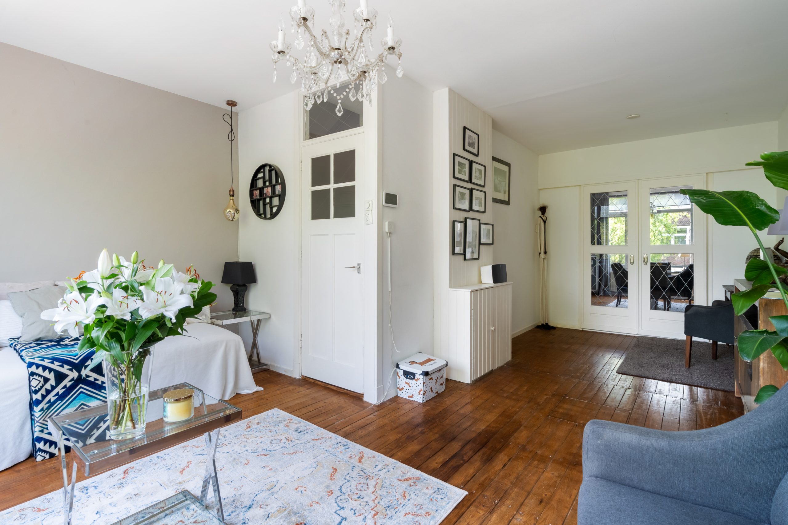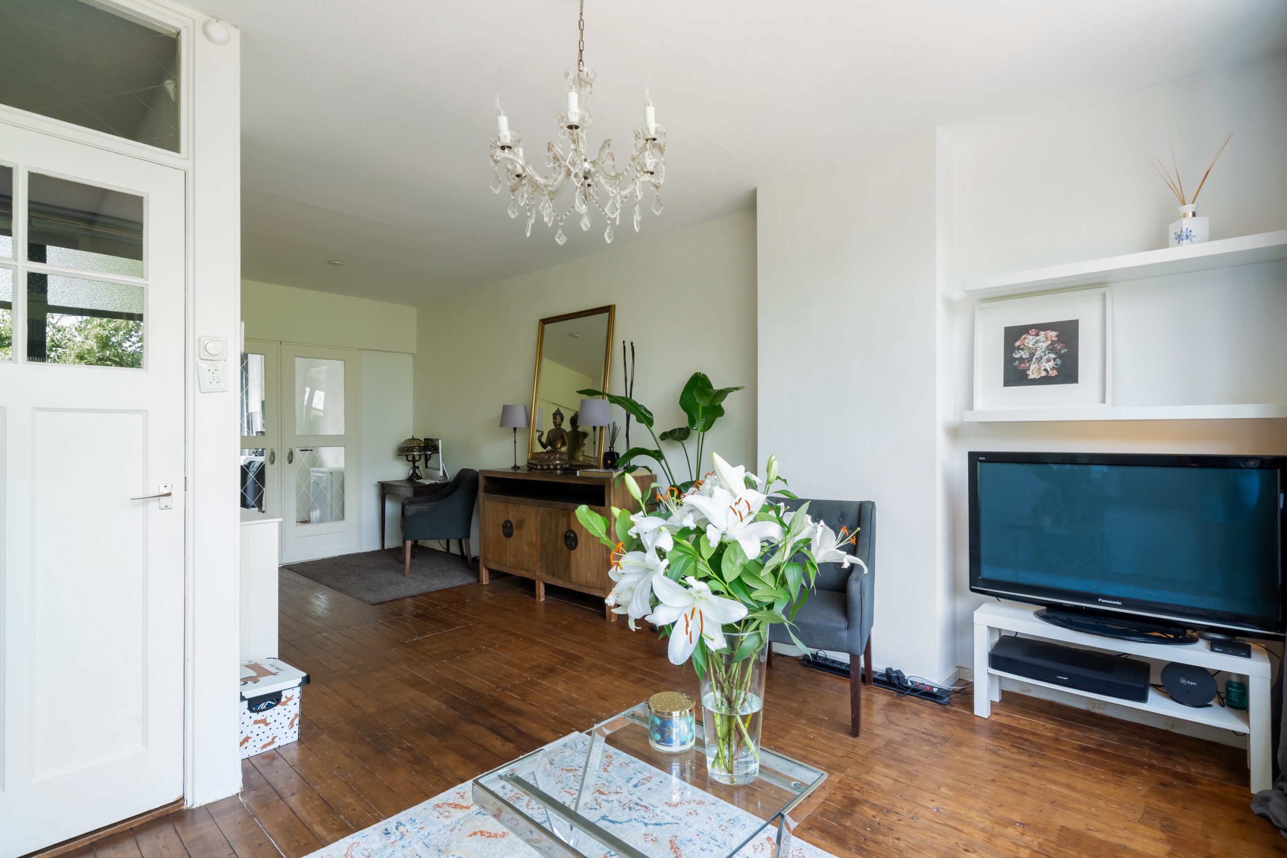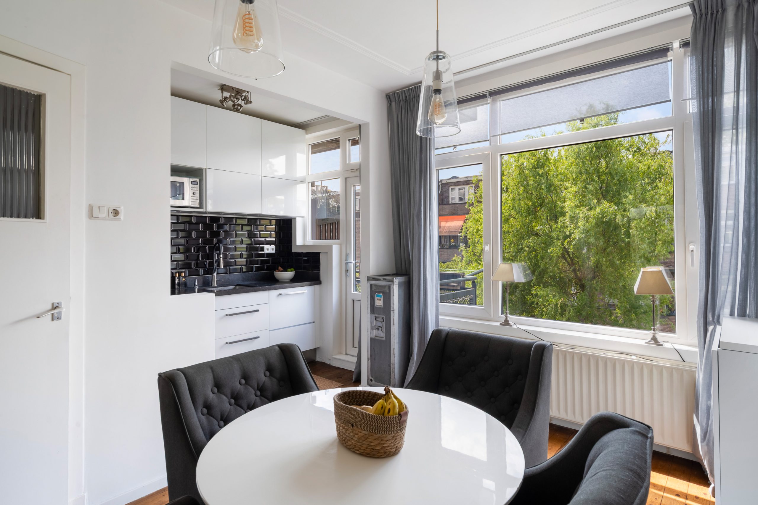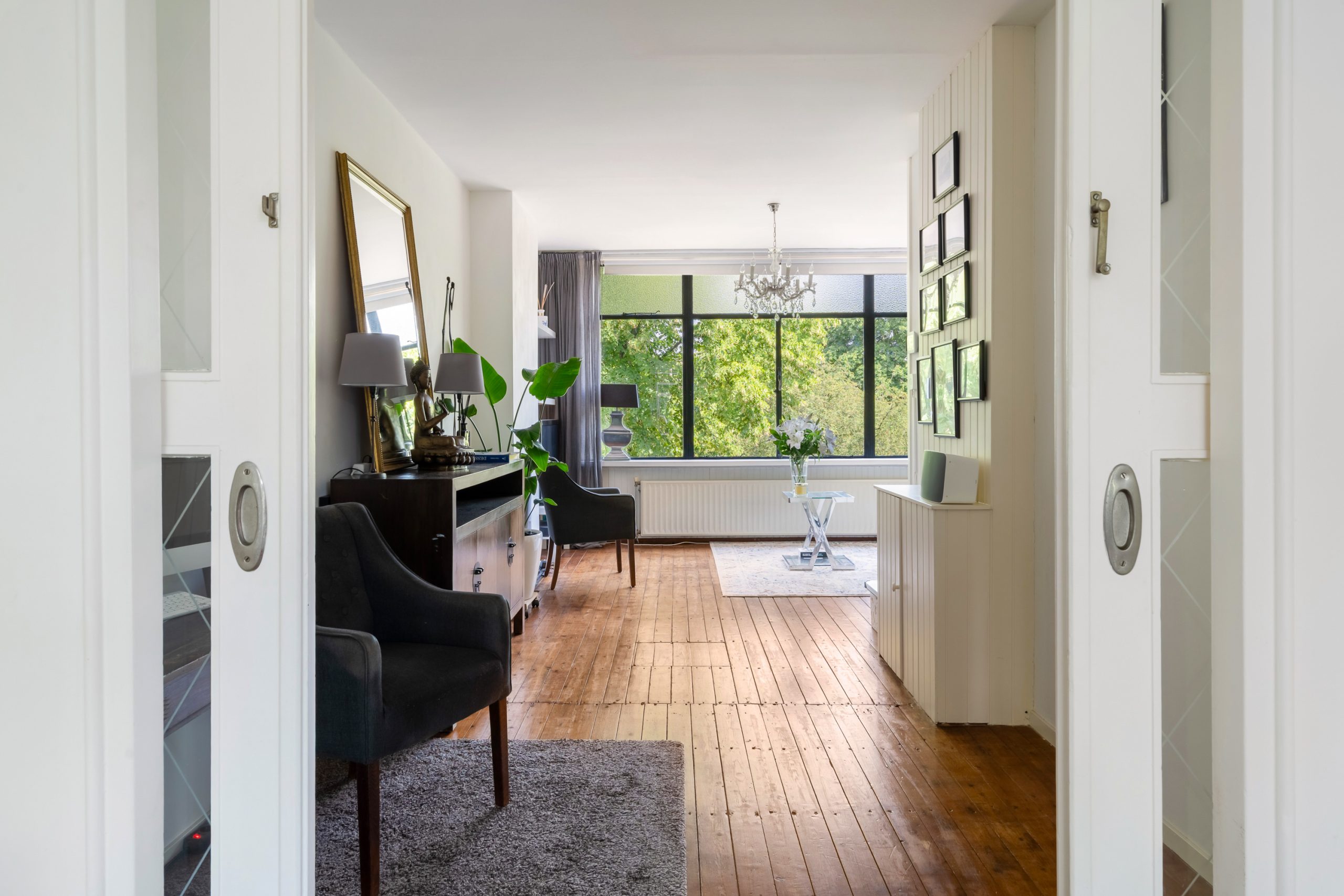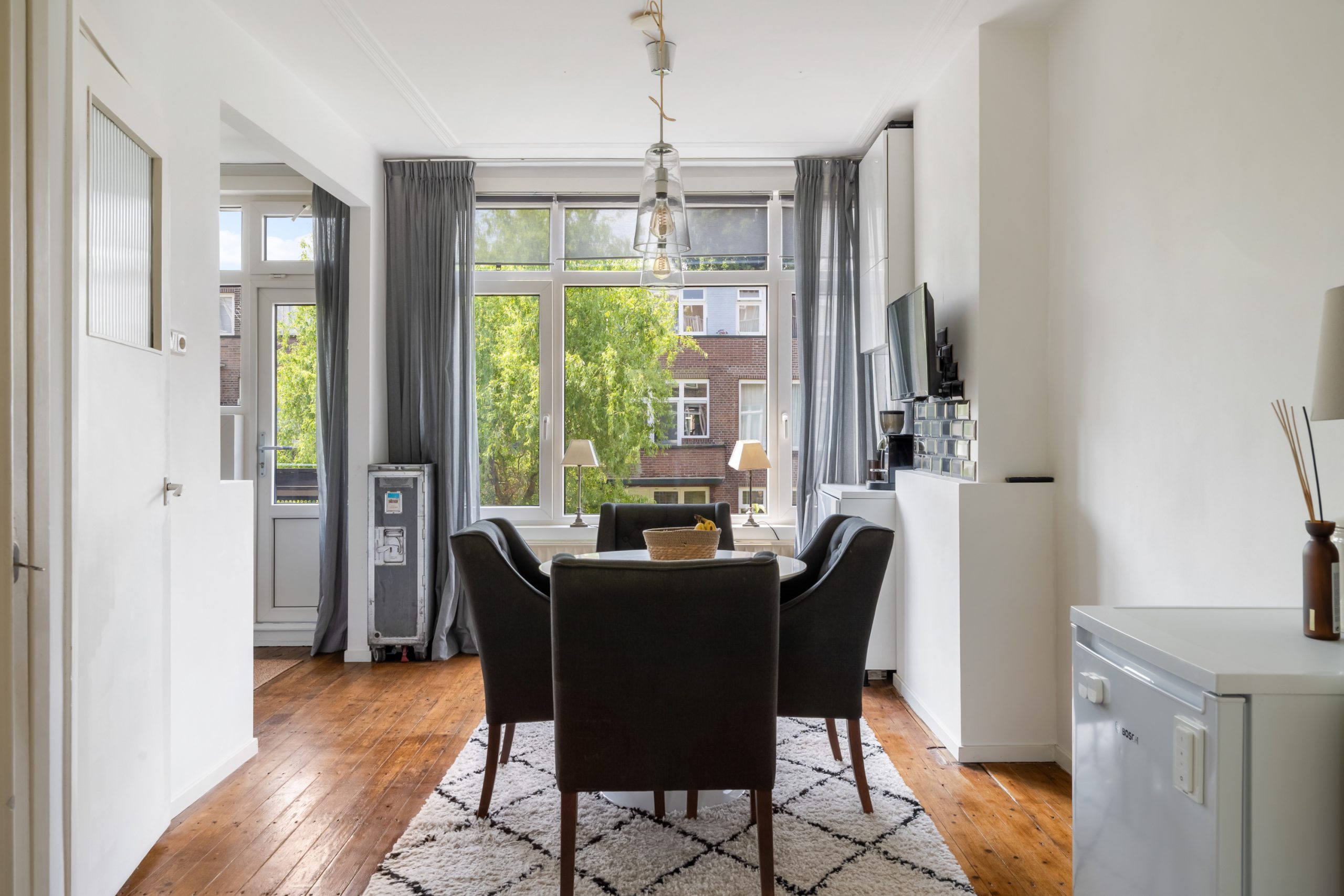 Entree met meterkast en toegang tot alle vertrekken op deze verdieping. De L-vormige kamer ensuite met vaste kasten heeft een prettige, natuurlijke indeling met veel ruimte voor zowel een comfortabele zithoek als een royaal eetgedeelte. De kamer ensuite deuren zorgen voor een subtiele afscheiding tussen de ruimtes, terwijl het open en luchtige gevoel blijft behouden. Met een lengte van ca. 12 meter geeft de woonkamer ensuite een bijzonder ruimtelijk en luxe uitstraling. Aan de voorzijde van de woning bevindt zich het woongedeelte; het eetgedeelte ligt aan de achterzijde en biedt toegang tot het separate toilet. Het eetgedeelte staat in directe verbinding met de open keuken. Hier komt koken en gezelligheid perfect samen. Het is de ideale plek om lekker in contact te blijven met je gezelschap, terwijl je geniet van de open, gezellige sfeer. De open keuken beschikt over diverse inbouwapparatuur zoals een 4-pits gasfornuis met afzuigkap, oven en een vaatwasser. Via de keuken bereik je het eerste balkon, gelegen op het zuidwesten. Hier kan je gedurende dag heerlijk genieten van de zon met een kop koffie!