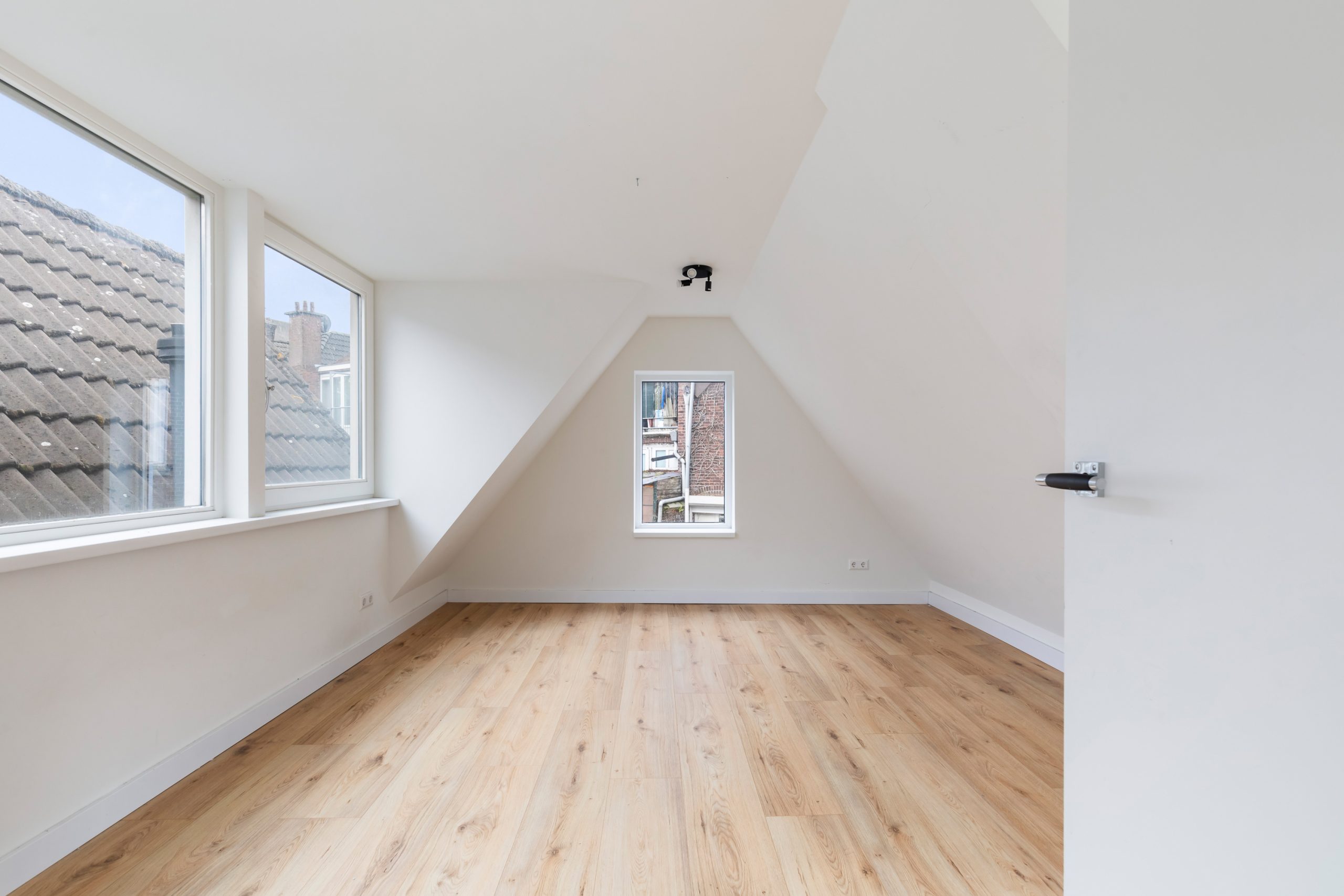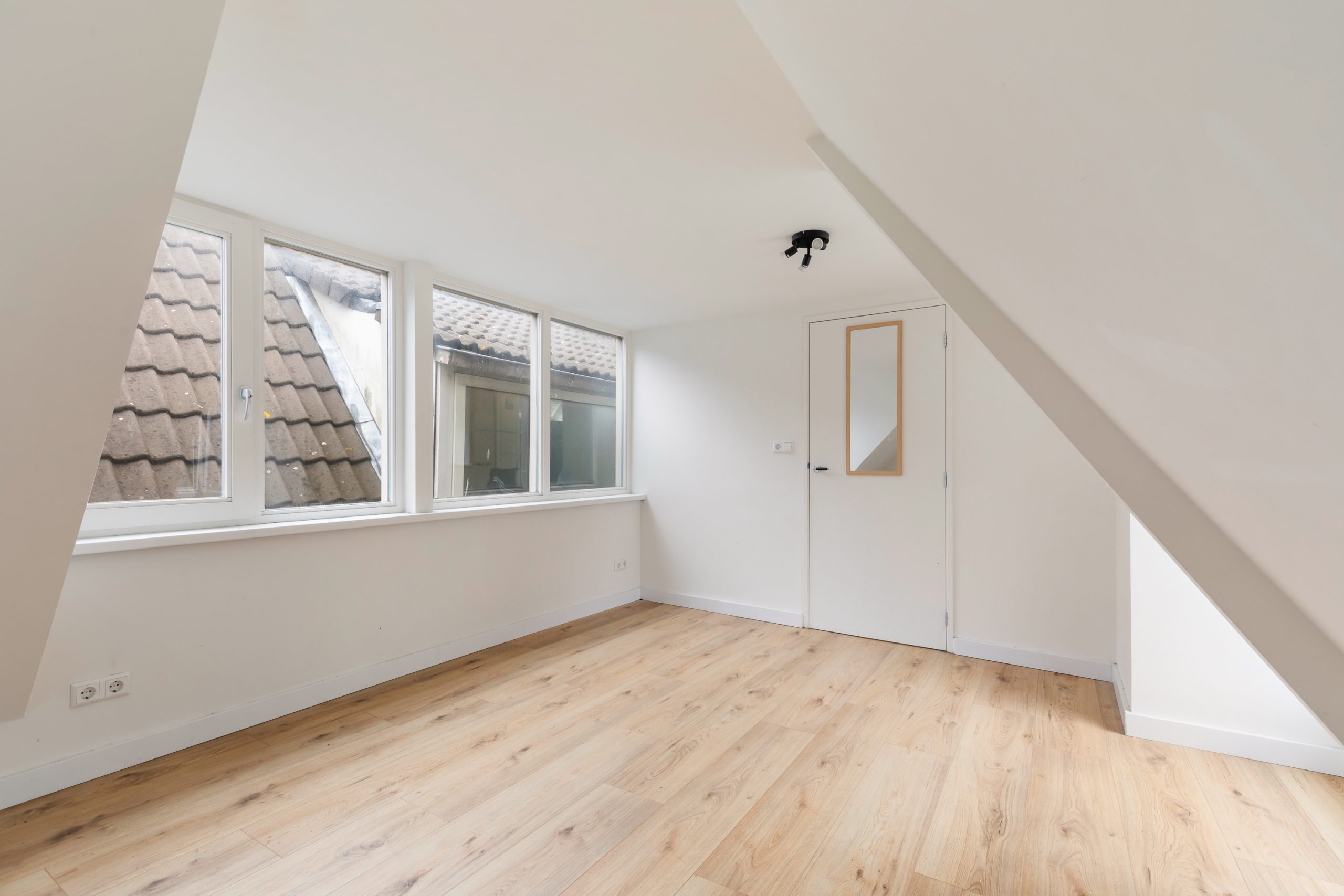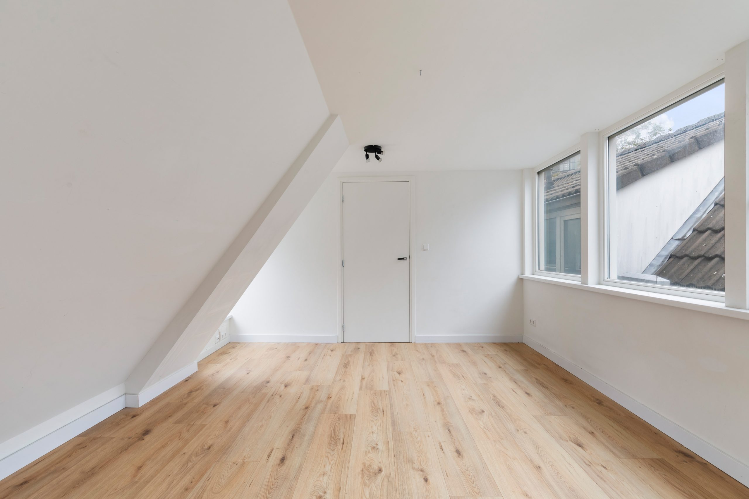 Overloop met berging en toegang tot de slaapkamers. Ook boven is alles netjes en met oog voor detail afgewerkt, waardoor het geheel mooi in balans blijft. Het schuine plafond zorgt voor een speelse indeling en geeft de ruimte een charmante en karaktervolle uitstraling. Beide slaapkamers zijn erg ruim van formaat.