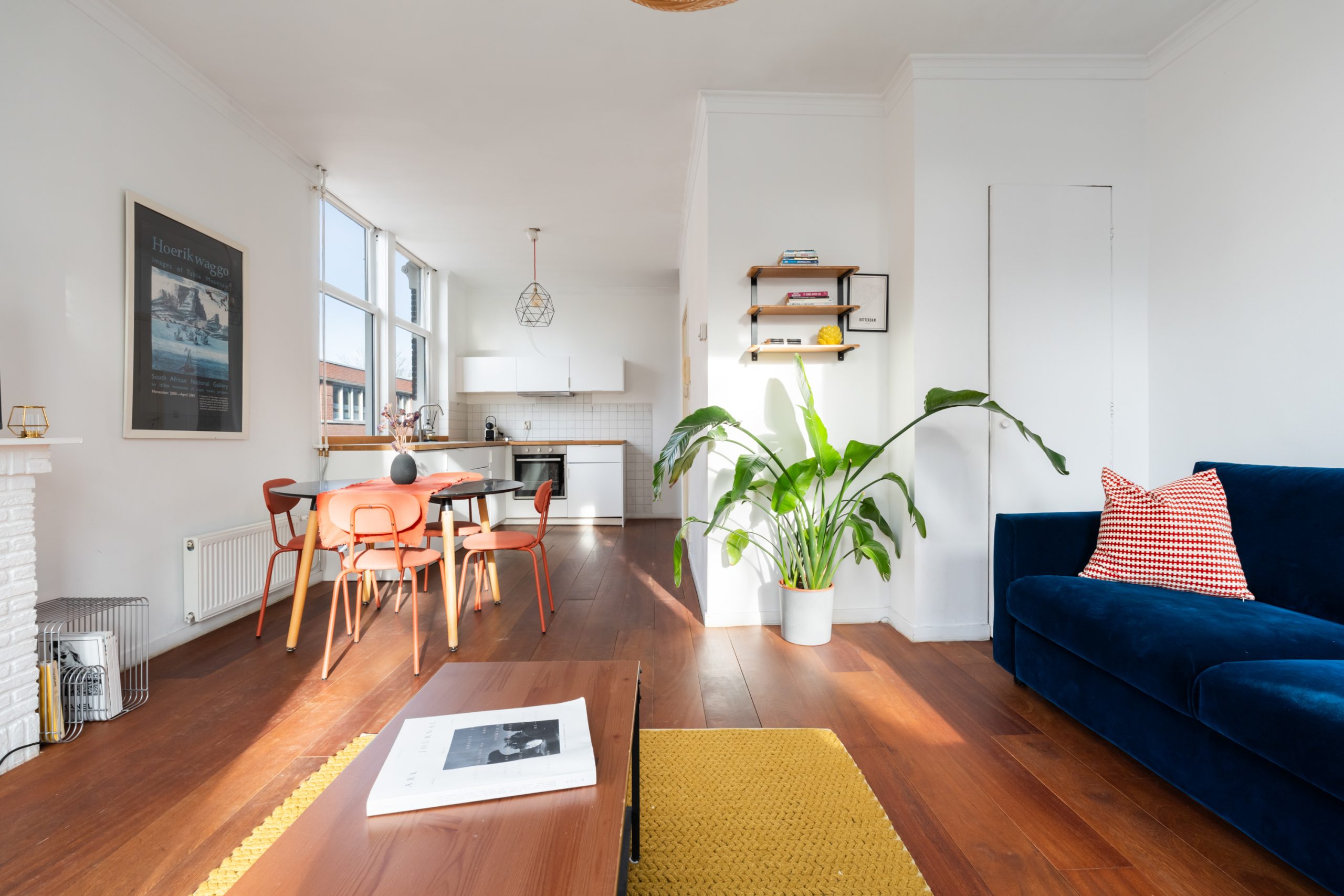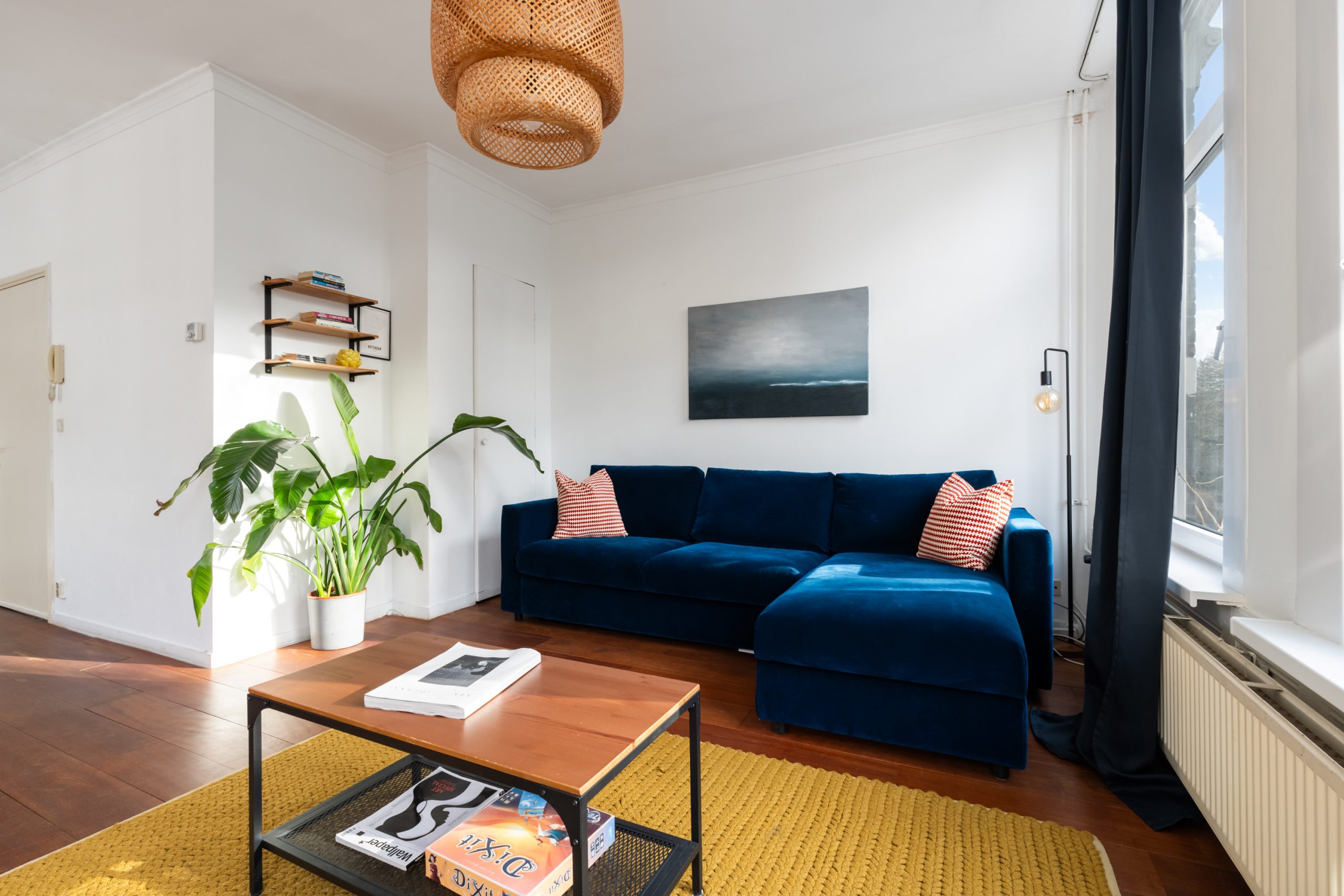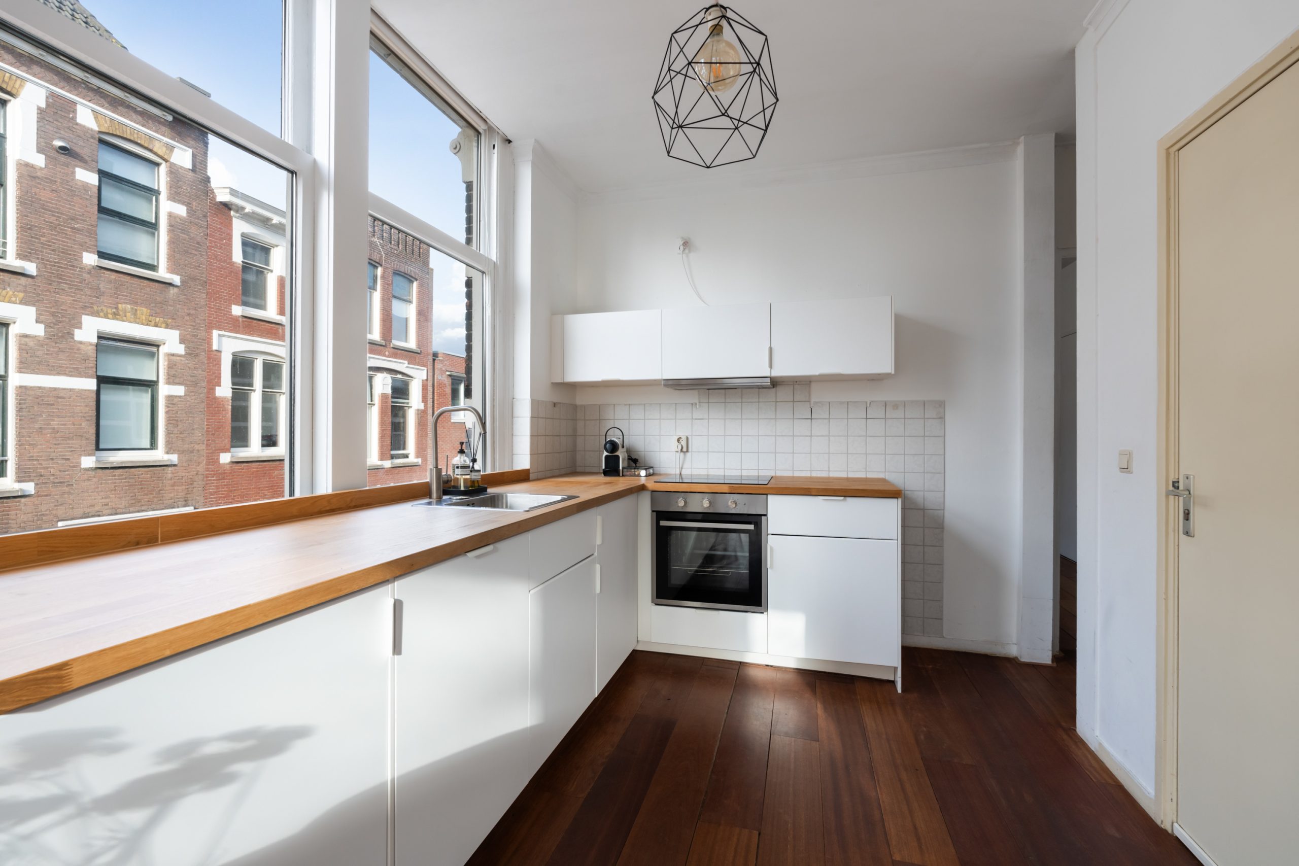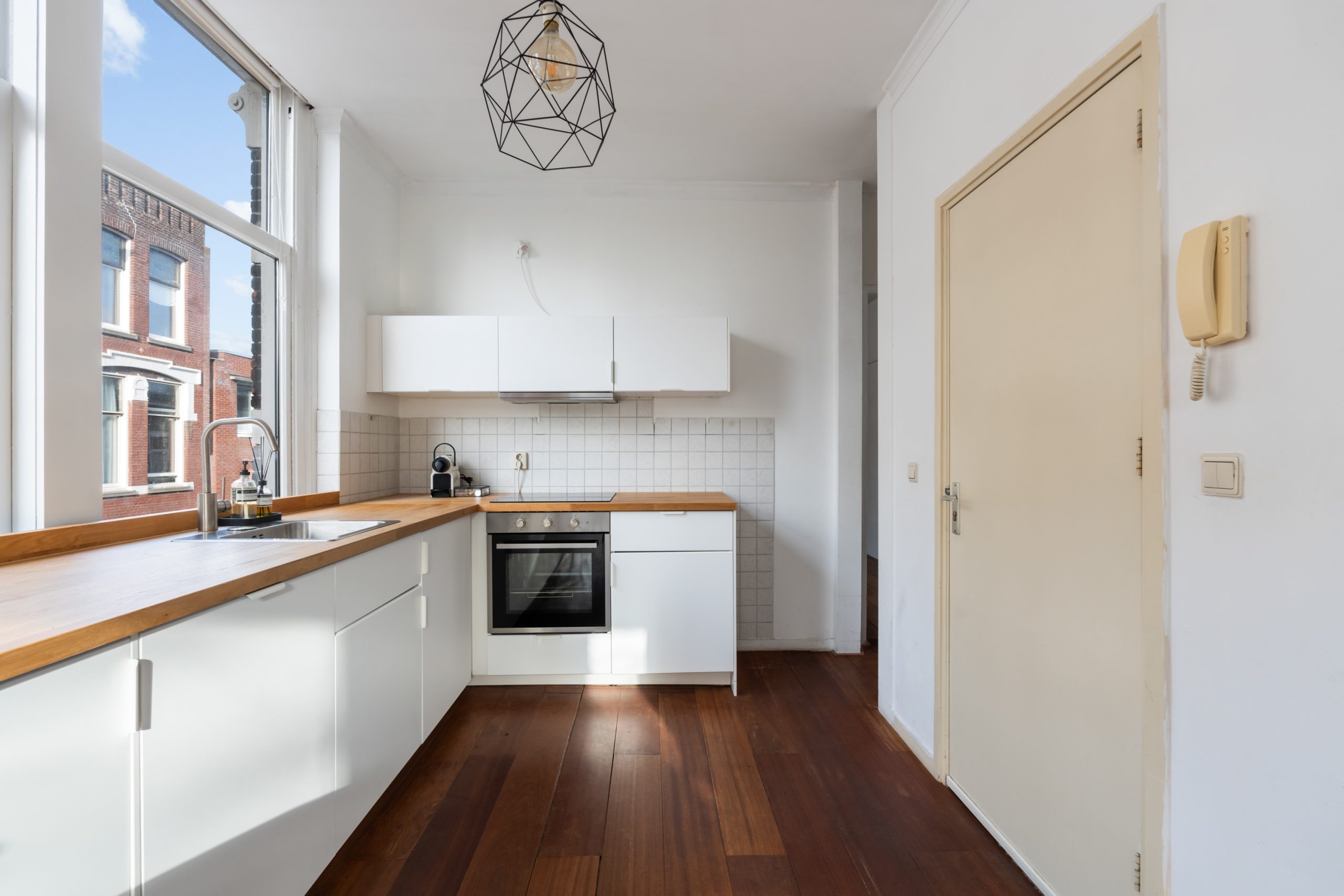 Ruime hal met toegang tot alle vertrekken. De ruime L-vormige woonkamer is gelegen aan de voorzijde. Door de hoekligging, in combinatie met de grote raampartijen en de speelse indeling, ontstaat een heerlijk licht en sfeervol woongedeelte. Dankzij de praktische indeling van de woning is het eenvoudig om het woon- en eetgedeelte van elkaar te scheiden, waardoor je gemakkelijk een gezellige en comfortabele eethoek kunt creƫren. De karakteristieke erker aan de voorzijde is een echte eyecatcher. Dit is een prachtige plek met uitzicht over de singel waar je heerlijk kunt zitten, werken of ontspannen. De moderne keuken beschikt over diverse soorten inbouwapparatuur zoals een 4-pits elektrische kookplaat met afzuigkap, oven, vaatwasser en een koelkast. Via de hal bereik je het separaat toilet en de slaapkamer. De slaapkamer met bergruimte (CV-opstelling, wasmachineaansluiting) is gelegen aan de achterzijde van de woning. Dit is een erg lichte kamer en beschikt ook over een mooie plafondhoogte. De badkamer met warme, mediterrane stucafwerking beschikt over een douche en wastafel.