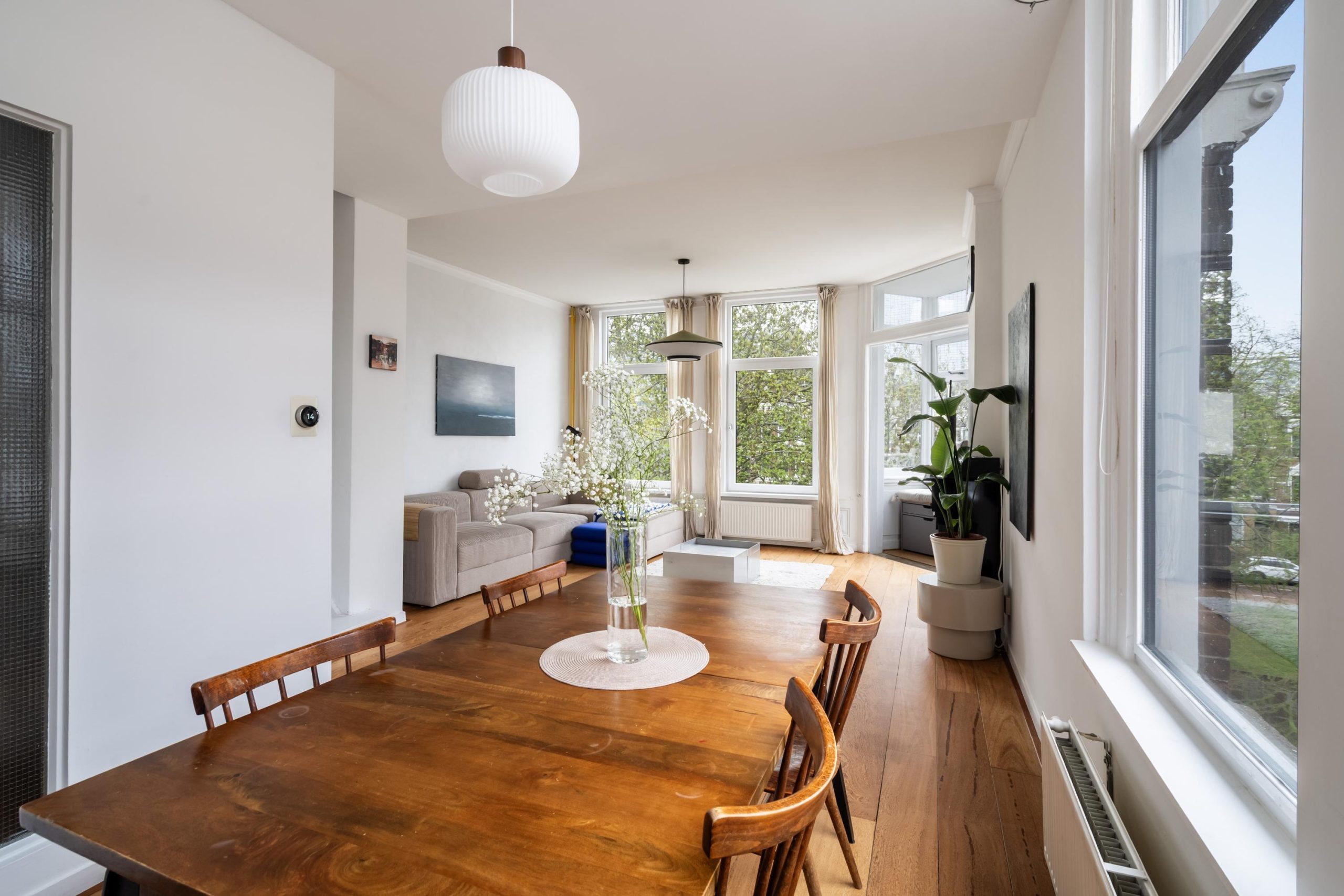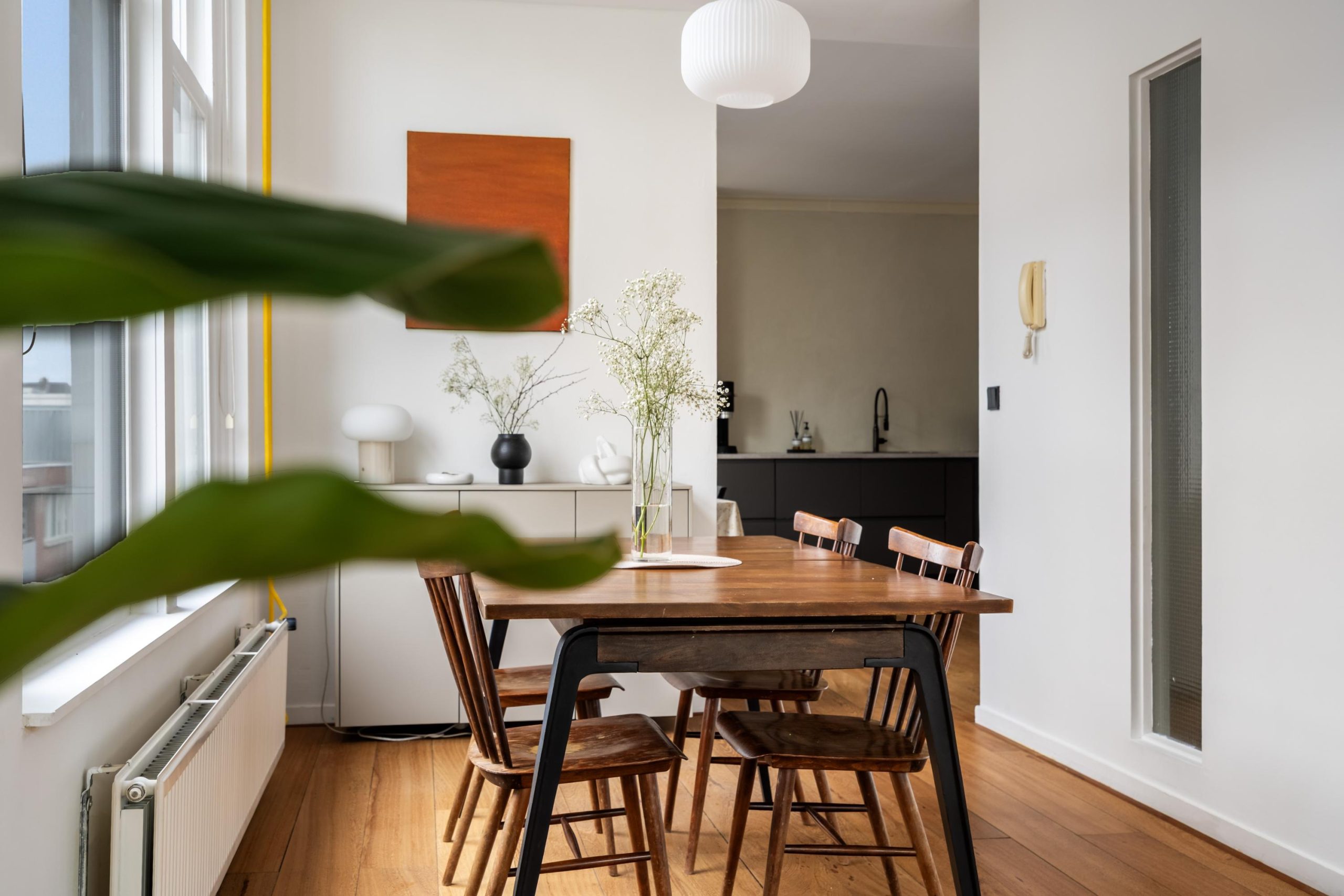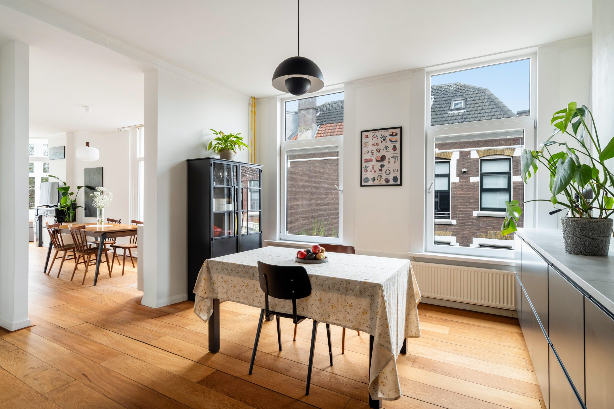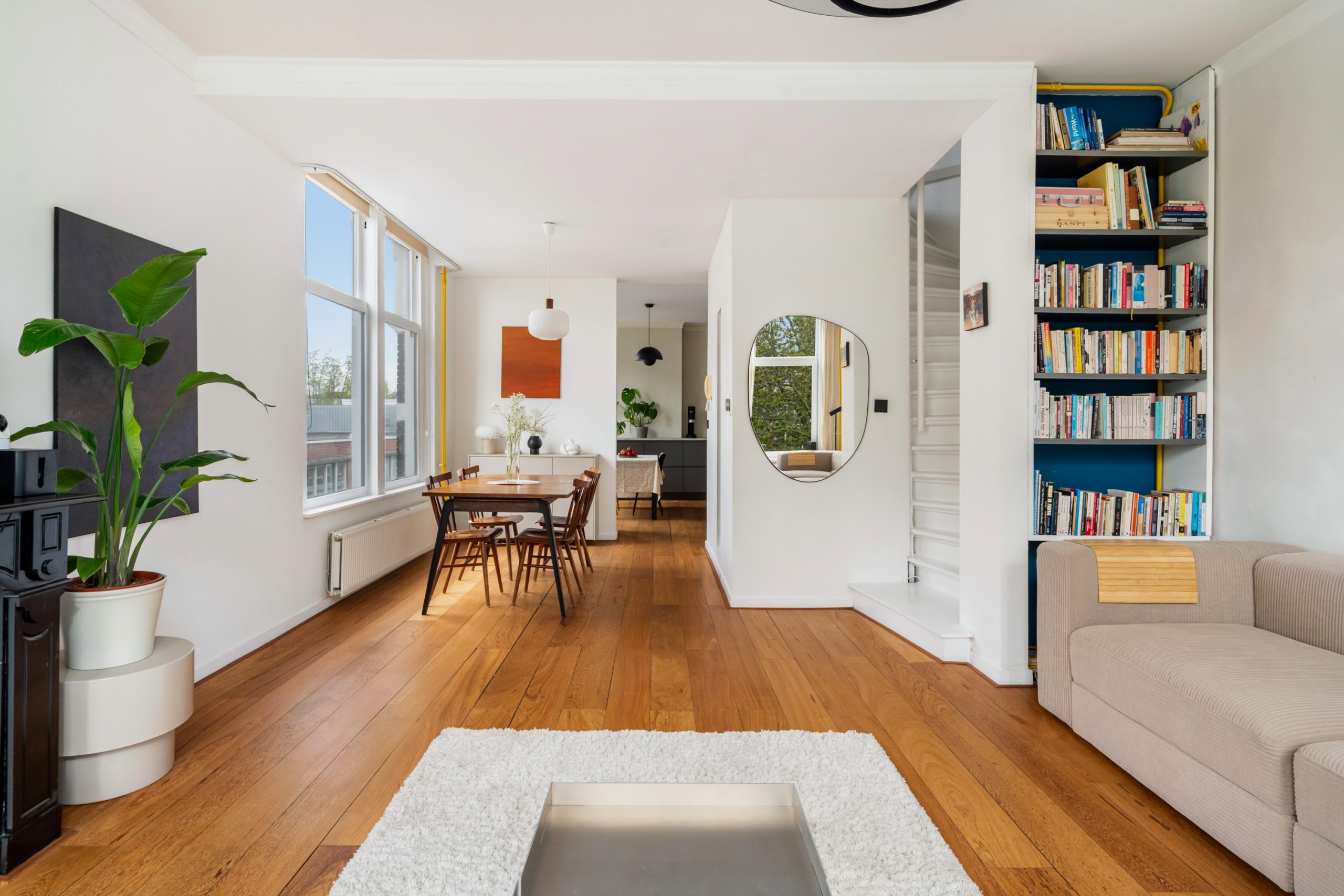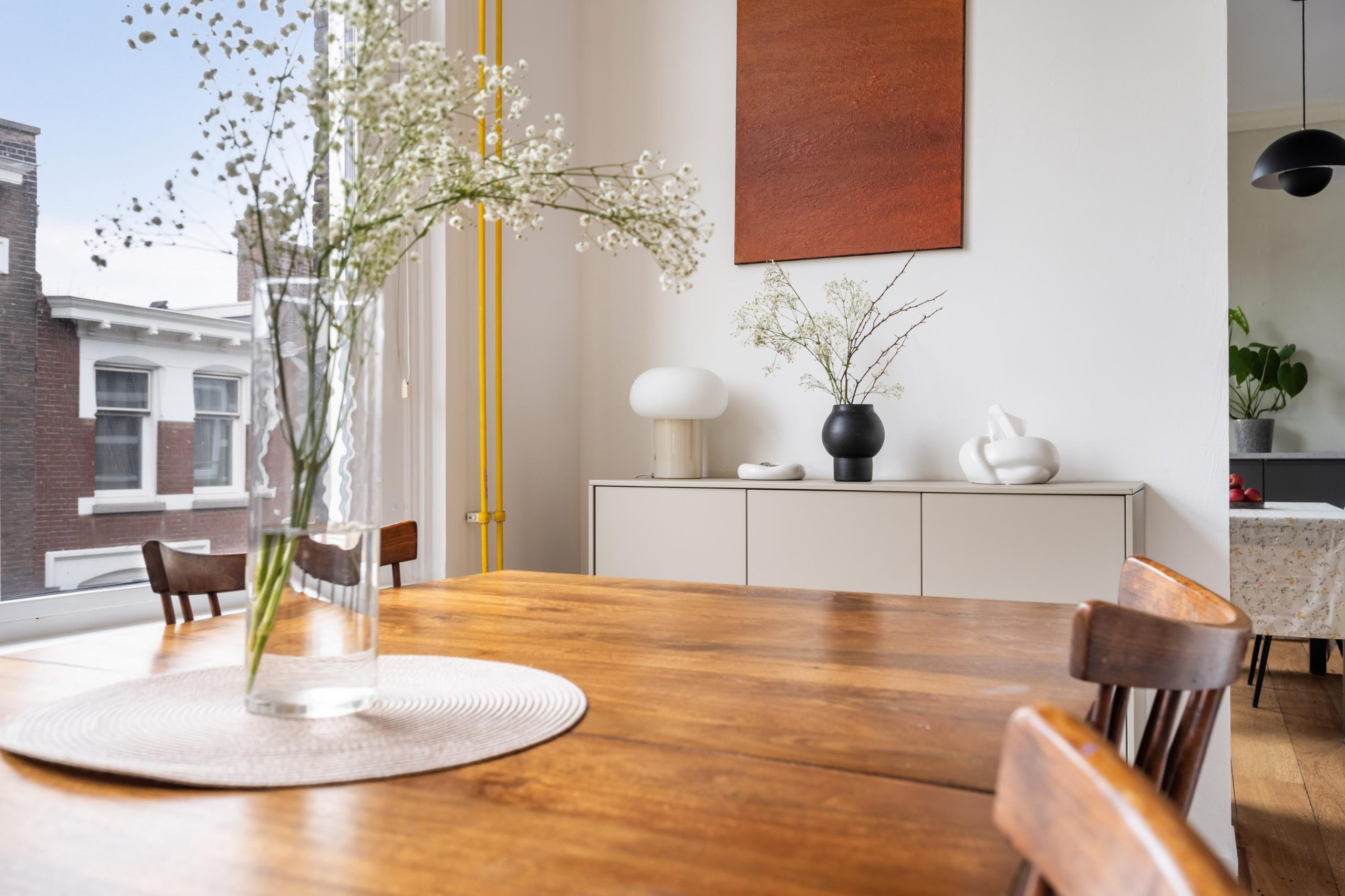 Overloop met toegang tot het woongedeelte. Je komt binnen in de ruime eetkamer met open keuken. Deze fijne ruimte beschikt over grote raampartijen, waardoor er veel licht de woning binnentreedt. Er is ook voldoende ruimte voor een grote eettafel, waar met een groot gezelschap gedineerd kan worden. De moderne keuken beschikt over diverse soorten inbouwapparatuur zoals een 4-pits elektrische kookplaat met afzuigkap, oven, vaatwasser en voldoende opbergruimte. Het zitgedeelte is gelegen aan de voorzijde. Door de hoekligging, in combinatie met de grote raampartijen en de speelse indeling, ontstaat een heerlijk licht en sfeervol woongedeelte. De karakteristieke erker aan de voorzijde is een echte eyecatcher. Dit is een prachtige plek met uitzicht over de singel waar je heerlijk kunt zitten, werken of ontspannen.